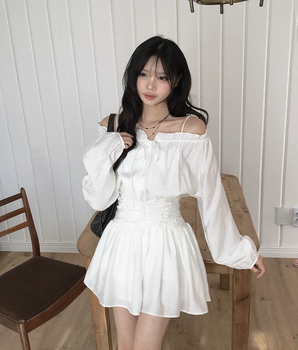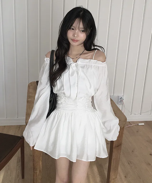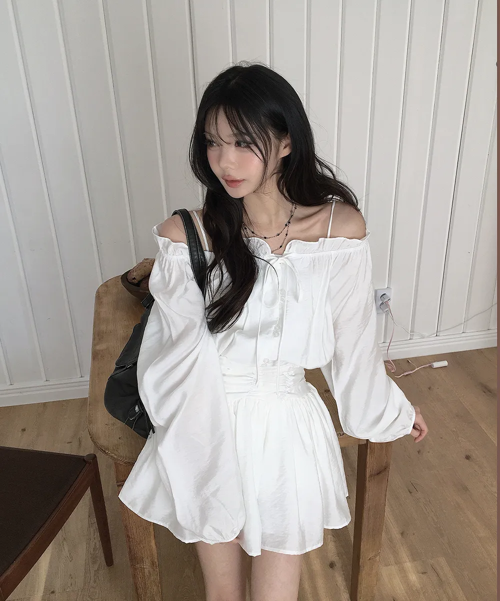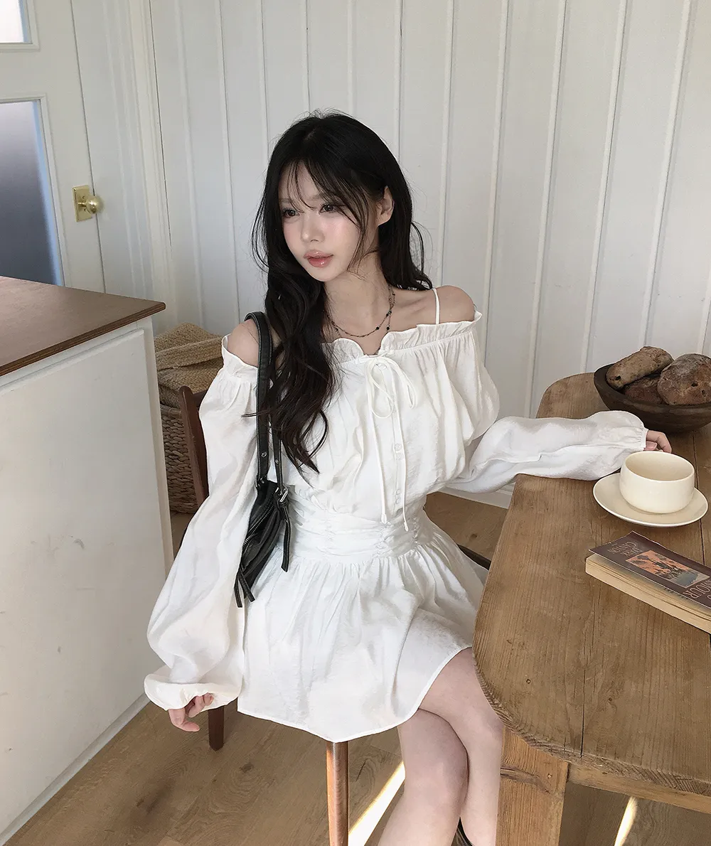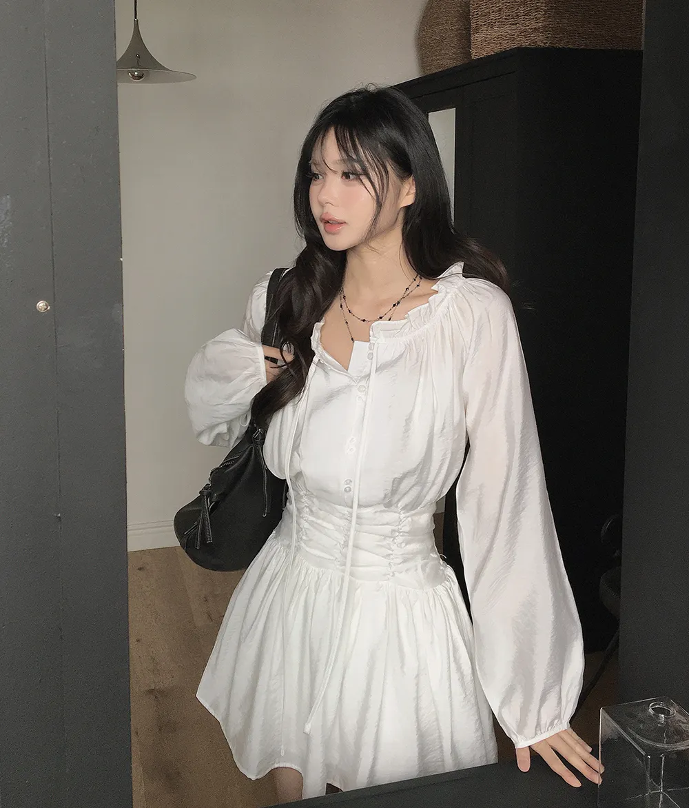 シフォンストラップVネックシャーリングドローストリングラッフルティアードウエストゴムパフスリーブオーバーサイズルーズ長袖くるみボタンドロップショルダー無地ワンピース