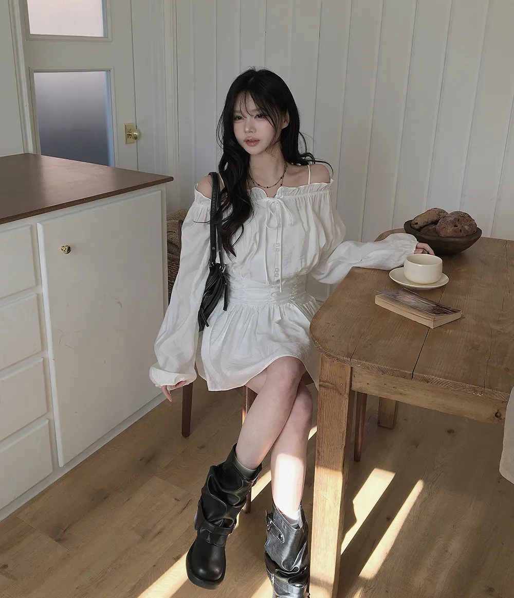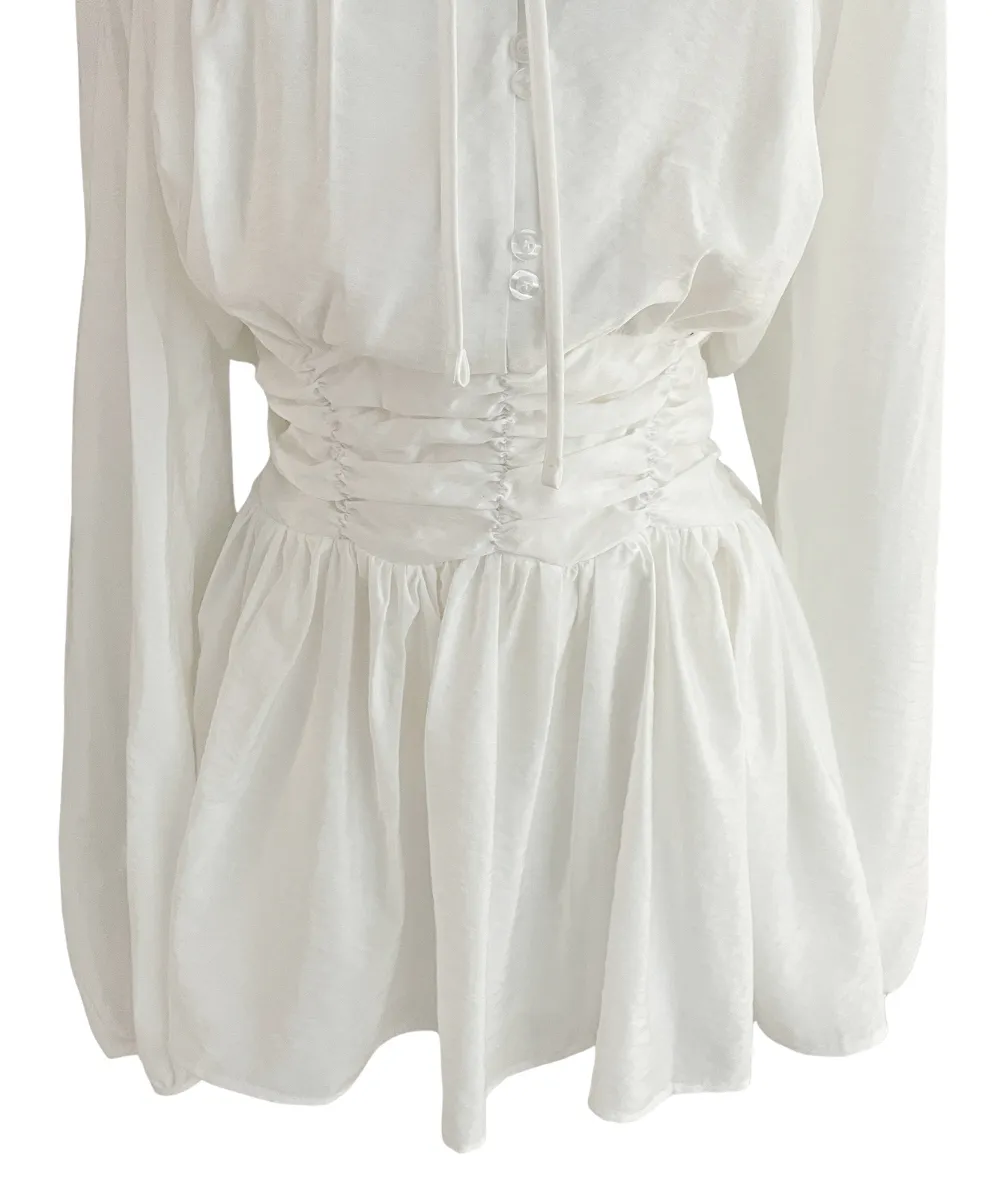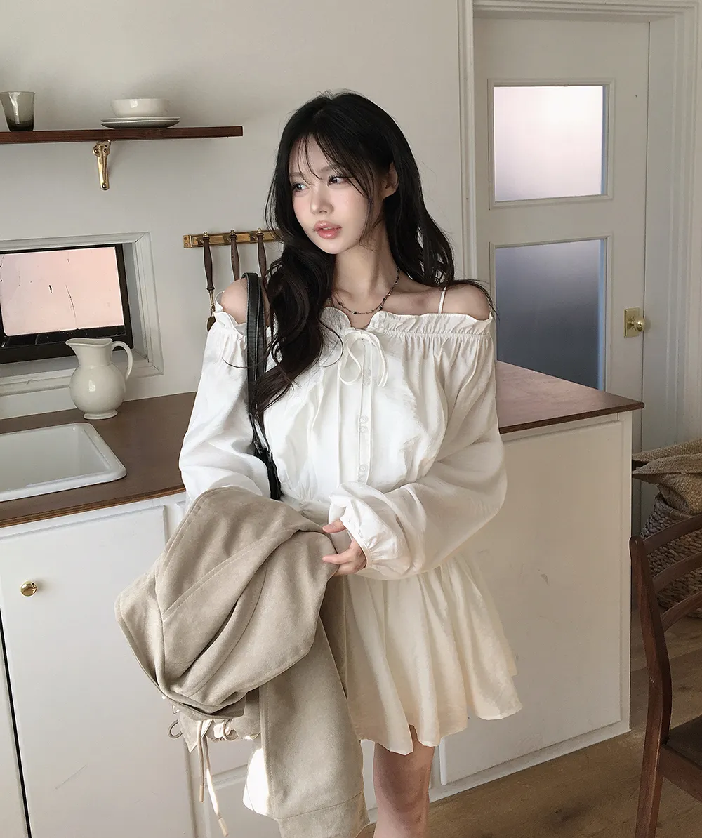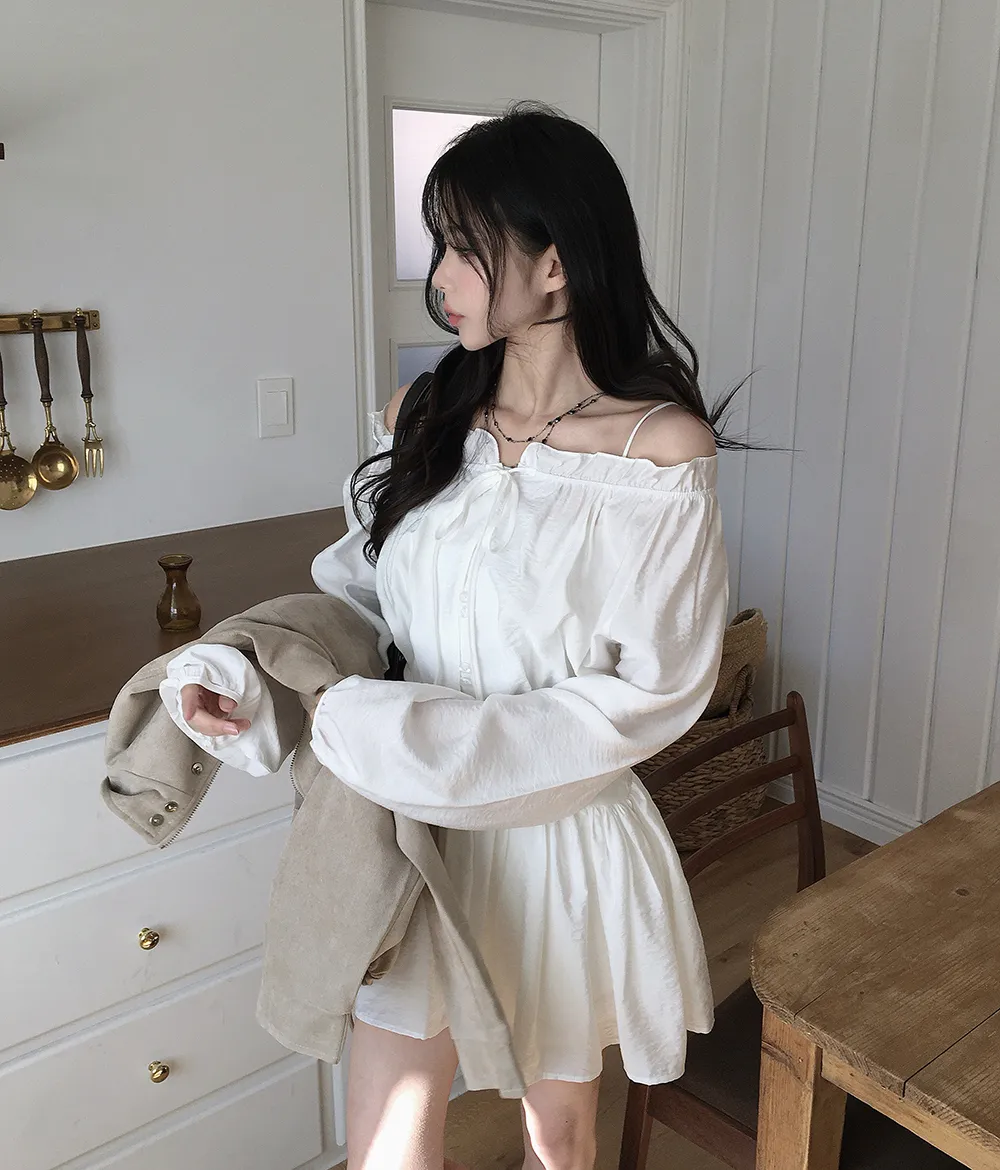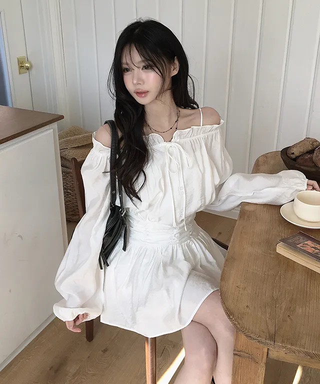 シフォンストラップVネックシャーリングドローストリングラッフルティアードウエストゴムパフスリーブオーバーサイズルーズ長袖くるみボタンドロップショルダー無地ワンピース
