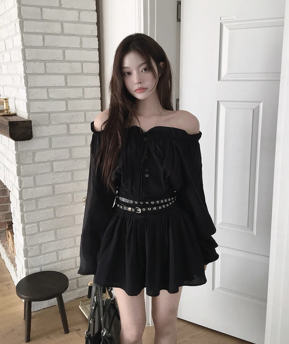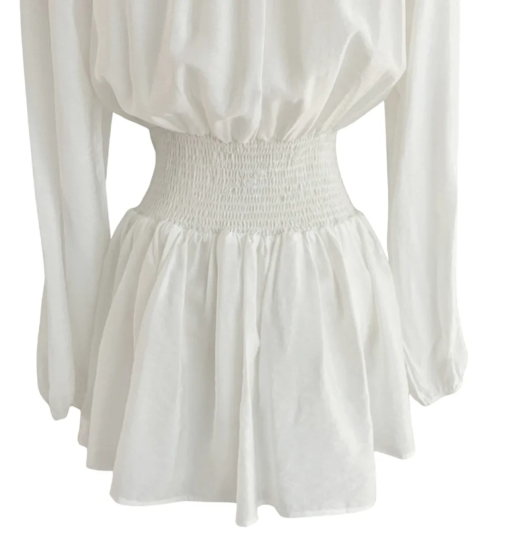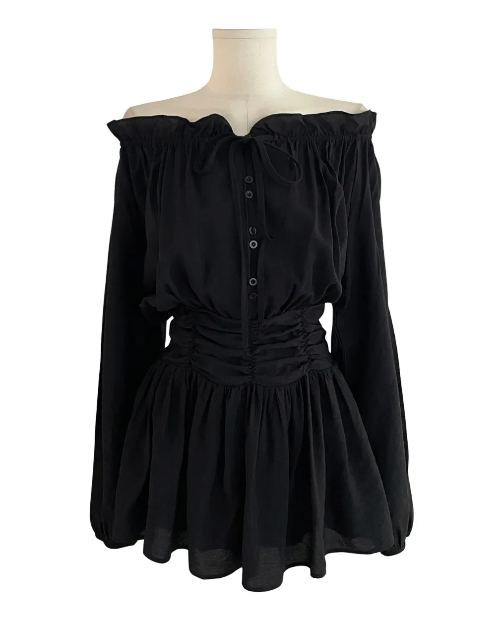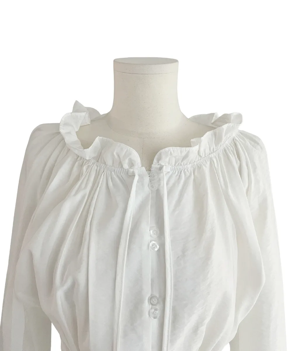 シフォンストラップVネックシャーリングドローストリングラッフルティアードウエストゴムパフスリーブオーバーサイズルーズ長袖くるみボタンドロップショルダー無地ワンピース
