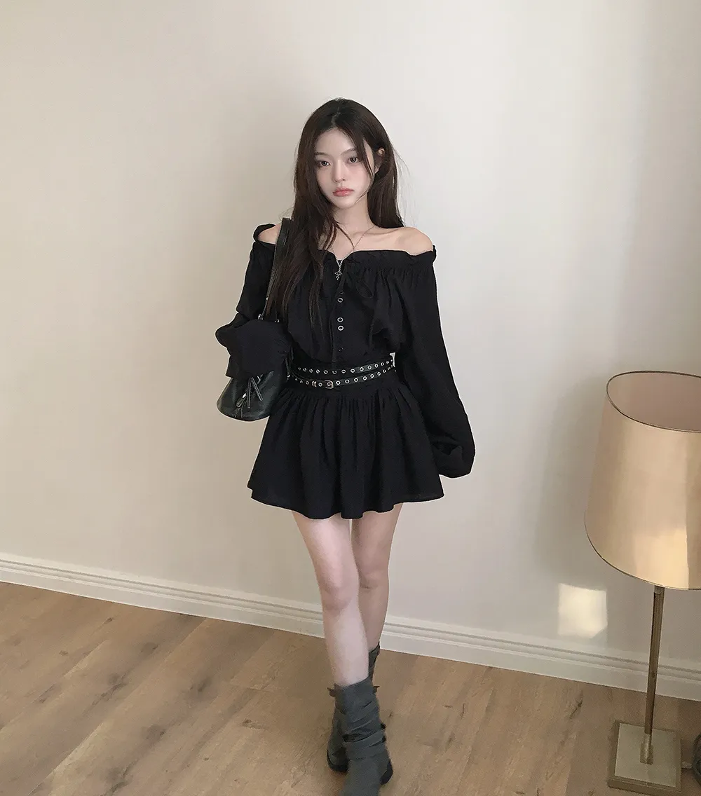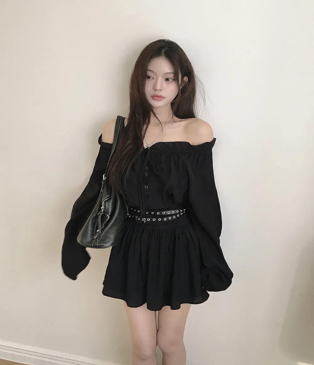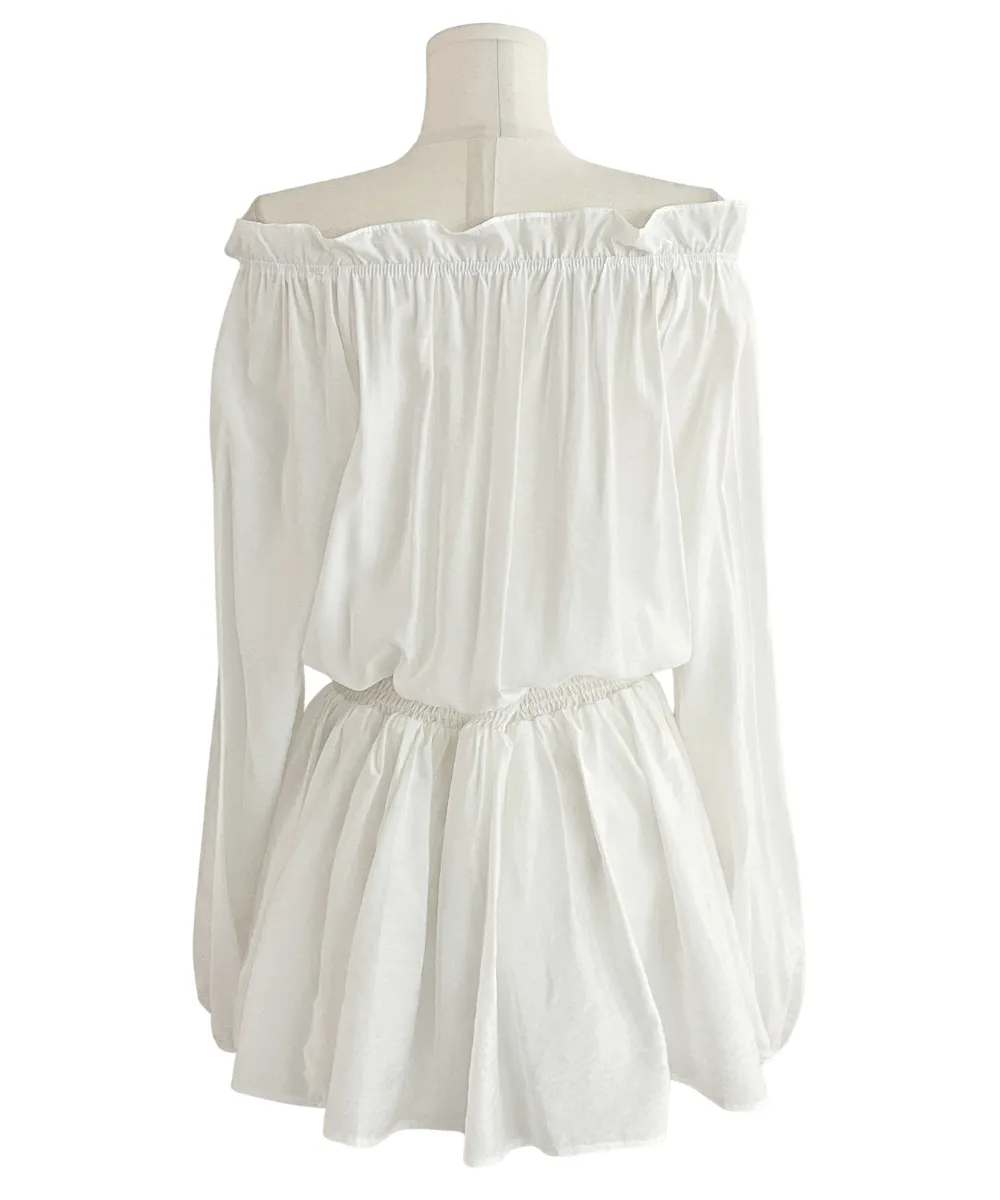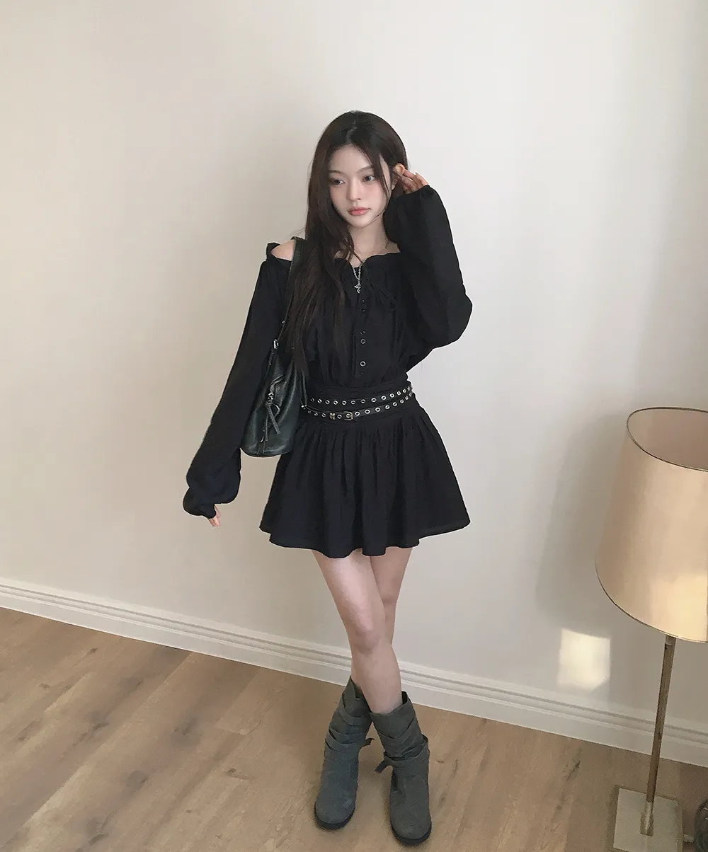 シフォンストラップVネックシャーリングドローストリングラッフルティアードウエストゴムパフスリーブオーバーサイズルーズ長袖くるみボタンドロップショルダー無地ワンピース