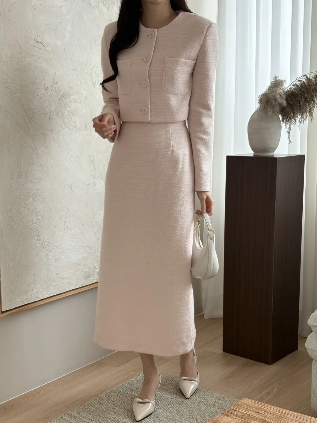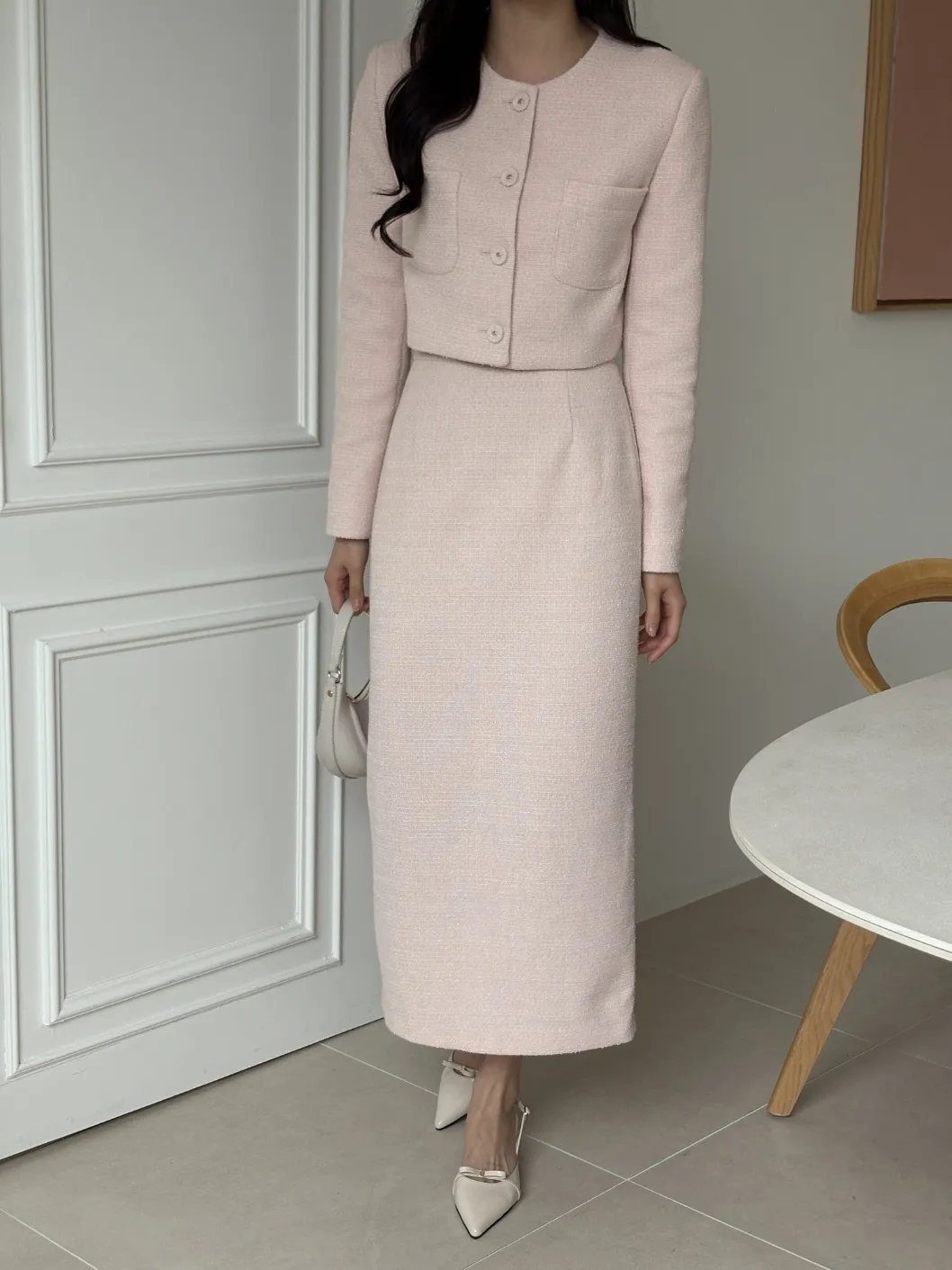 ツイードラウンドネックノーカラーリンクル肩パッドウエストゴムロング長袖ビジューボタンフレアコサージュAラインツーピース(トップス、ボトムス)スカートジャケット