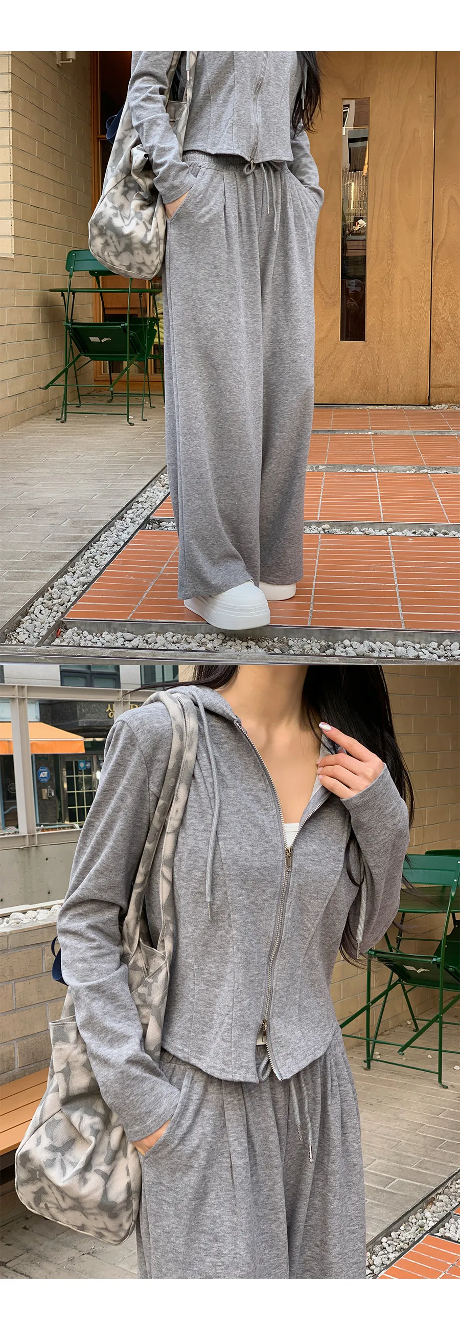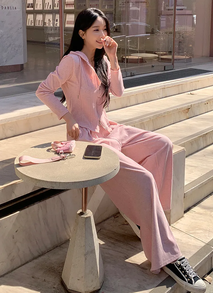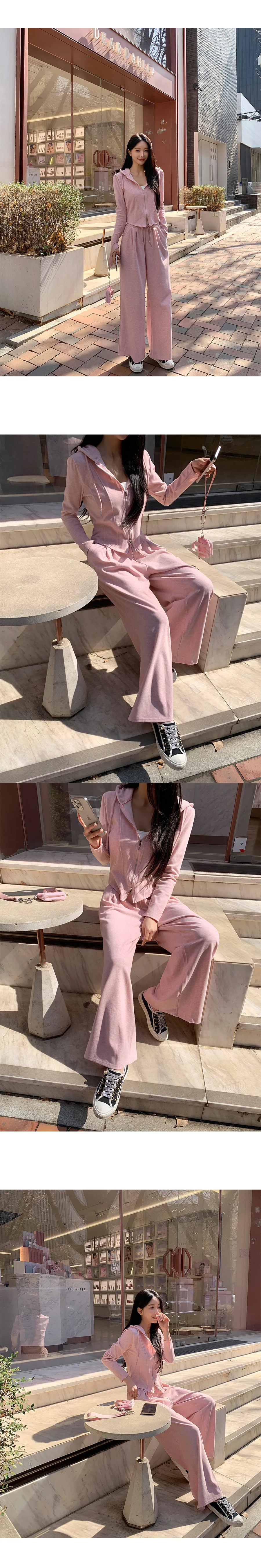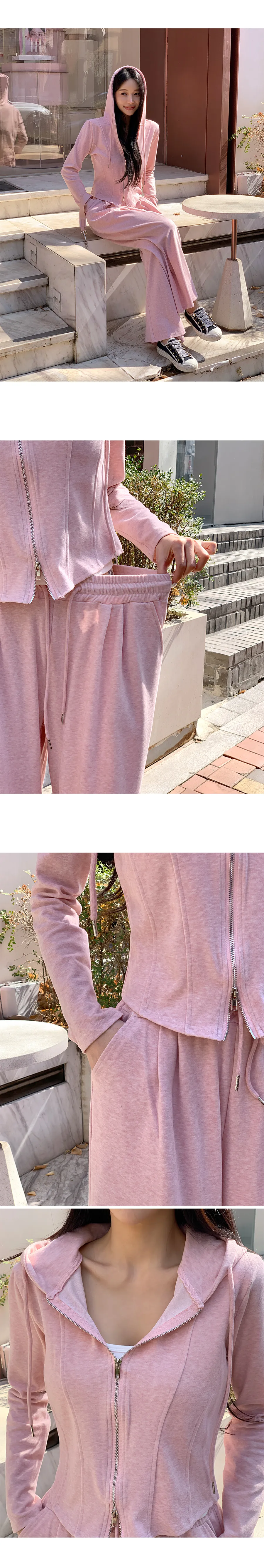 グリッターワッフルフード長袖ウエストゴムドローストリングジップアップセミクロップドドロップショルダーワイドドローコードセットアップジップパーカーパンツ2WAY