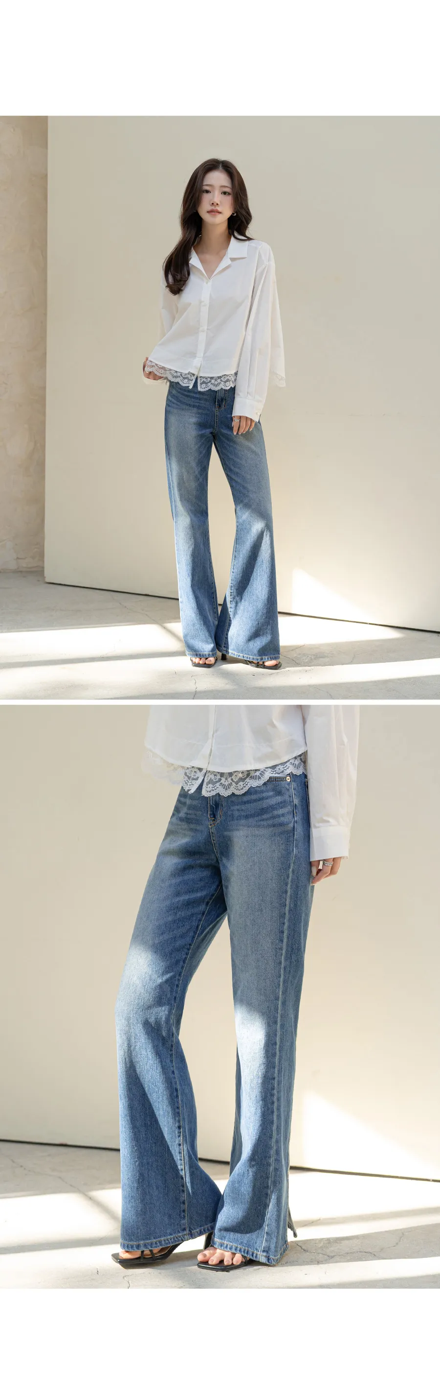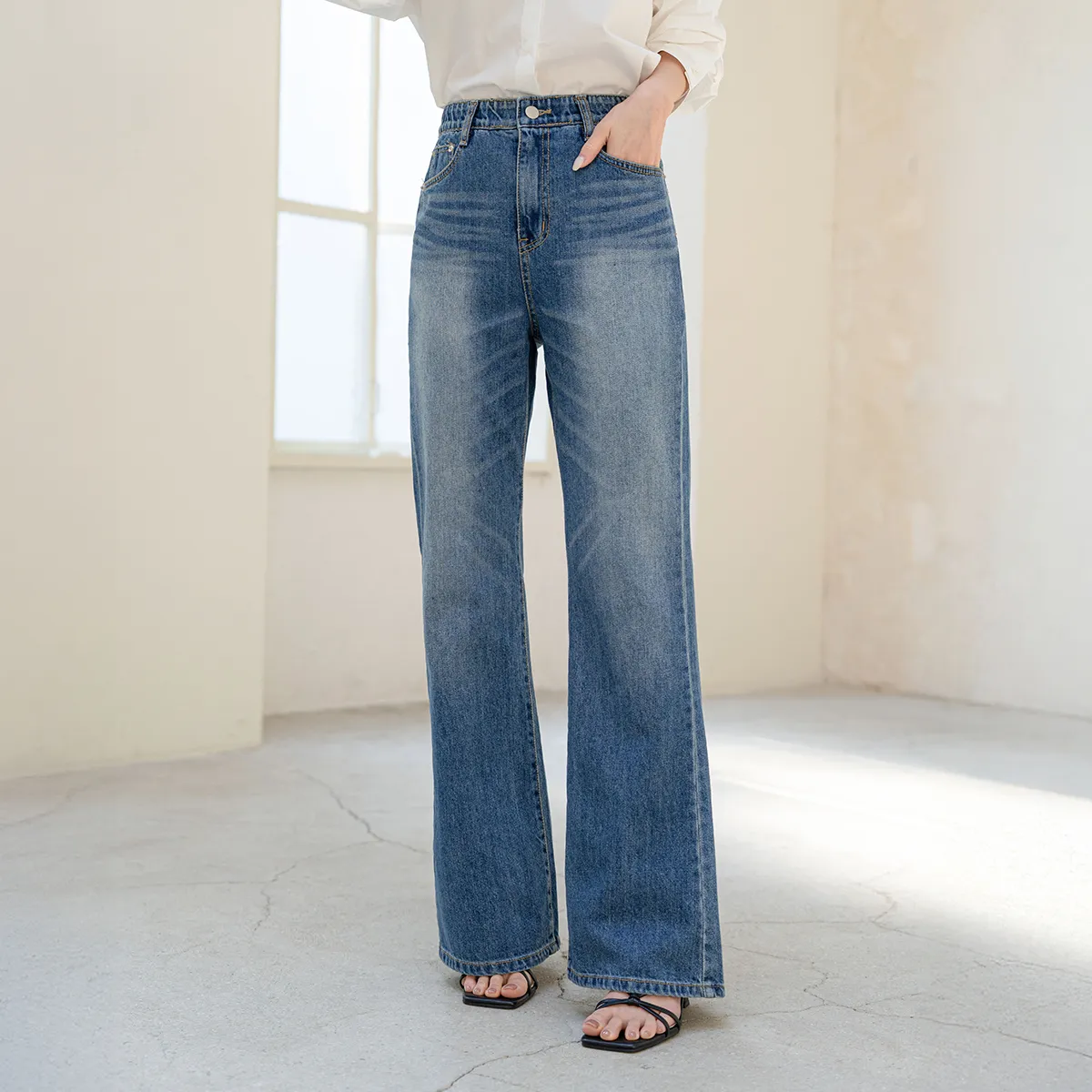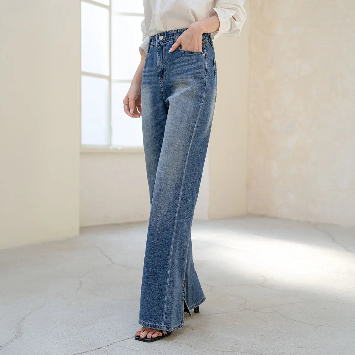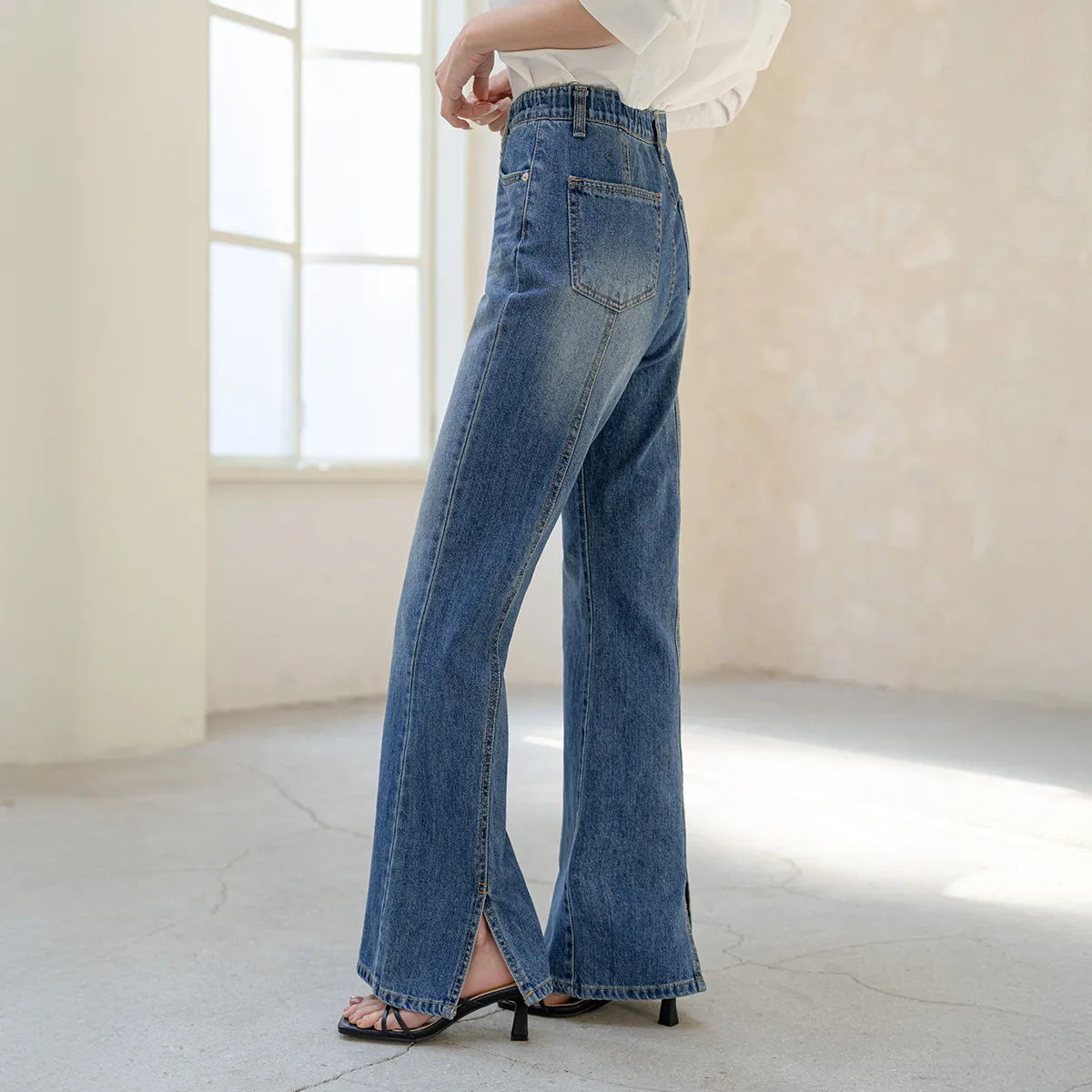 ストレッチデニムジップアップバックルウォッシングポケット骨盤パッドスリムロングフラップポケットリベットループバックポケットブーツカットライトブルーデニムパンツ