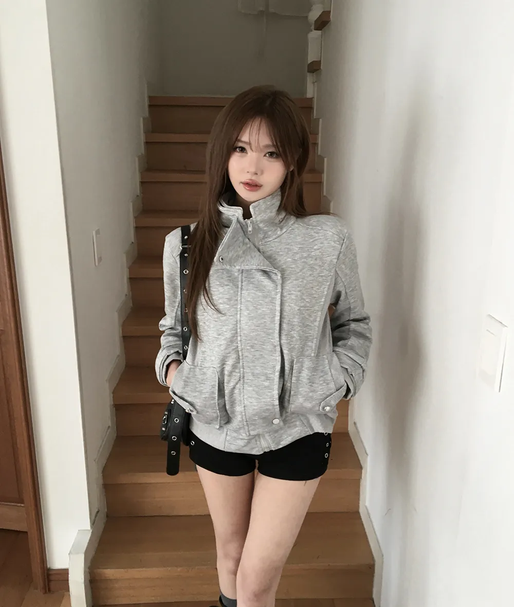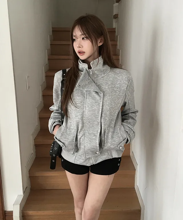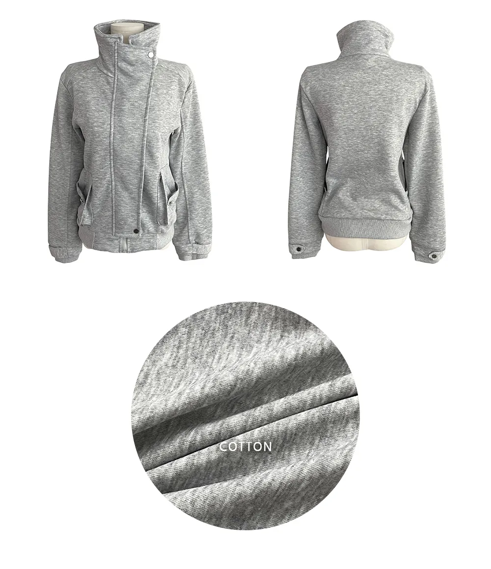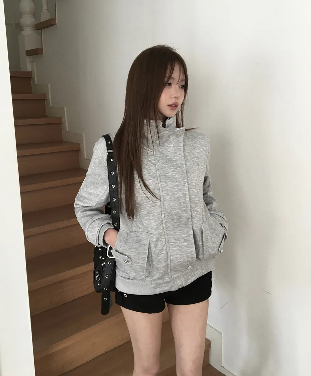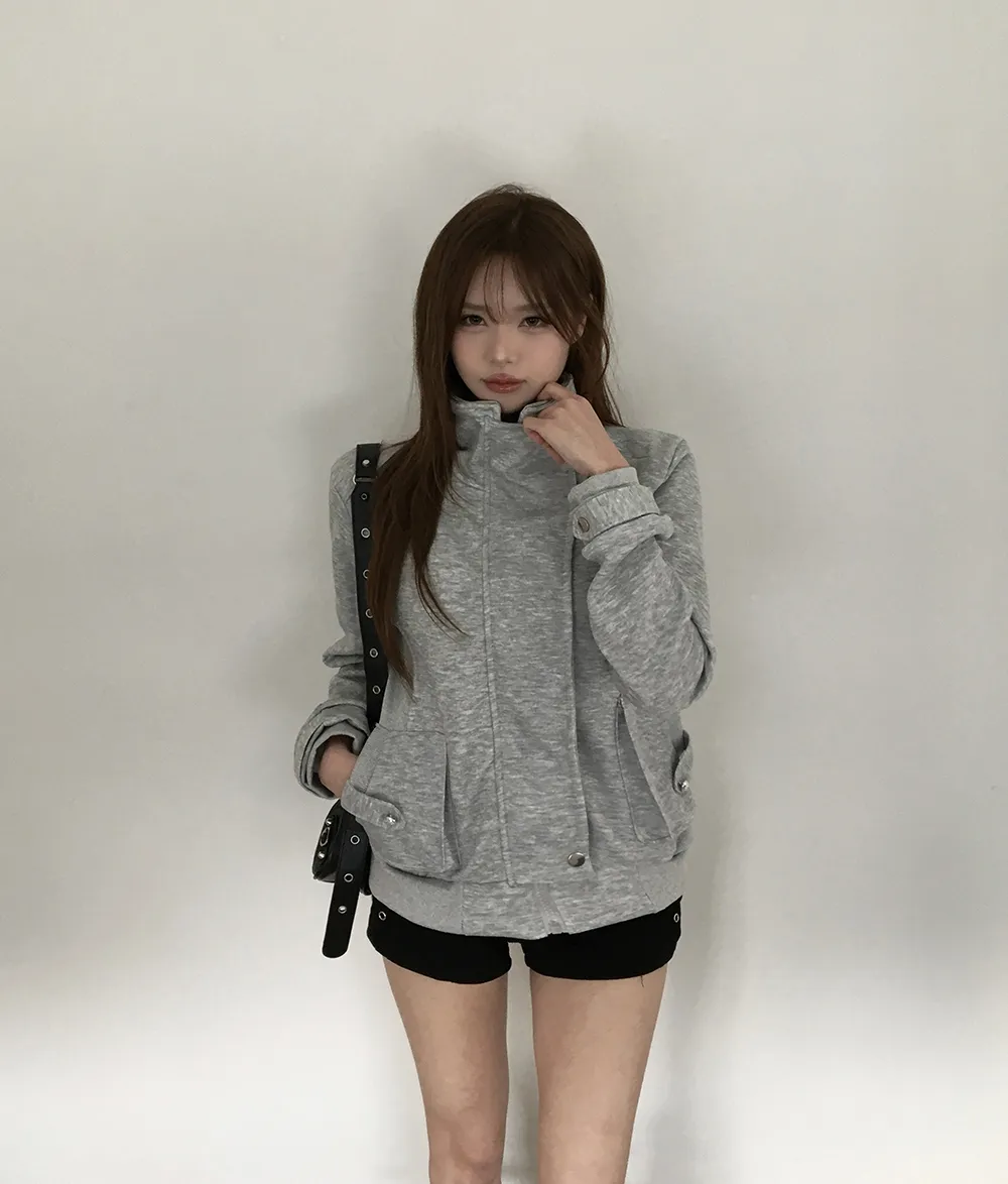 コットンジップアップハイネックゴムポケットオーバーサイズ長袖フラップポケットボタンスリーブスタッズスナップボタンハーフドロップショルダー無地ジャンパー