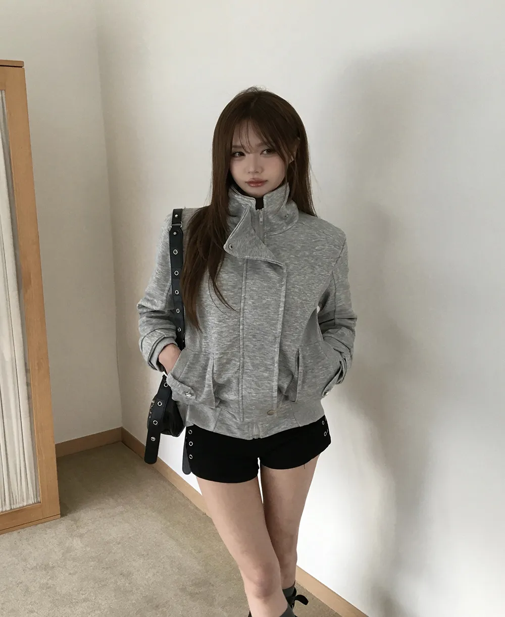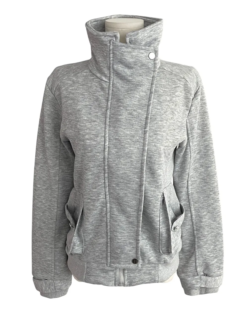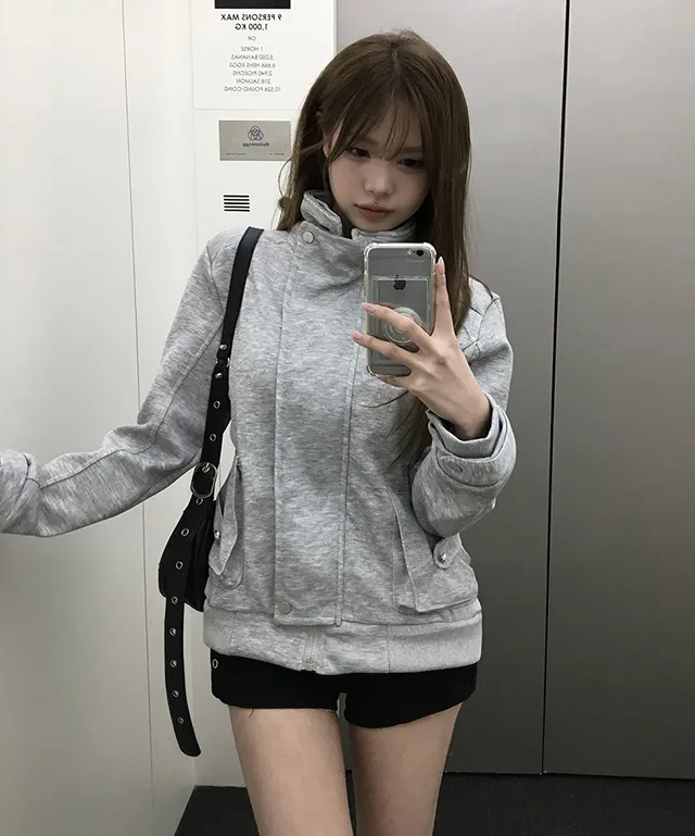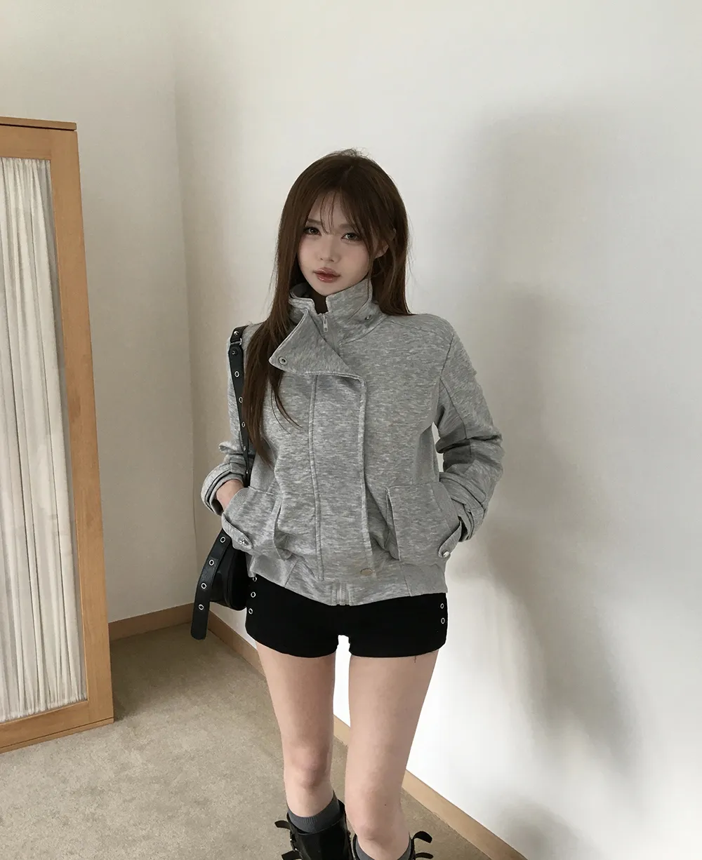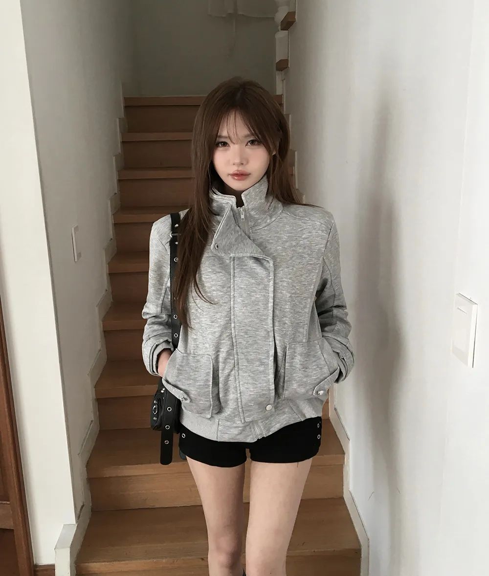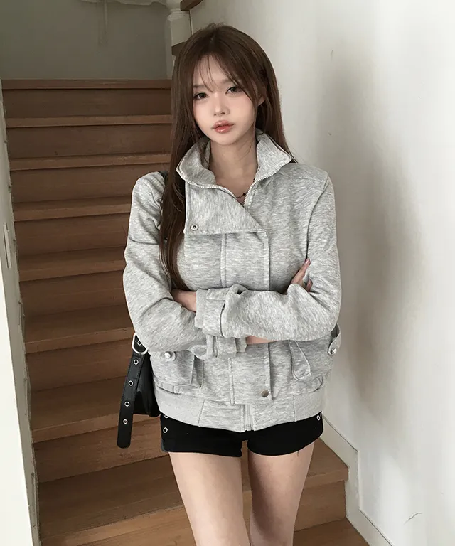 コットンジップアップハイネックゴムポケットオーバーサイズ長袖フラップポケットボタンスリーブスタッズスナップボタンハーフドロップショルダー無地ジャンパー