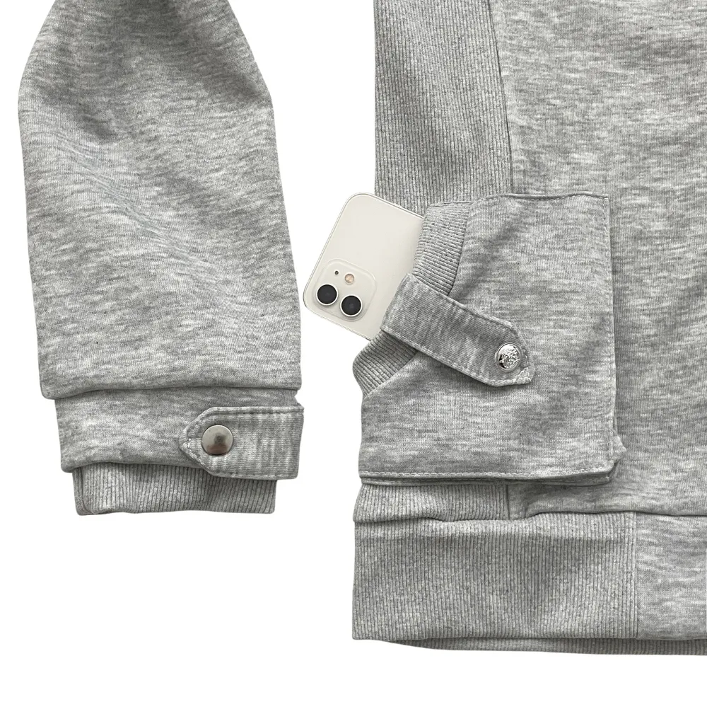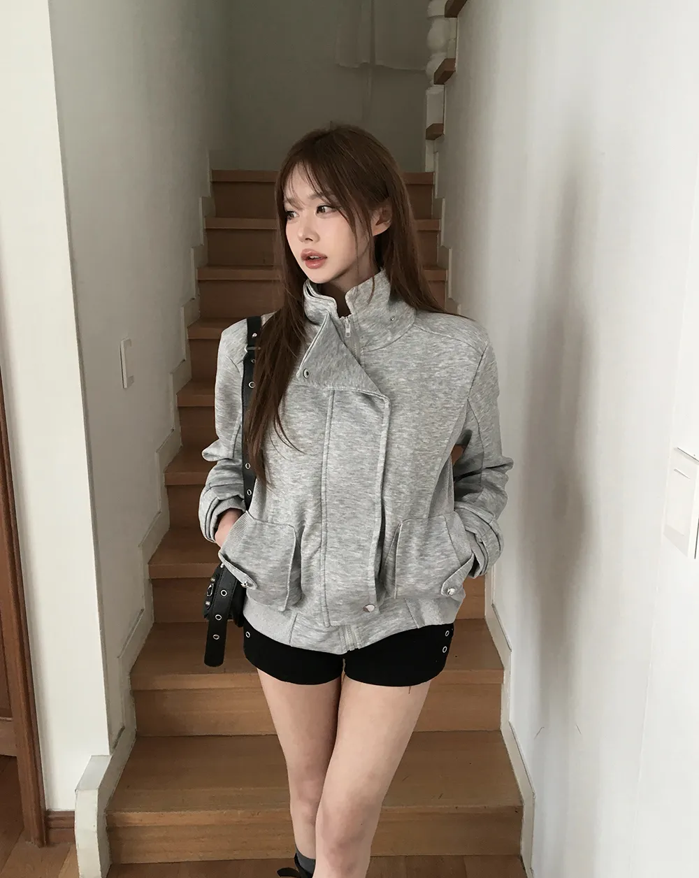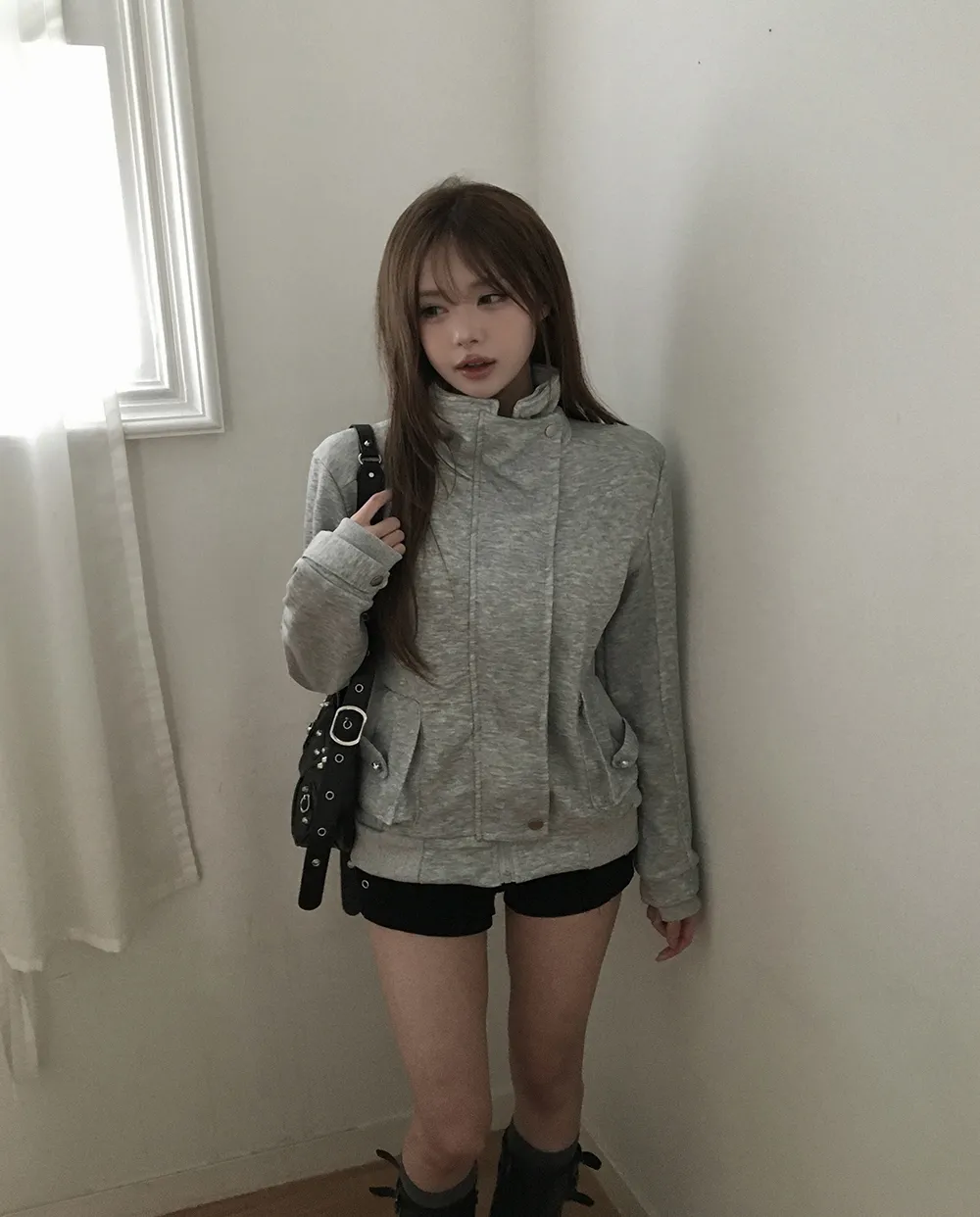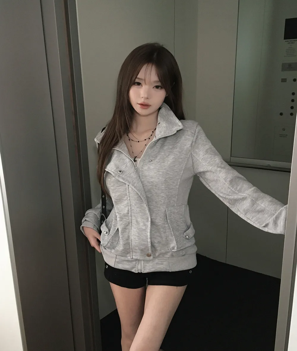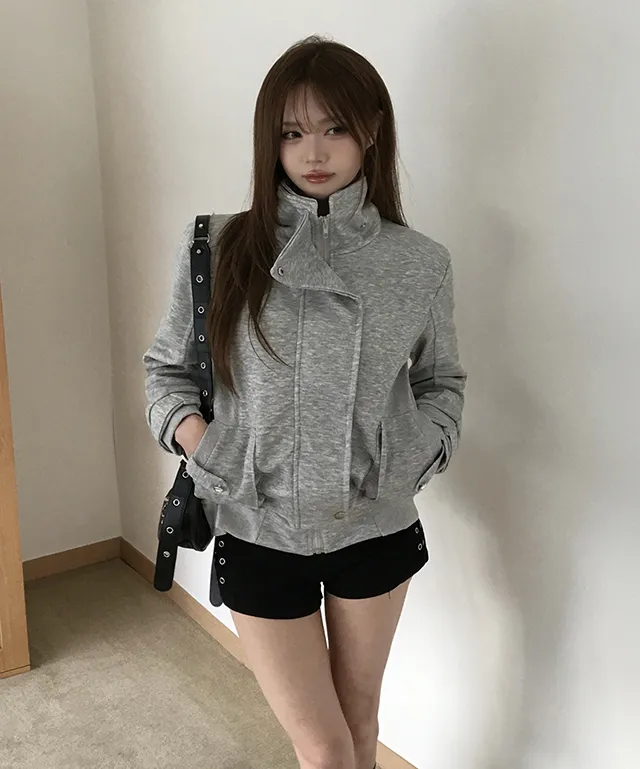 コットンジップアップハイネックゴムポケットオーバーサイズ長袖フラップポケットボタンスリーブスタッズスナップボタンハーフドロップショルダー無地ジャンパー