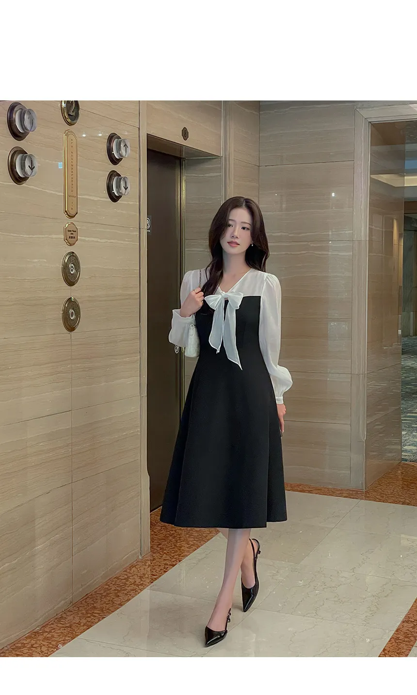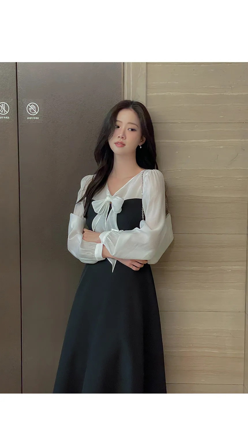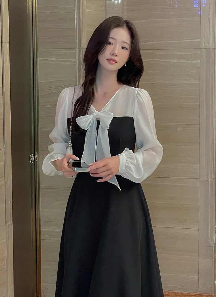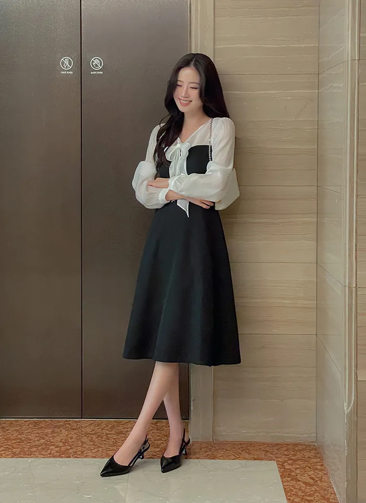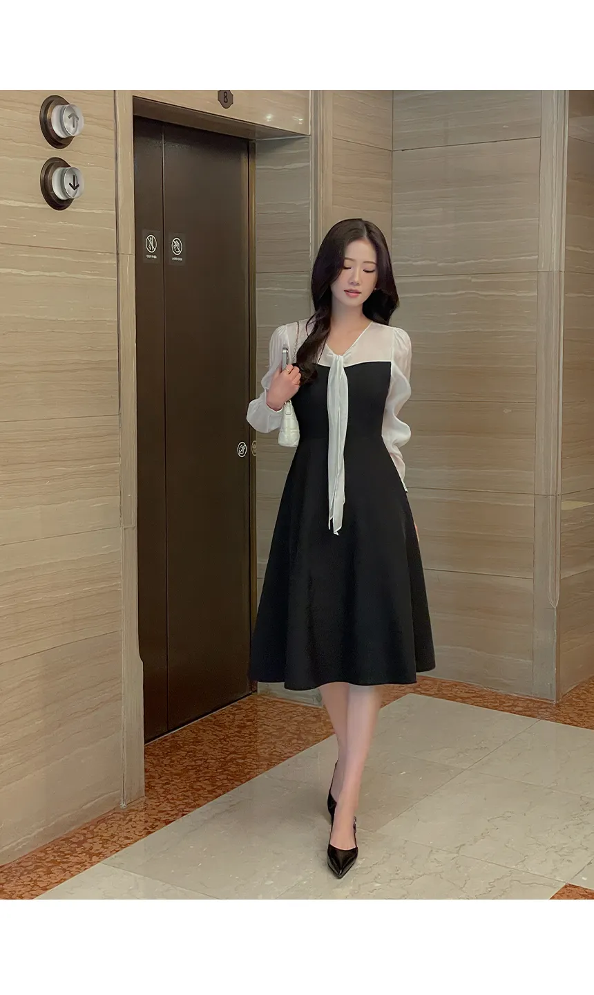 シフォンVネックティアードバックゴムパフスリーブロングアンバランス長袖ギャザーフレアAラインフェイクボタンヒドゥンジッパープリント花柄ワンピース