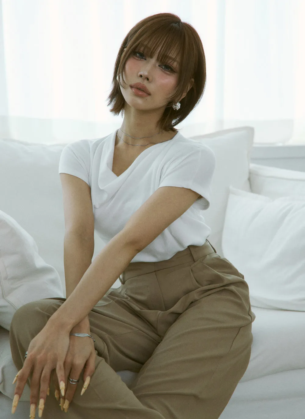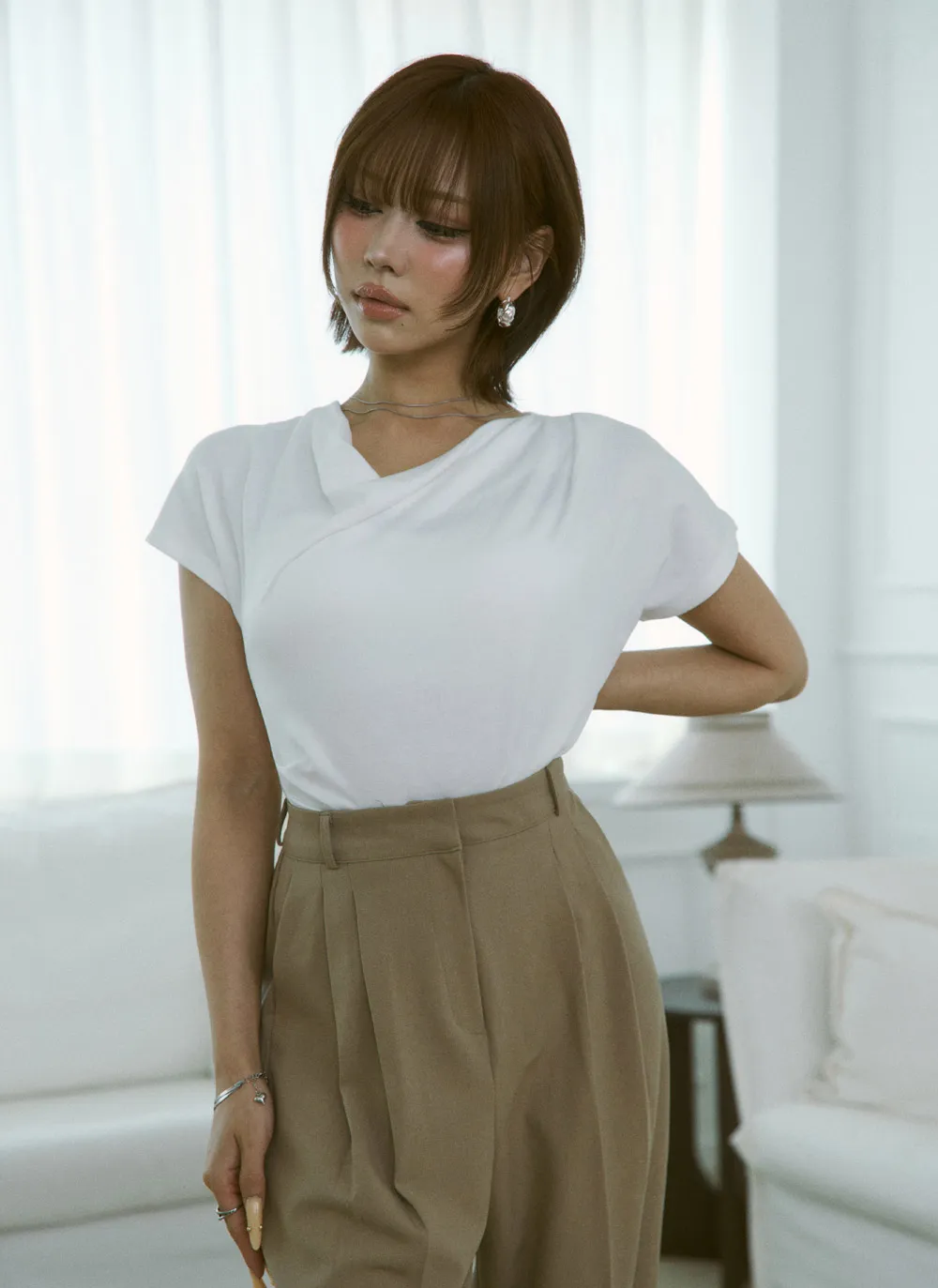 -ドレープシルエットで流れるようなスタイリッシュなデザイン