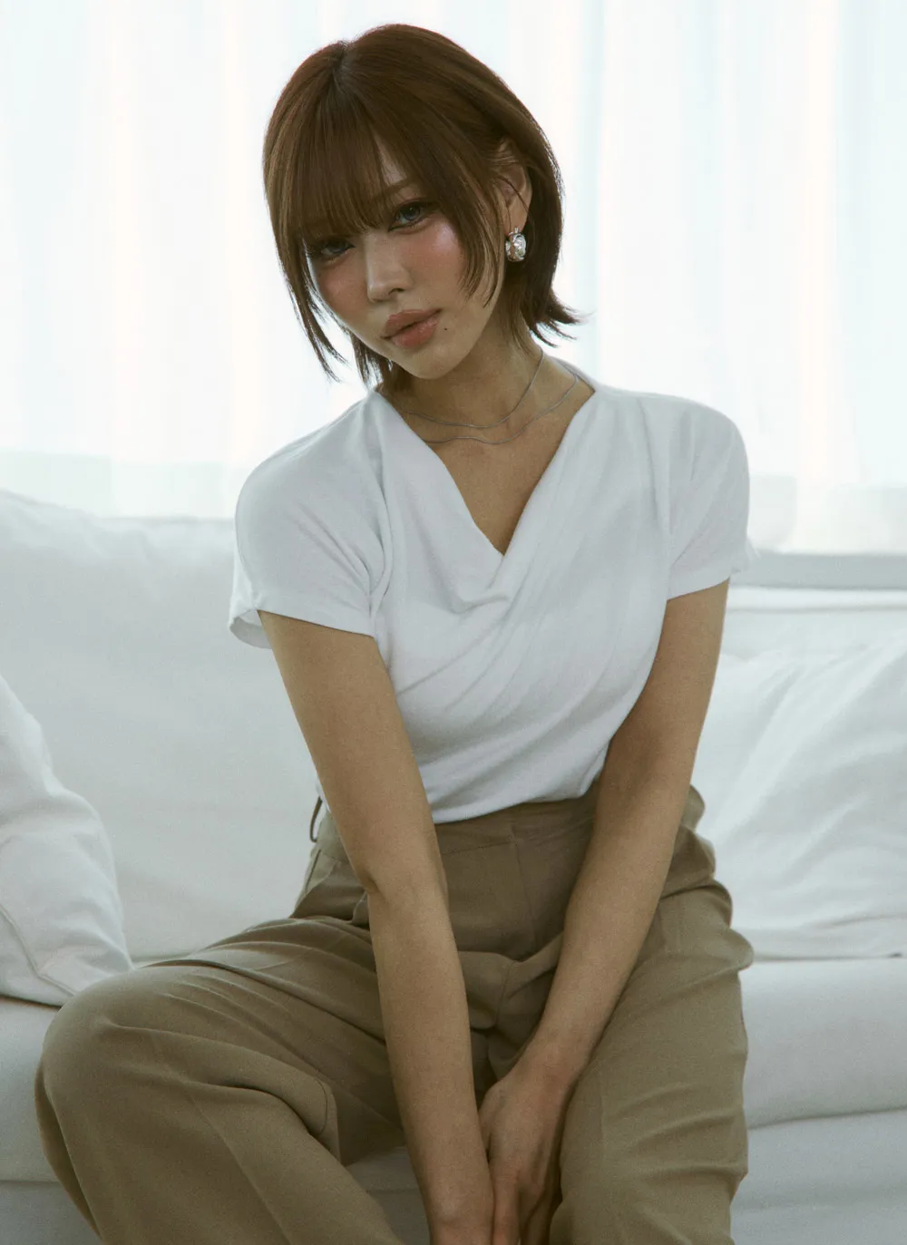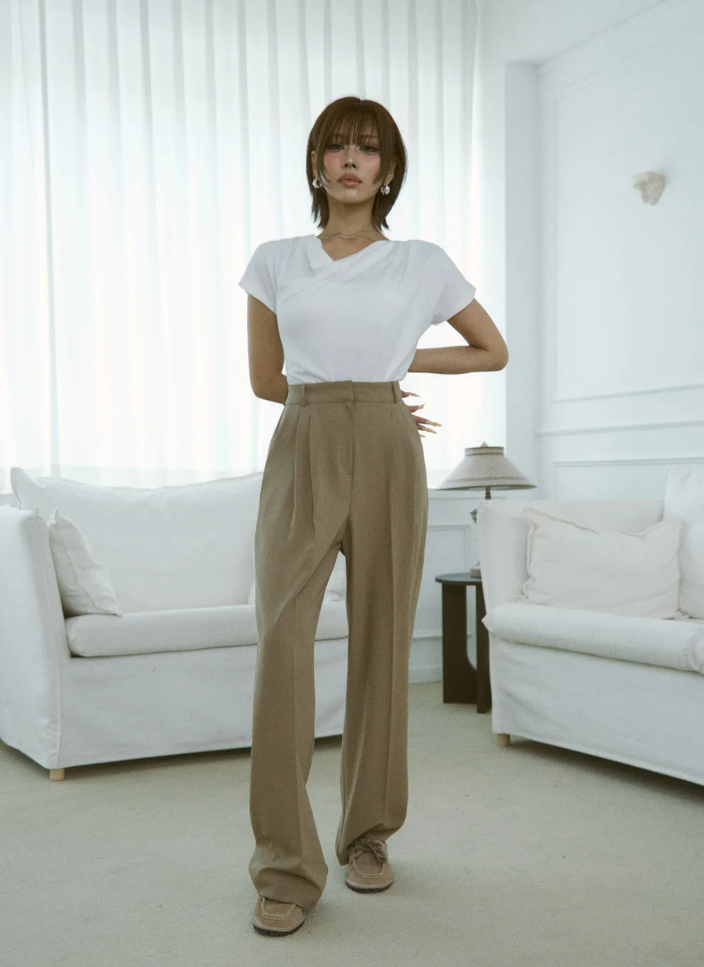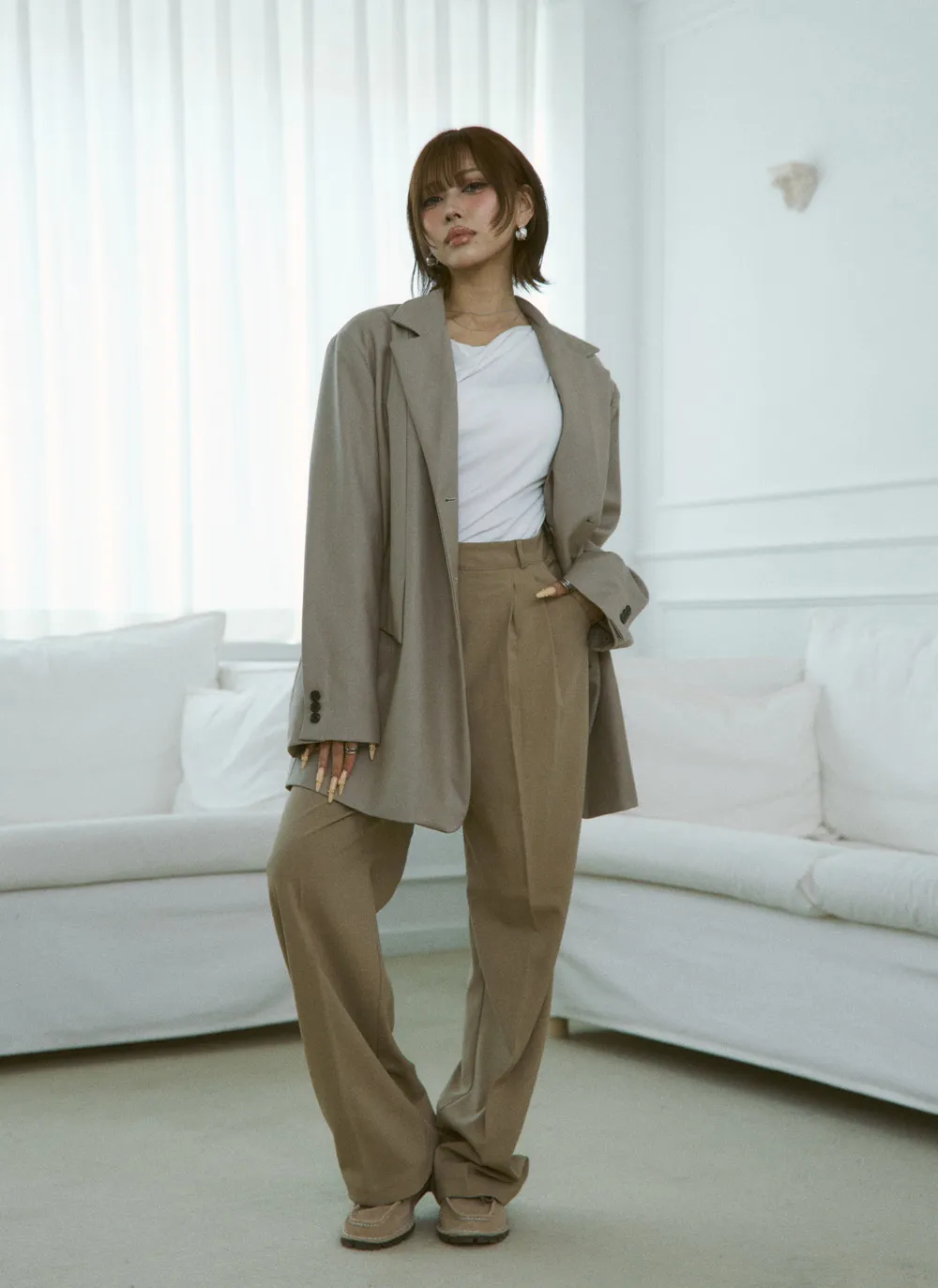 -モデルのようにスラックスと合わせてオフィスルックに、