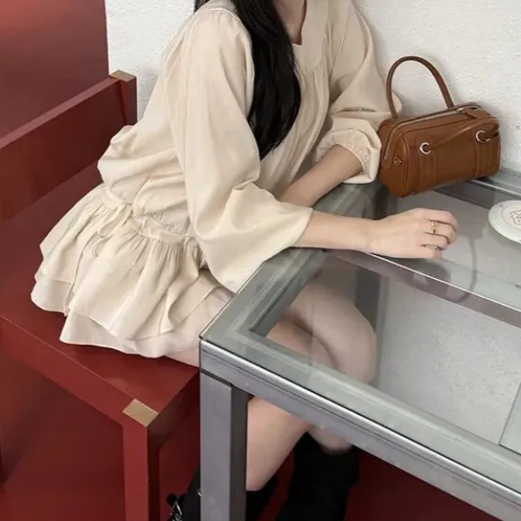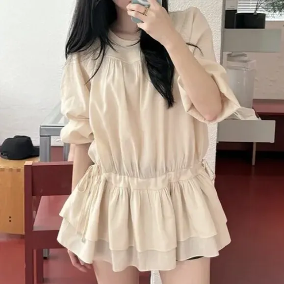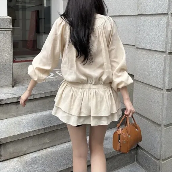 シフォンストラップVネックシャーリングドローストリングラッフルティアードウエストゴムパフスリーブオーバーサイズルーズ長袖くるみボタンドロップショルダー無地ワンピース・S1960494