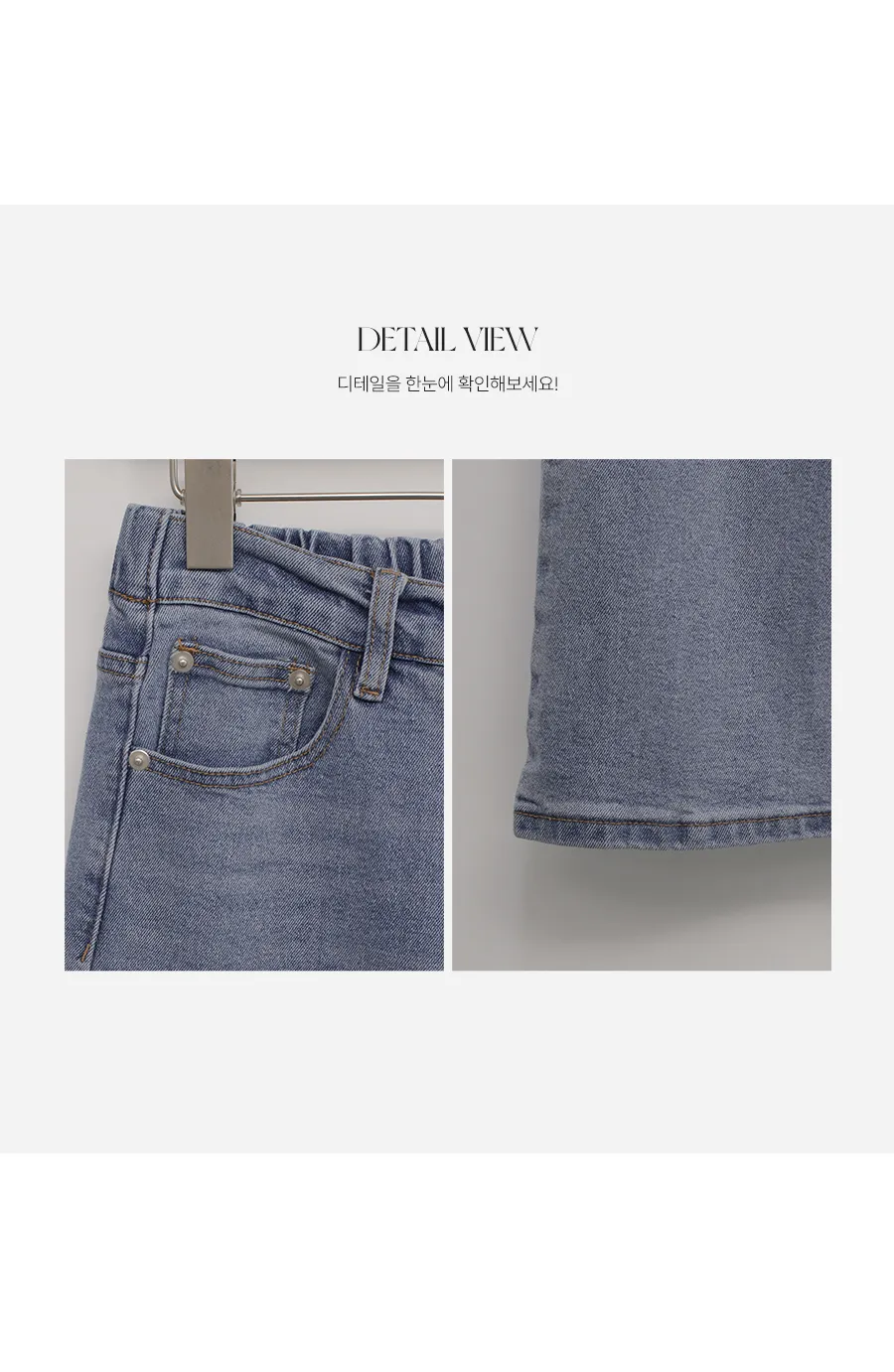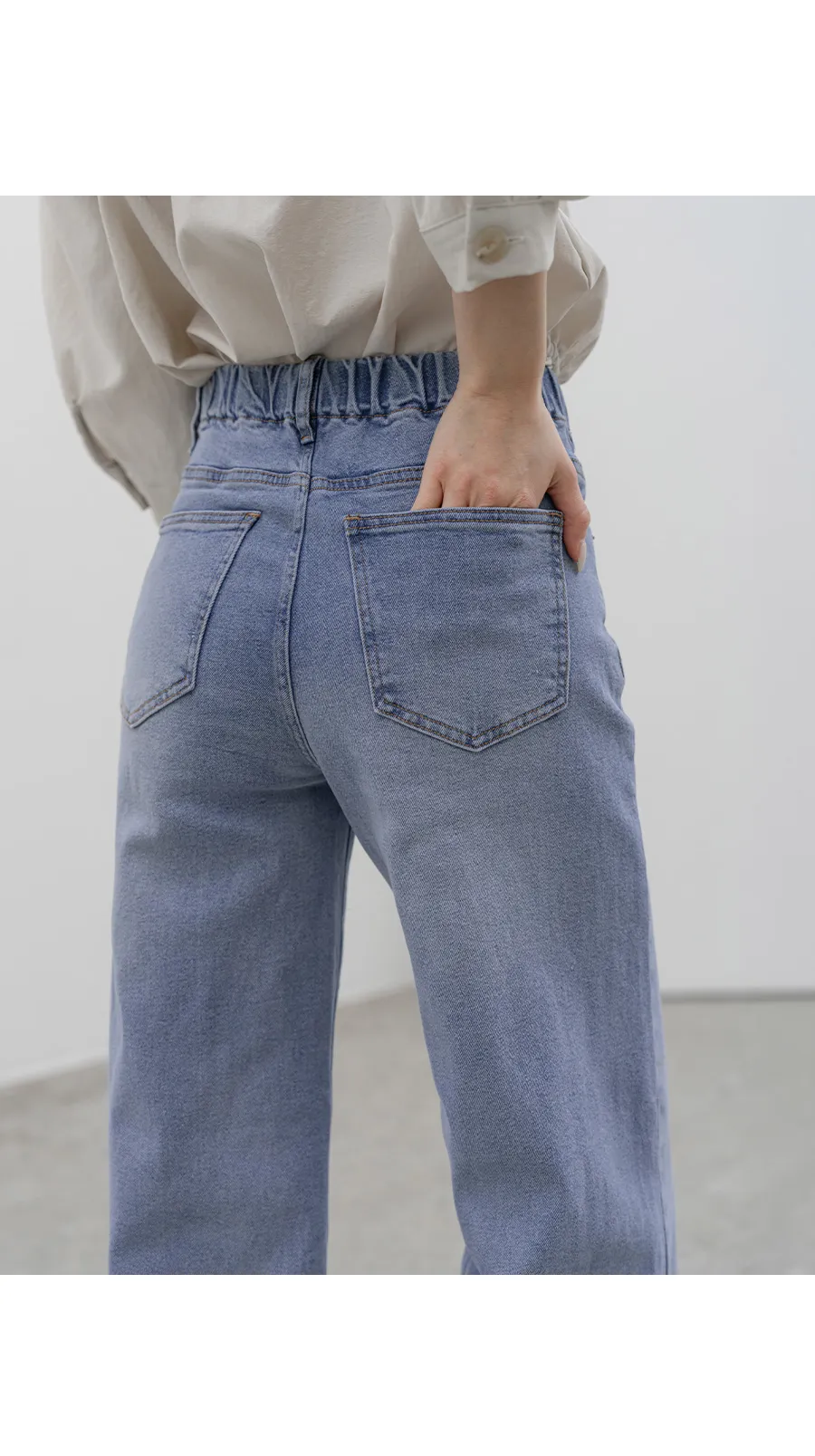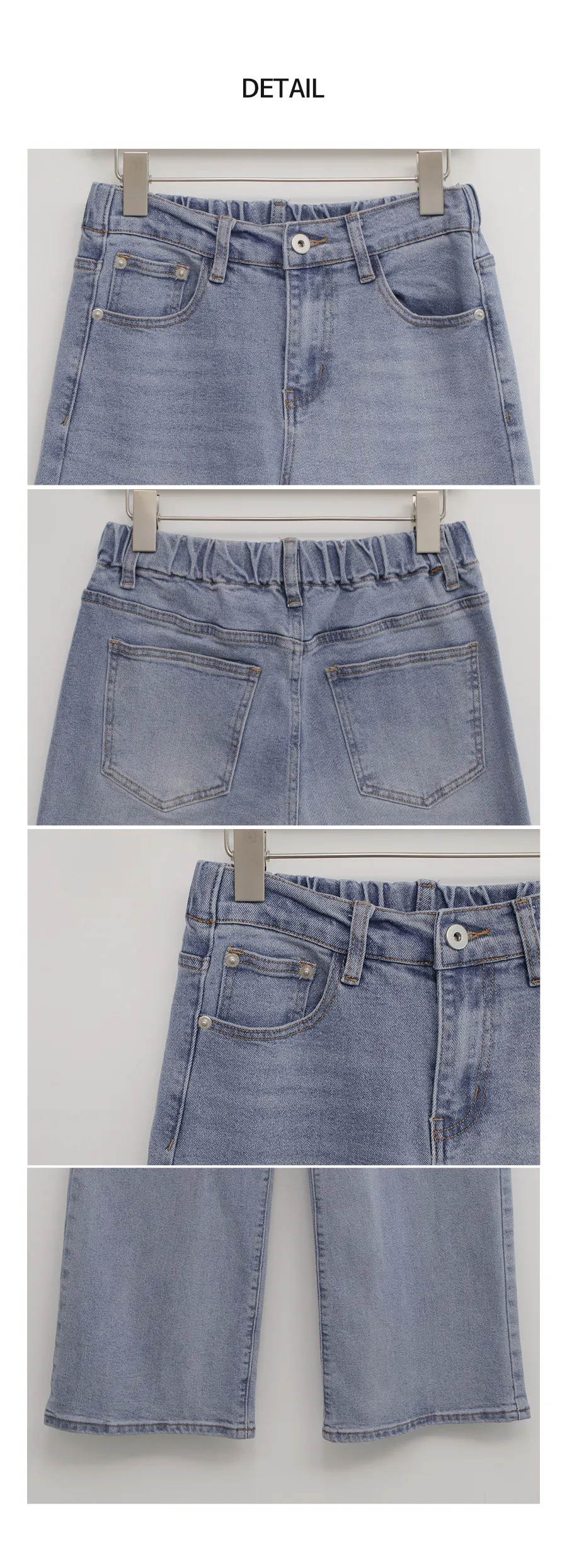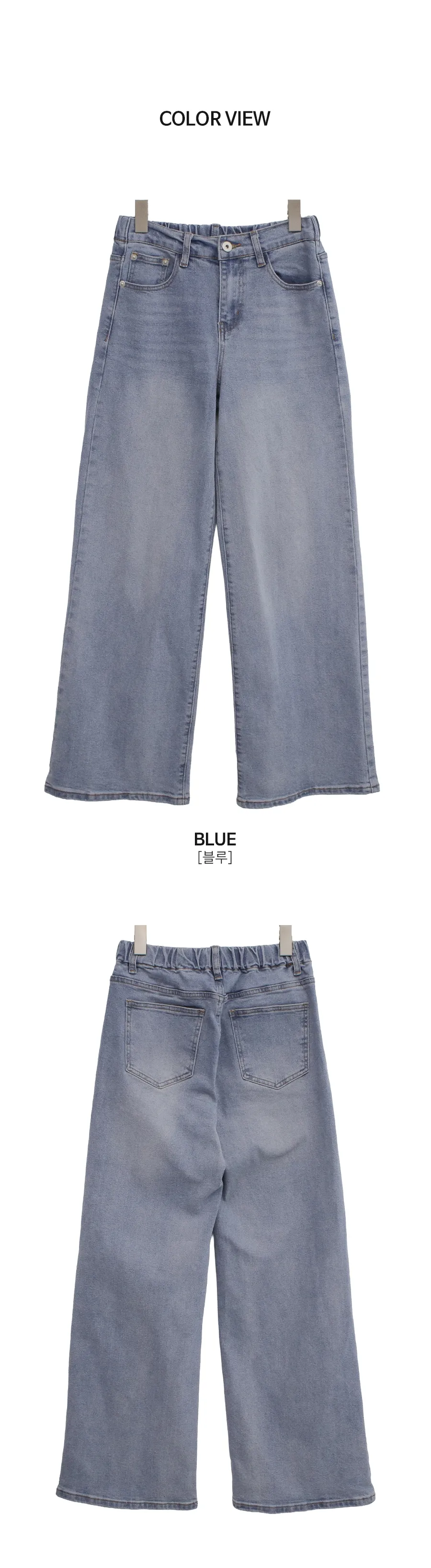 デニムコットンウォッシングポケットリベットバックポケットストレートワイドジップアップバックルループヒドゥンバンディングライトブルーディープブルーデニムパンツ[選べる丈]