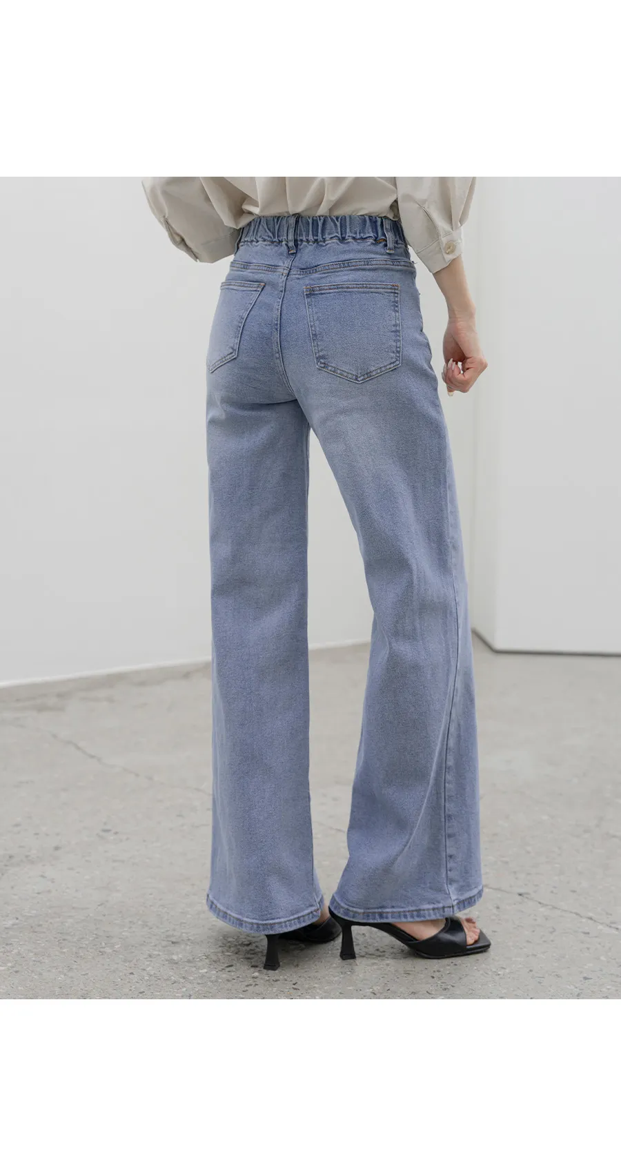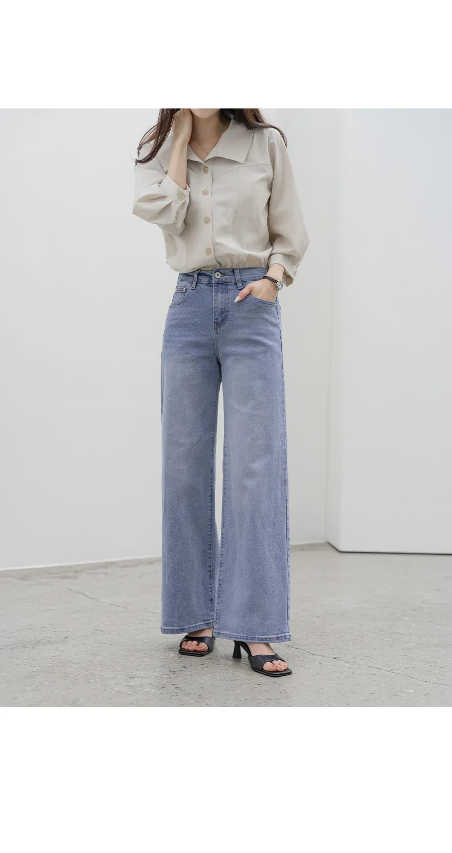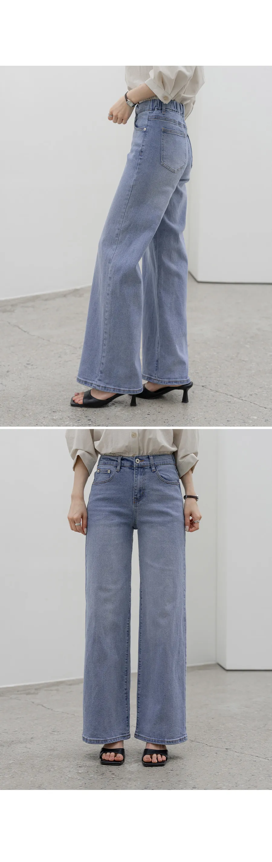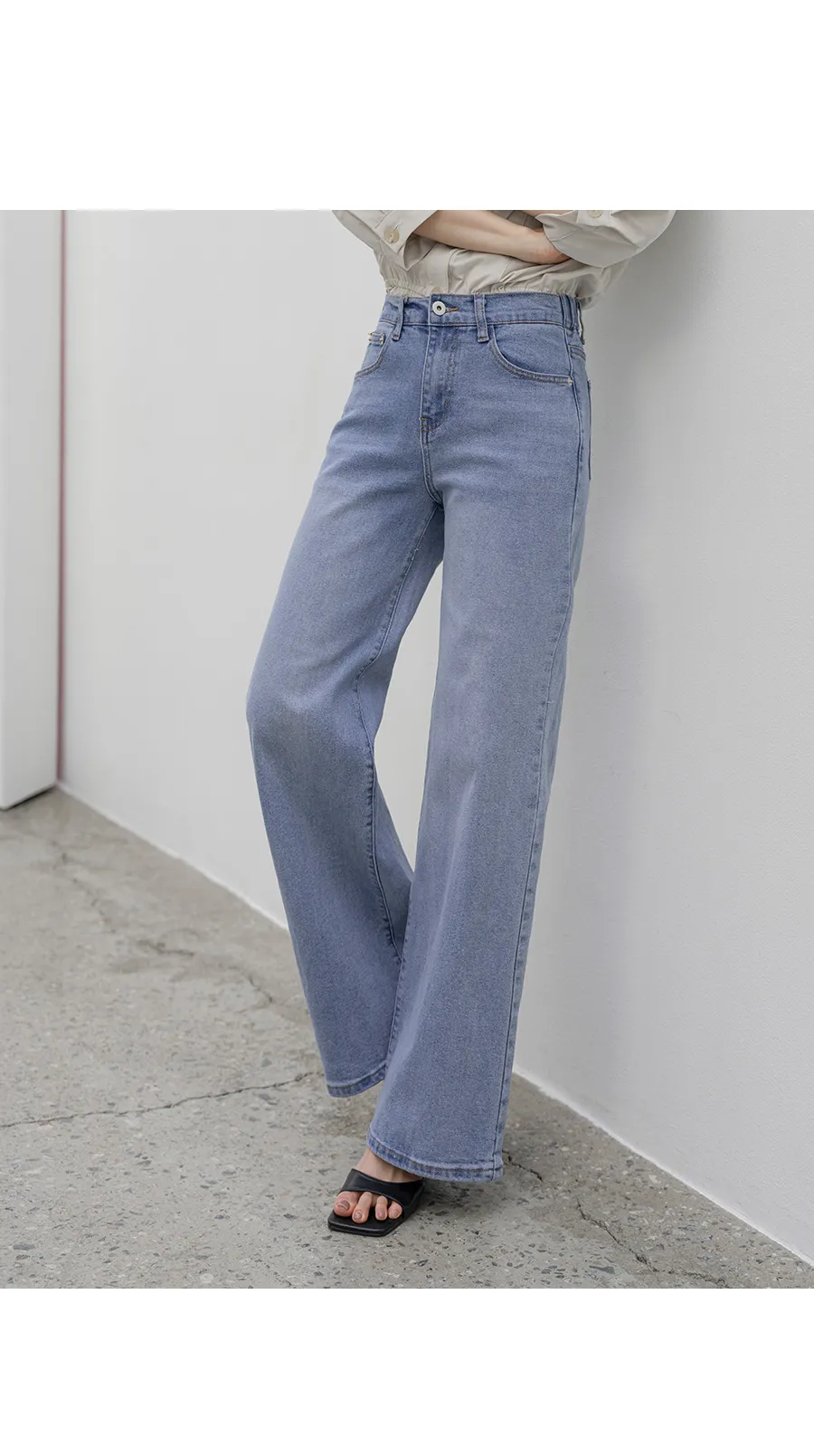 デニムコットンウォッシングポケットリベットバックポケットストレートワイドジップアップバックルループヒドゥンバンディングライトブルーディープブルーデニムパンツ[選べる丈]