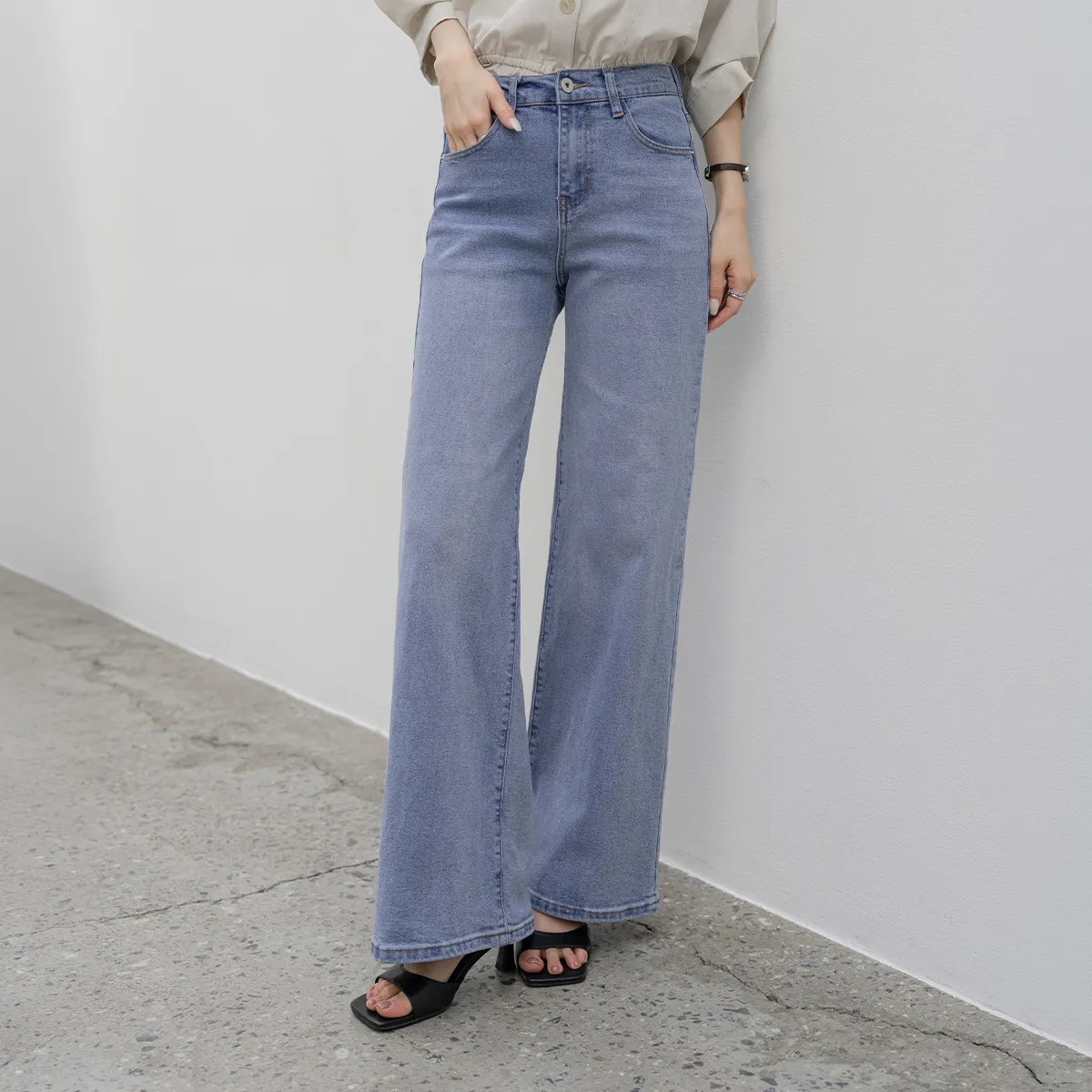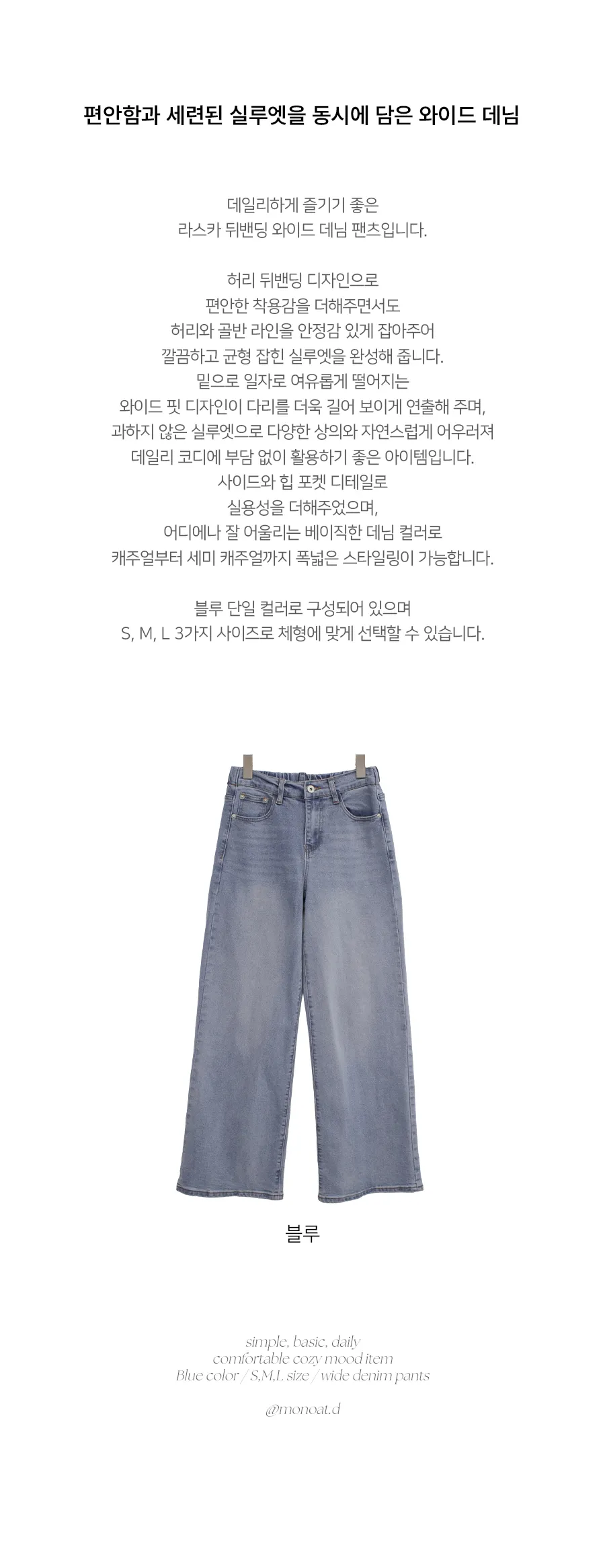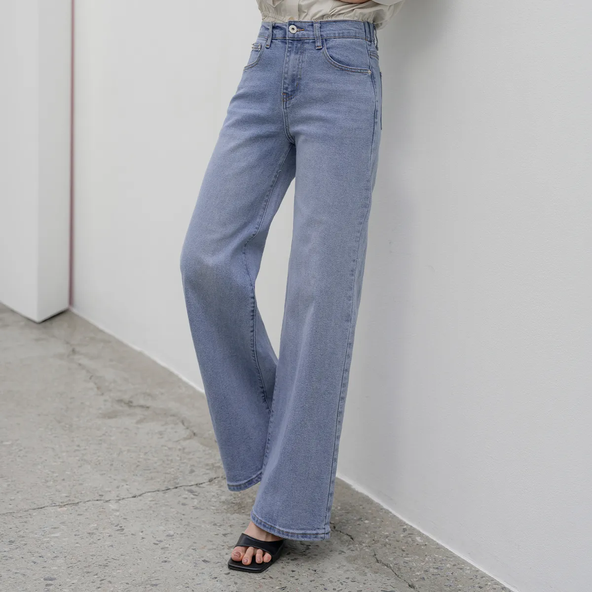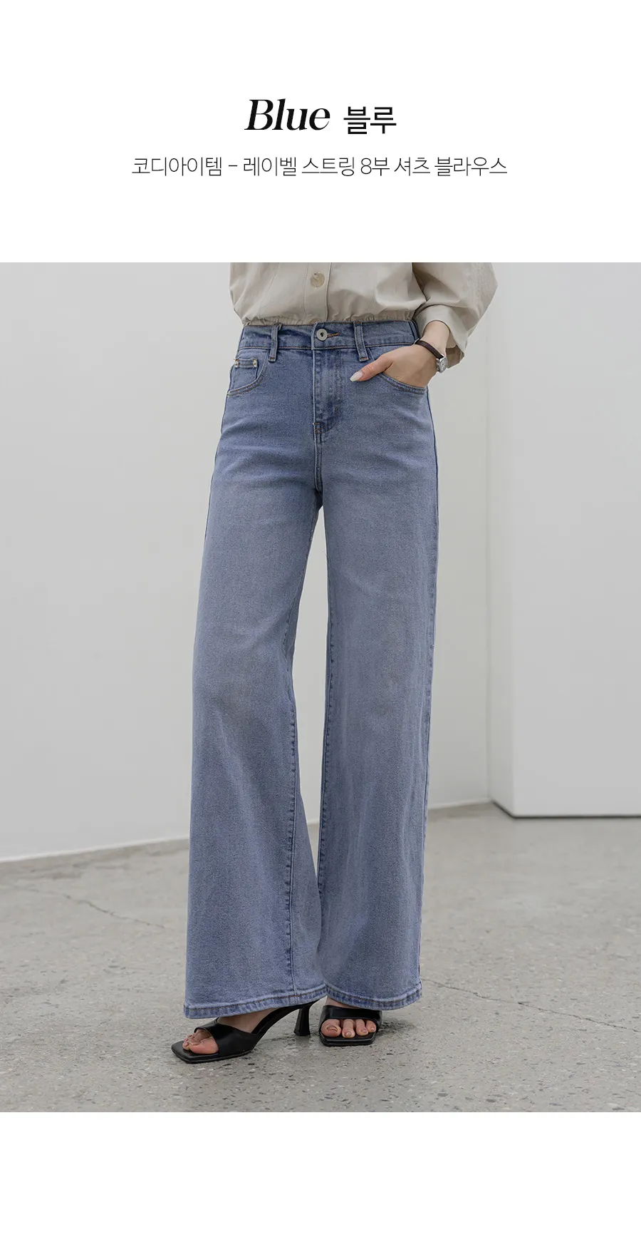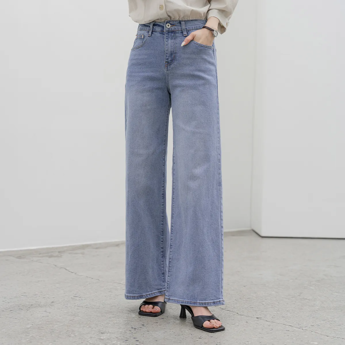 デニムコットンウォッシングポケットリベットバックポケットストレートワイドジップアップバックルループヒドゥンバンディングライトブルーディープブルーデニムパンツ[選べる丈]