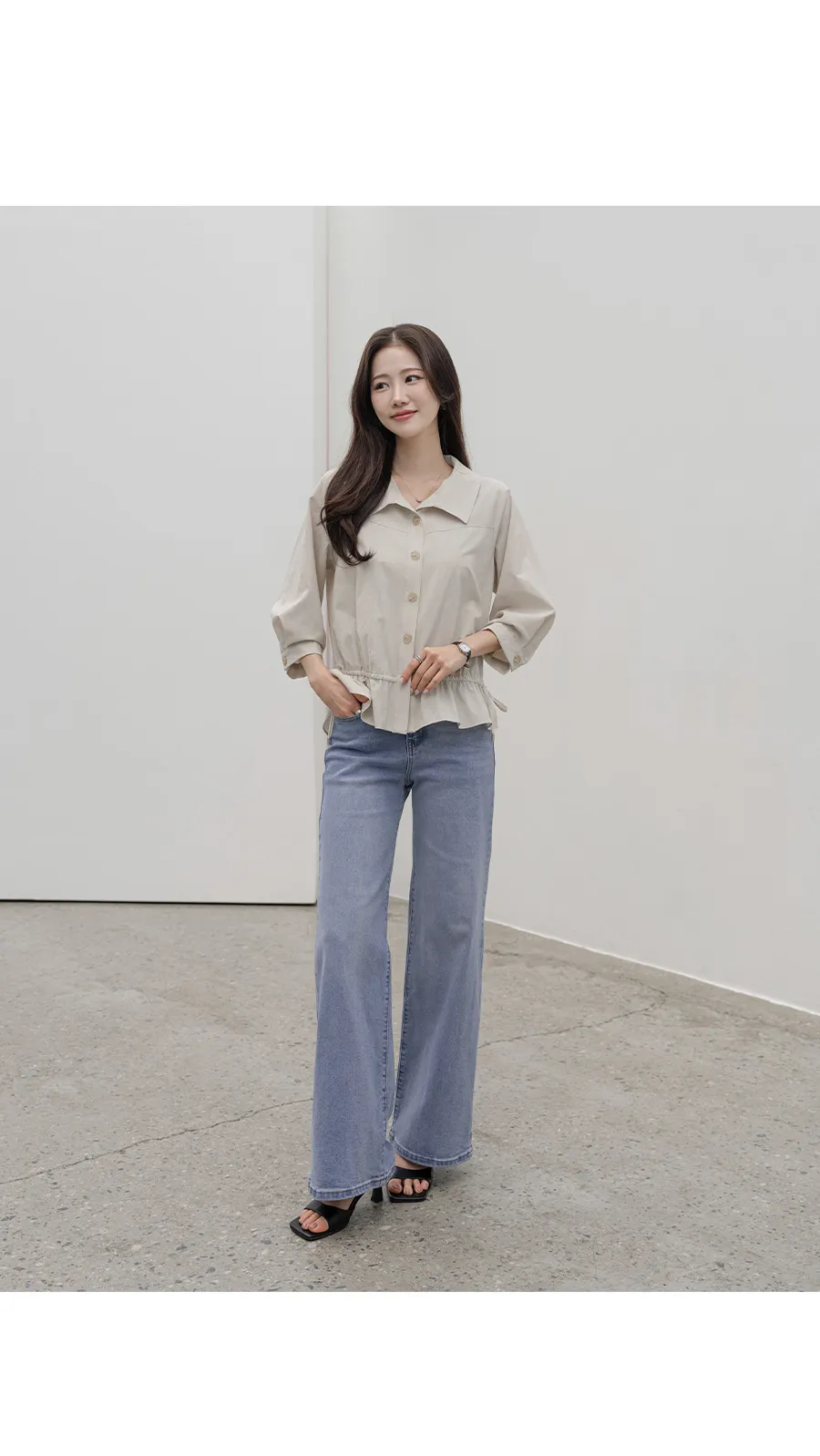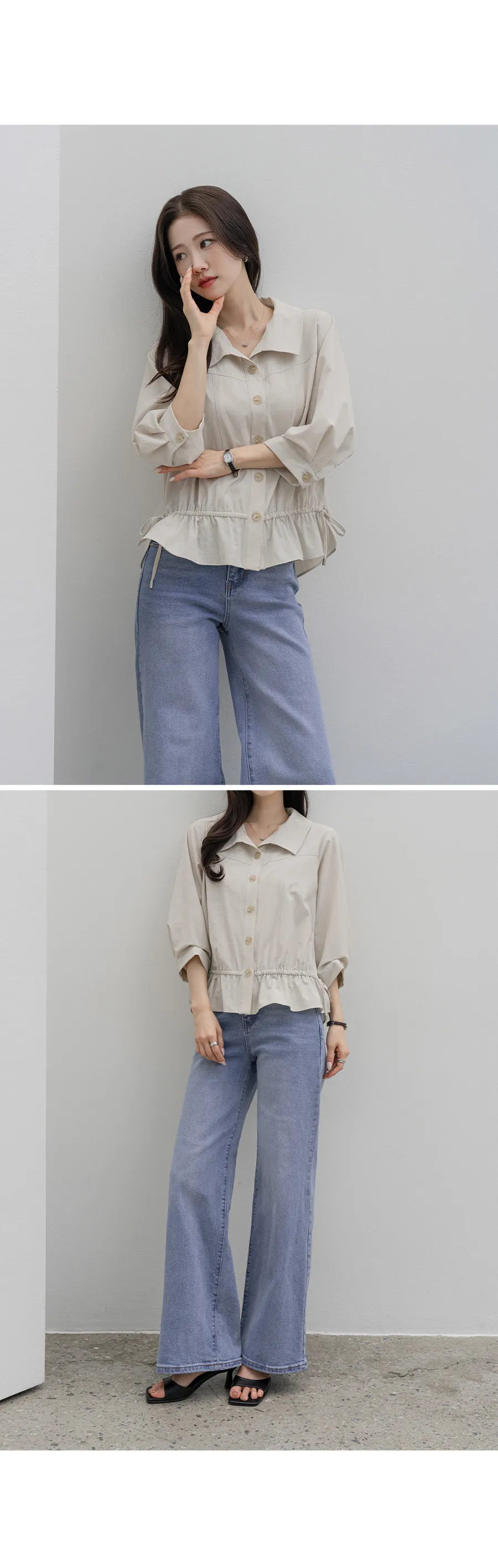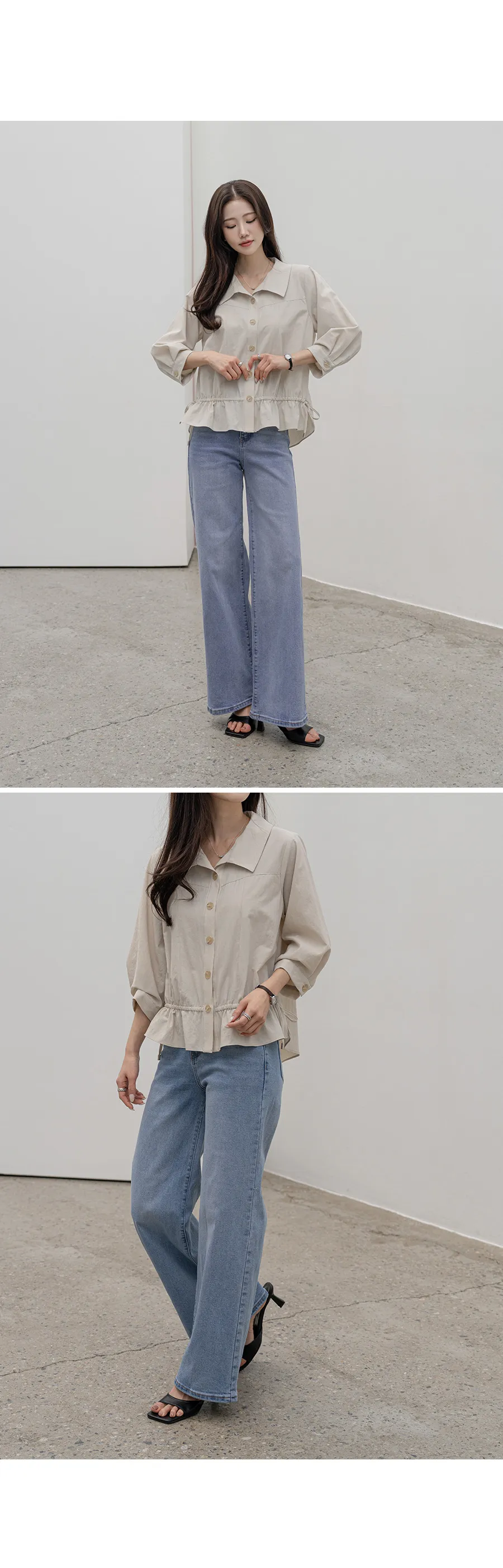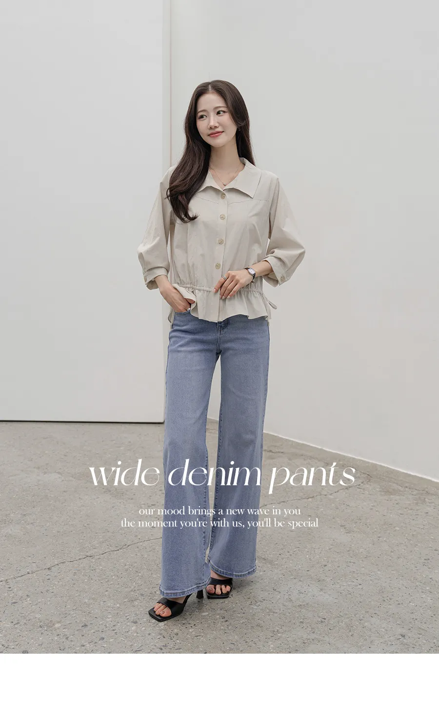 デニムコットンウォッシングポケットリベットバックポケットストレートワイドジップアップバックルループヒドゥンバンディングライトブルーディープブルーデニムパンツ[選べる丈]