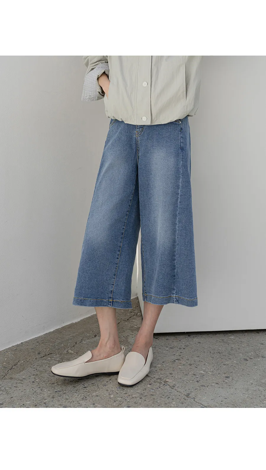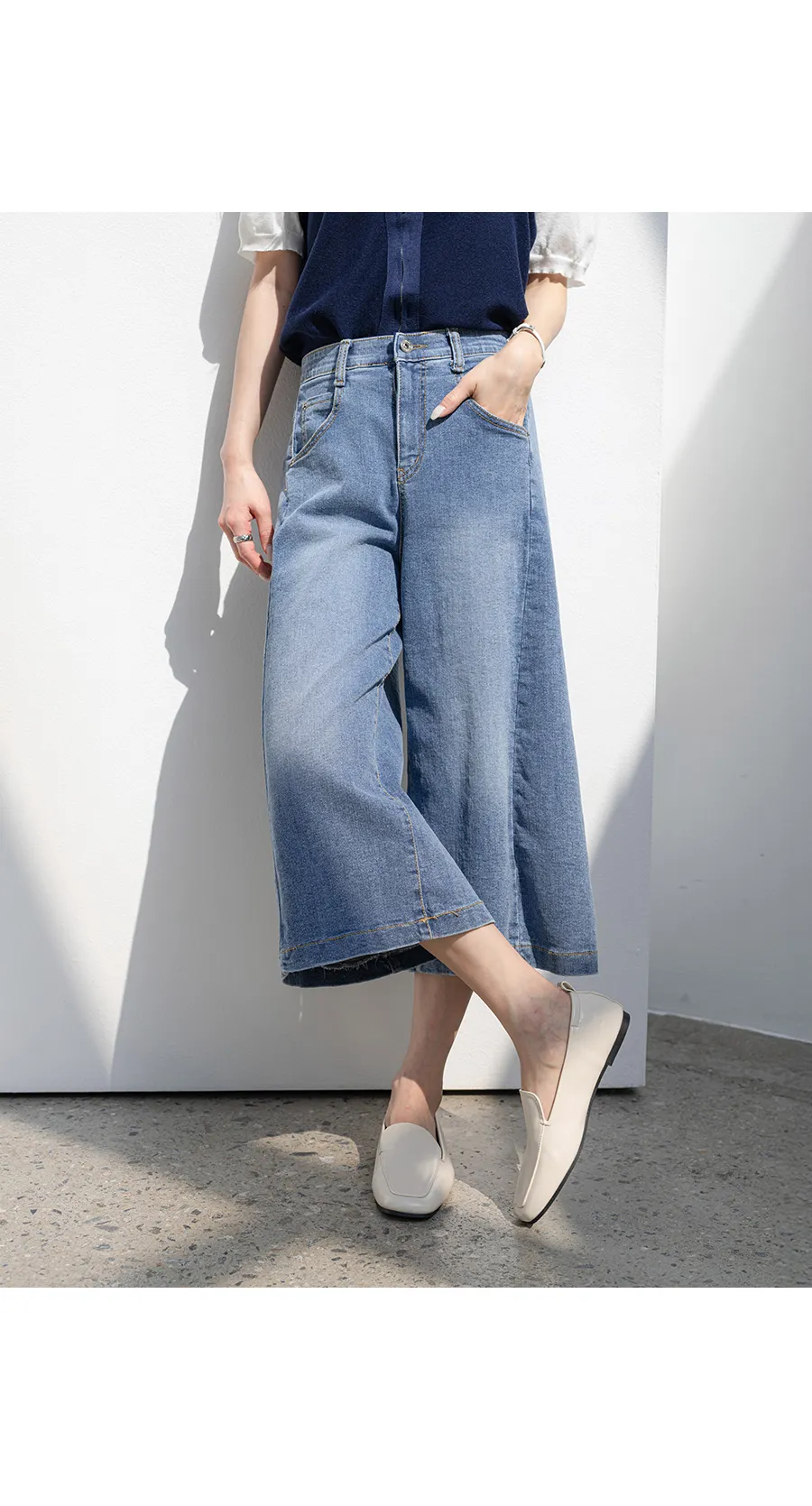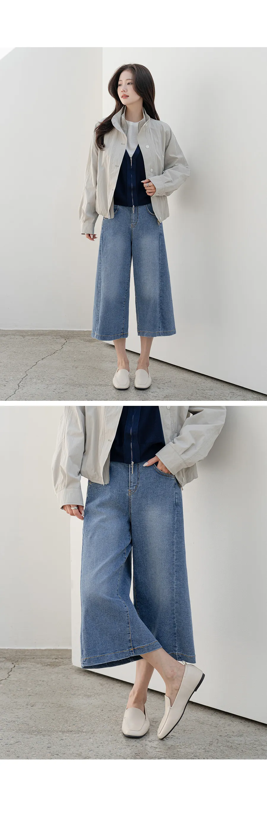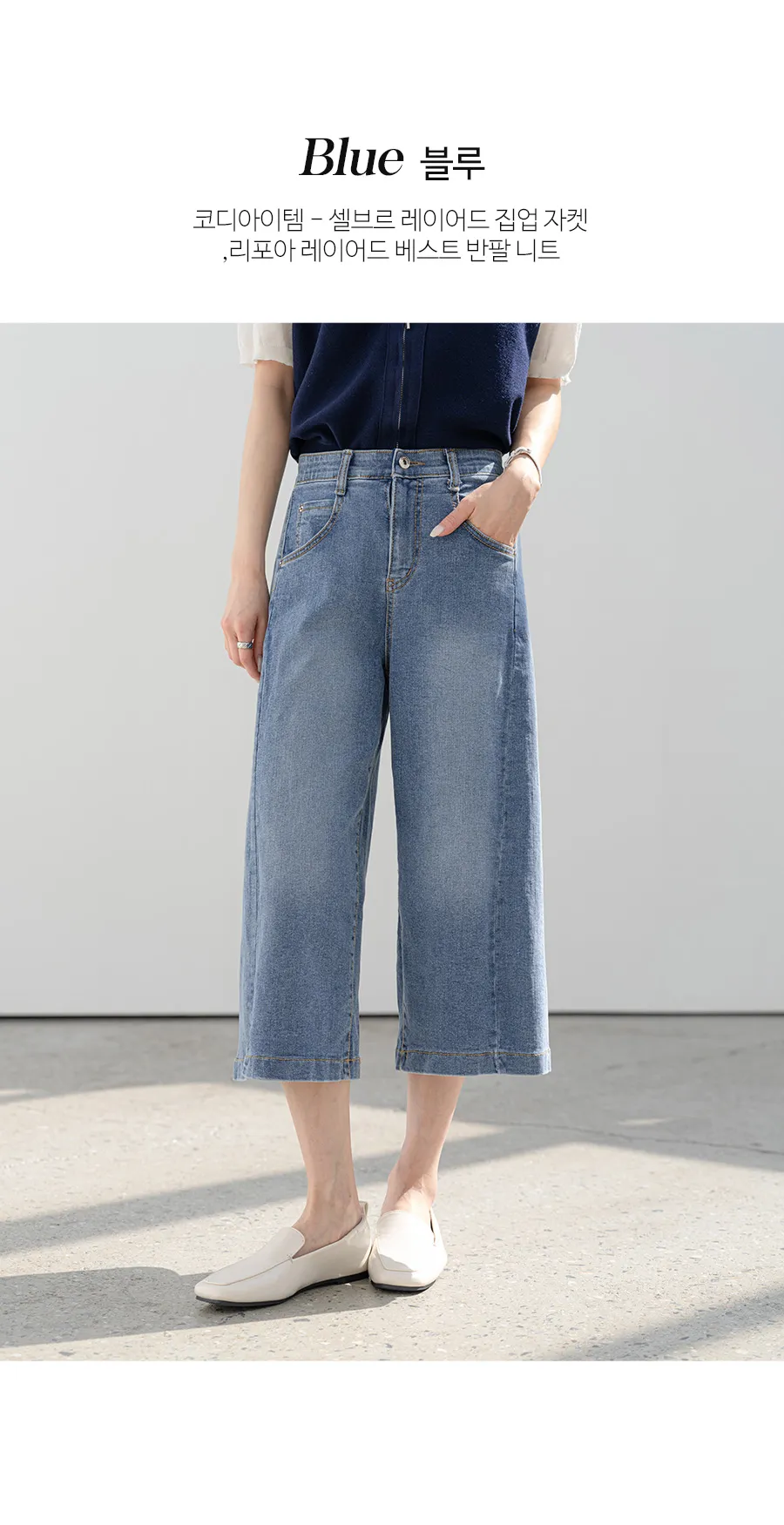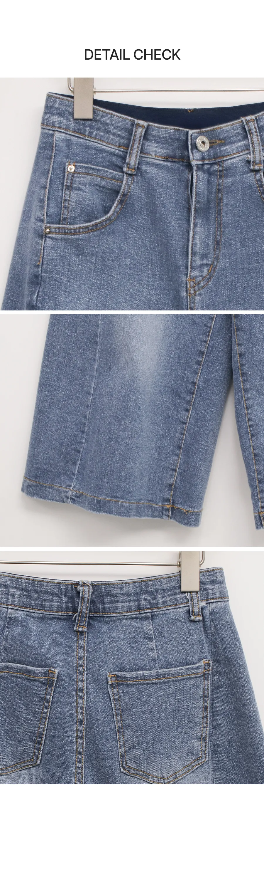 デニムコットンウォッシングポケットリベットバックポケットストレートワイドジップアップバックルループヒドゥンバンディングライトブルーディープブルーデニムパンツ[選べる丈]