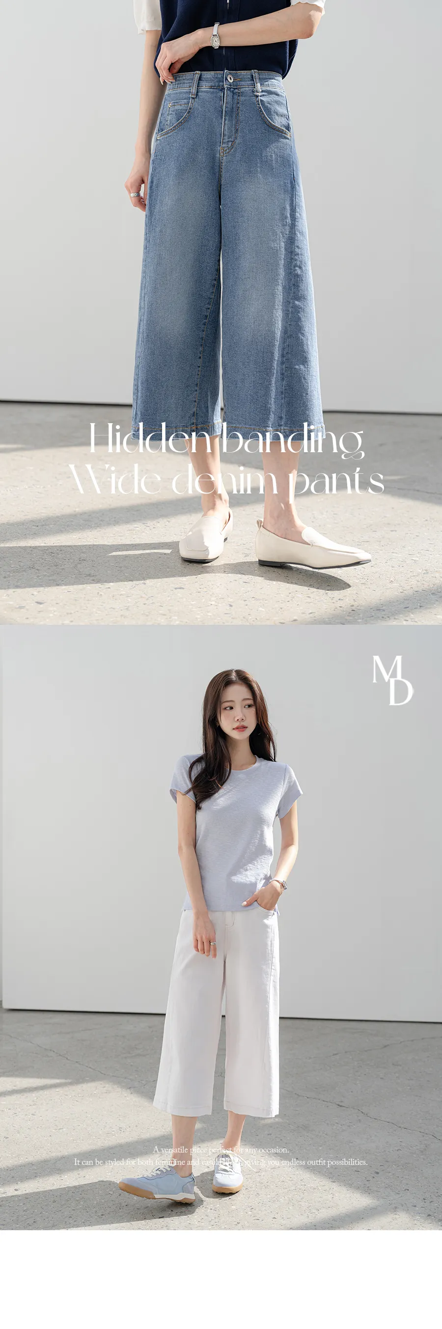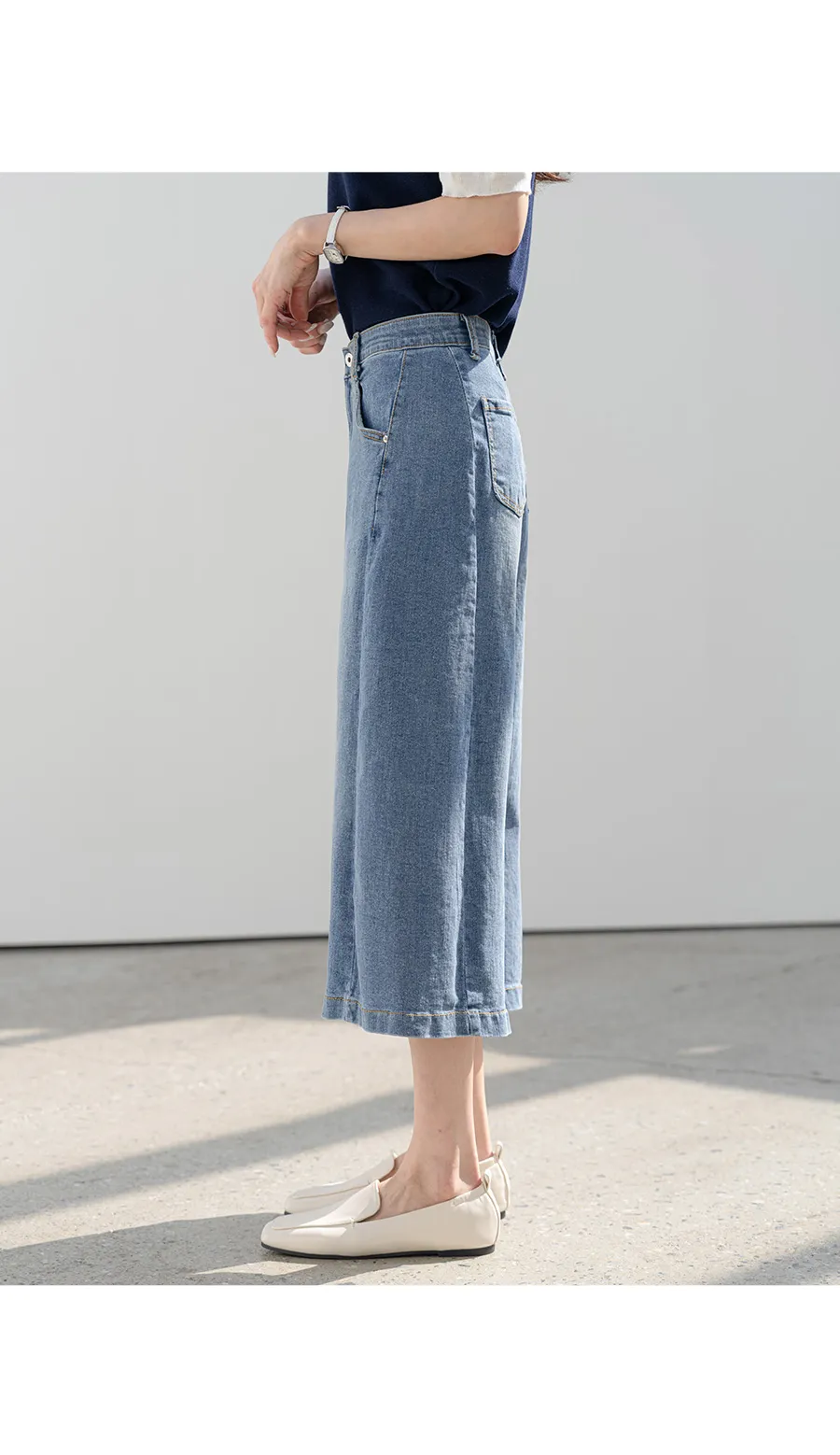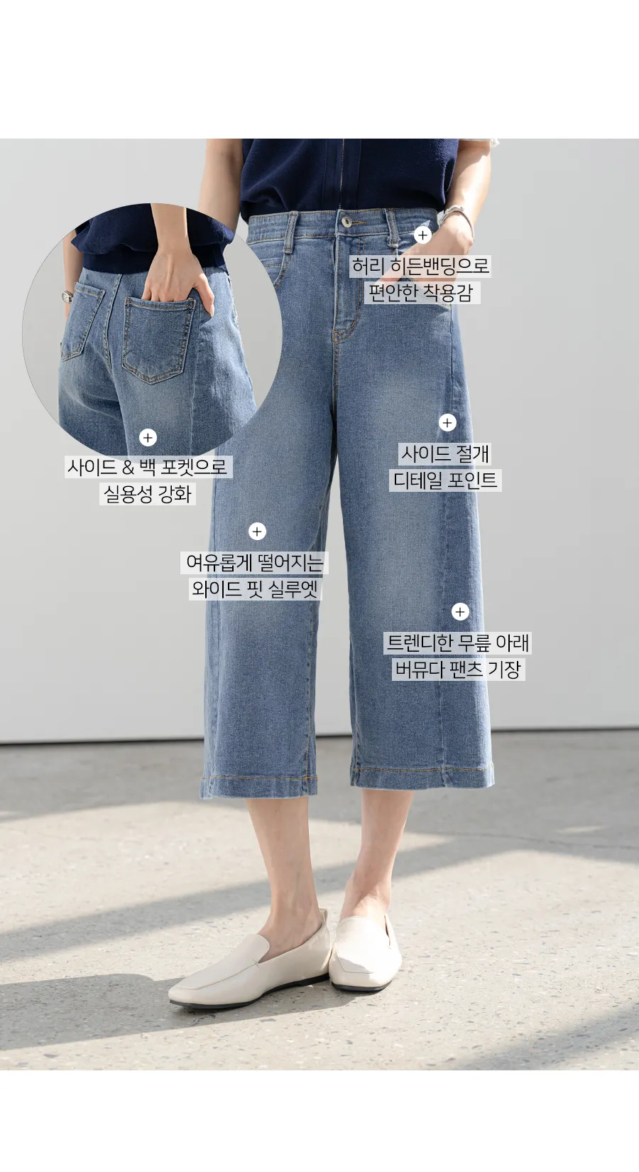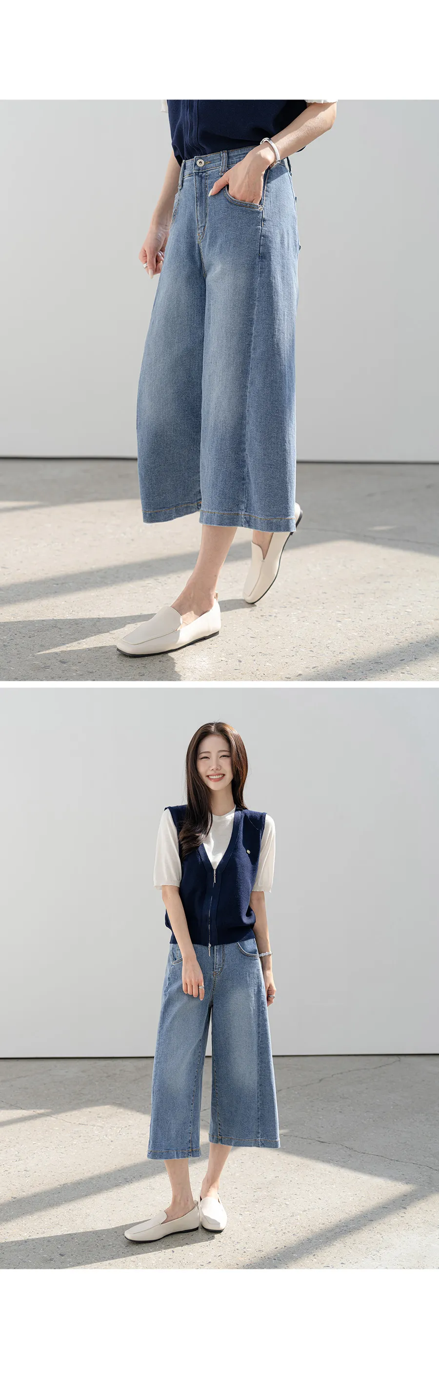 デニムコットンウォッシングポケットリベットバックポケットストレートワイドジップアップバックルループヒドゥンバンディングライトブルーディープブルーデニムパンツ[選べる丈]