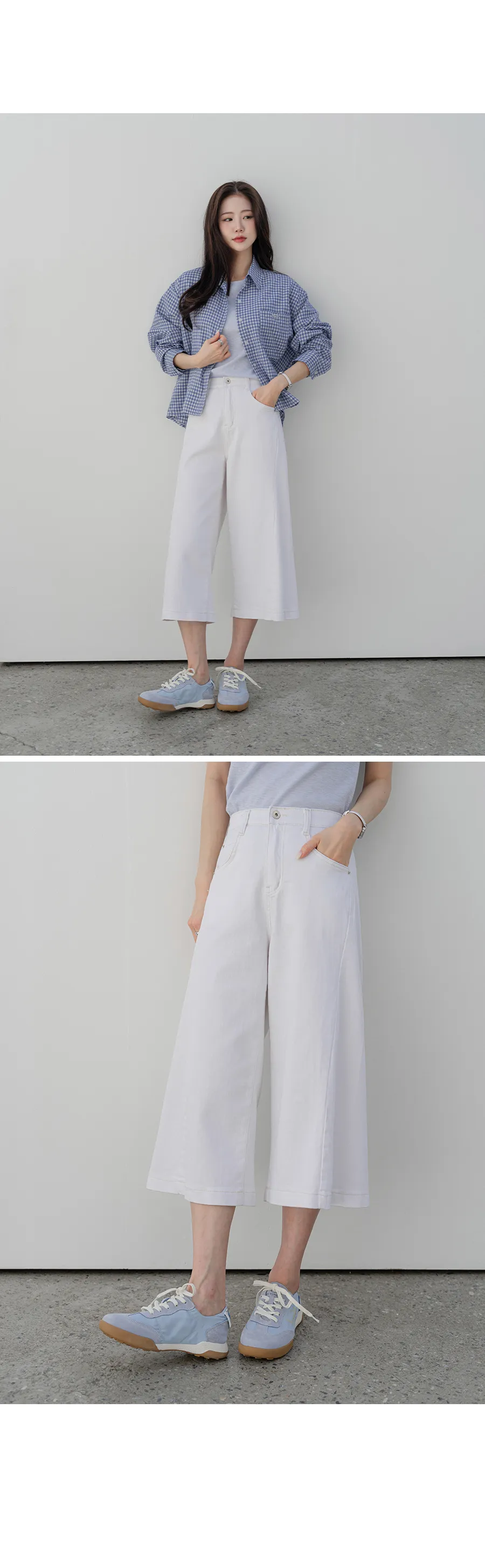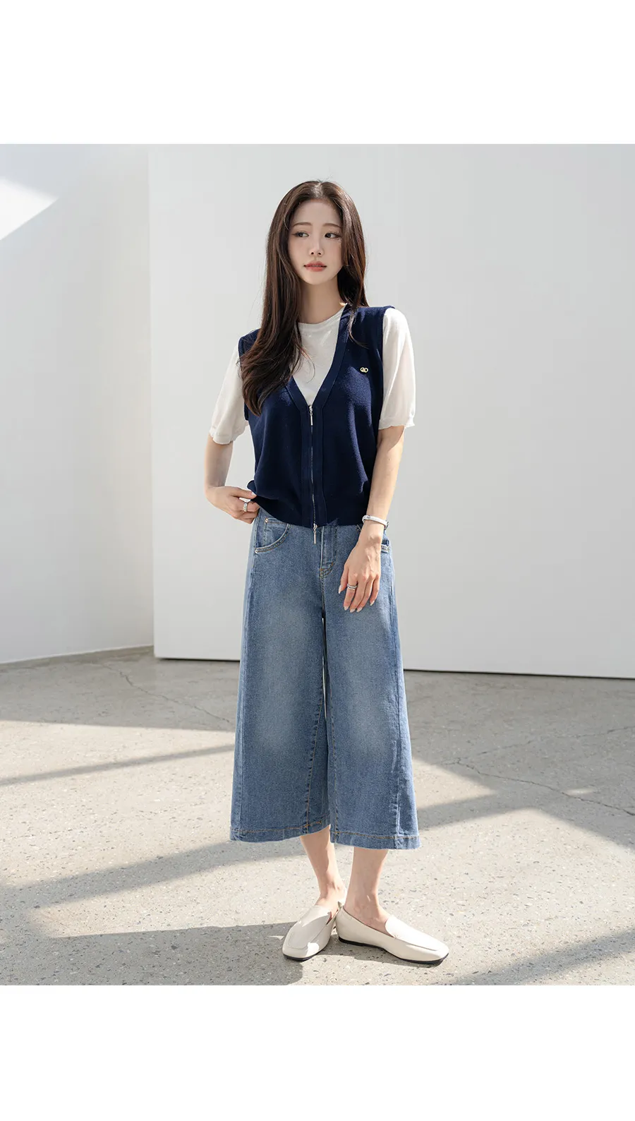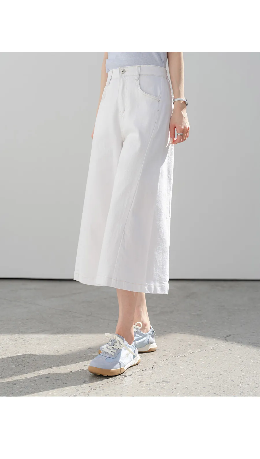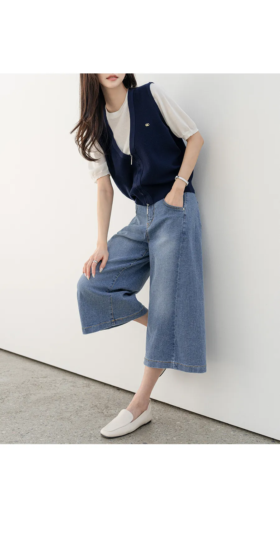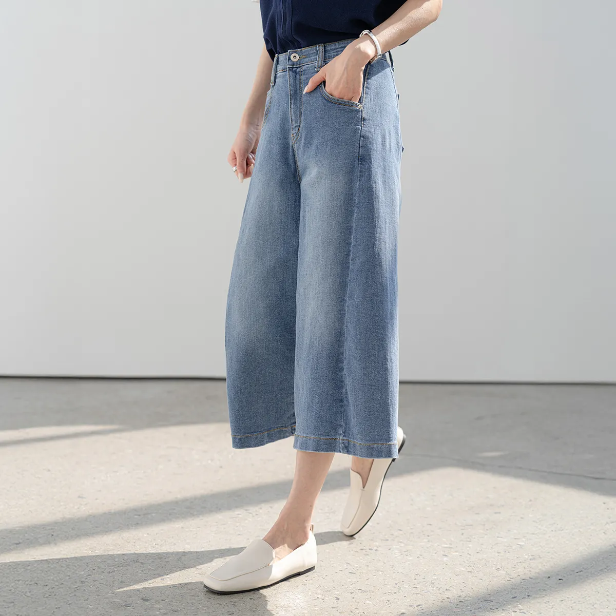 デニムコットンウォッシングポケットリベットバックポケットストレートワイドジップアップバックルループヒドゥンバンディングライトブルーディープブルーデニムパンツ[選べる丈]
