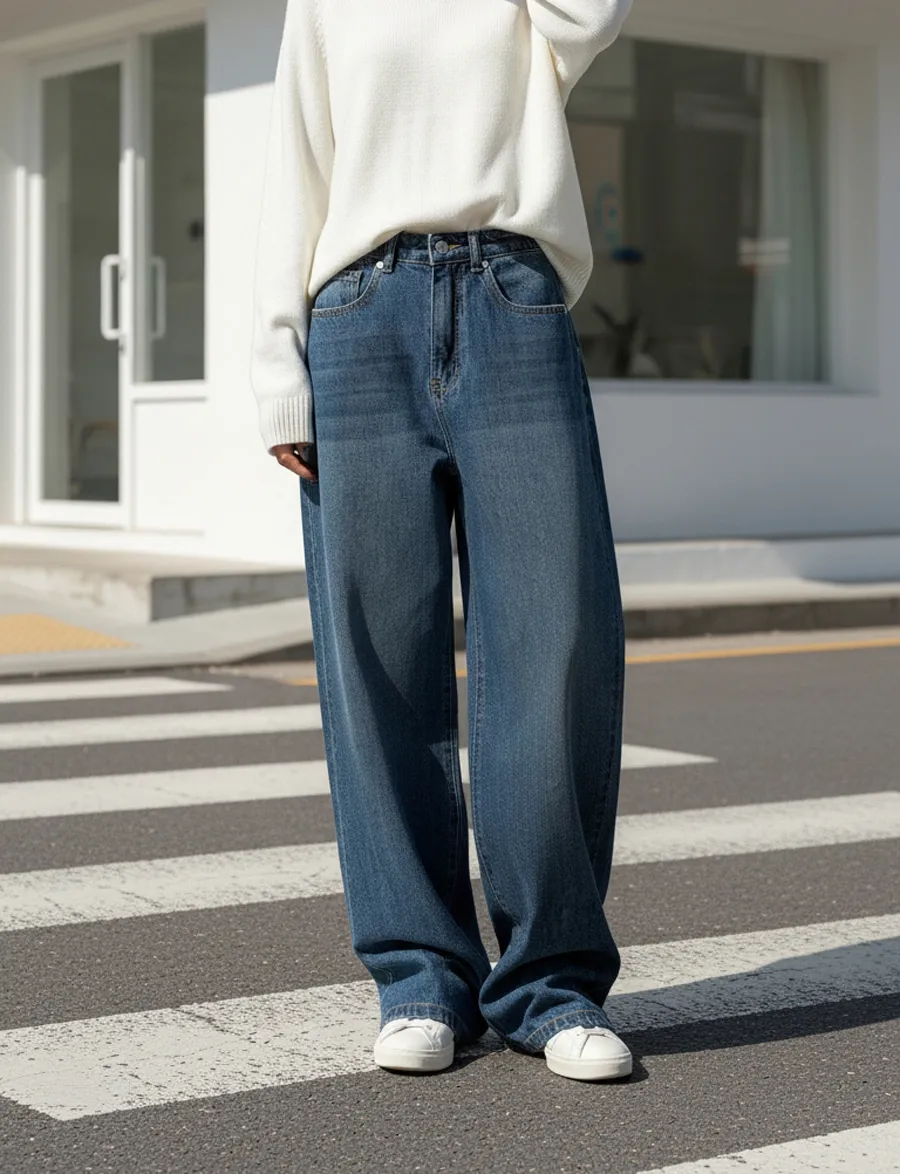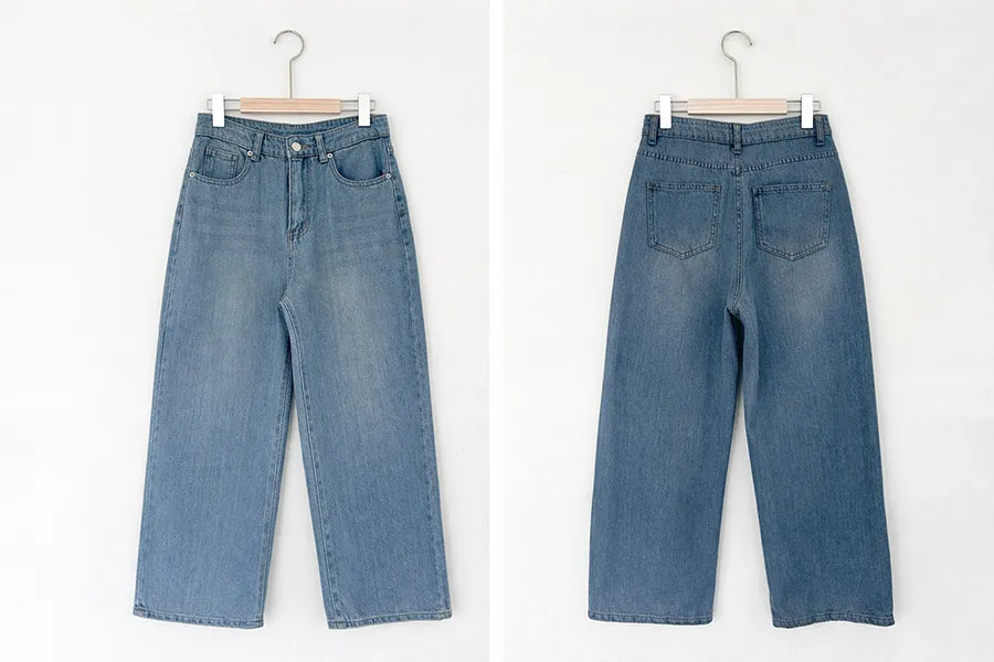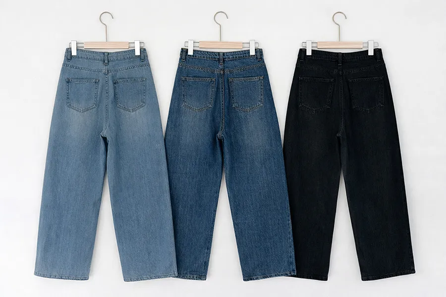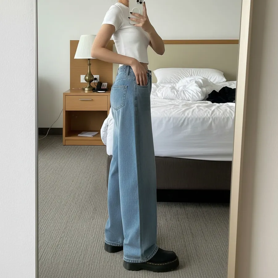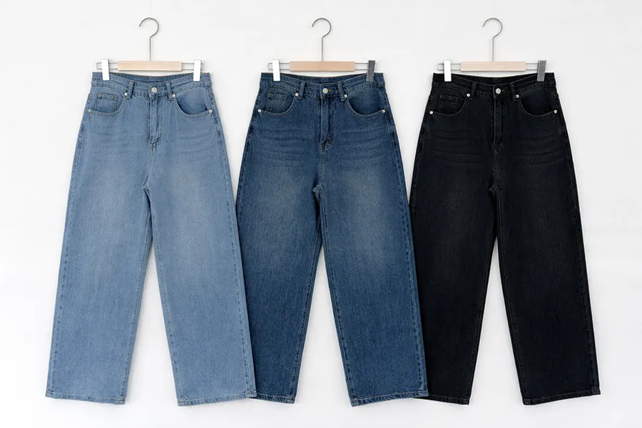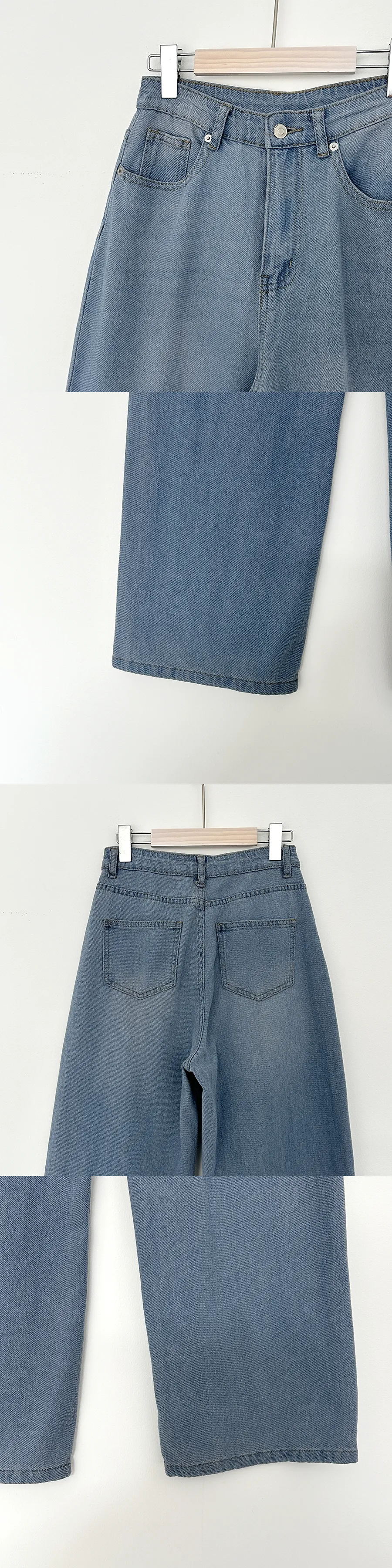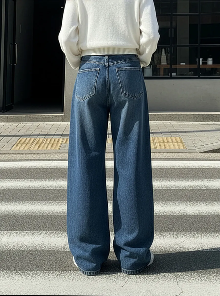 デニムコットンウォッシングポケットリベットバックポケットストレートワイドジップアップバックルループヒドゥンバンディングライトブルーディープブルーデニムパンツ[選べる丈]