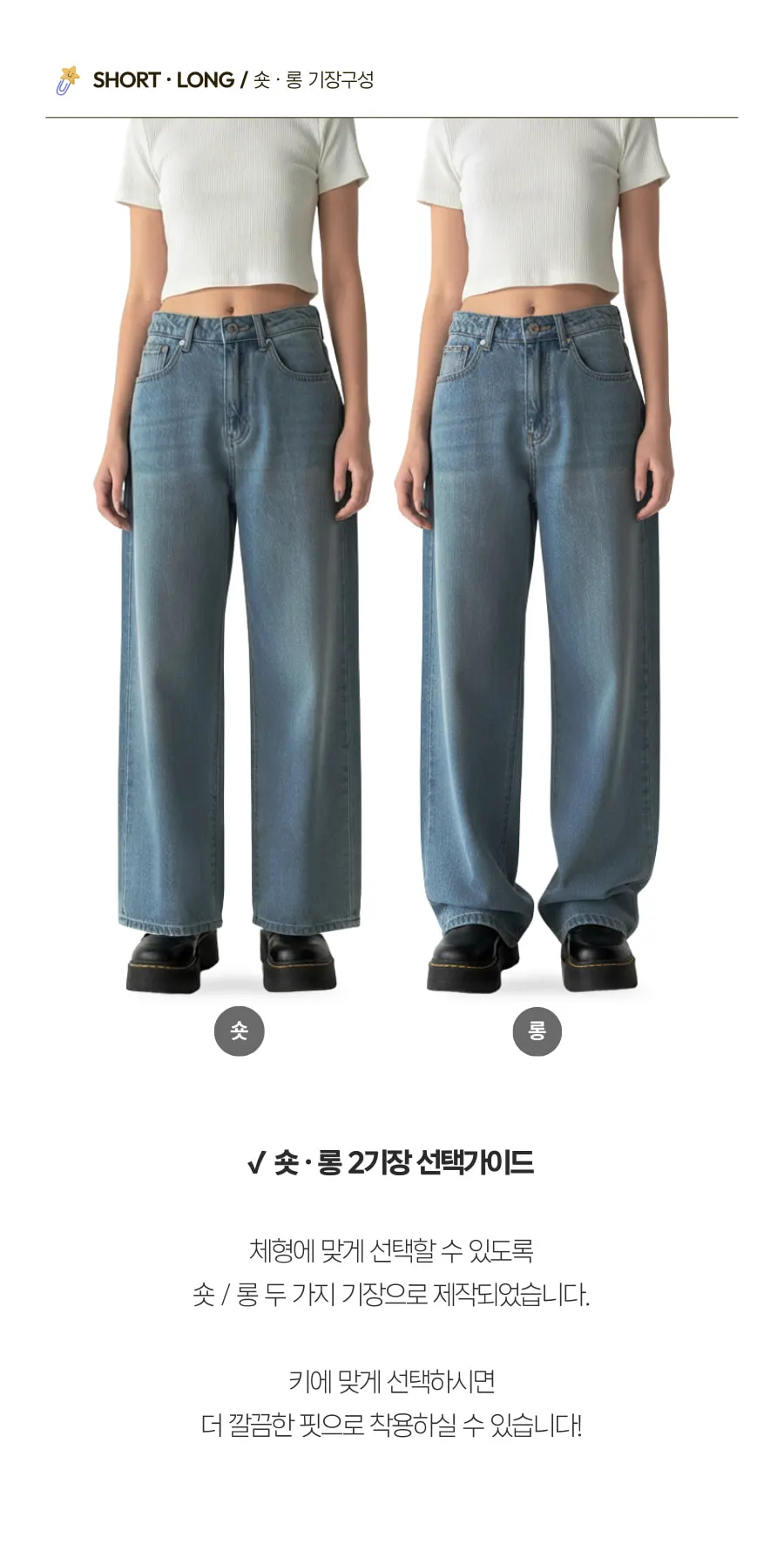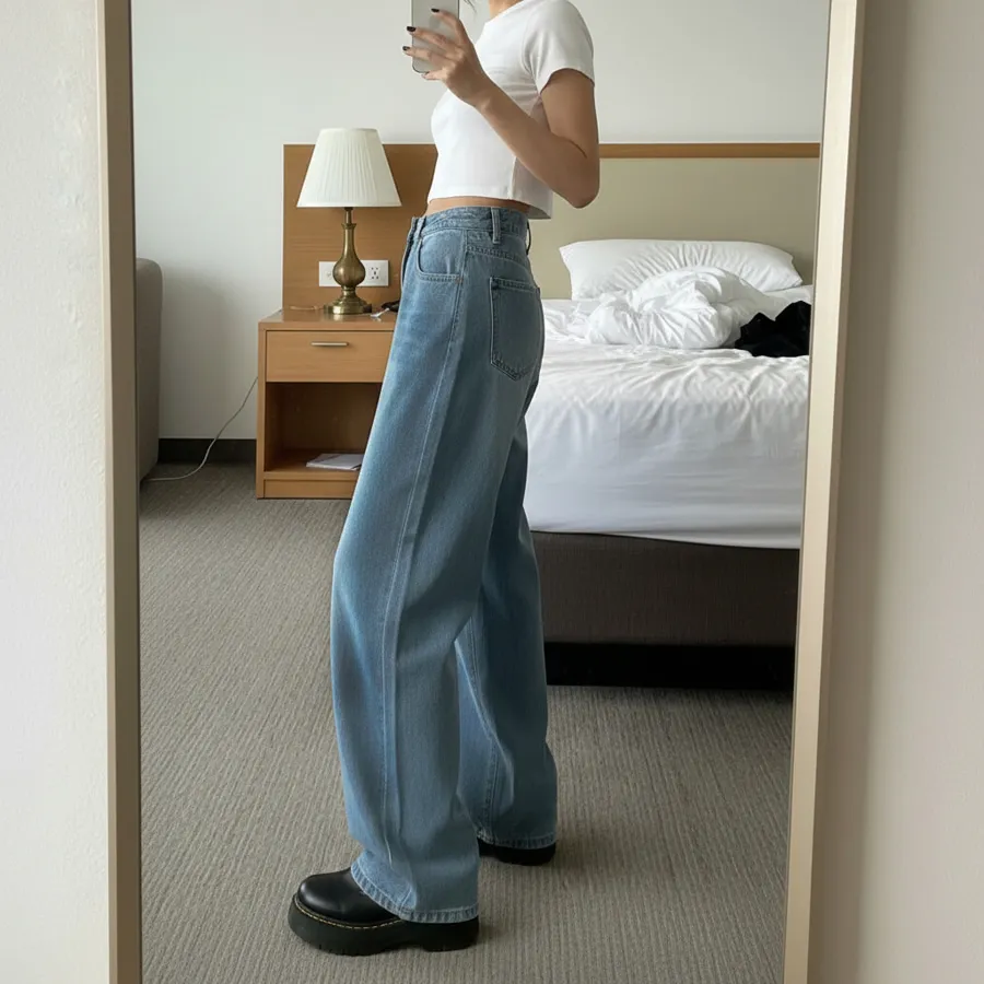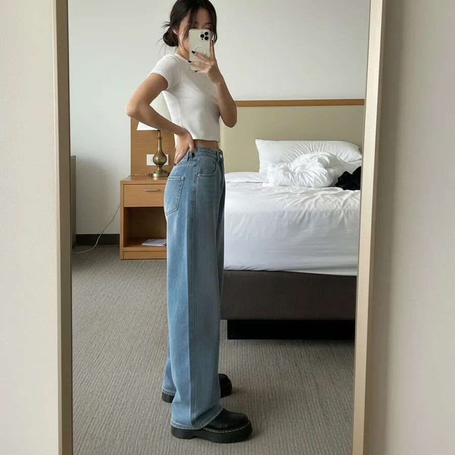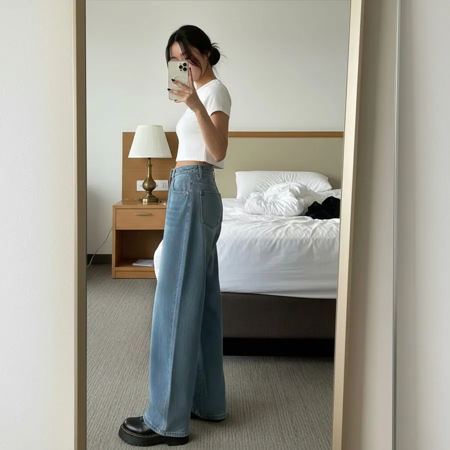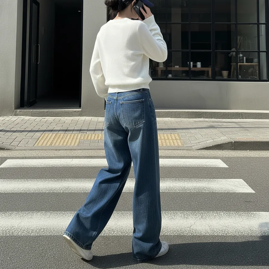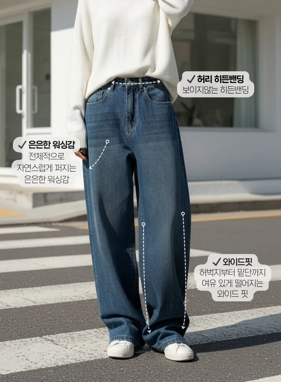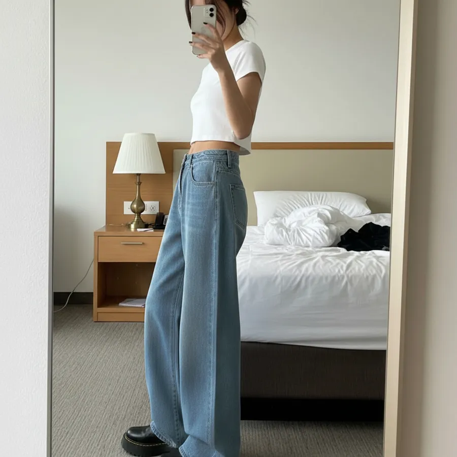 デニムコットンウォッシングポケットリベットバックポケットストレートワイドジップアップバックルループヒドゥンバンディングライトブルーディープブルーデニムパンツ[選べる丈]