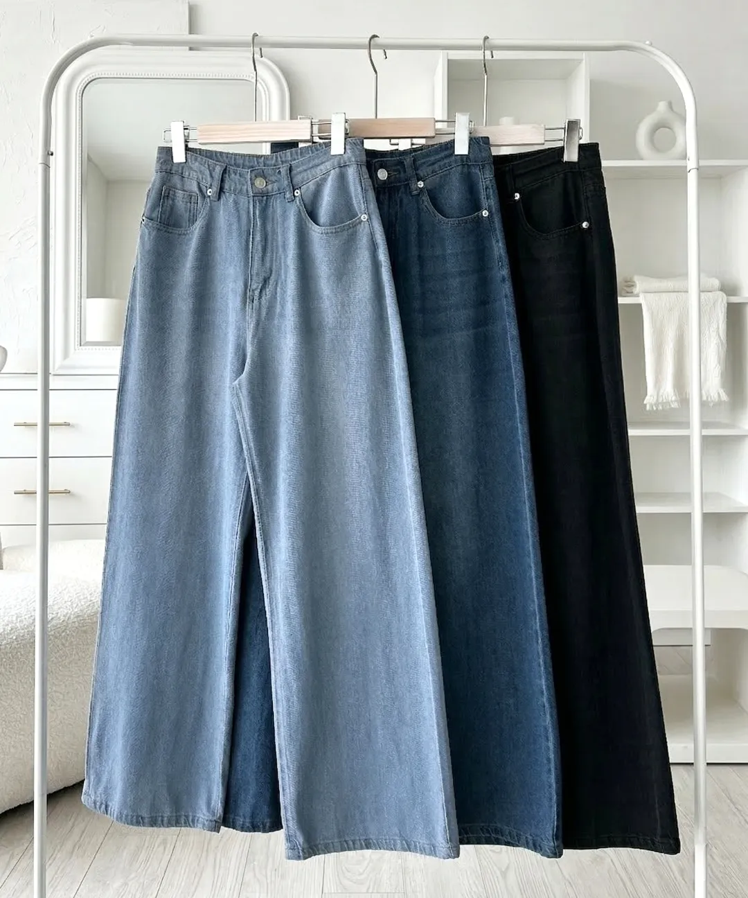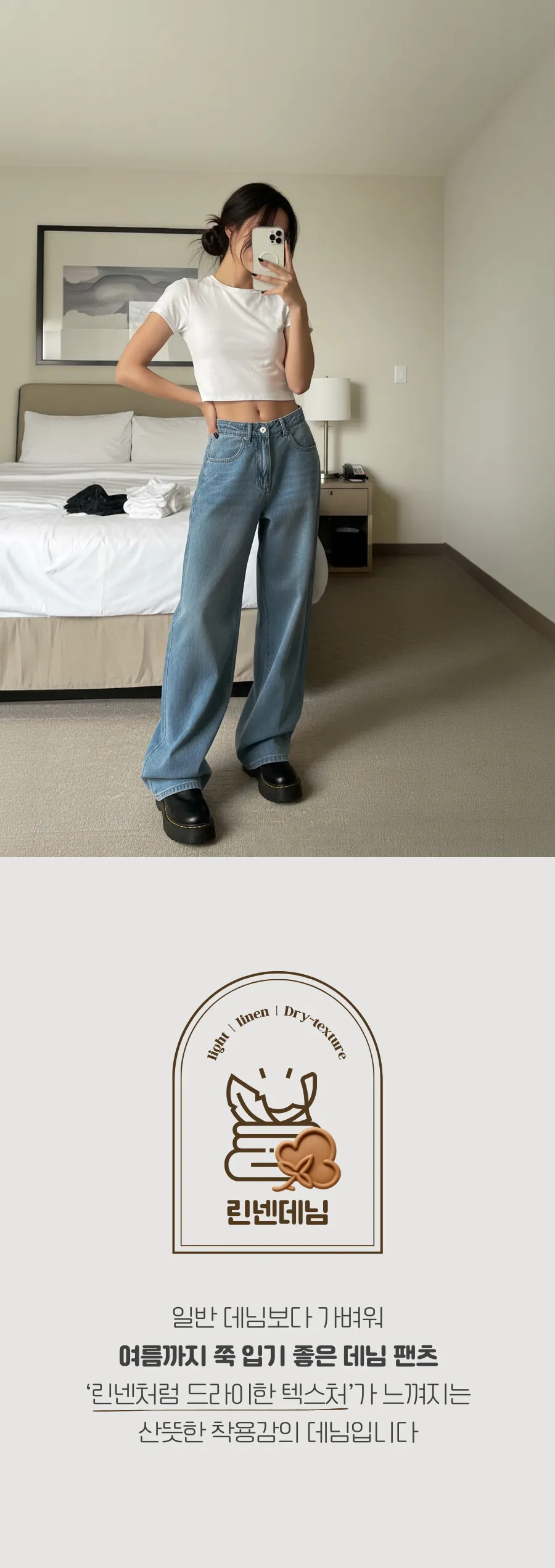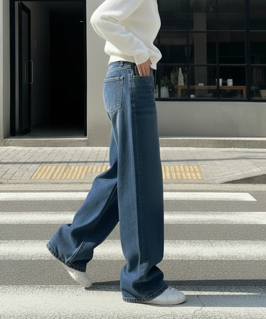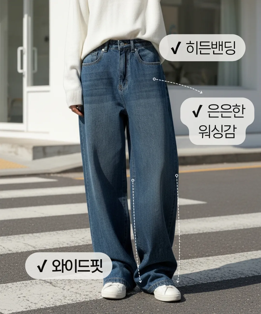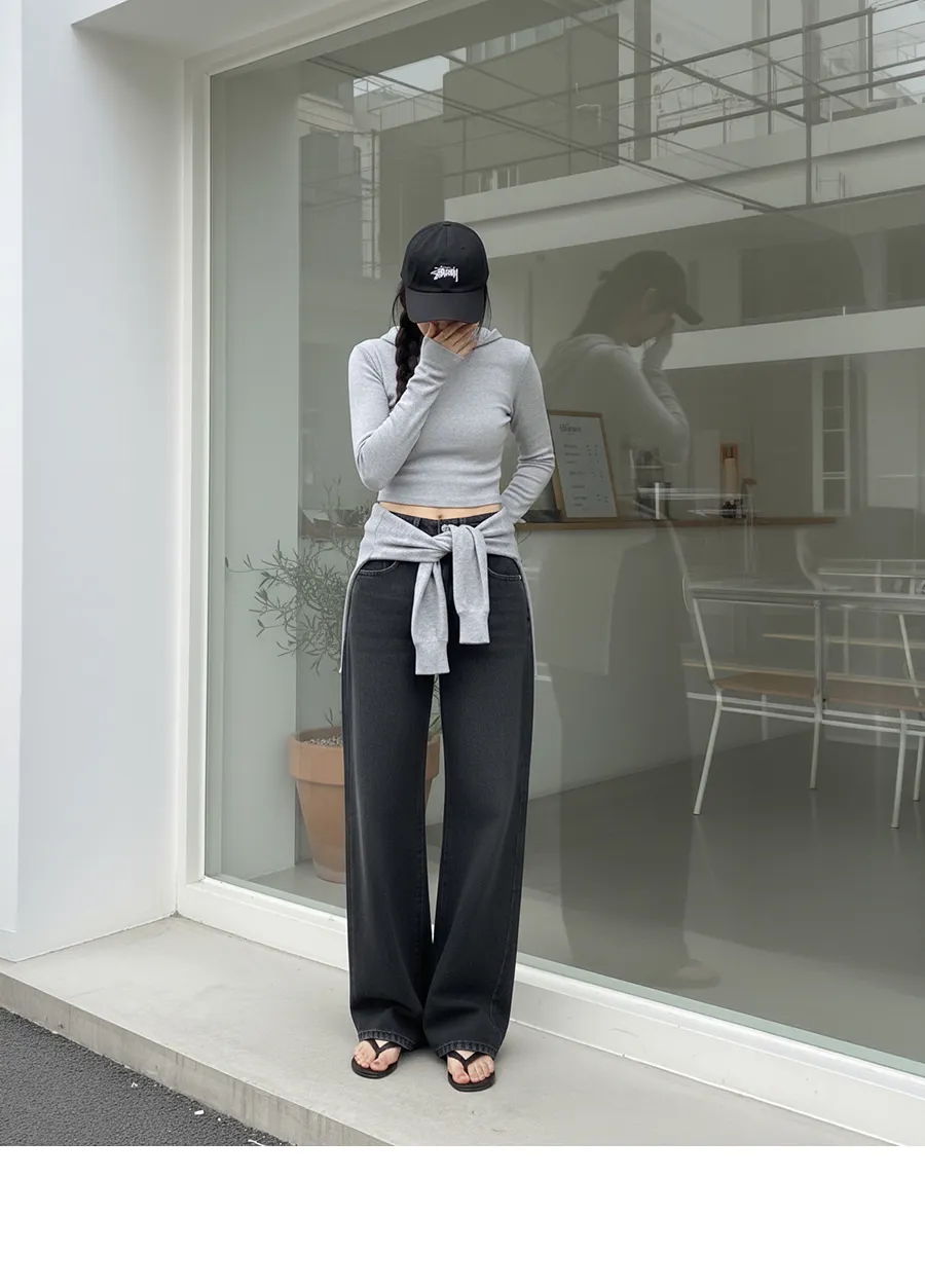 デニムコットンウォッシングポケットリベットバックポケットストレートワイドジップアップバックルループヒドゥンバンディングライトブルーディープブルーデニムパンツ[選べる丈]