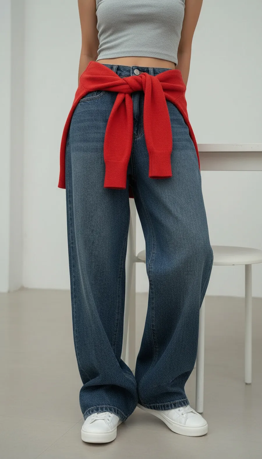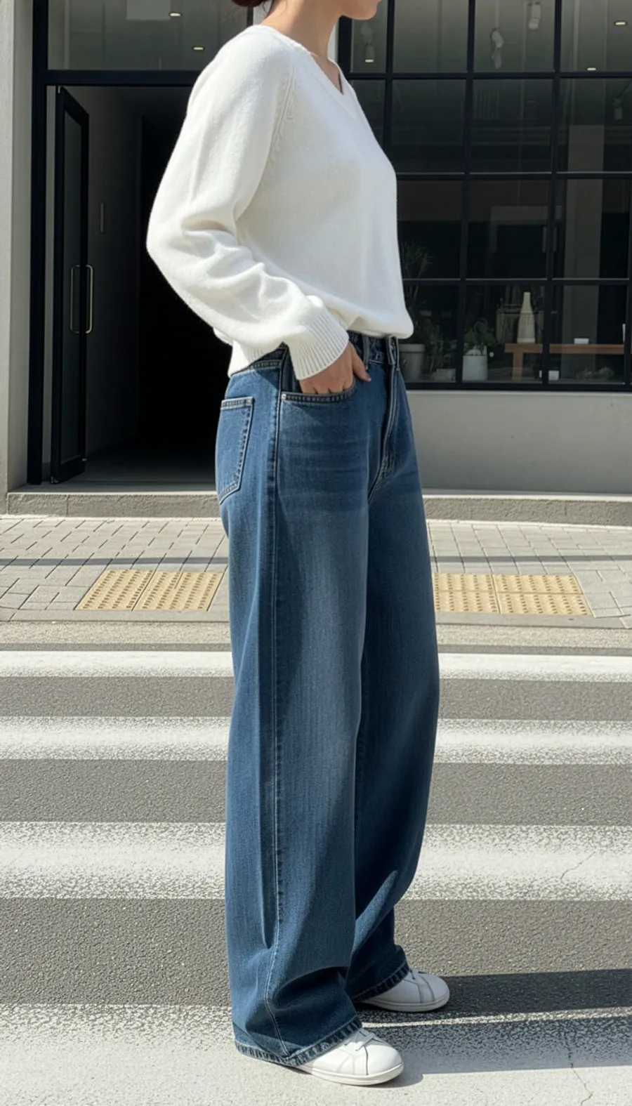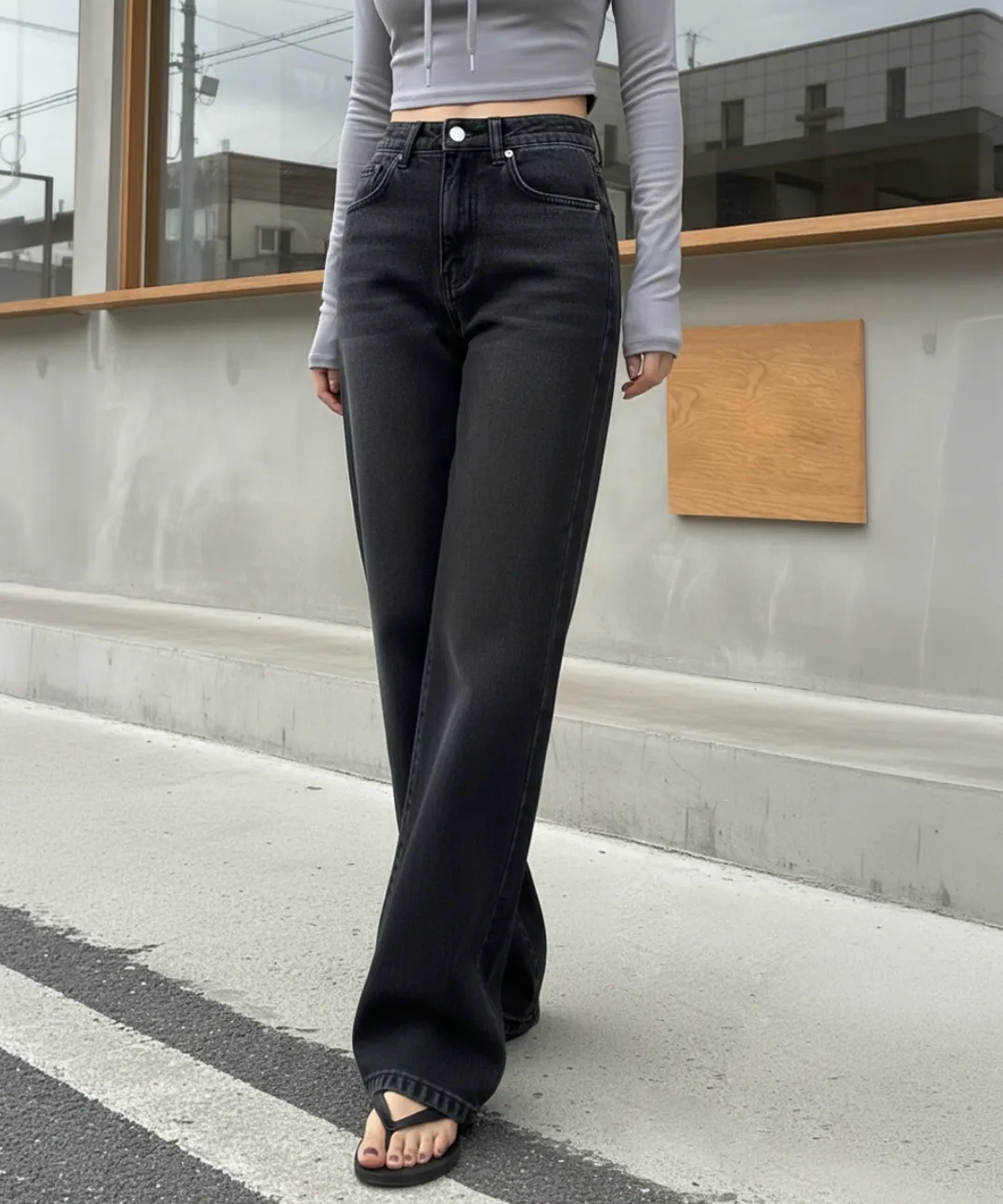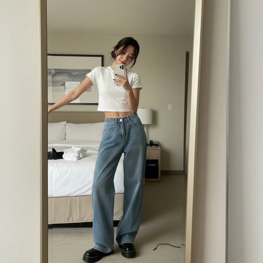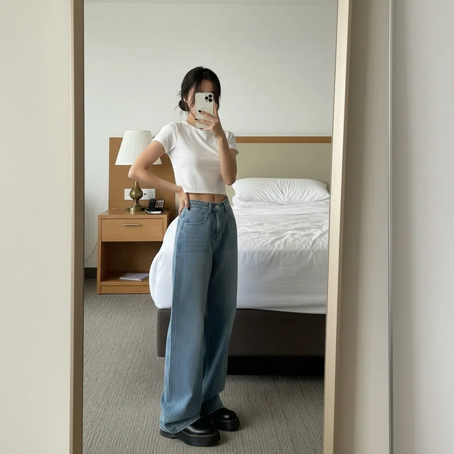デニムコットンウォッシングポケットリベットバックポケットストレートワイドジップアップバックルループヒドゥンバンディングライトブルーディープブルーデニムパンツ[選べる丈]