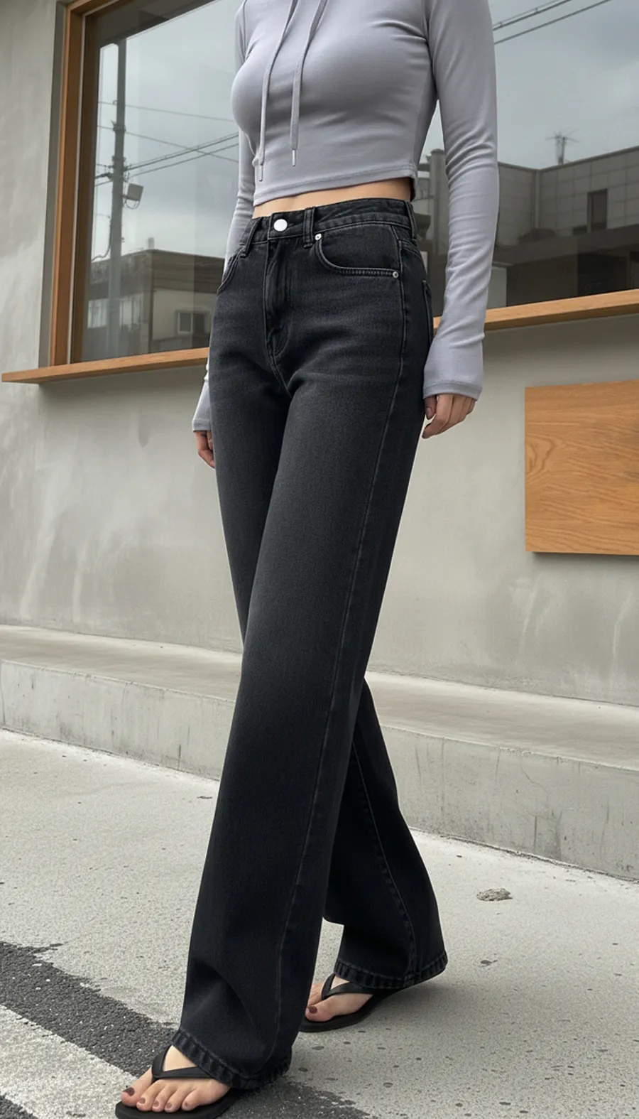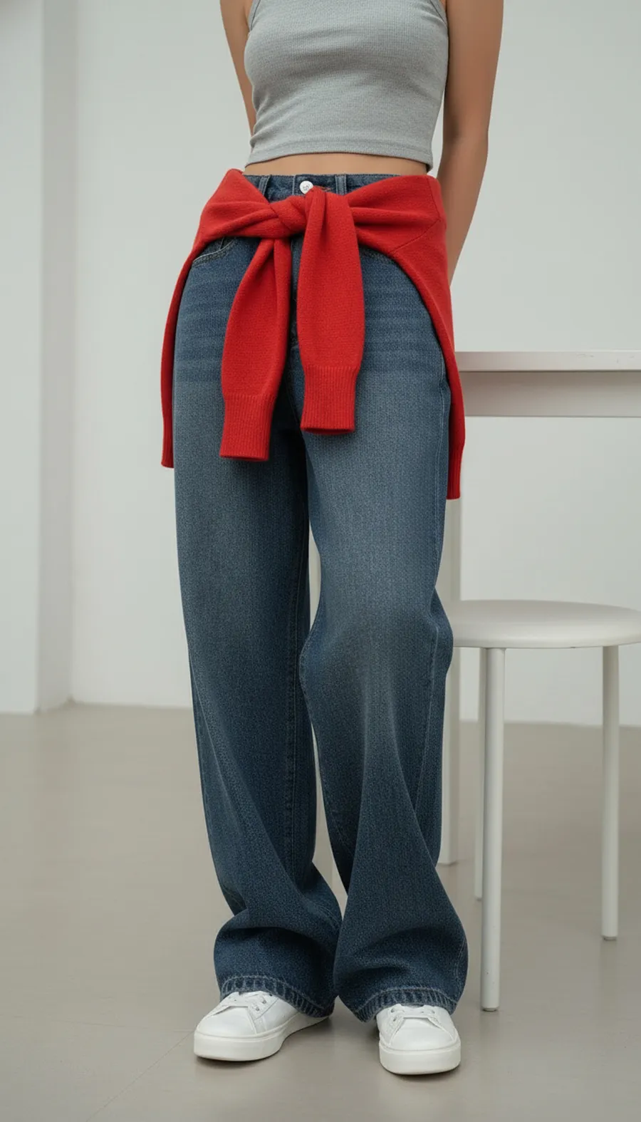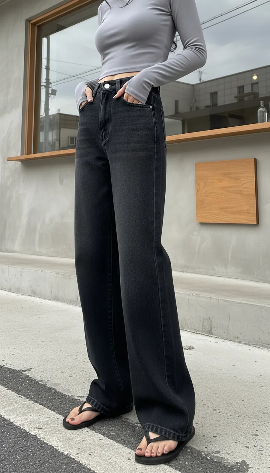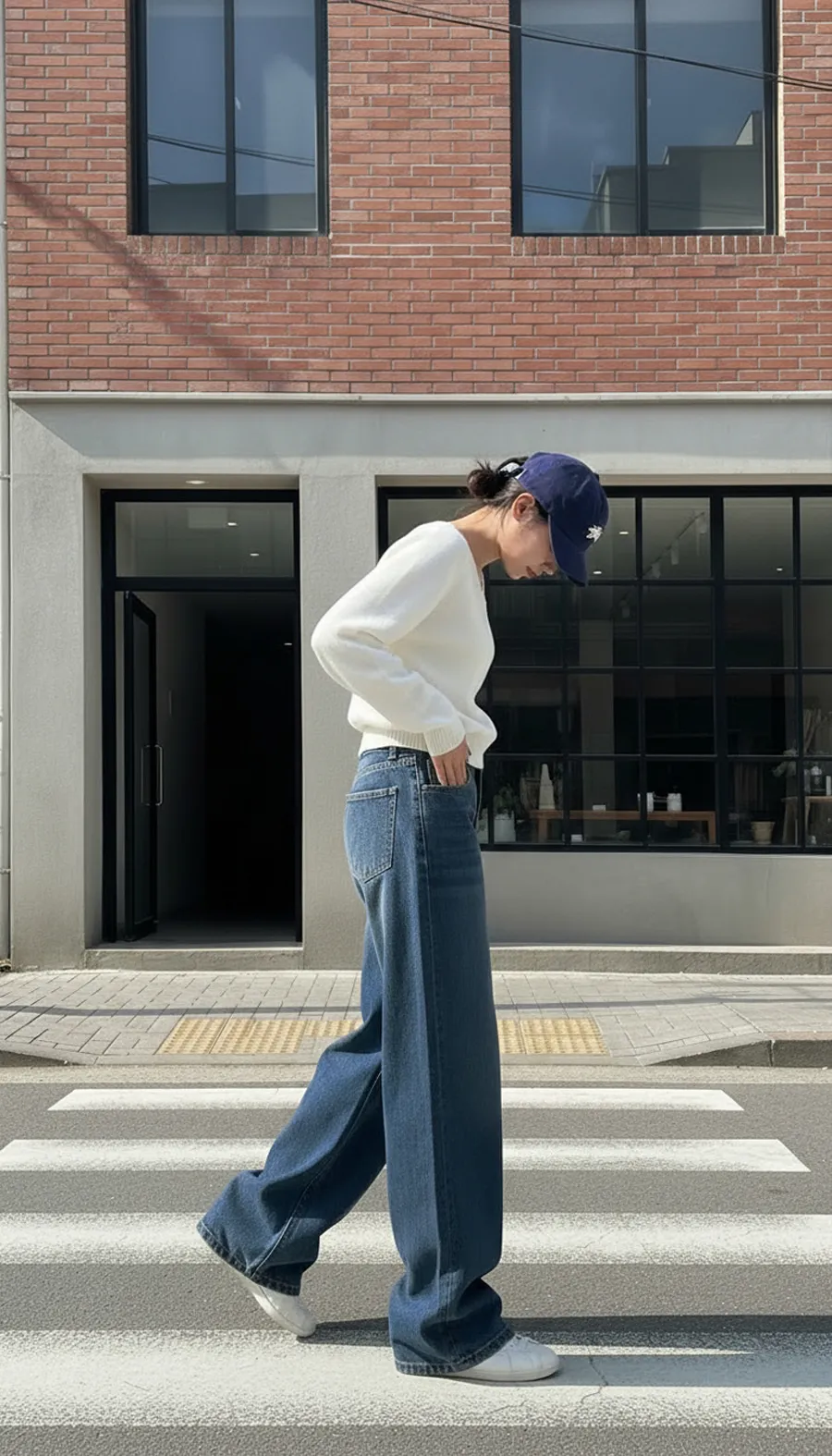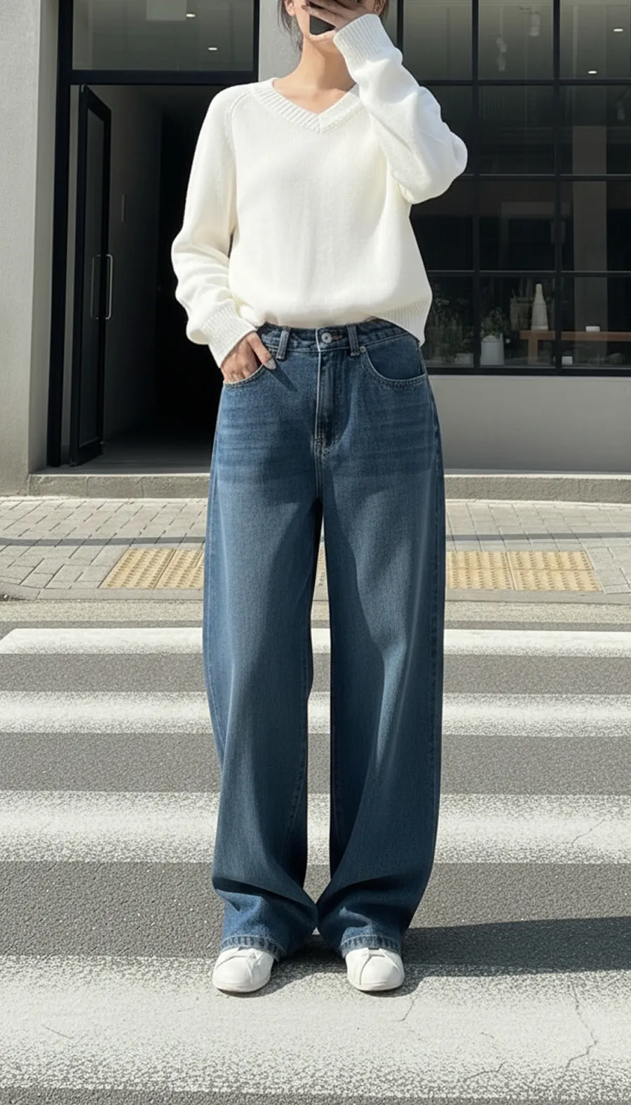 デニムコットンウォッシングポケットリベットバックポケットストレートワイドジップアップバックルループヒドゥンバンディングライトブルーディープブルーデニムパンツ[選べる丈]