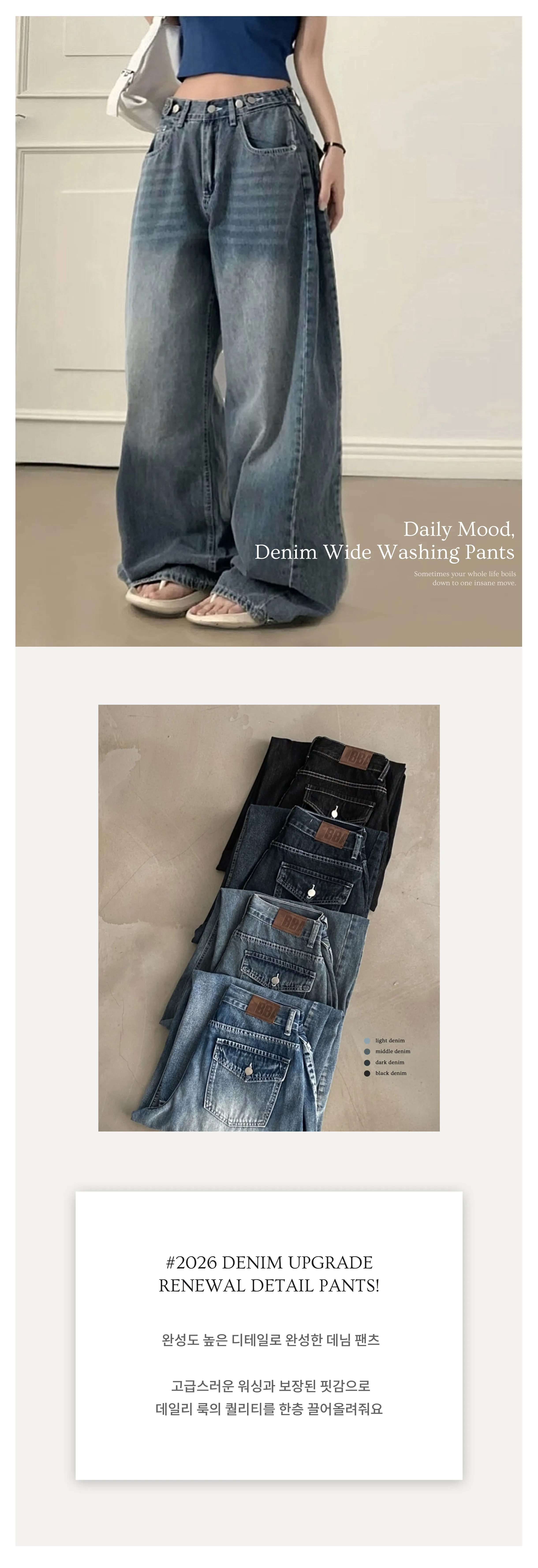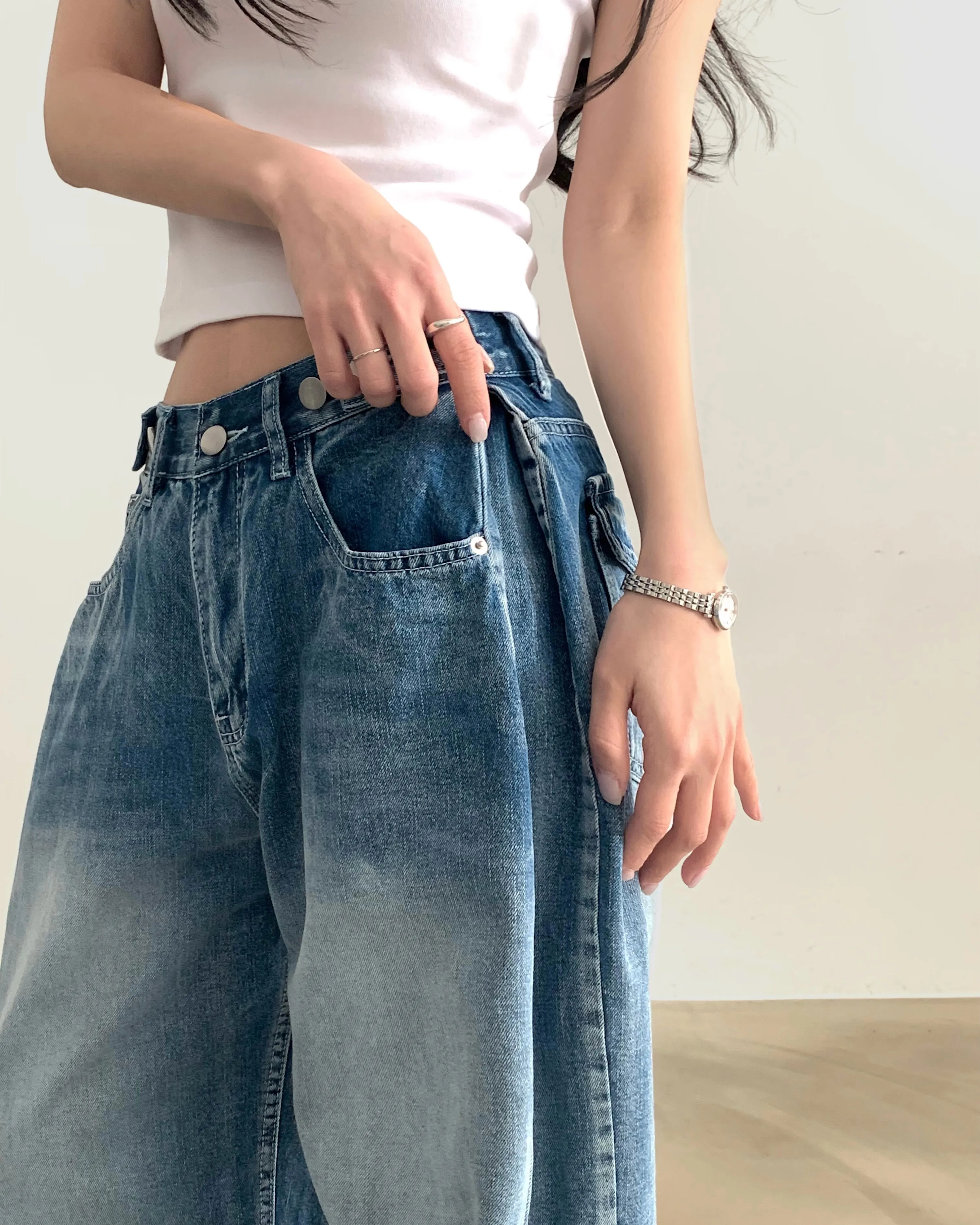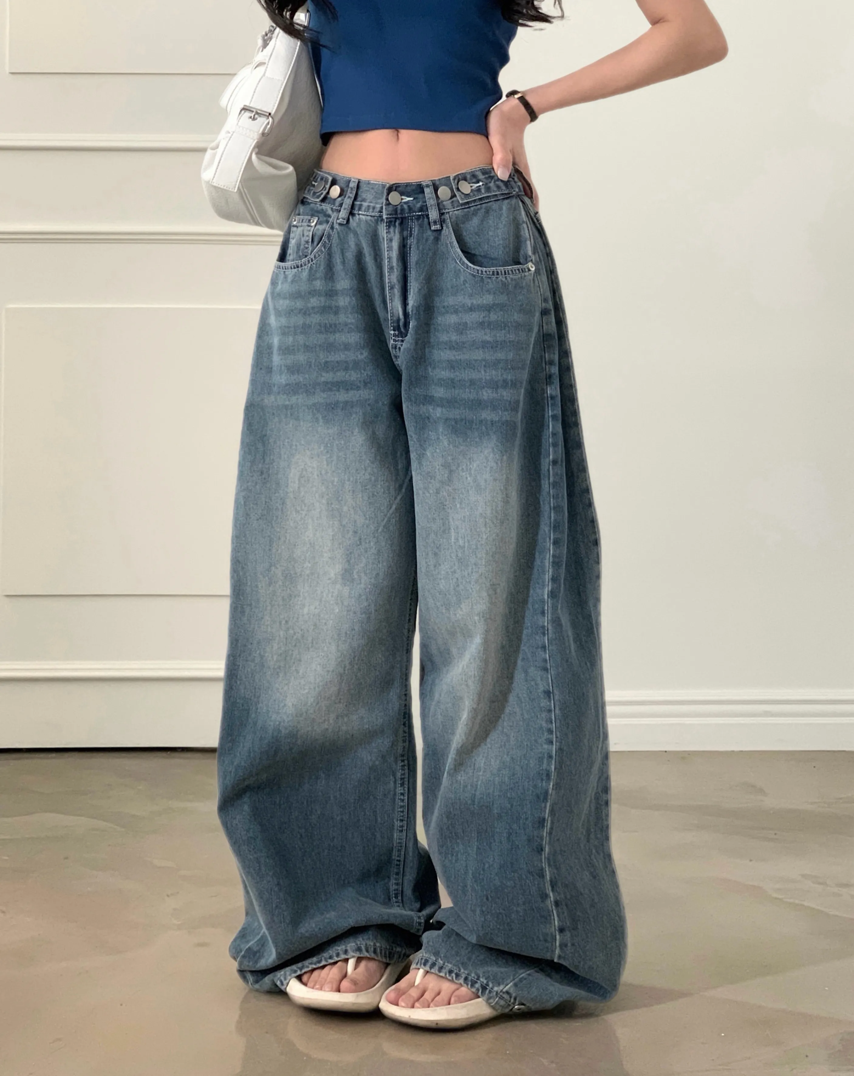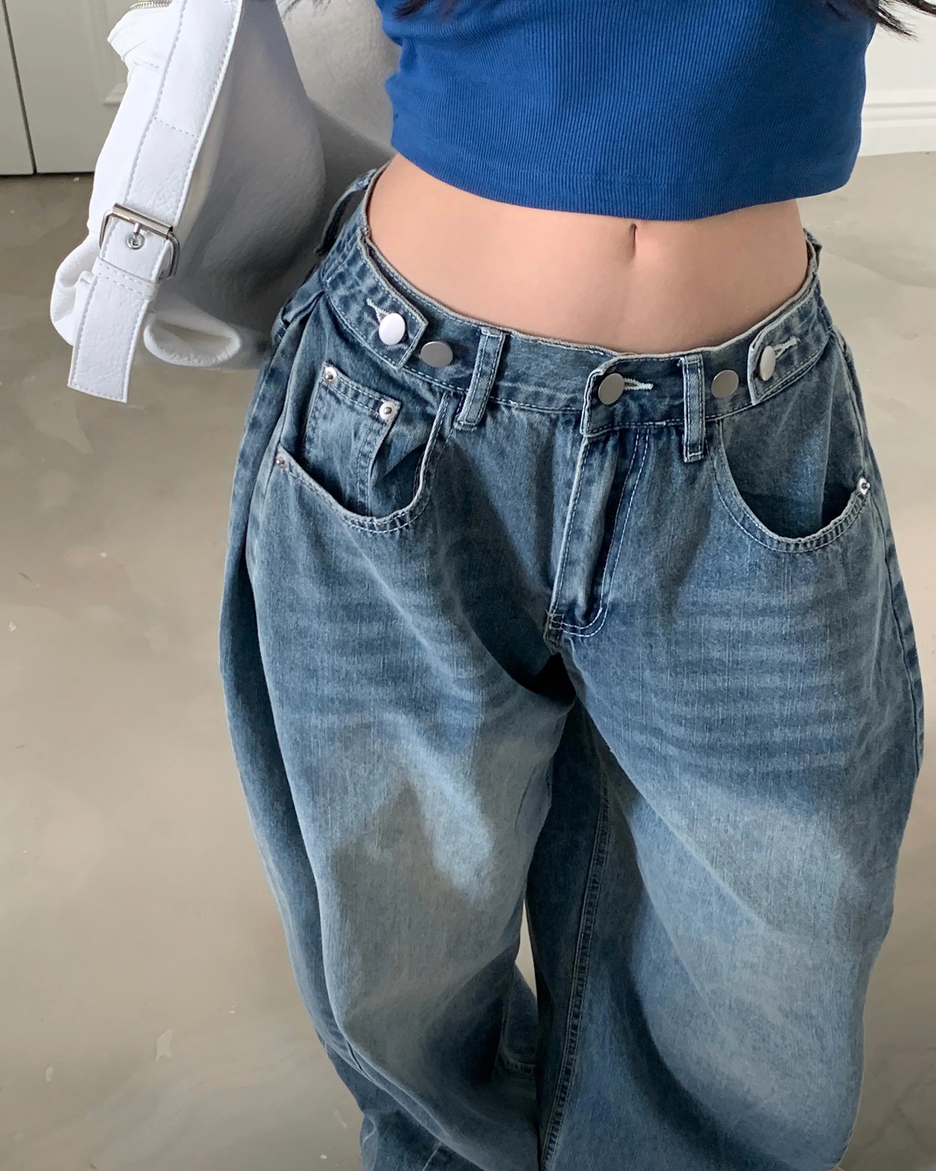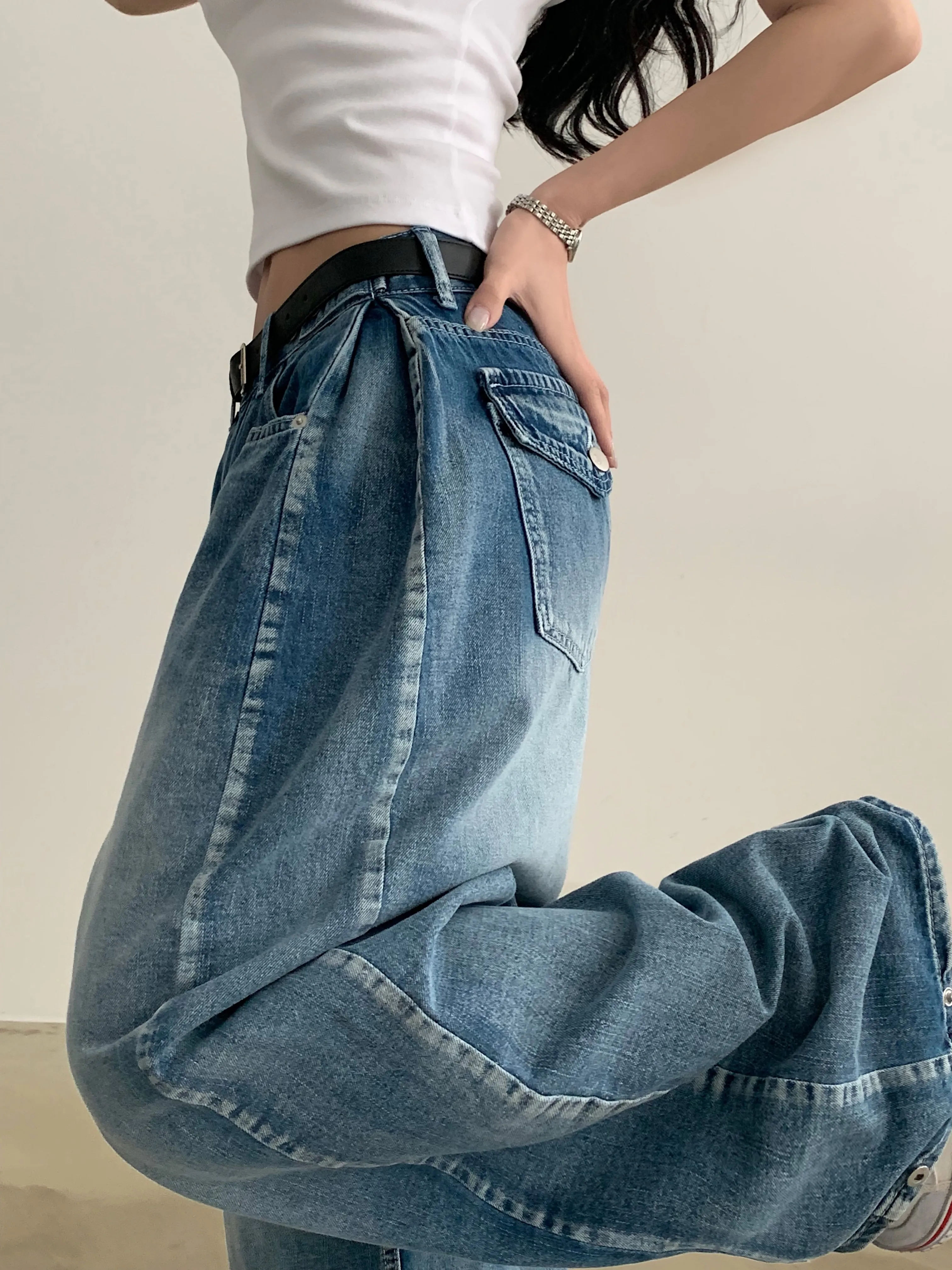 デニムコットンウォッシングポケットリベットバックポケットストレートワイドジップアップバックルループヒドゥンバンディングライトブルーディープブルーデニムパンツ[選べる丈]