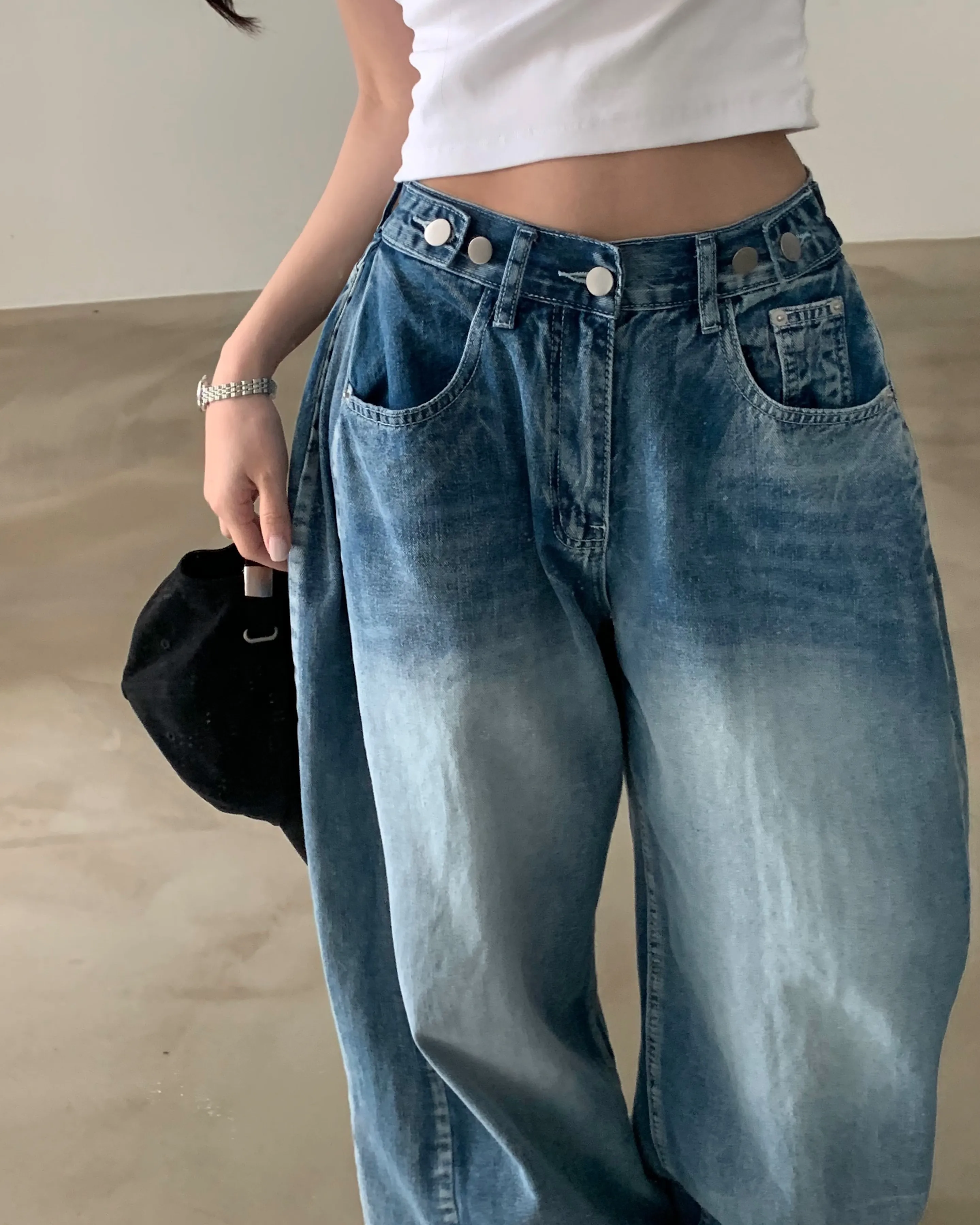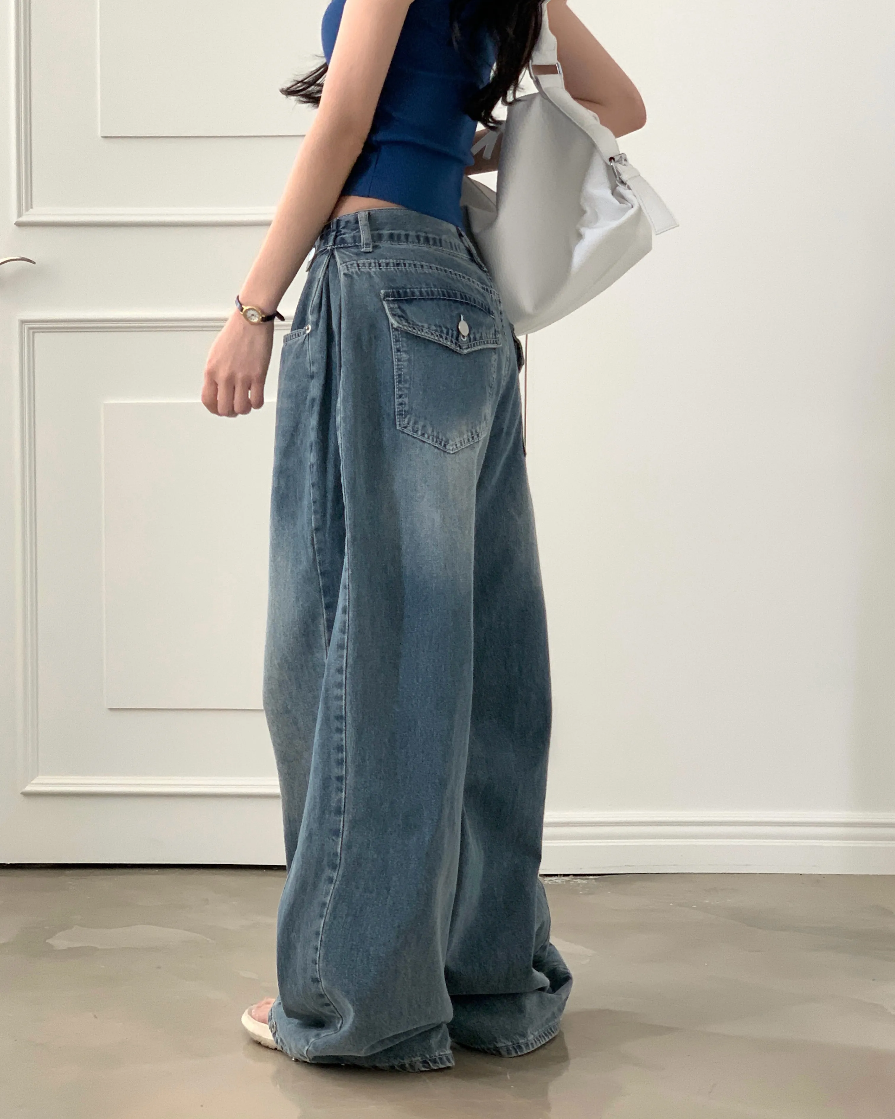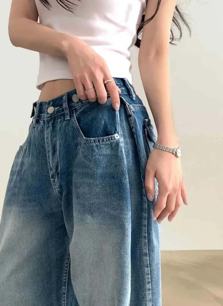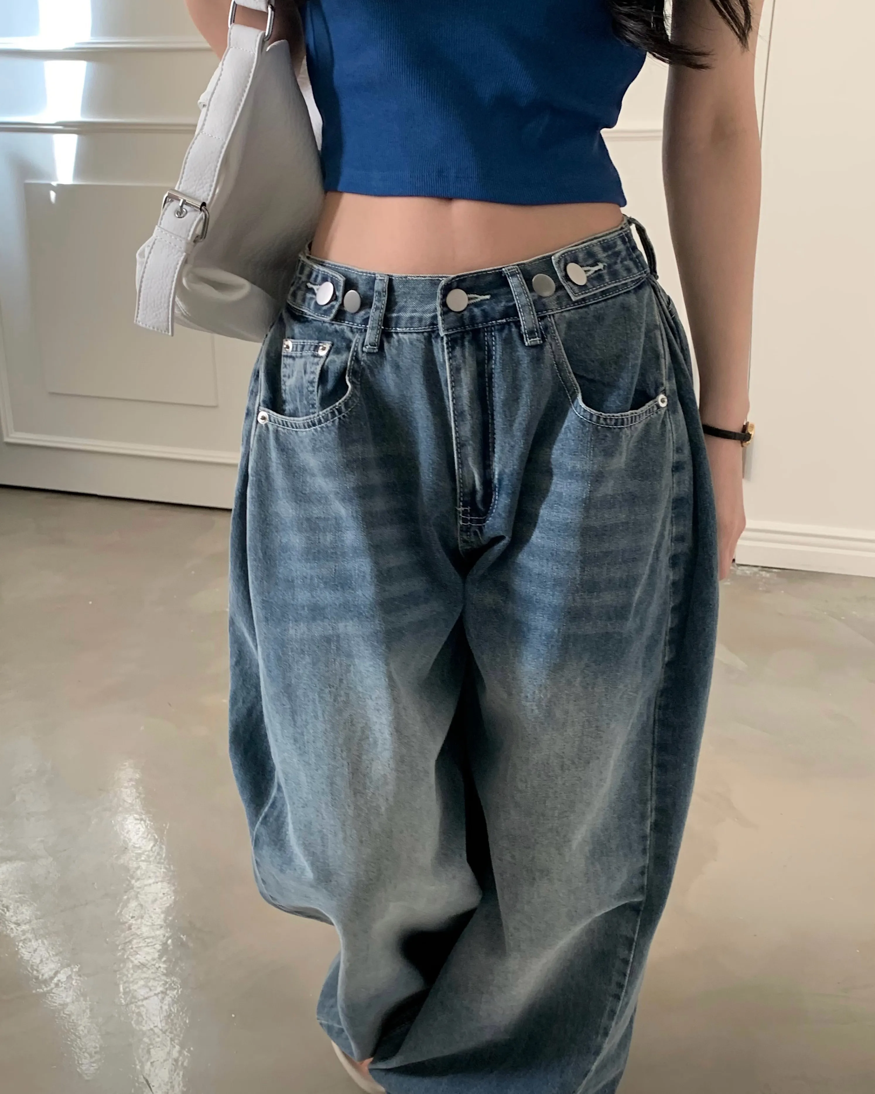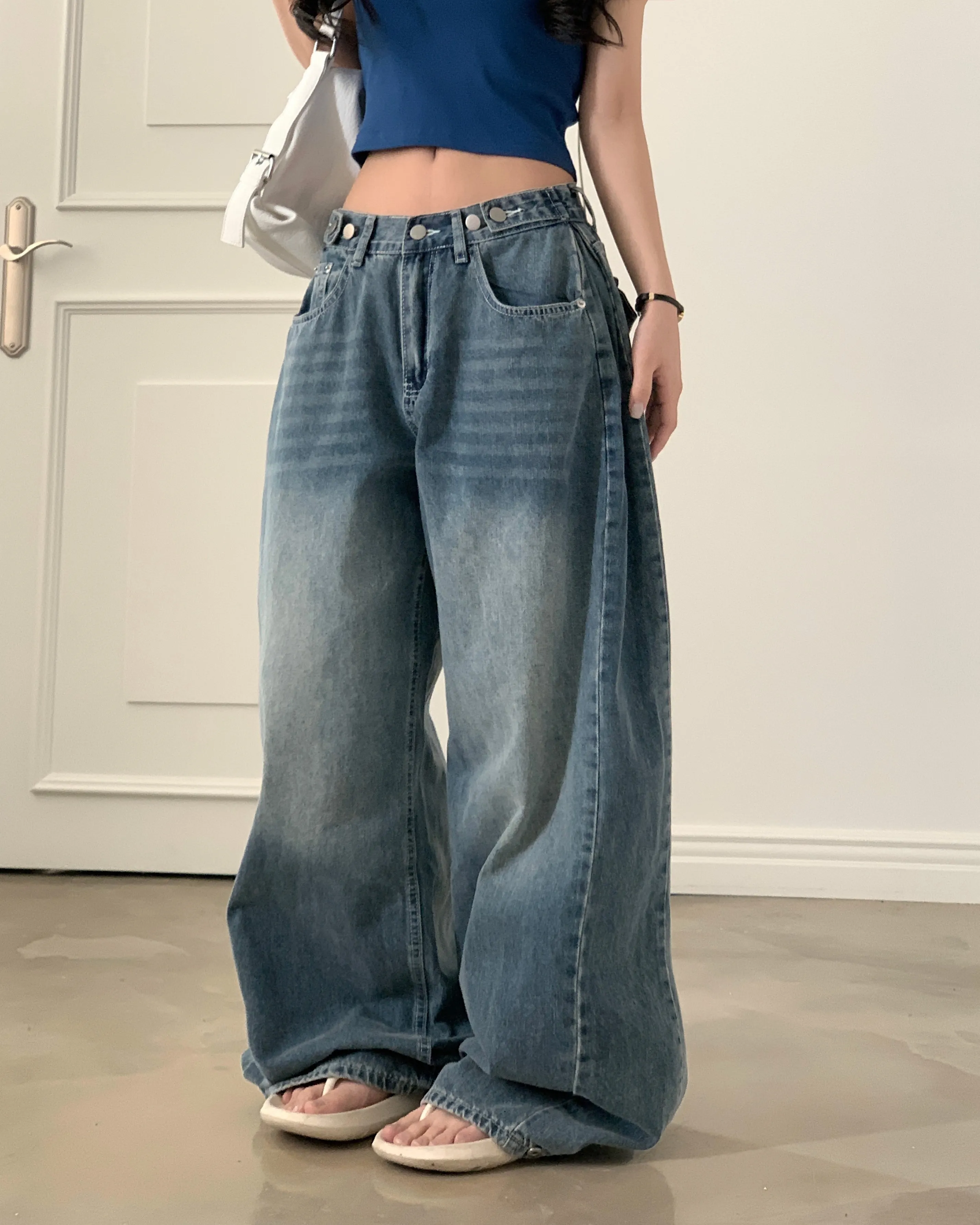 デニムコットンウォッシングポケットリベットバックポケットストレートワイドジップアップバックルループヒドゥンバンディングライトブルーディープブルーデニムパンツ[選べる丈]