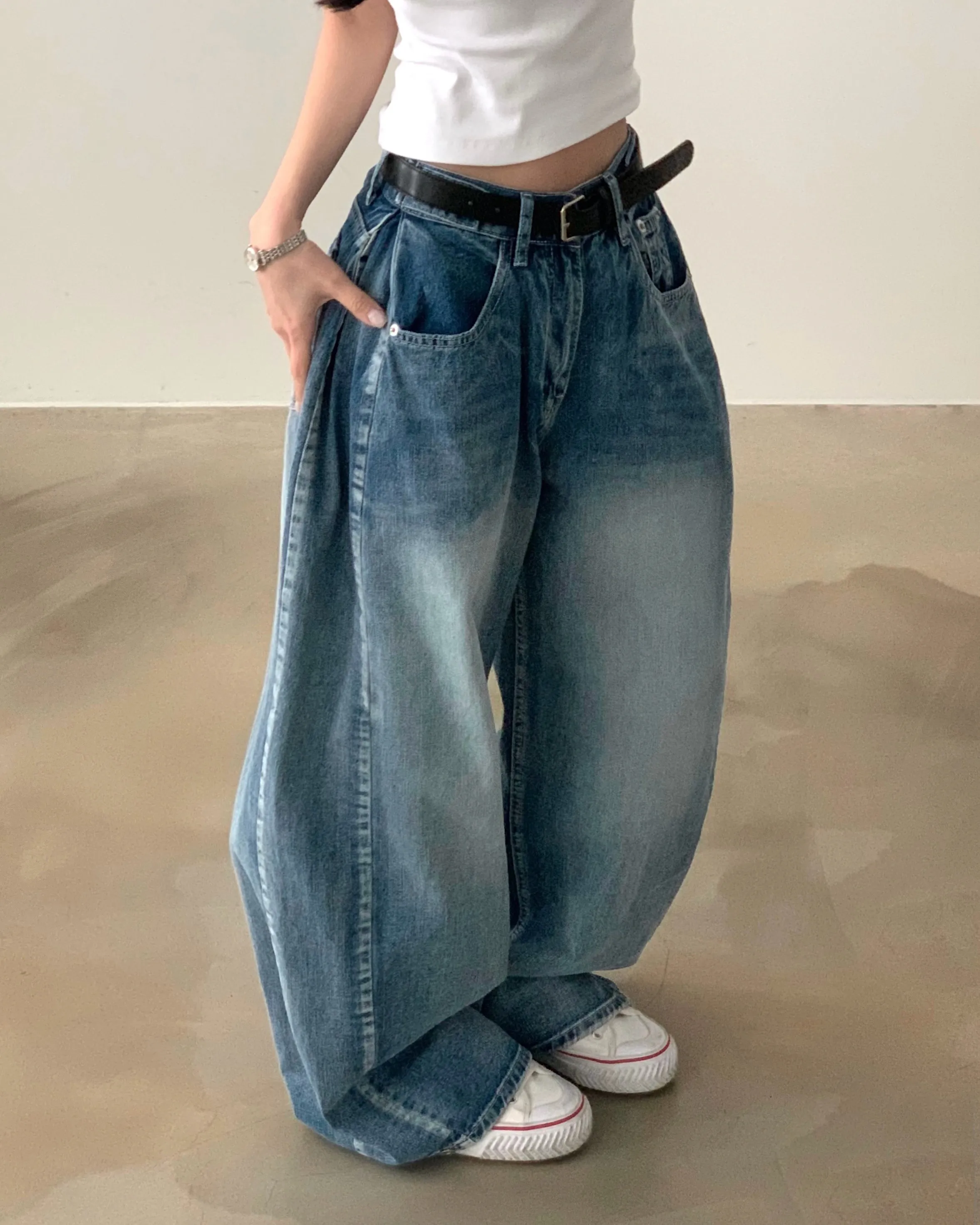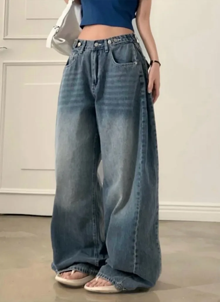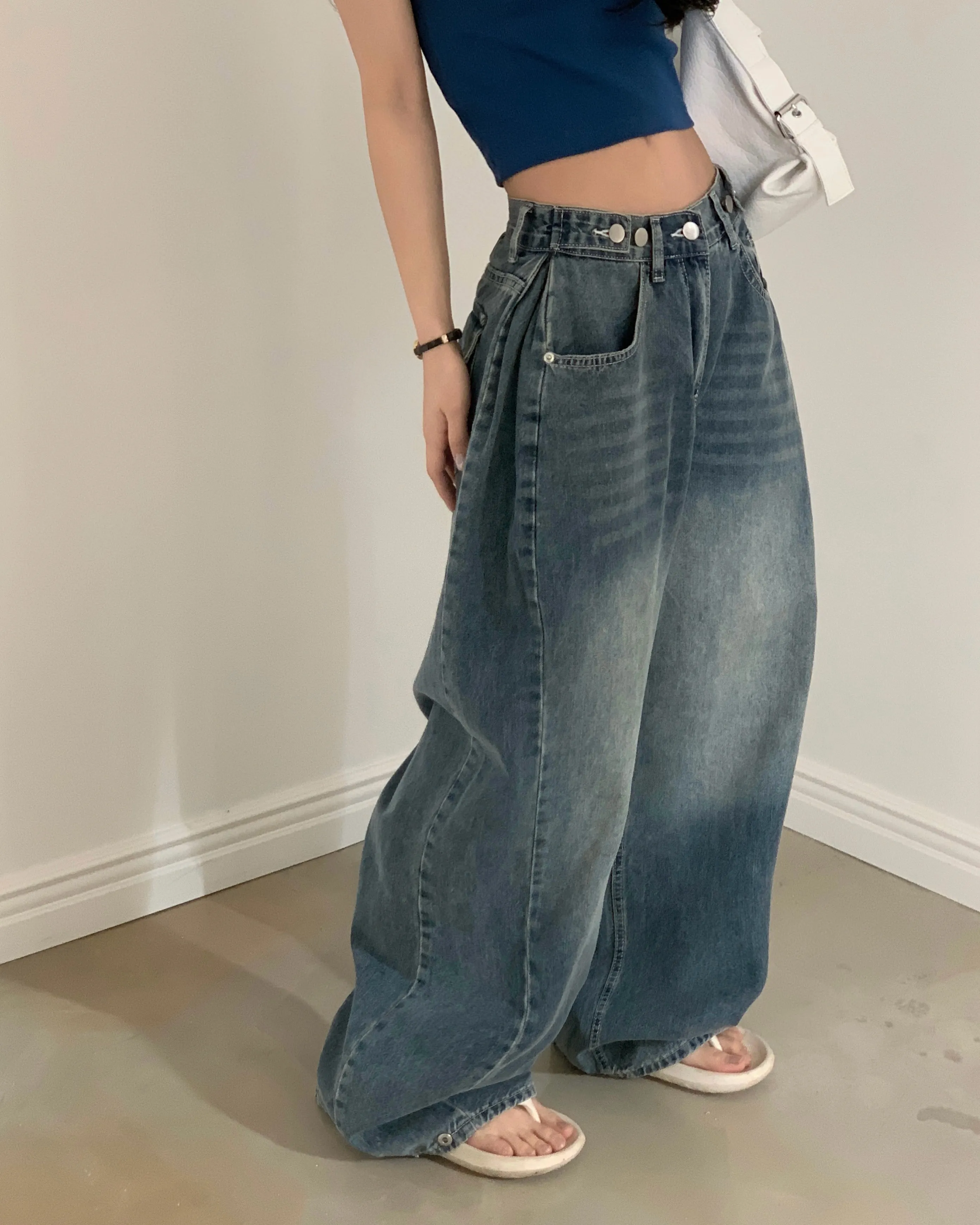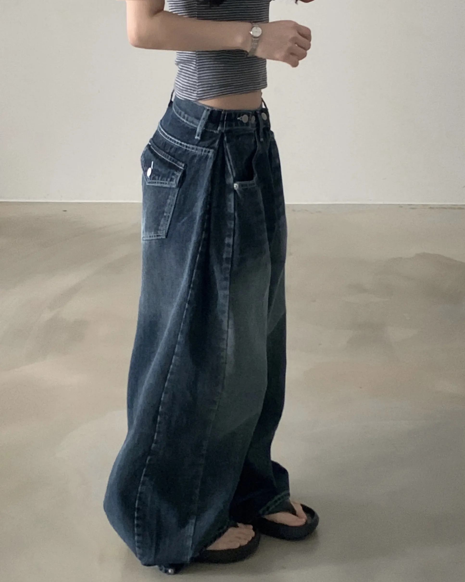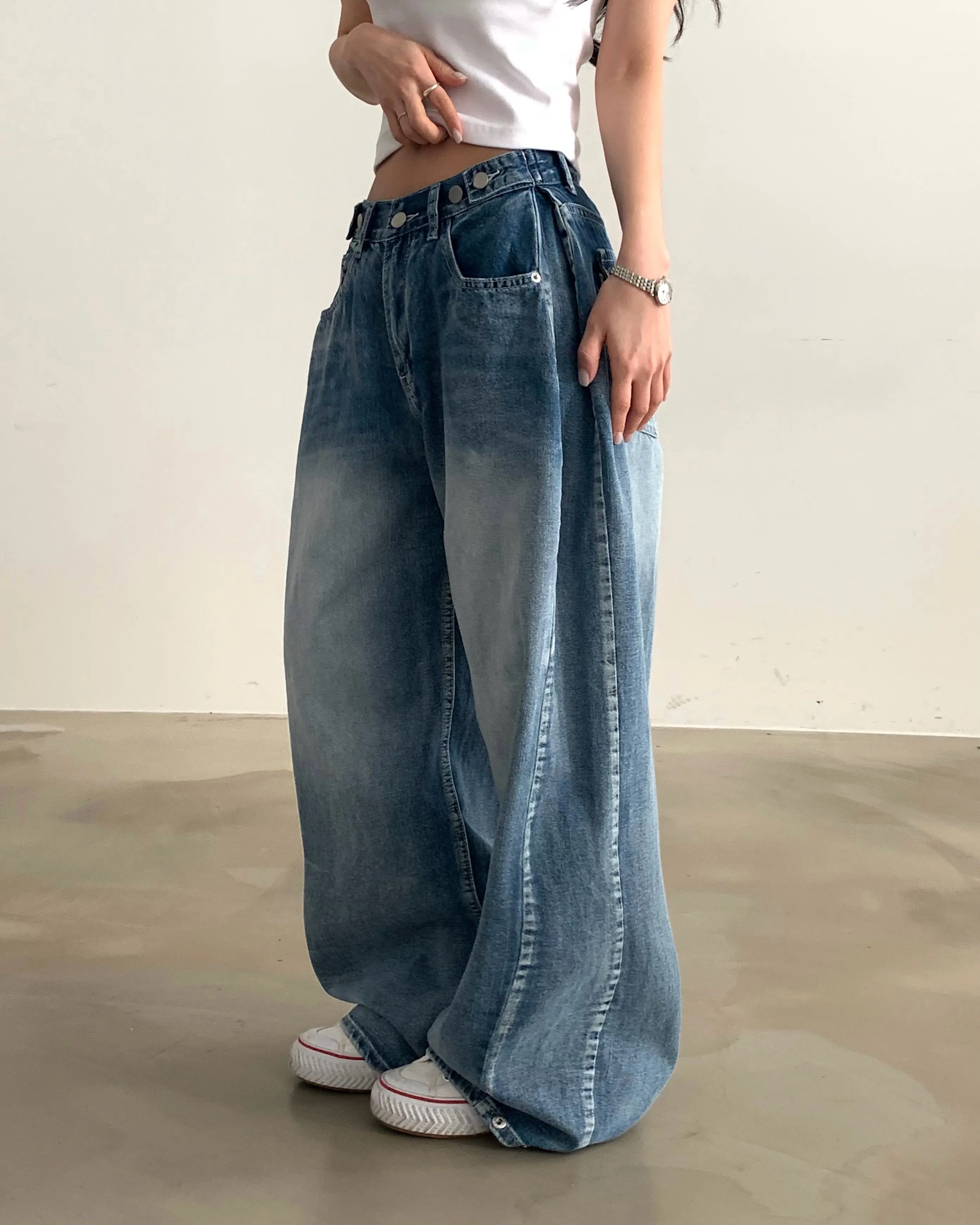 デニムコットンウォッシングポケットリベットバックポケットストレートワイドジップアップバックルループヒドゥンバンディングライトブルーディープブルーデニムパンツ[選べる丈]