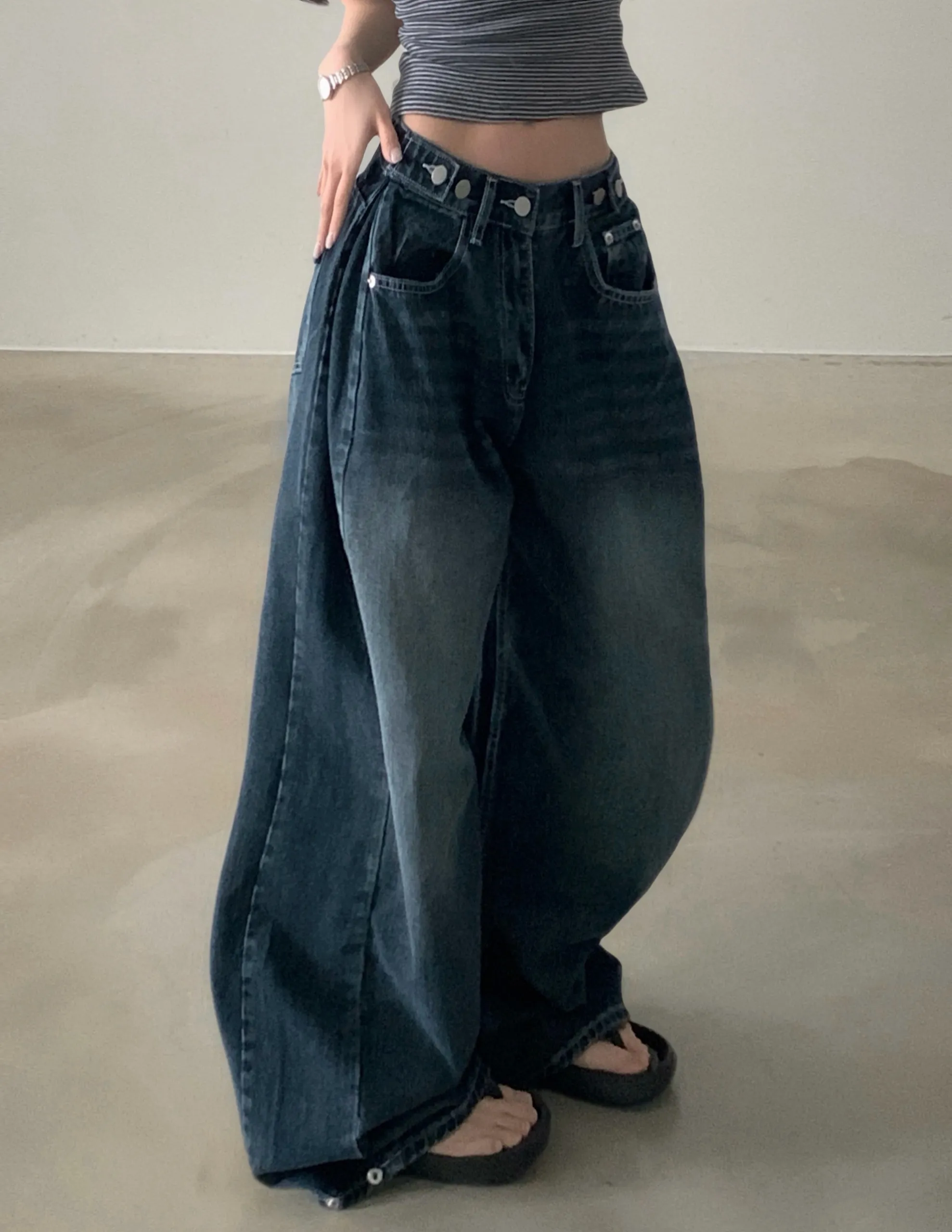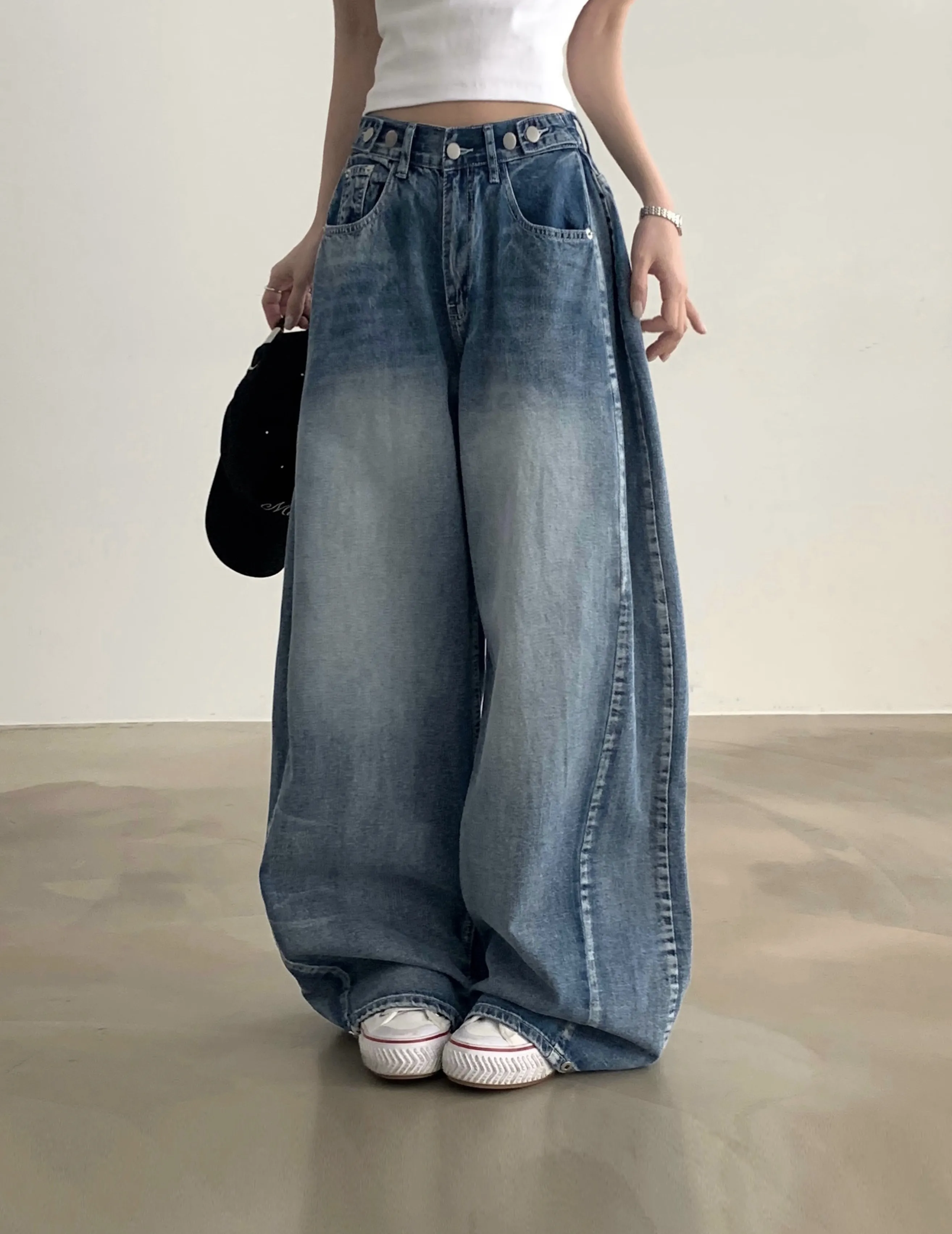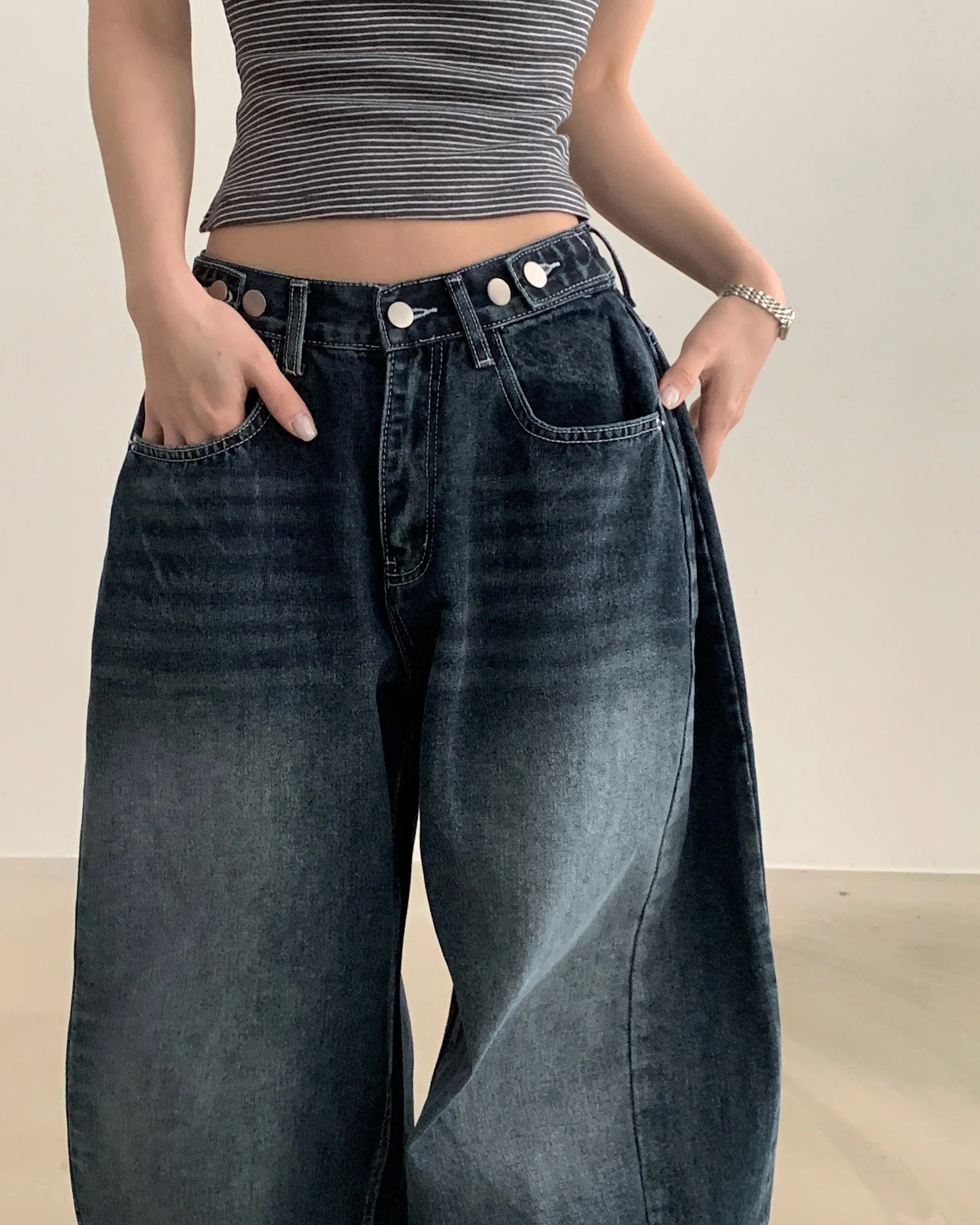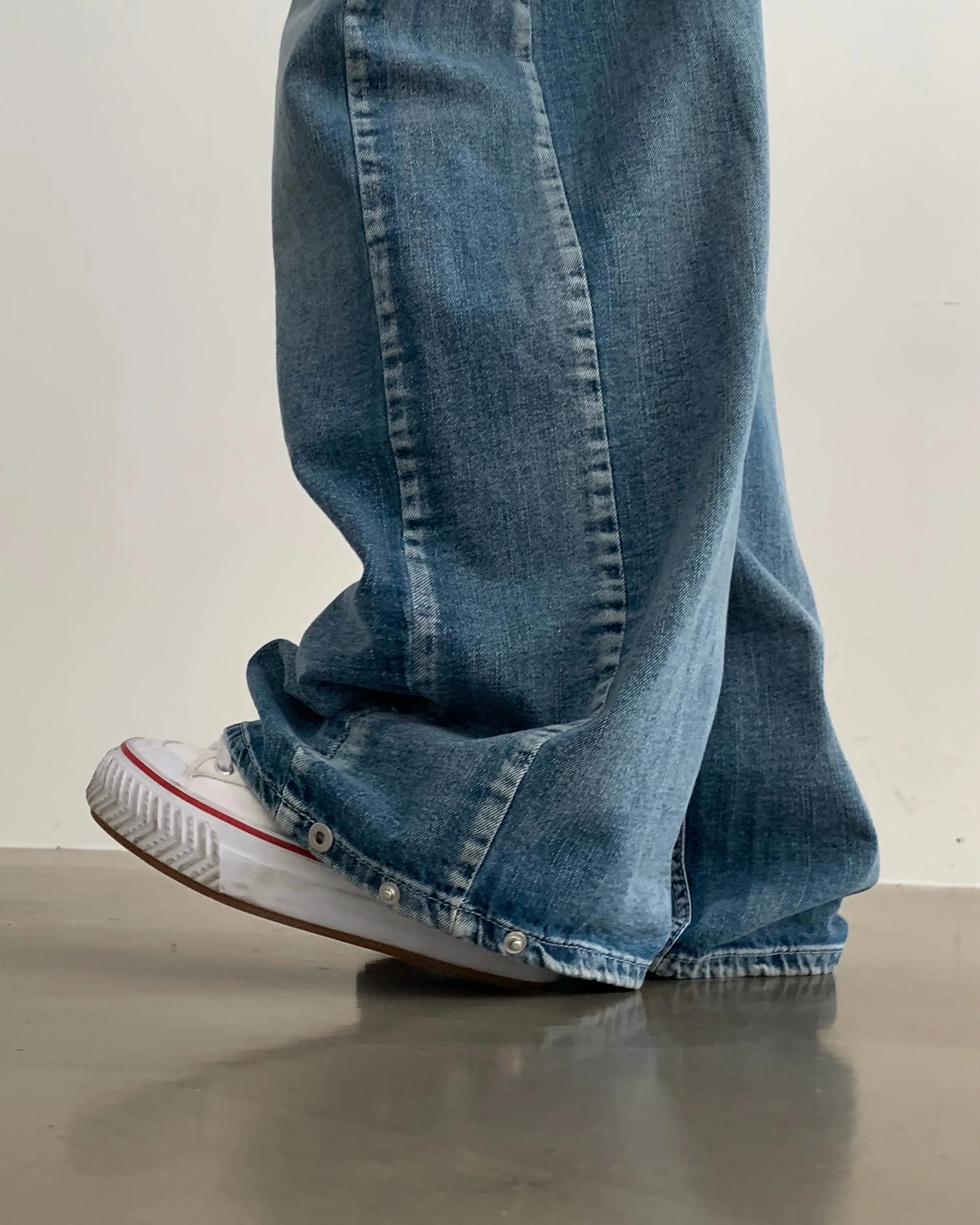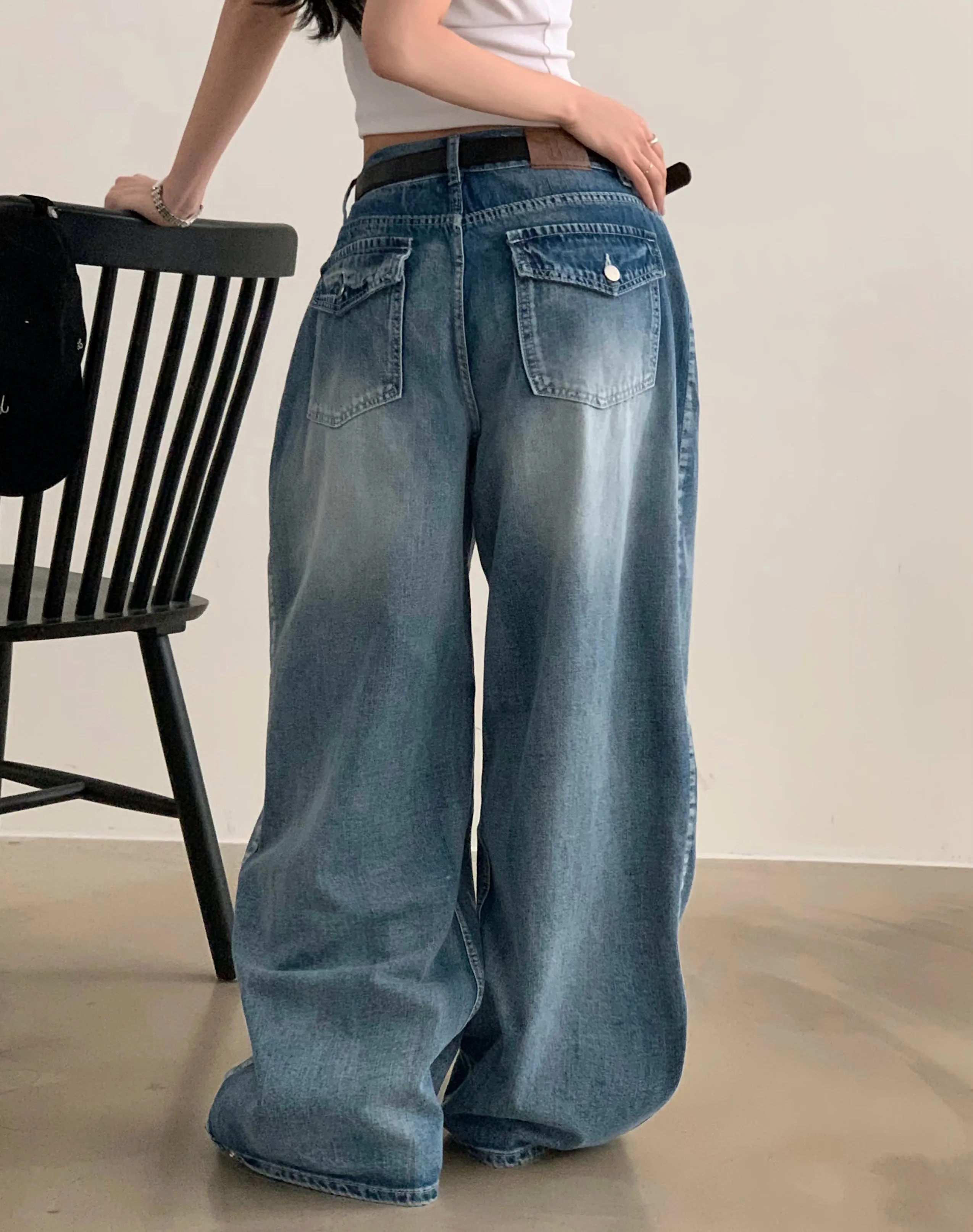 デニムコットンウォッシングポケットリベットバックポケットストレートワイドジップアップバックルループヒドゥンバンディングライトブルーディープブルーデニムパンツ[選べる丈]