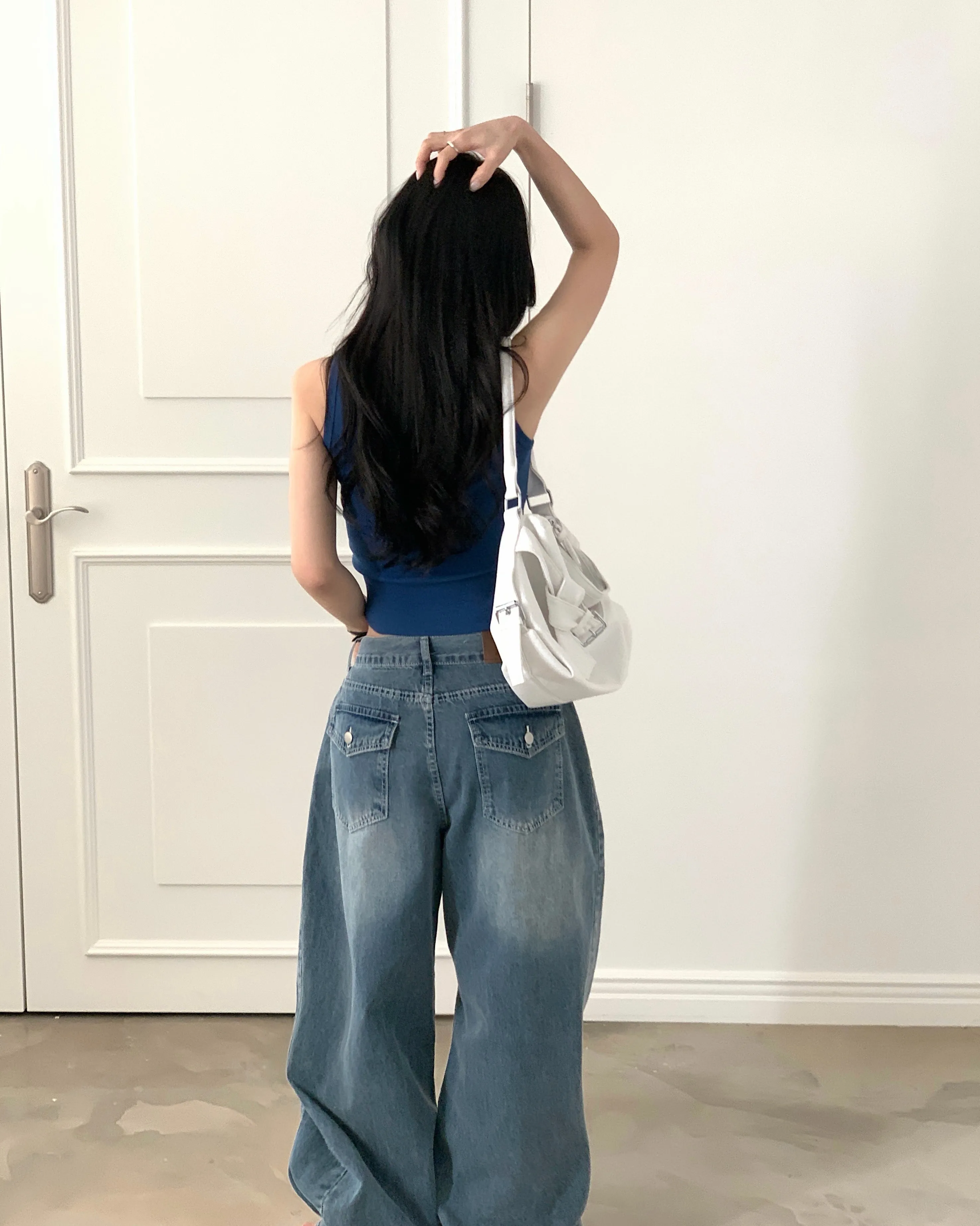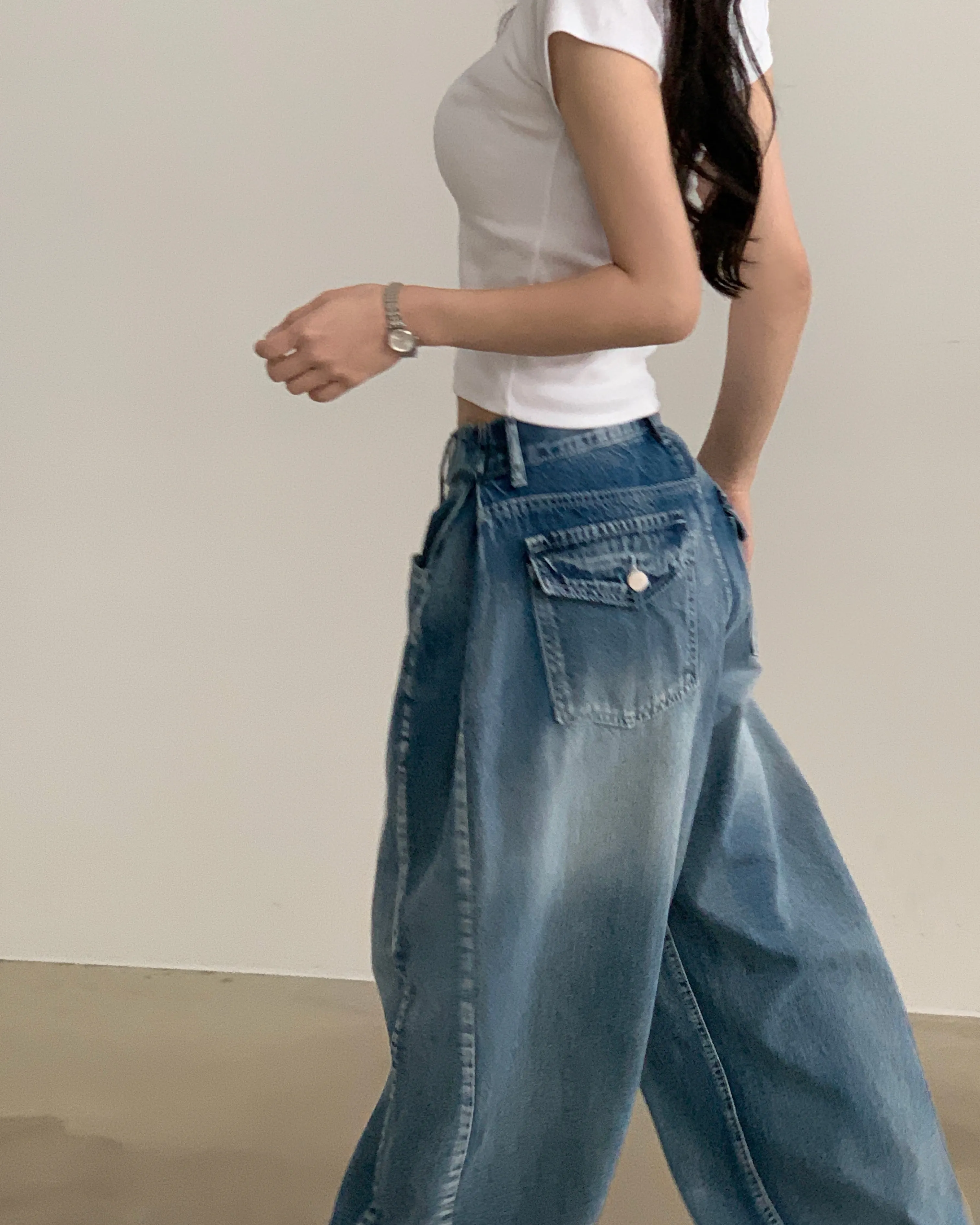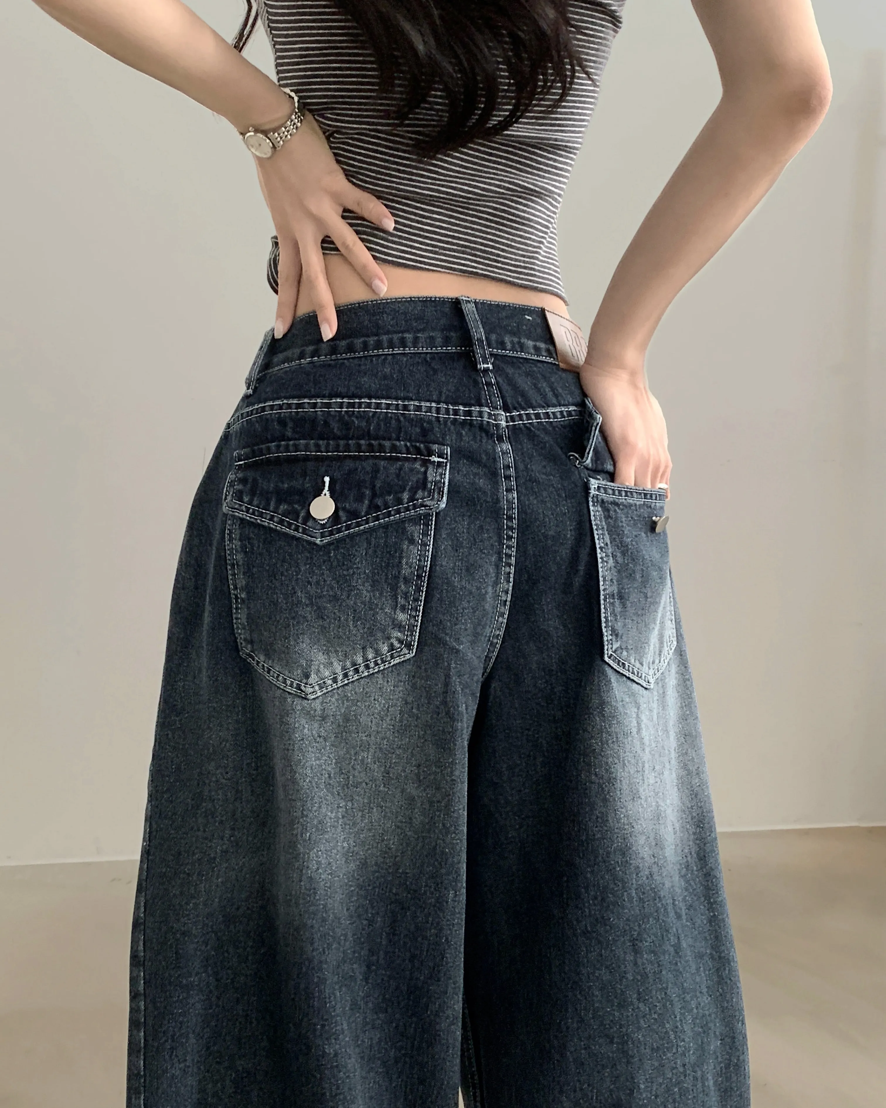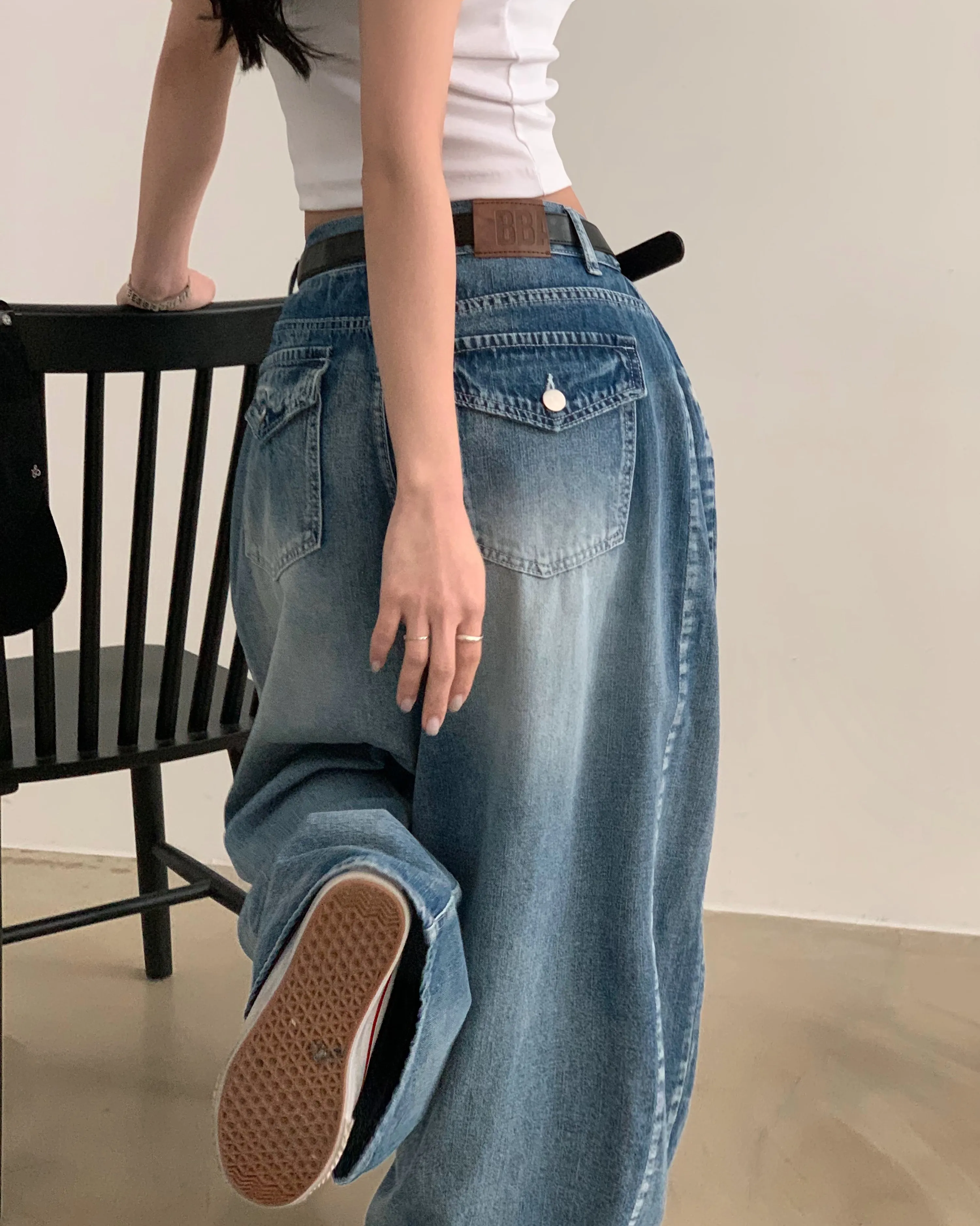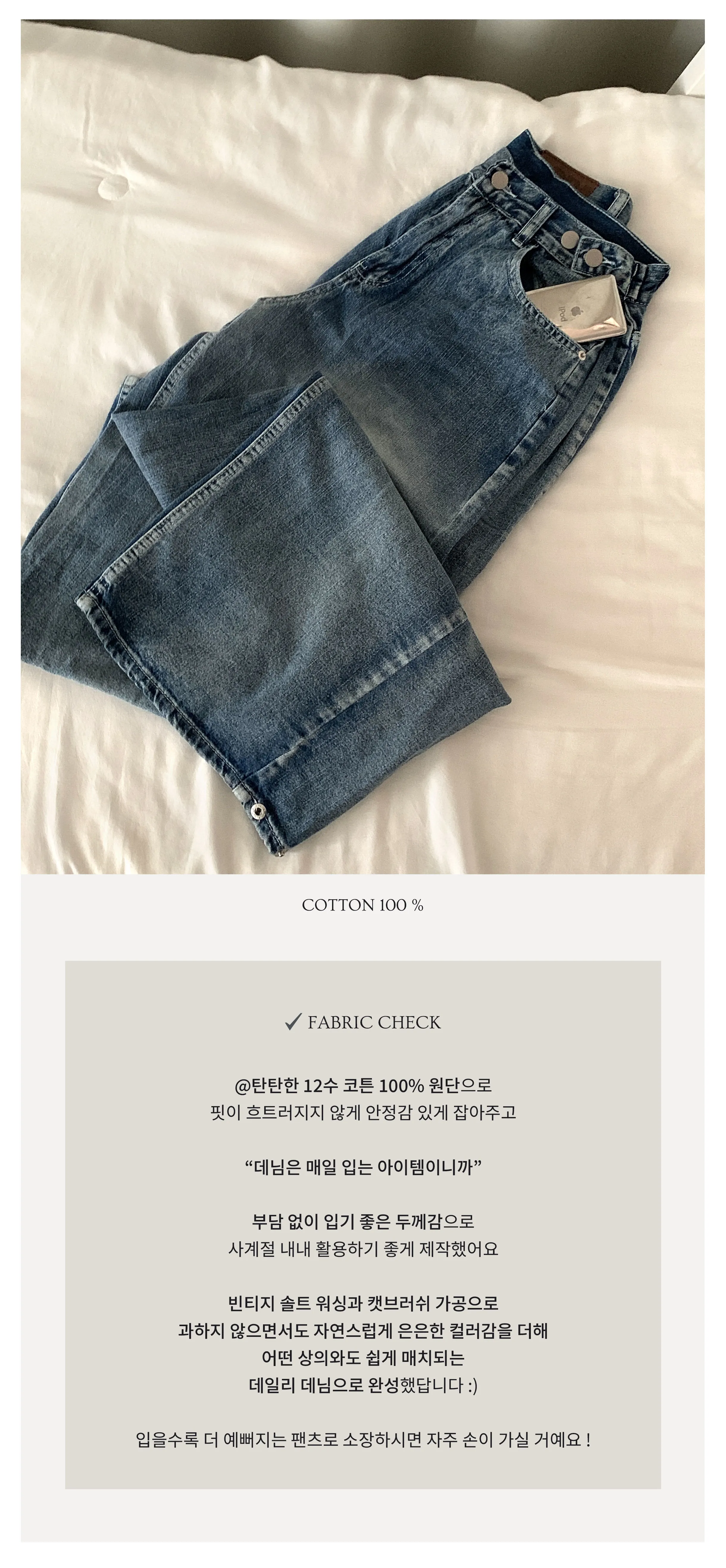 デニムコットンウォッシングポケットリベットバックポケットストレートワイドジップアップバックルループヒドゥンバンディングライトブルーディープブルーデニムパンツ[選べる丈]