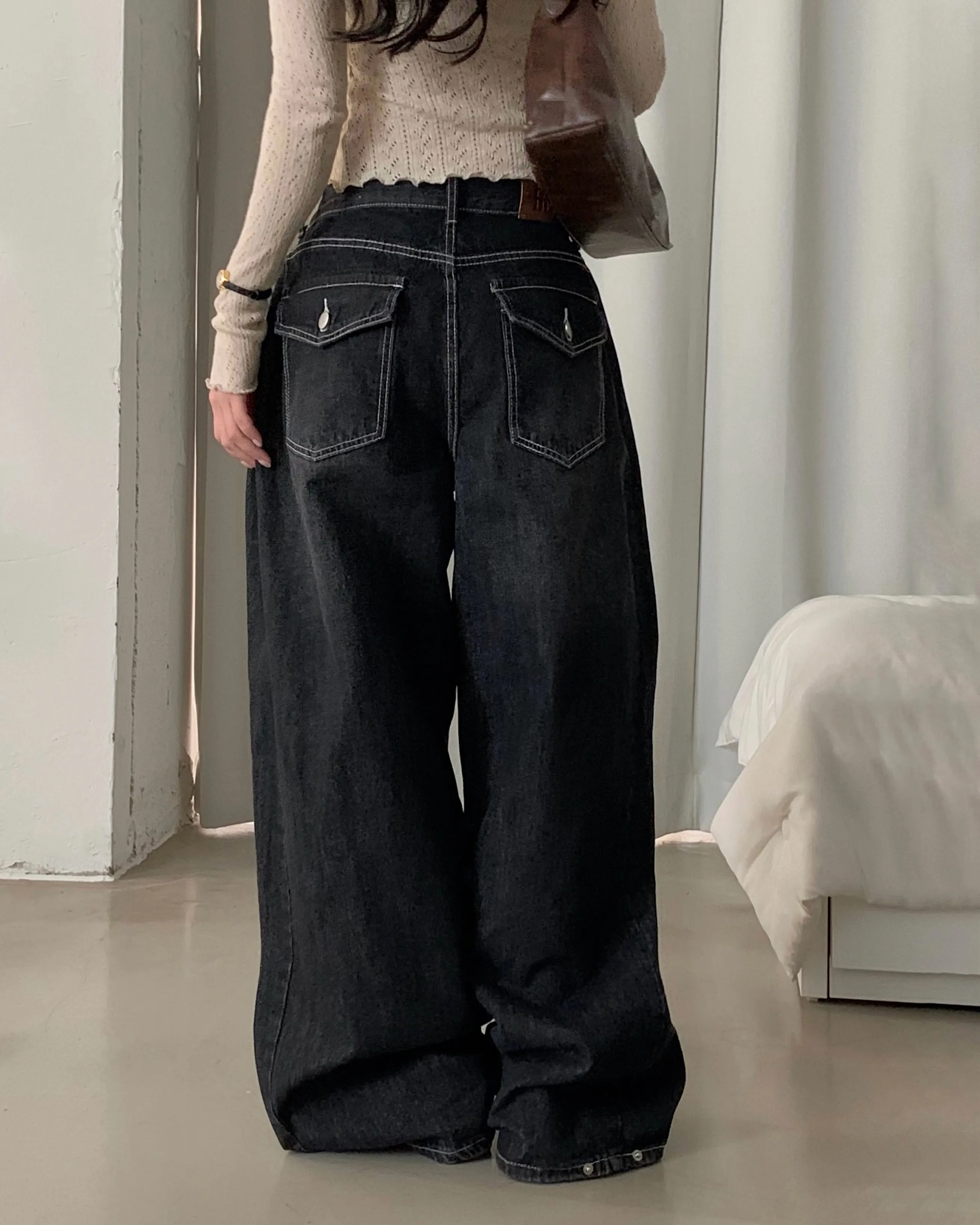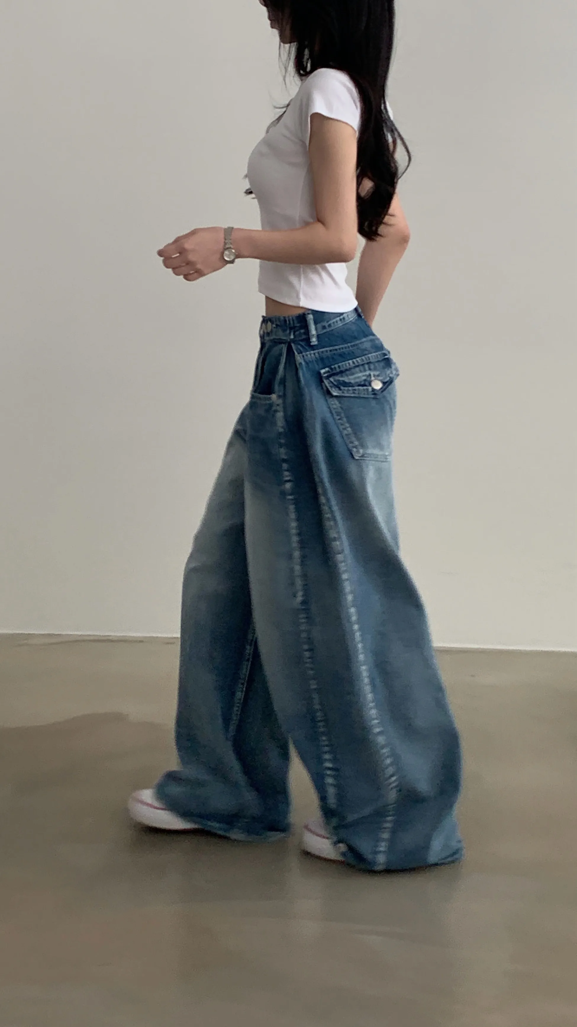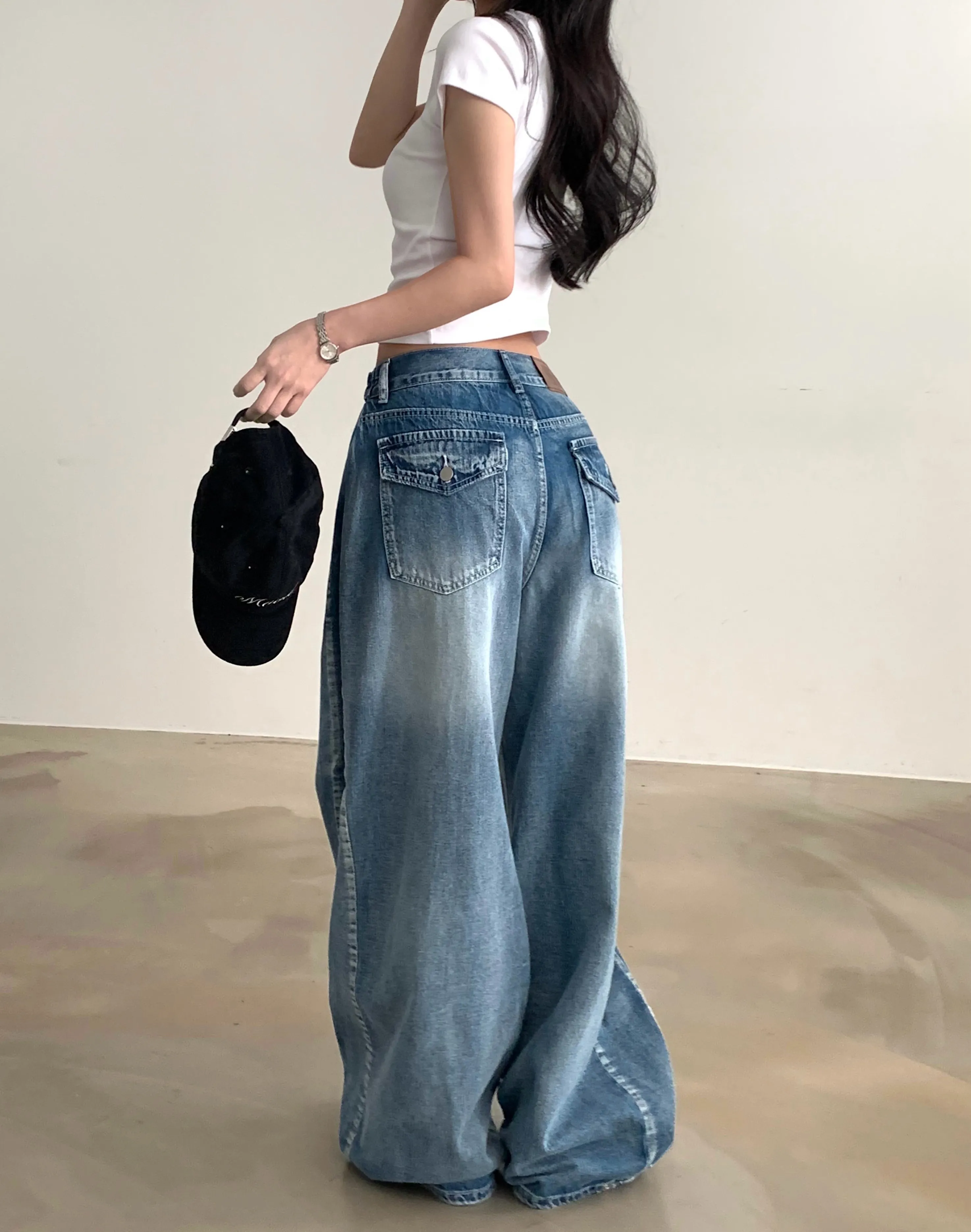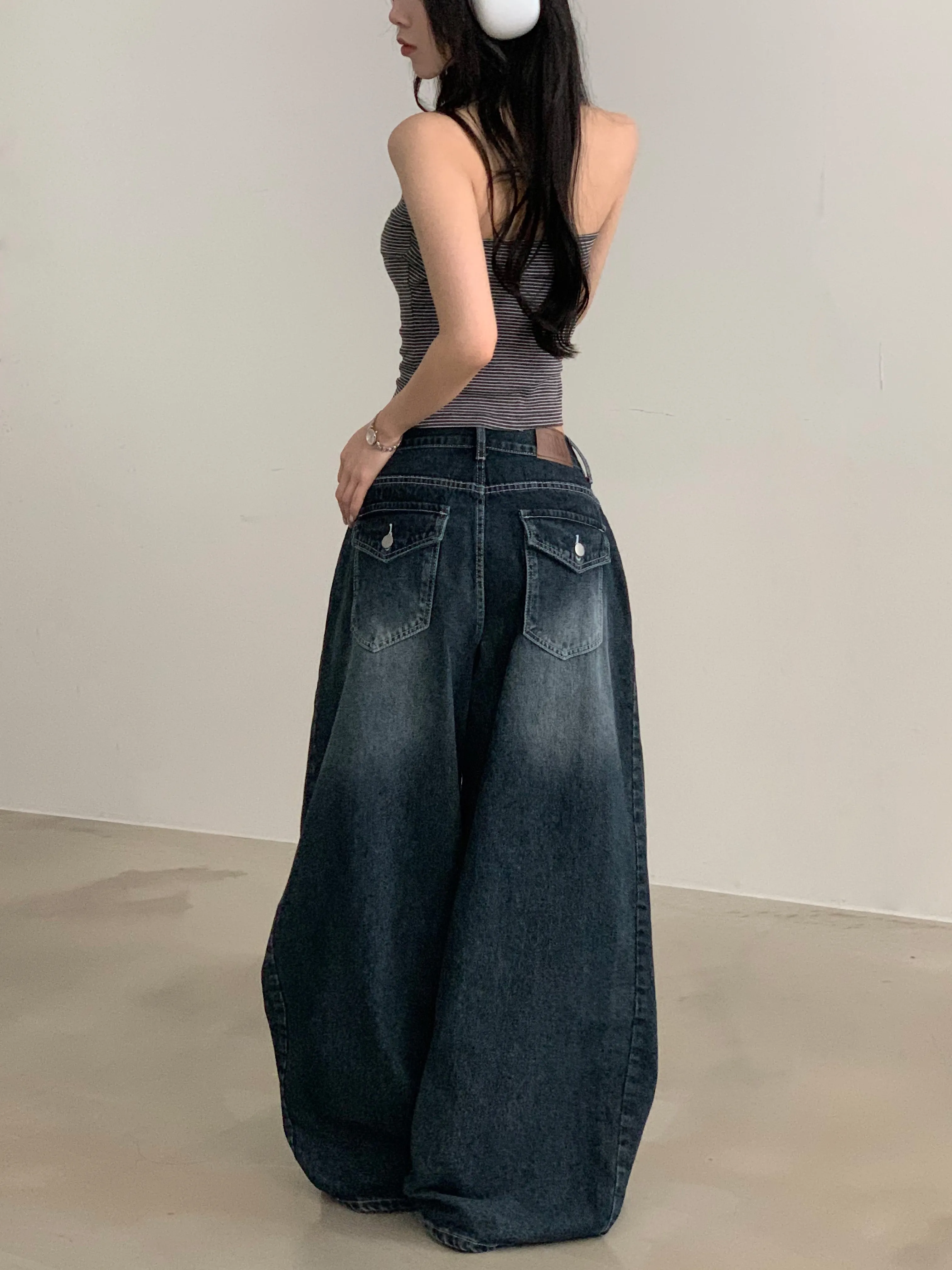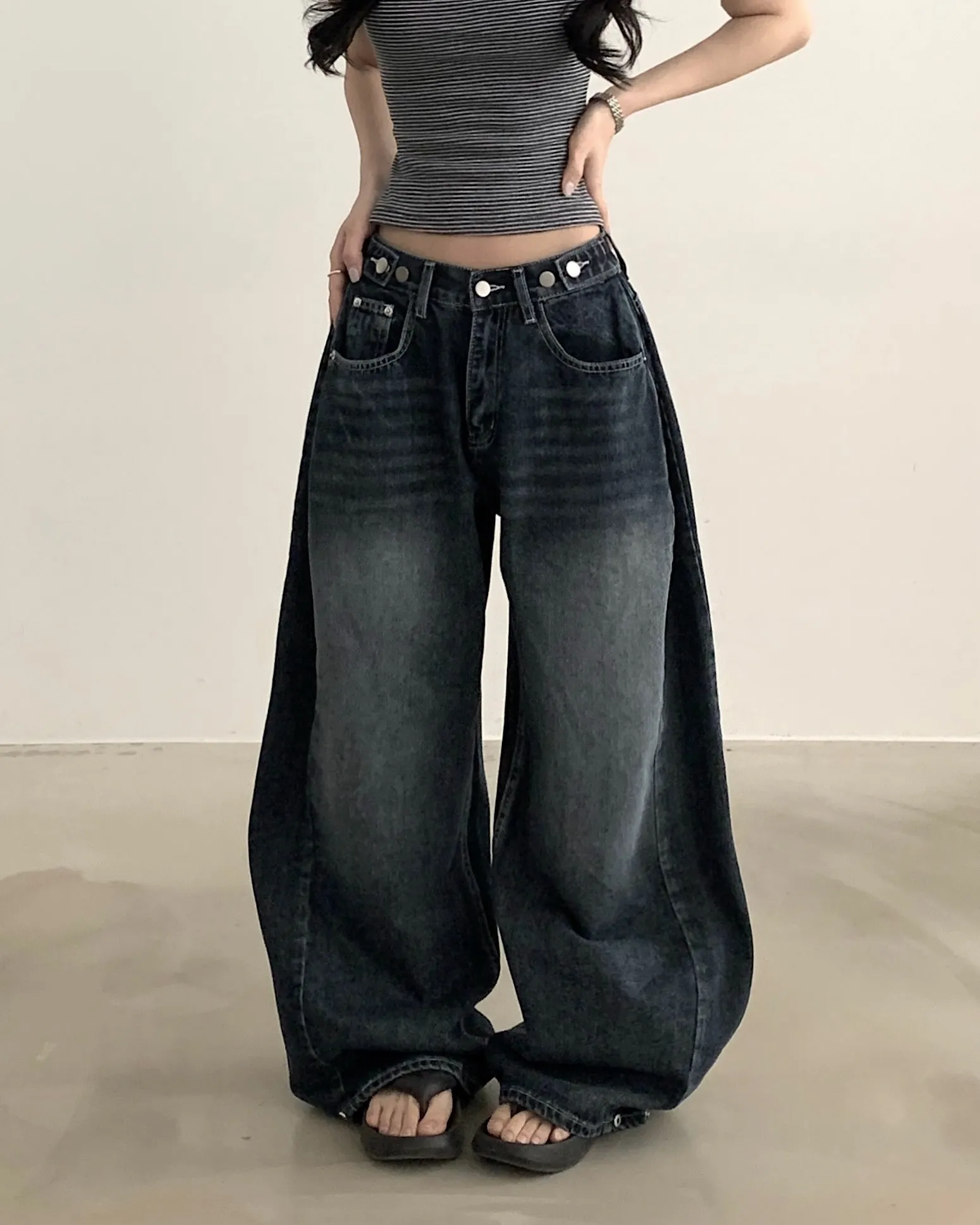 デニムコットンウォッシングポケットリベットバックポケットストレートワイドジップアップバックルループヒドゥンバンディングライトブルーディープブルーデニムパンツ[選べる丈]