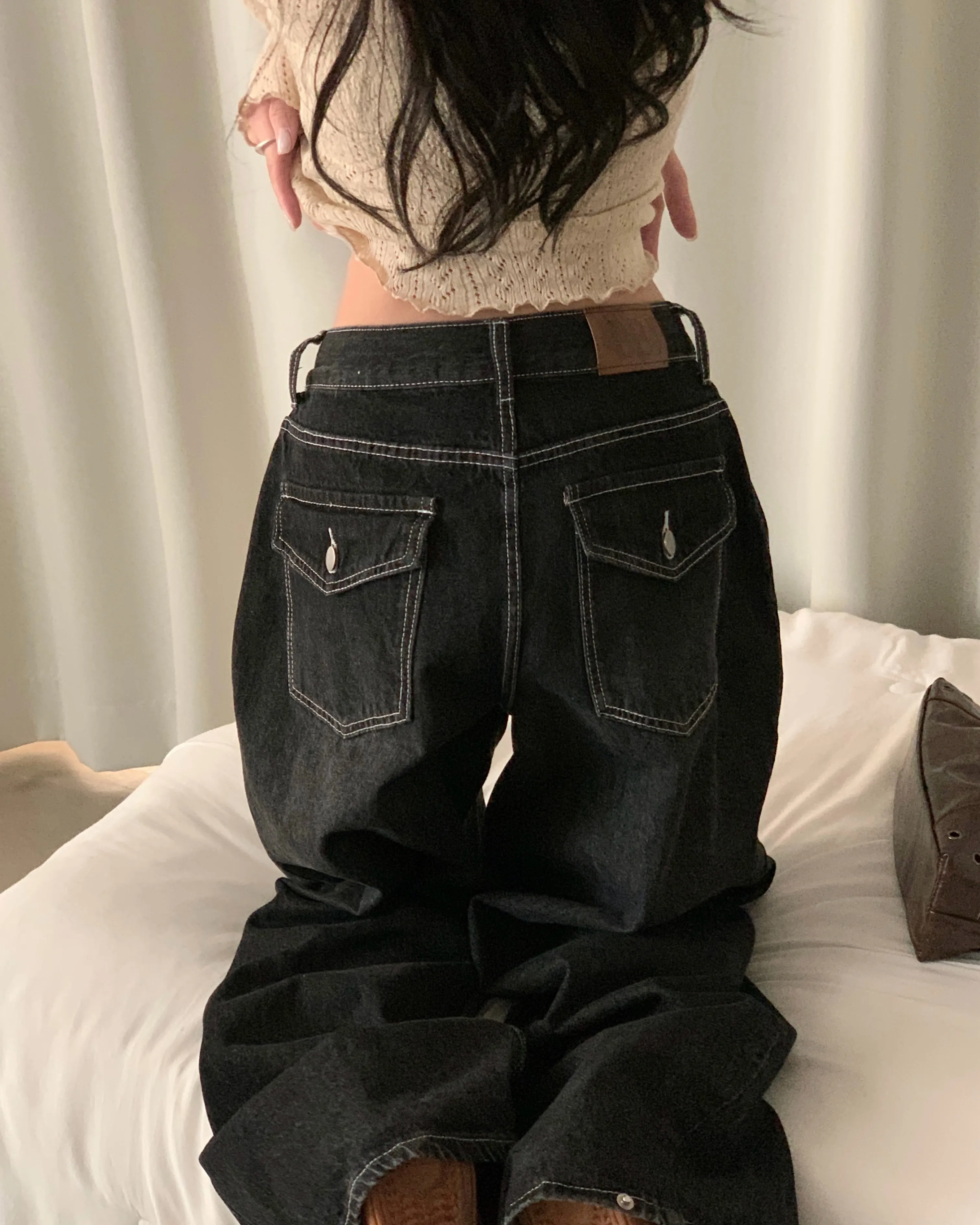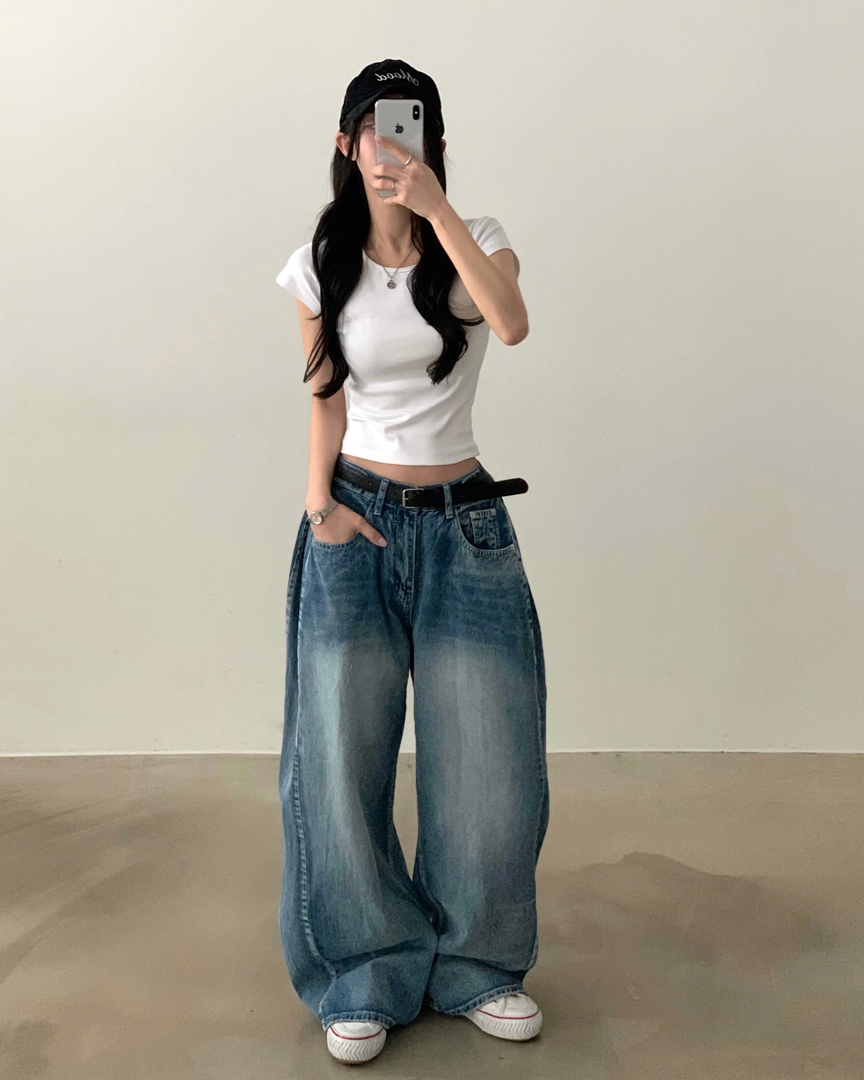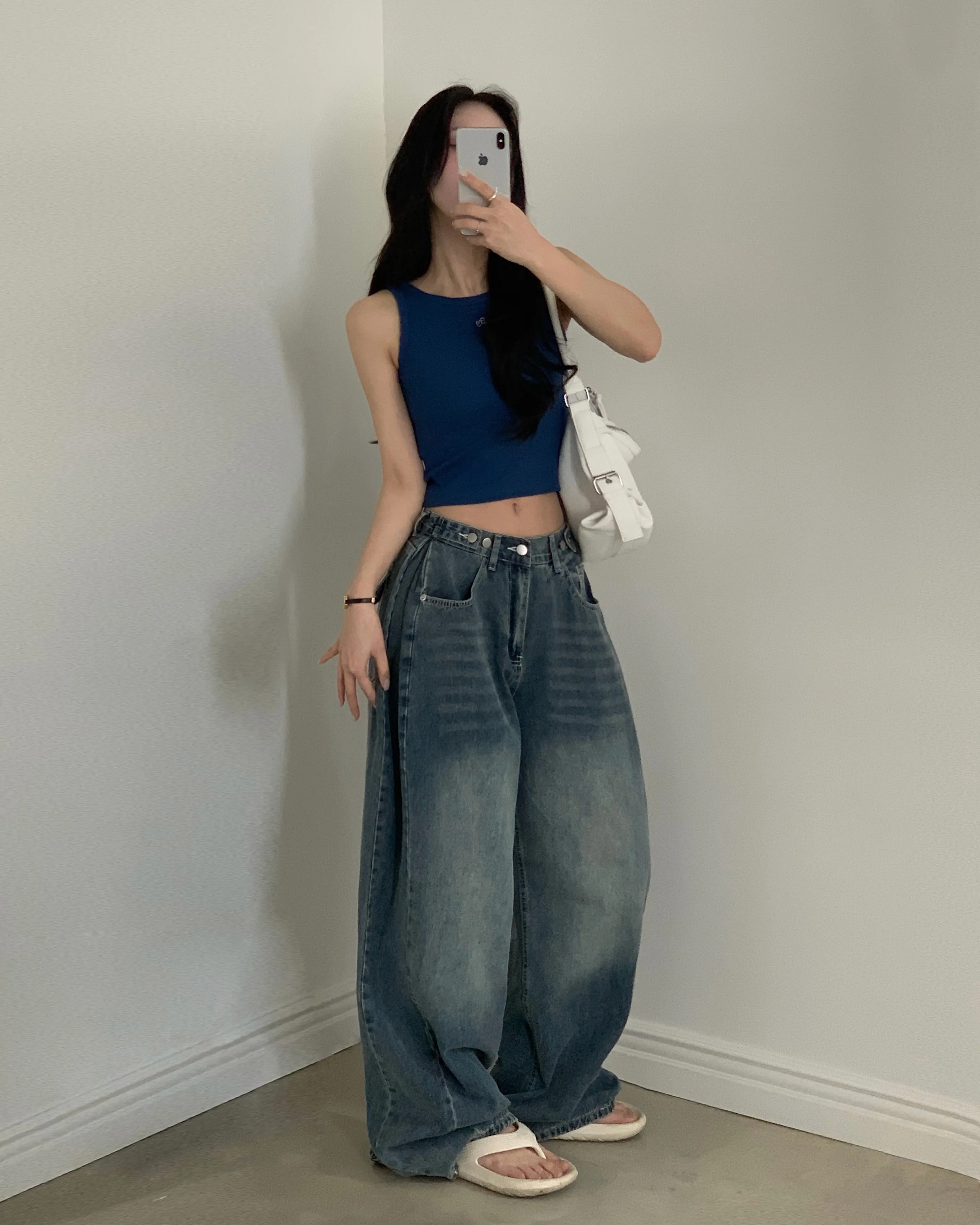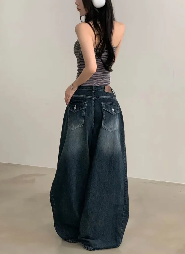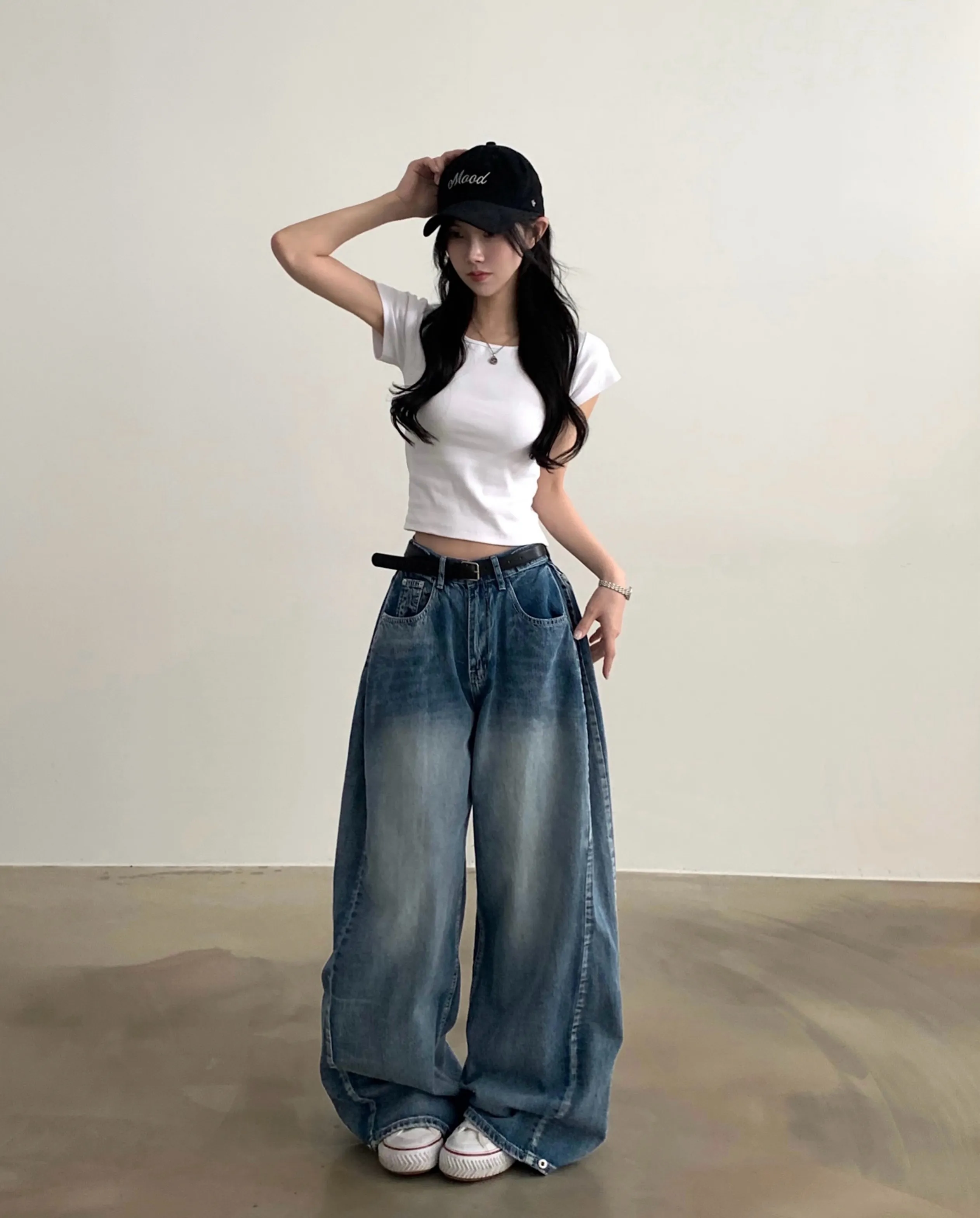 デニムコットンウォッシングポケットリベットバックポケットストレートワイドジップアップバックルループヒドゥンバンディングライトブルーディープブルーデニムパンツ[選べる丈]