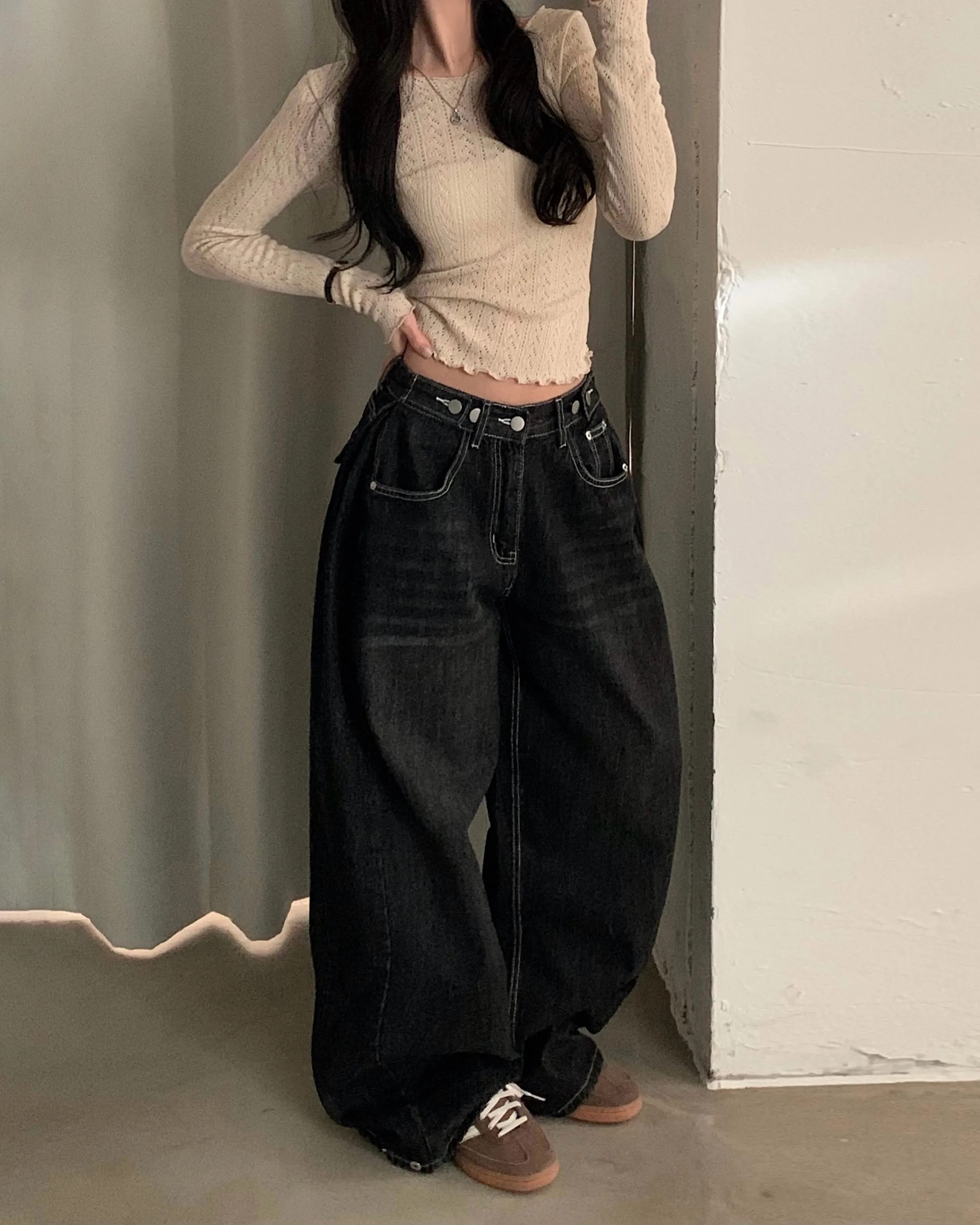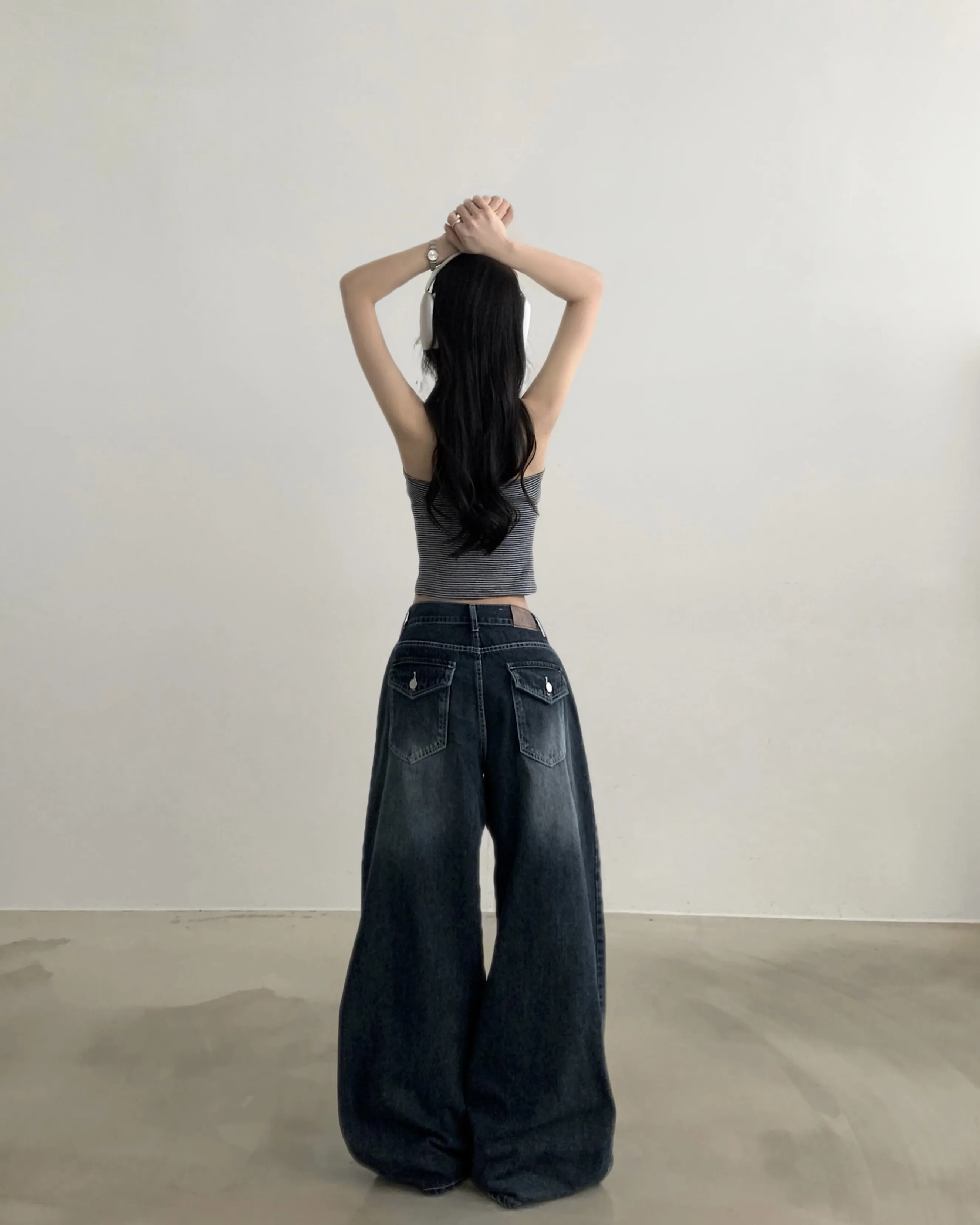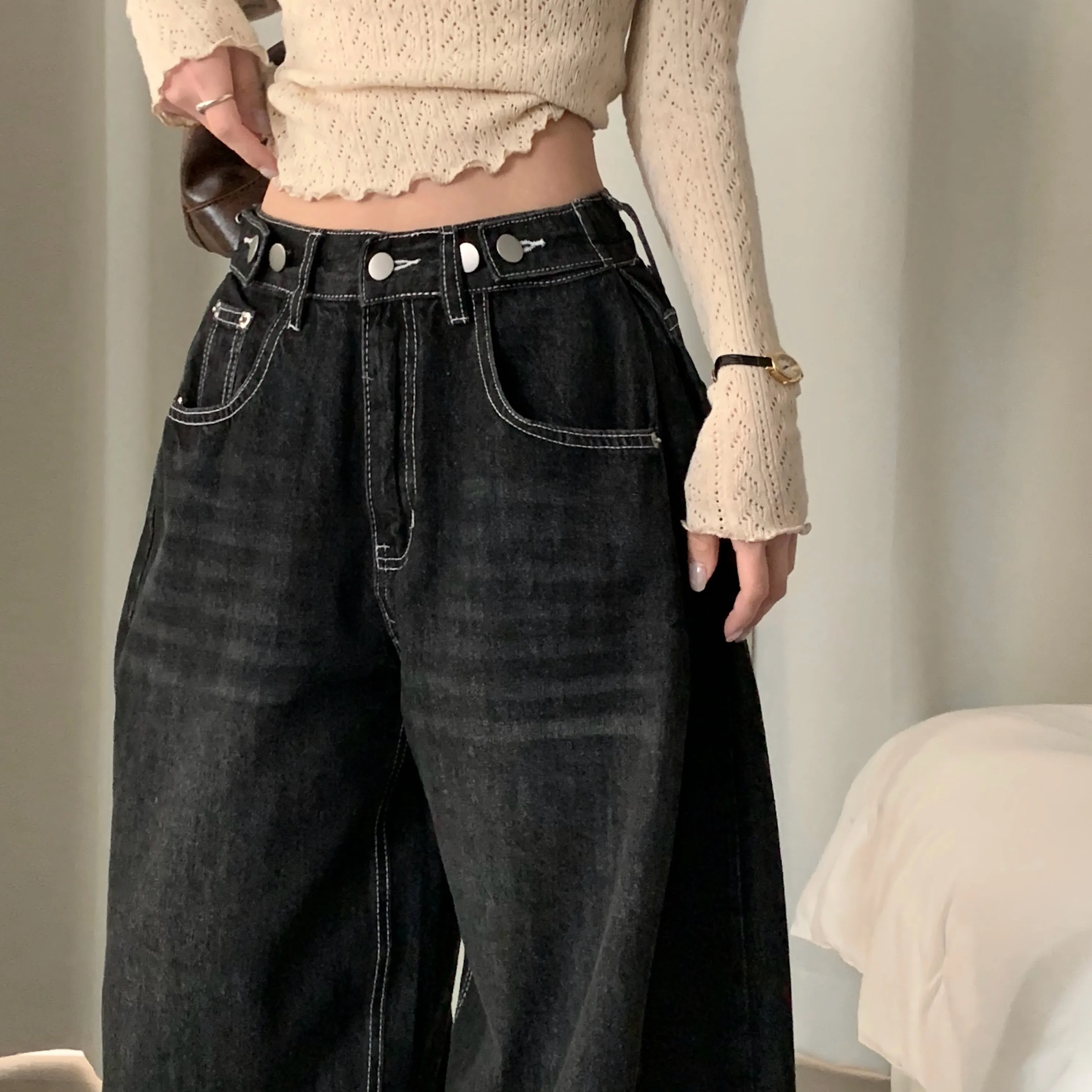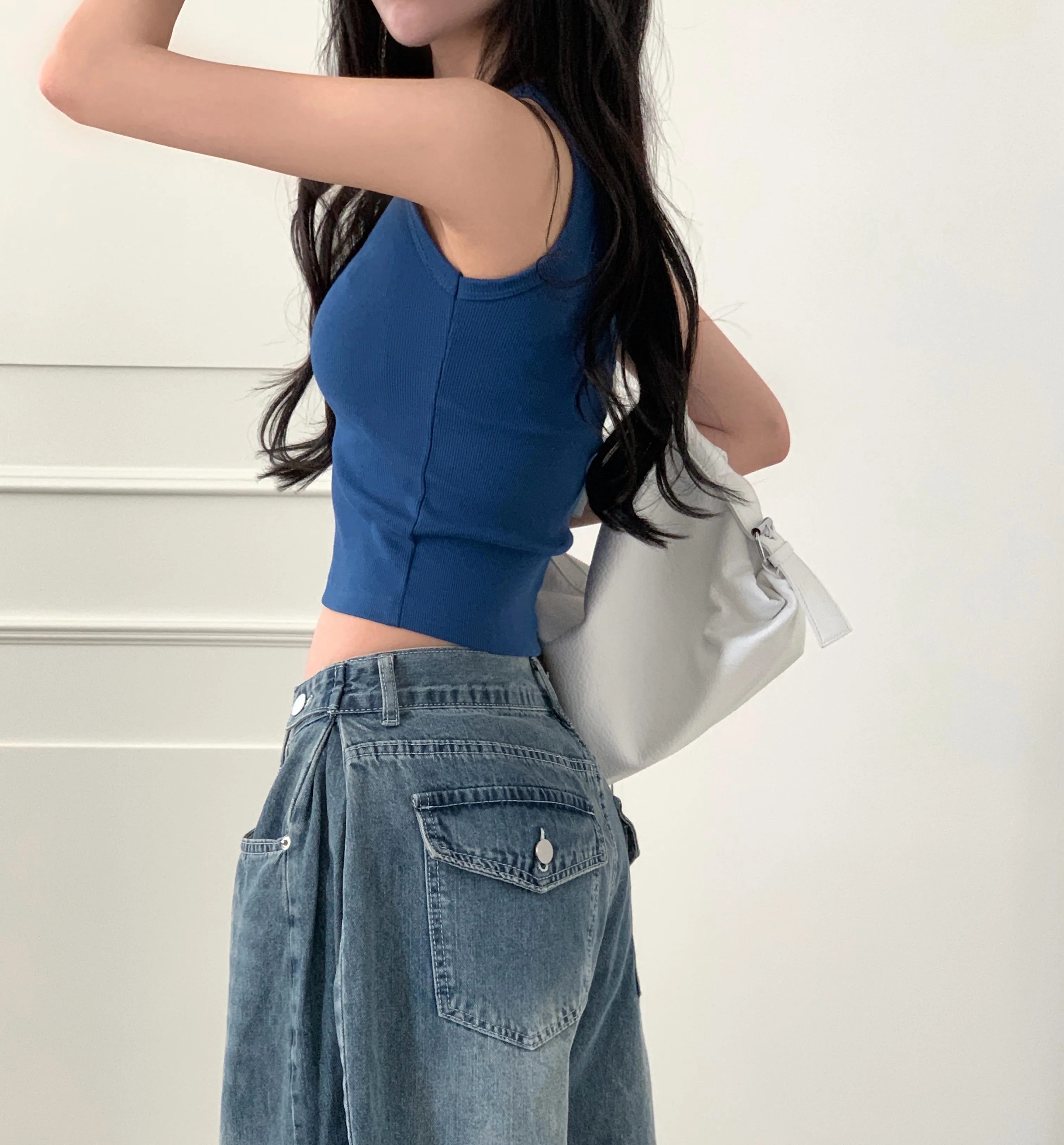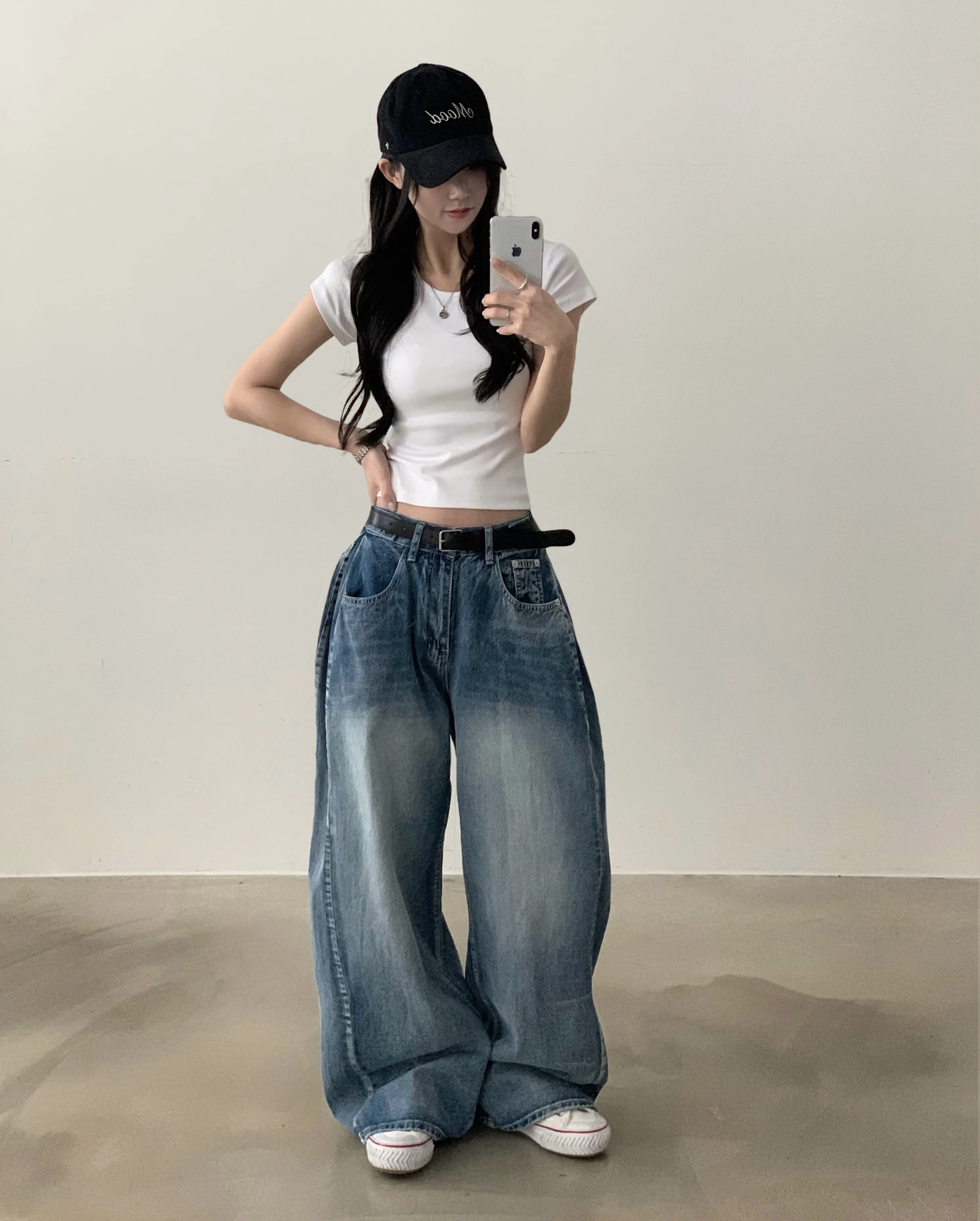 デニムコットンウォッシングポケットリベットバックポケットストレートワイドジップアップバックルループヒドゥンバンディングライトブルーディープブルーデニムパンツ[選べる丈]