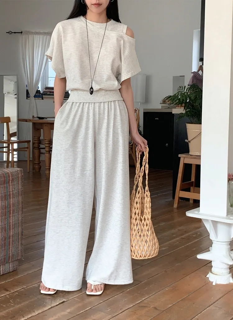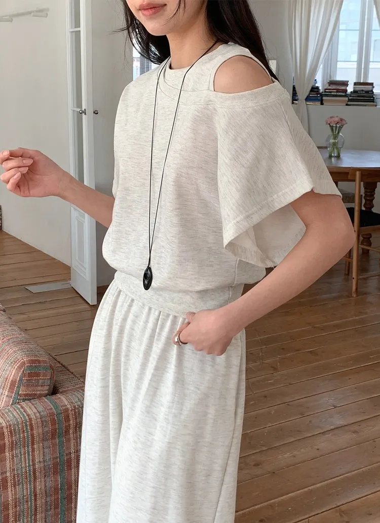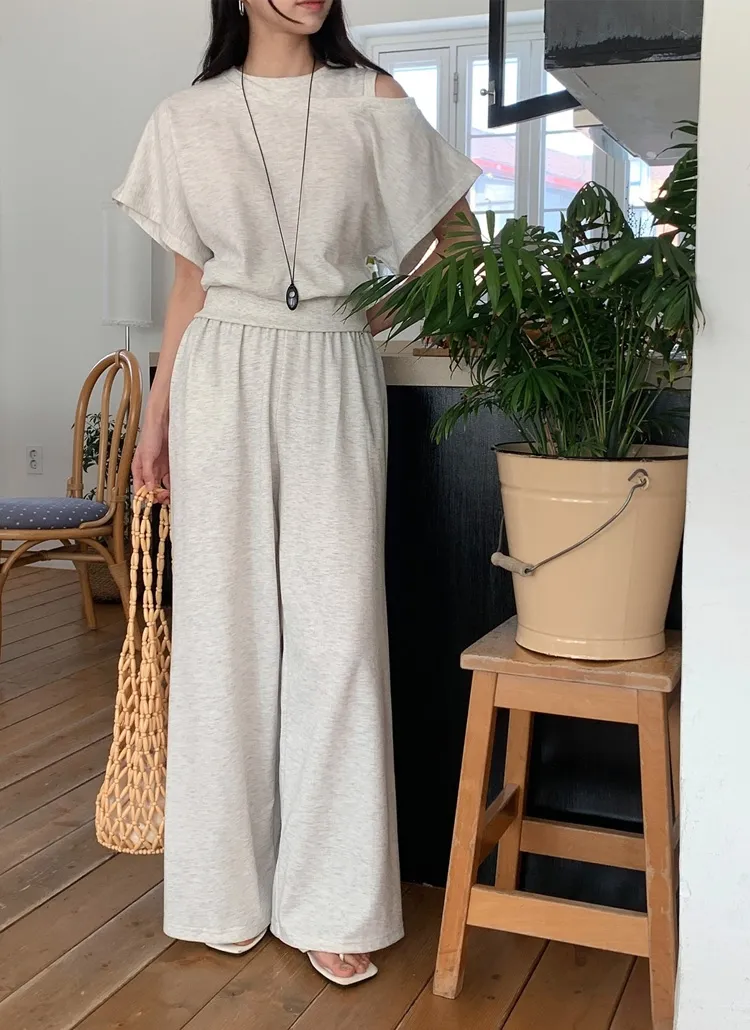 シースルーボタンスクエアネックラインウエストゴムパフスリーブスリムショート長袖ギャザーフレアAライン無地ツーピース(トップス、ボトムス)ブラウスショートパンツ