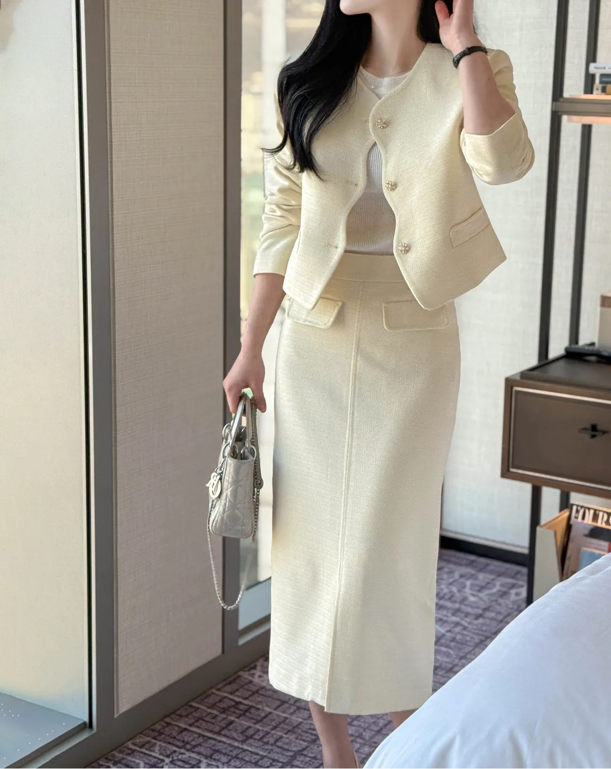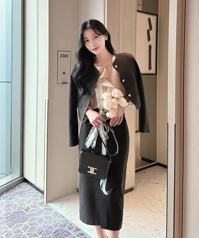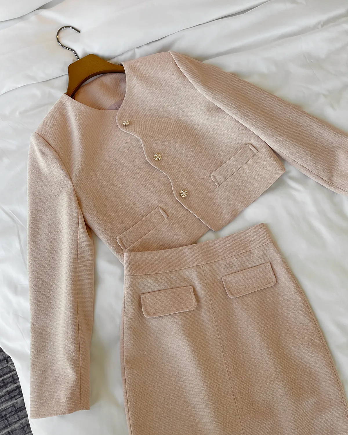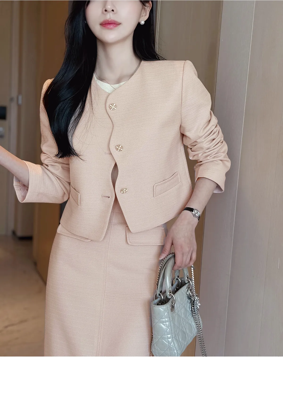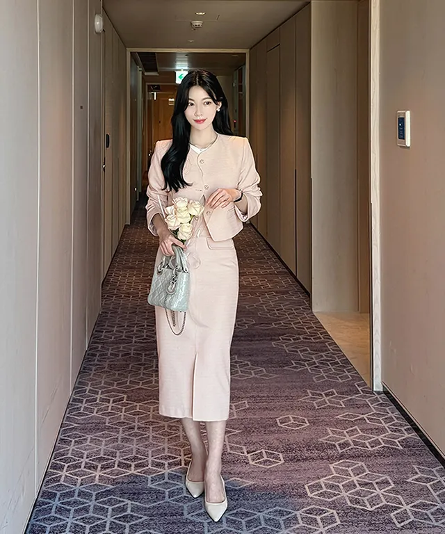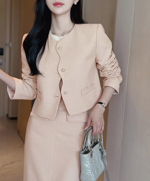 ツイードスクエアネック肩パッドペプラムラインスリムロング7分袖ツーポケットビジューボタンAラインヒドゥンジッパー無地ツーピース(トップス、ボトムス)スカートジャケット
