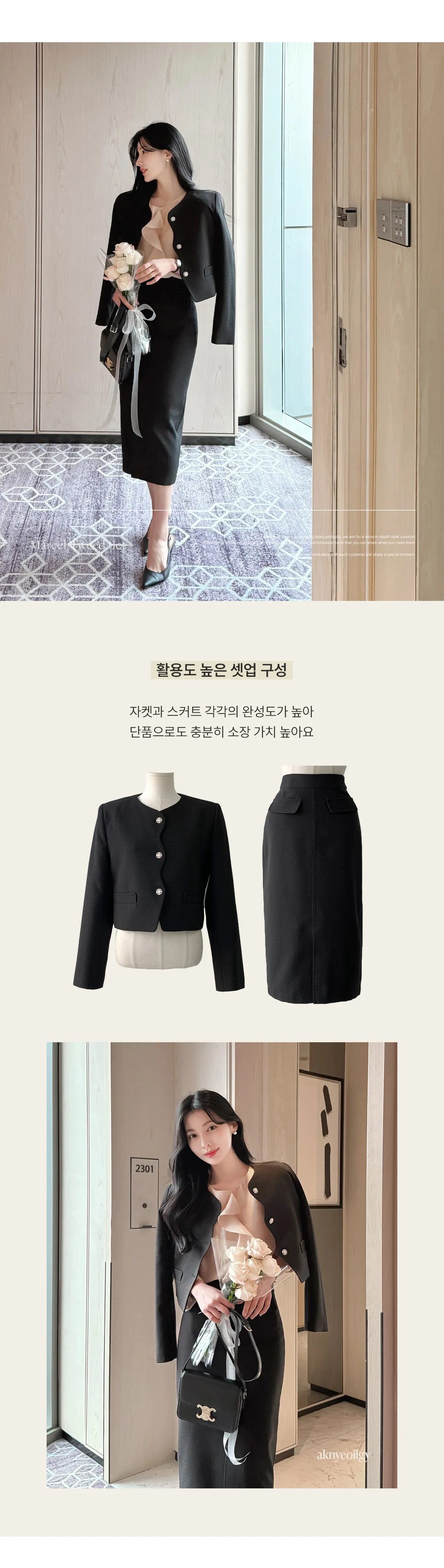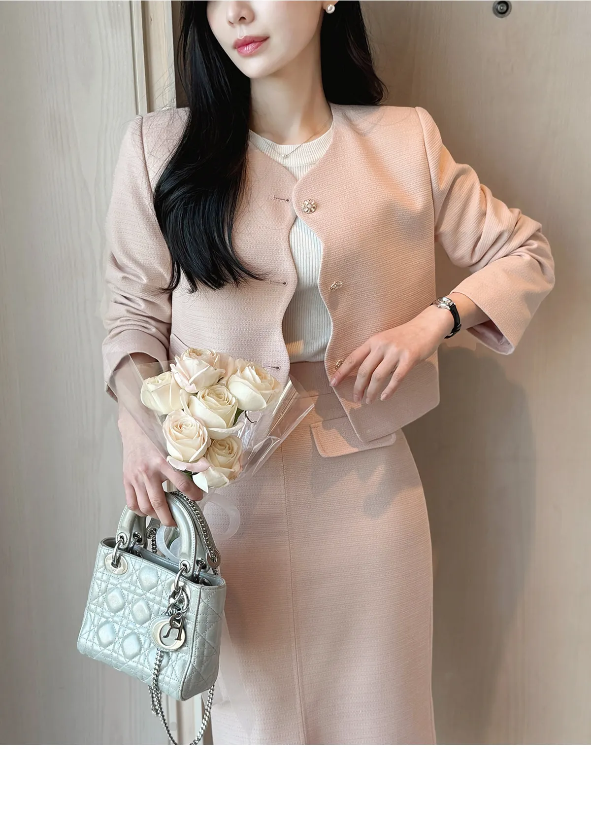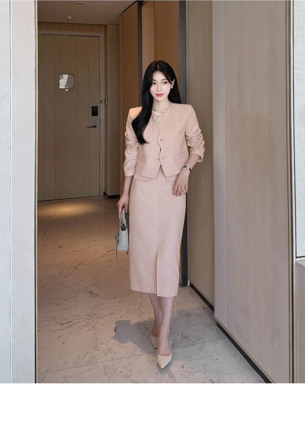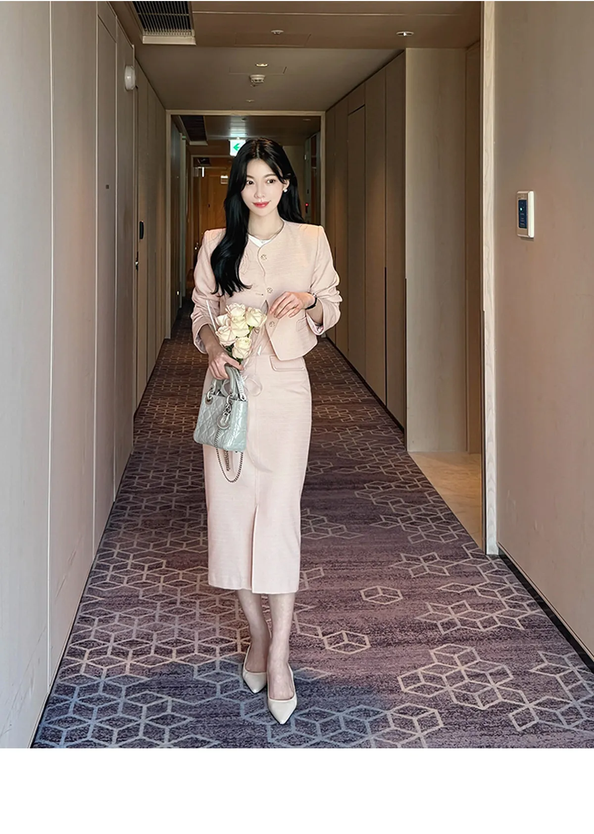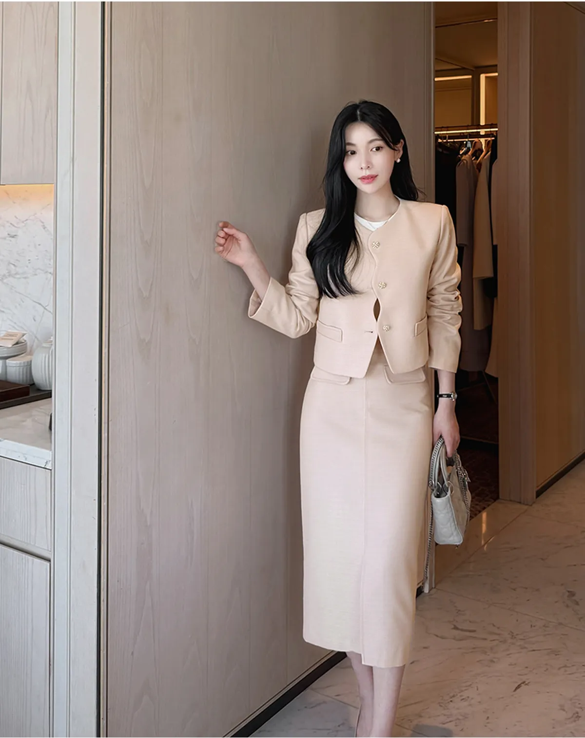 ツイードスクエアネック肩パッドペプラムラインスリムロング7分袖ツーポケットビジューボタンAラインヒドゥンジッパー無地ツーピース(トップス、ボトムス)スカートジャケット