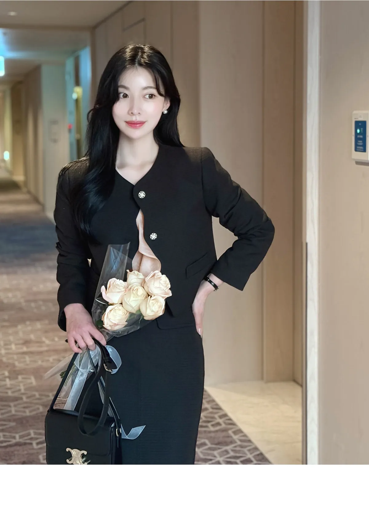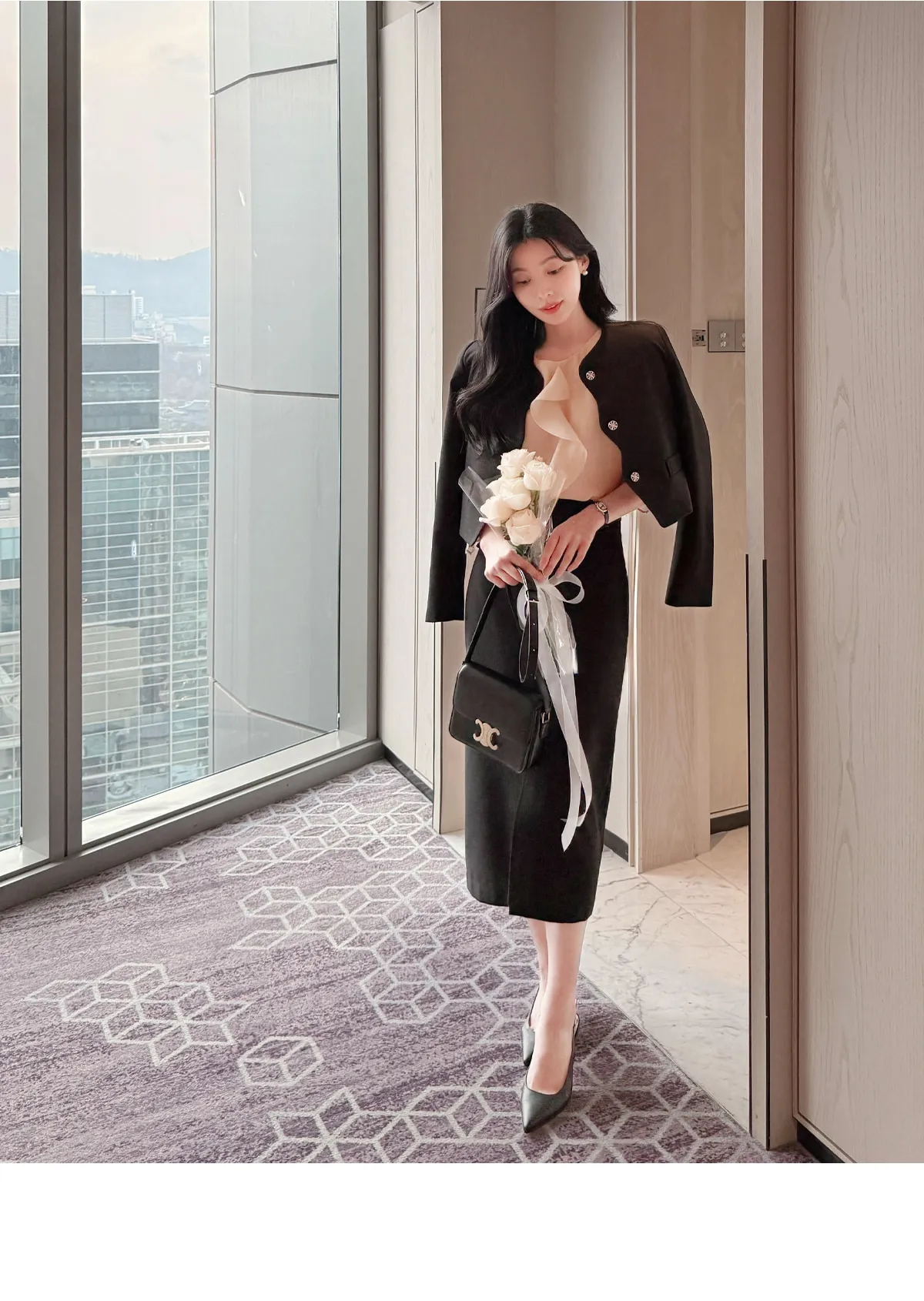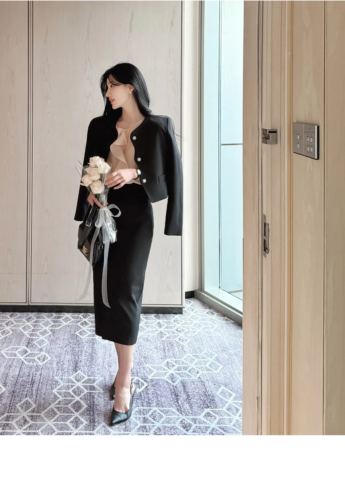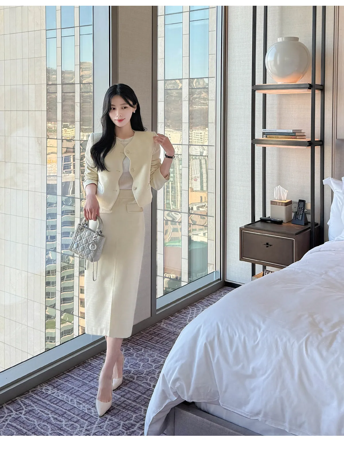 ツイードスクエアネック肩パッドペプラムラインスリムロング7分袖ツーポケットビジューボタンAラインヒドゥンジッパー無地ツーピース(トップス、ボトムス)スカートジャケット