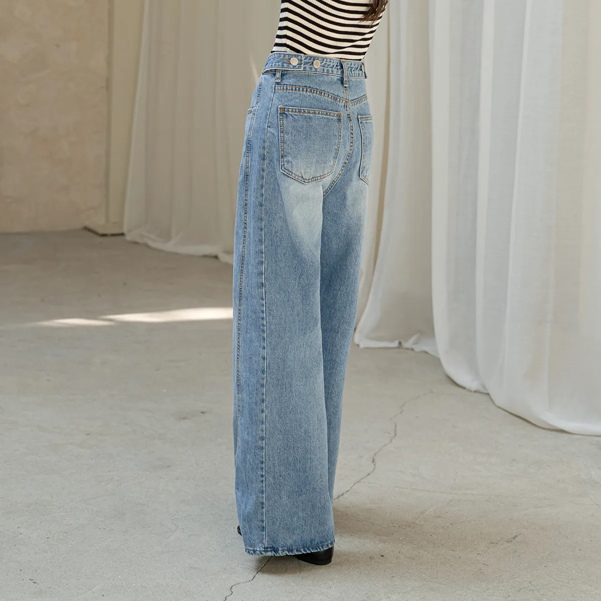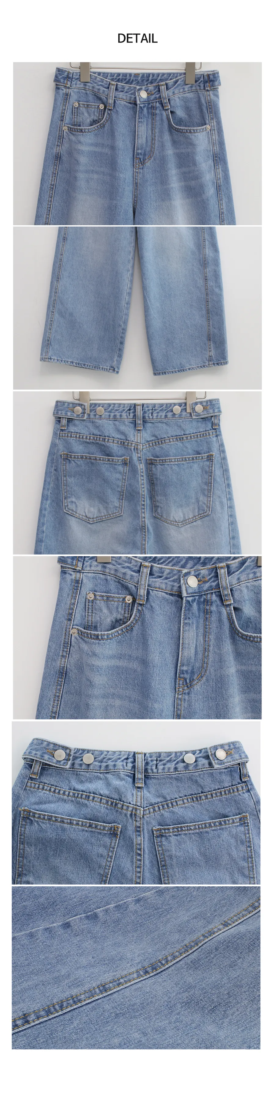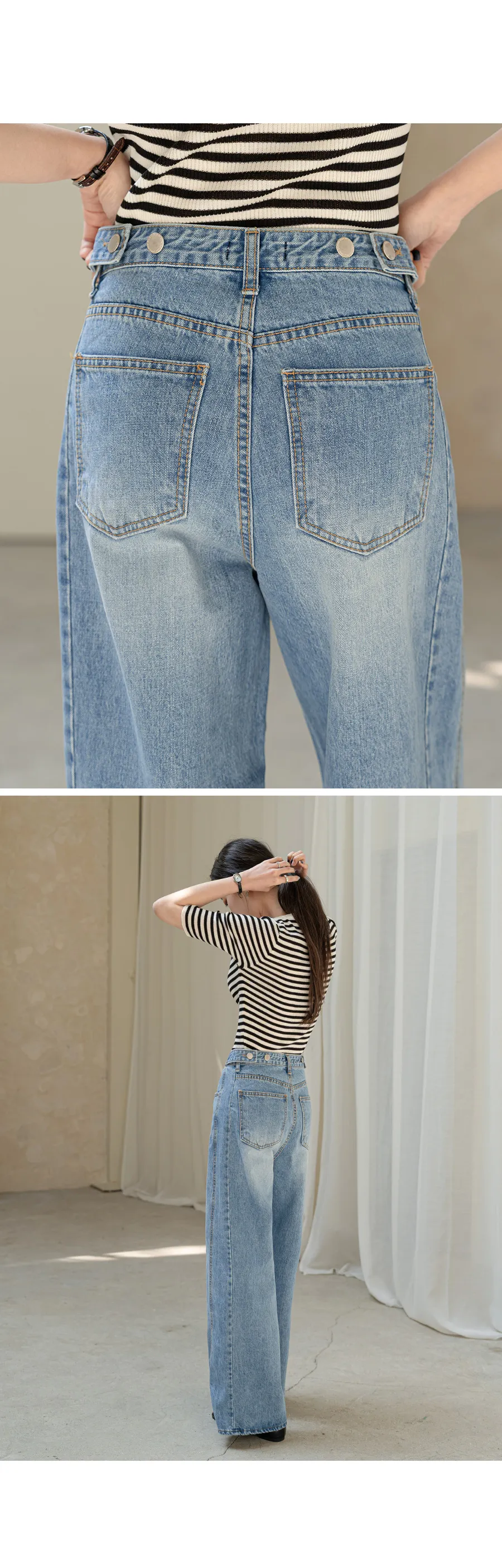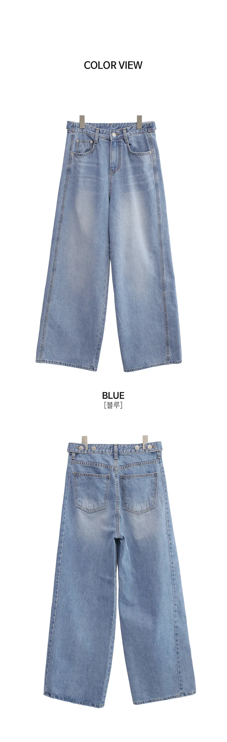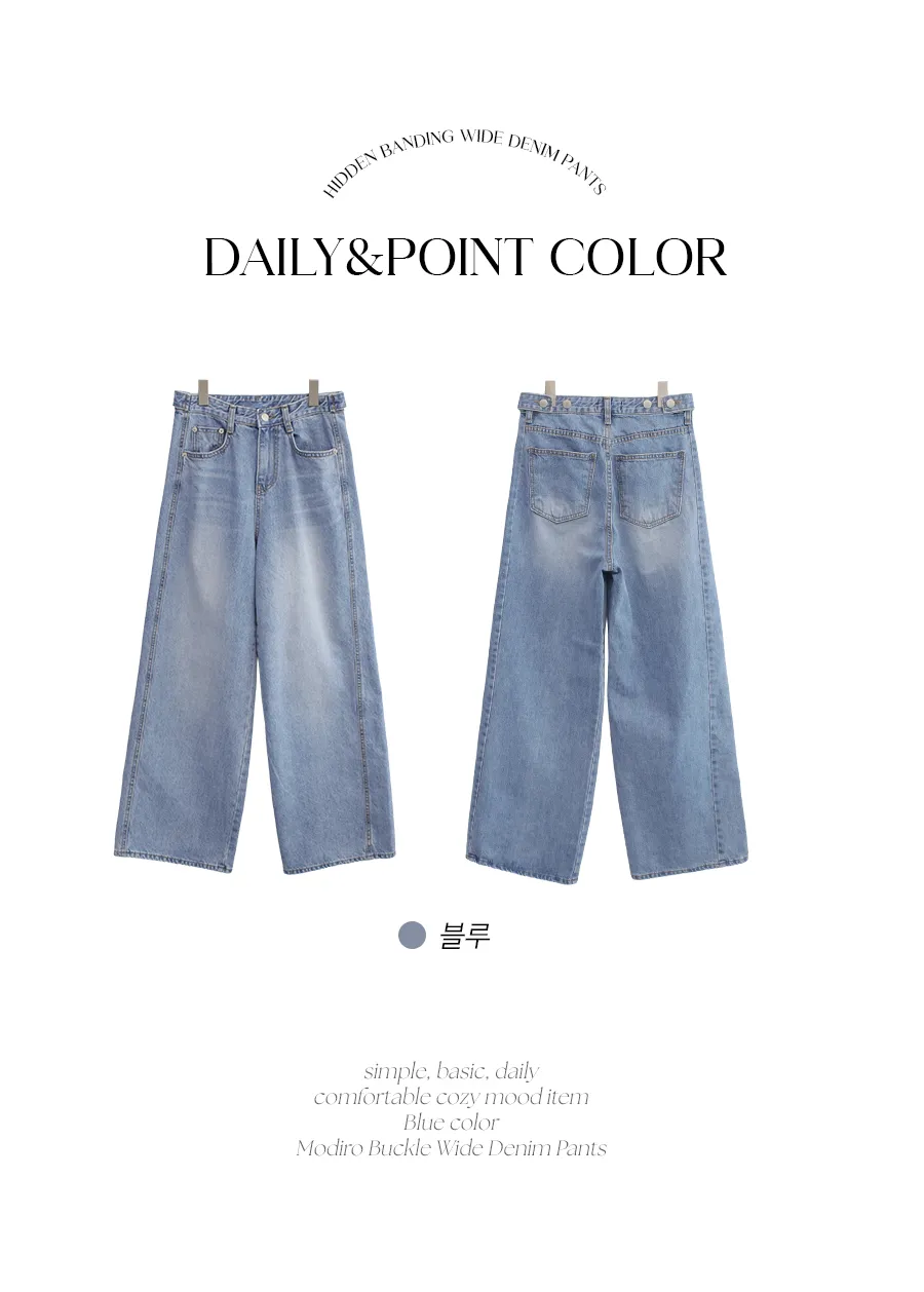 デニムコットンウォッシングポケットリベットバックポケットストレートワイドジップアップバックルループヒドゥンバンディングライトブルーディープブルーデニムパンツ[選べる丈]
