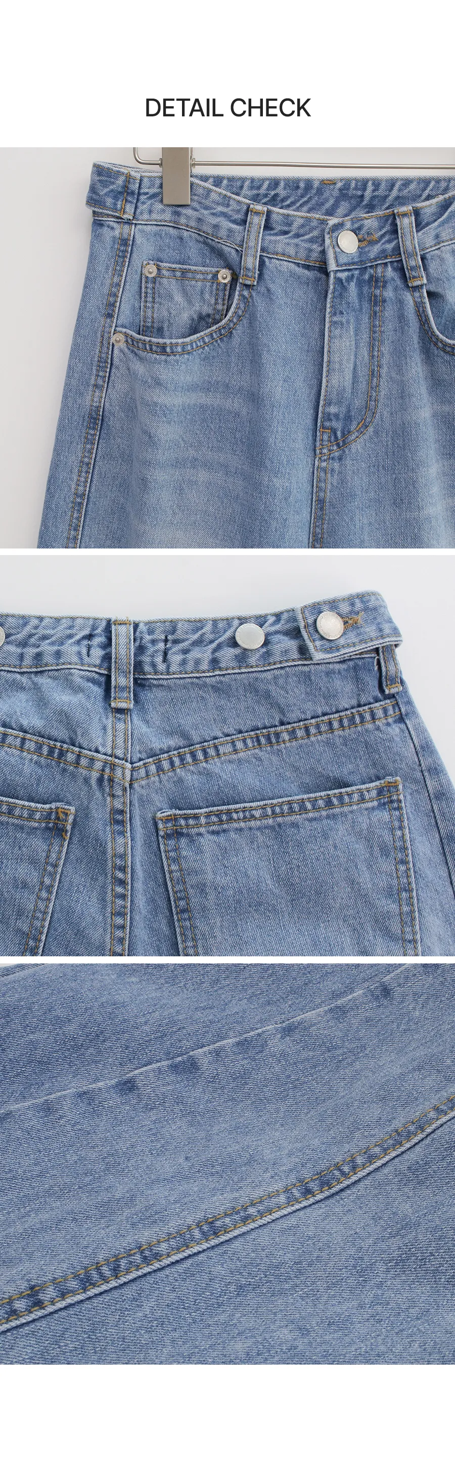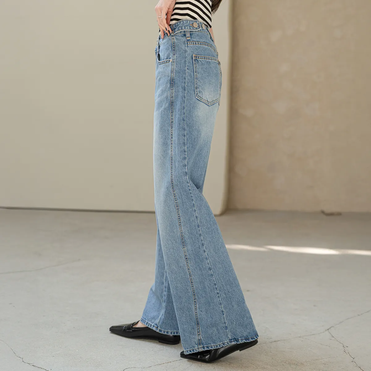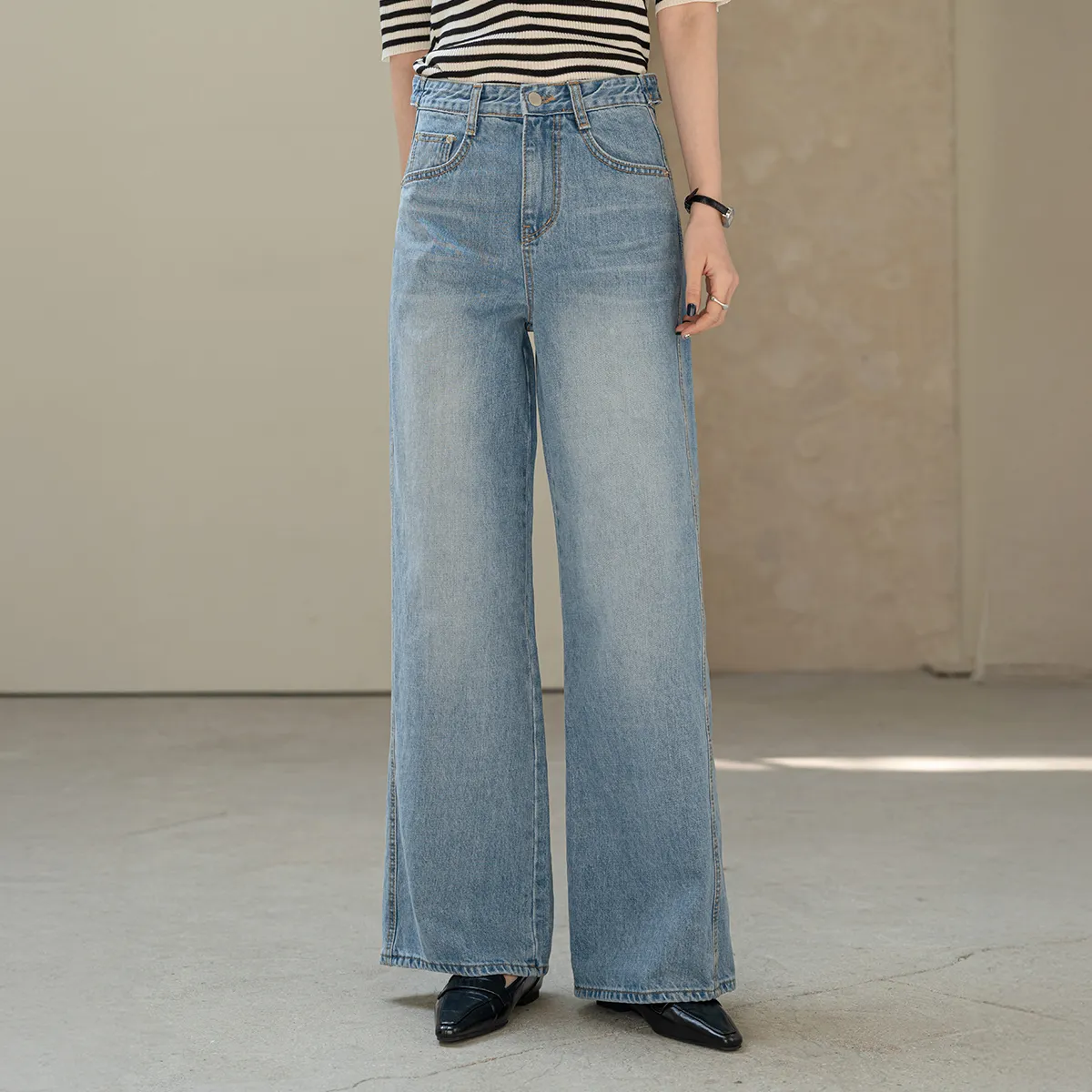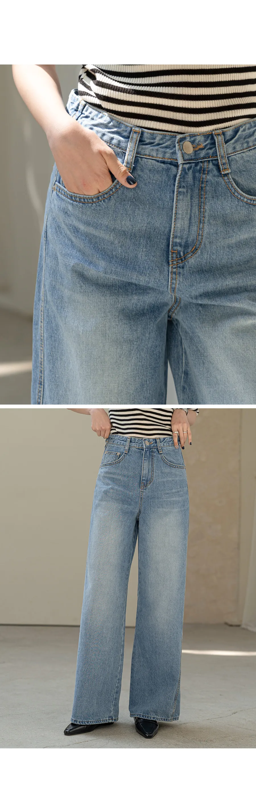 デニムコットンウォッシングポケットリベットバックポケットストレートワイドジップアップバックルループヒドゥンバンディングライトブルーディープブルーデニムパンツ[選べる丈]