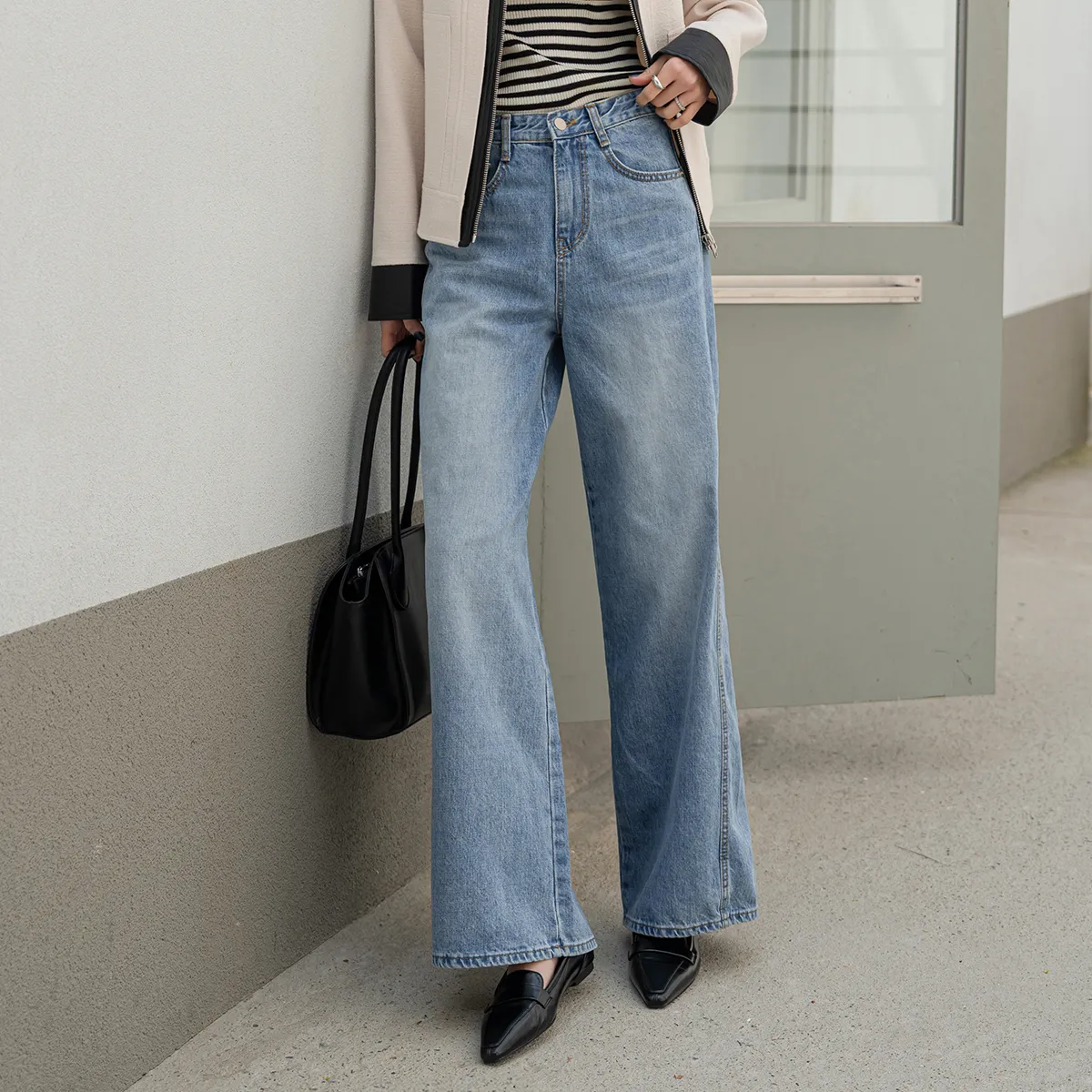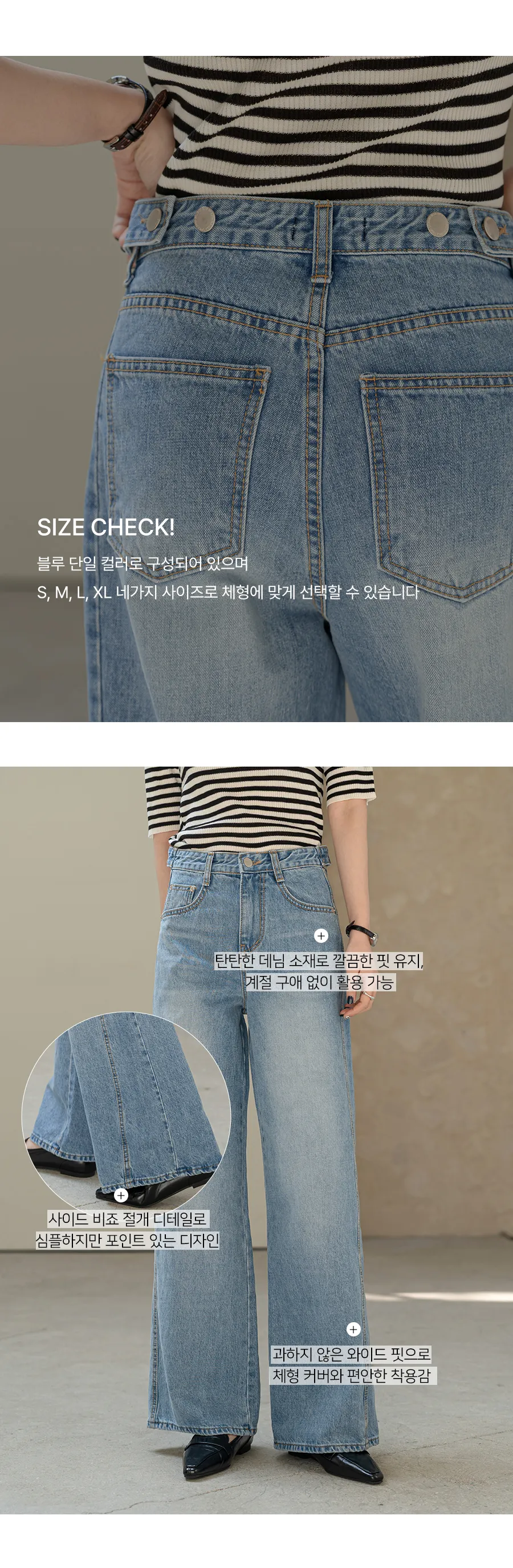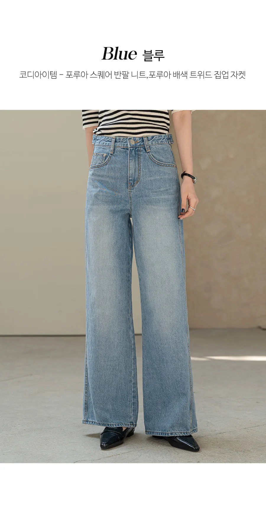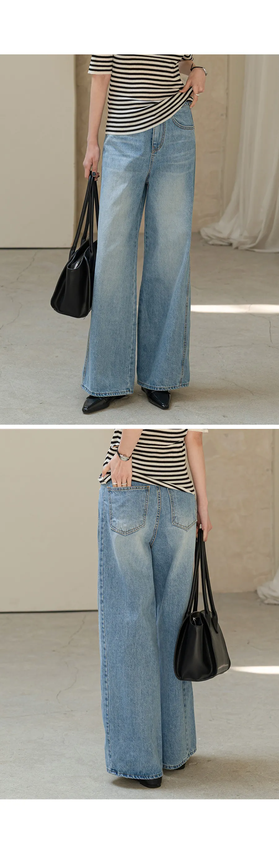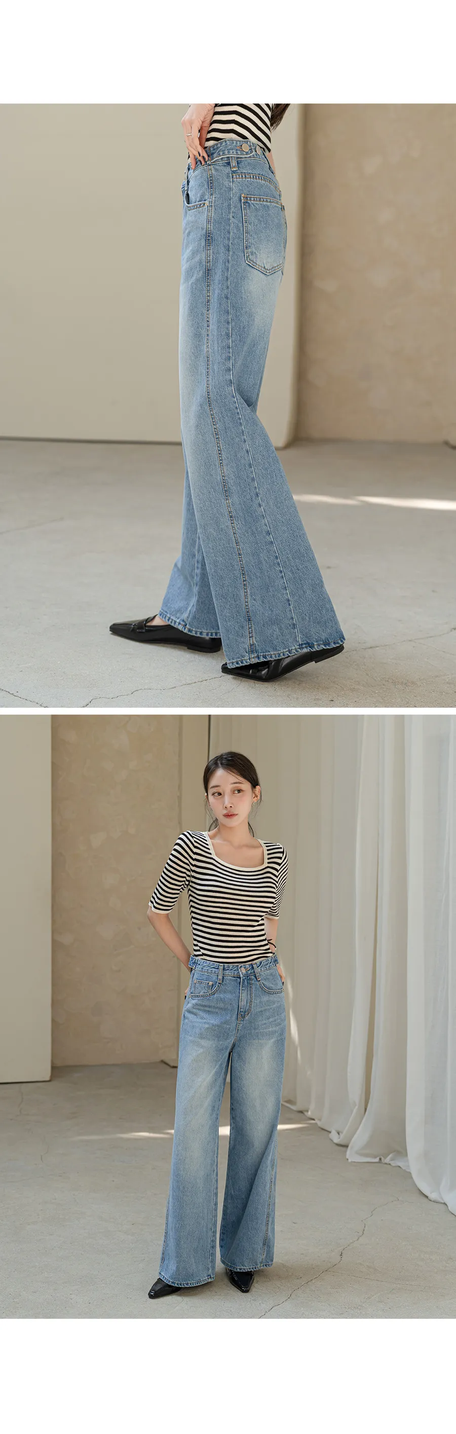 デニムコットンウォッシングポケットリベットバックポケットストレートワイドジップアップバックルループヒドゥンバンディングライトブルーディープブルーデニムパンツ[選べる丈]
