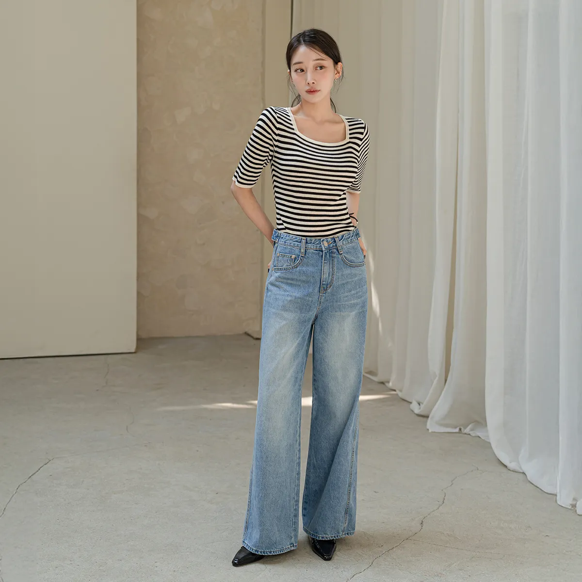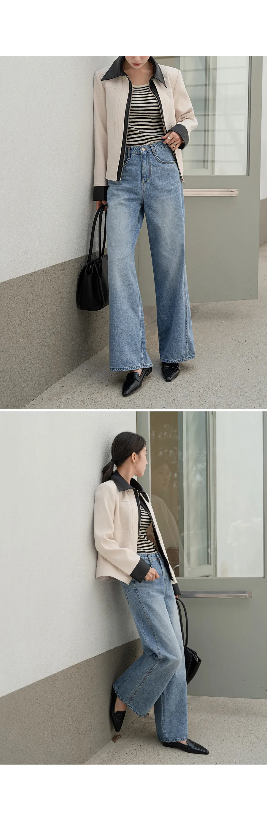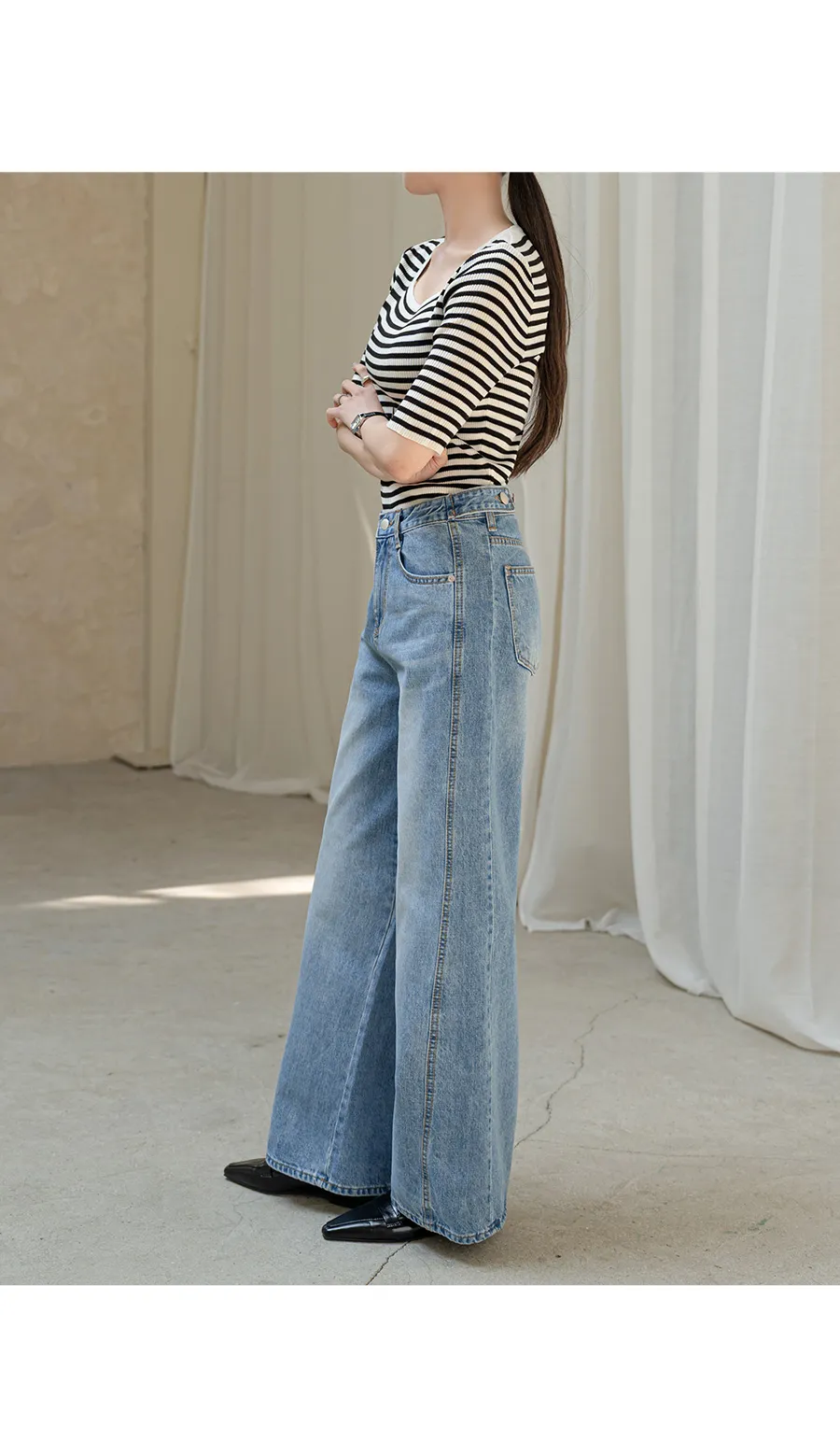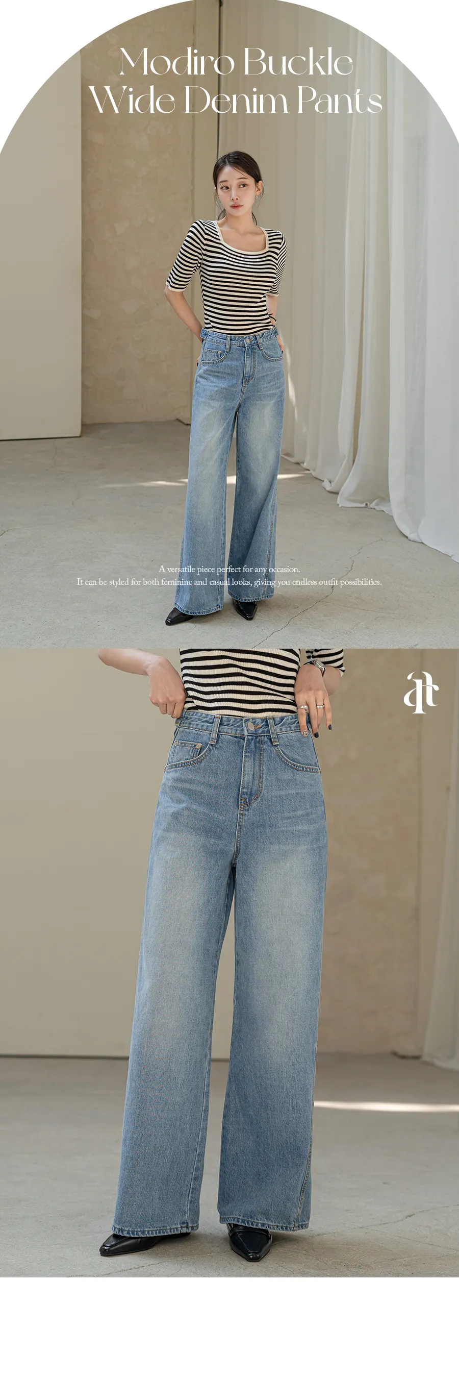 デニムコットンウォッシングポケットリベットバックポケットストレートワイドジップアップバックルループヒドゥンバンディングライトブルーディープブルーデニムパンツ[選べる丈]