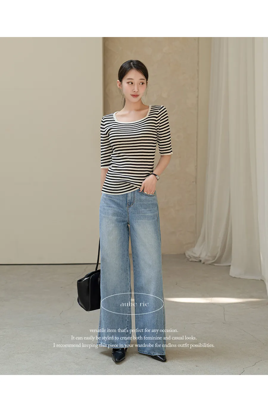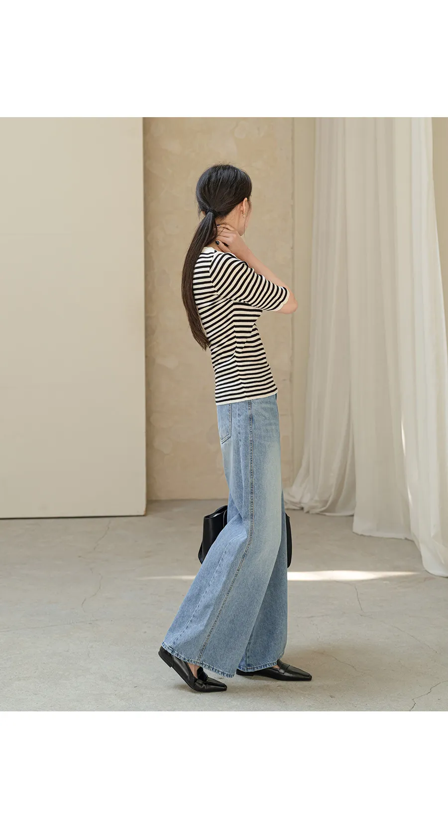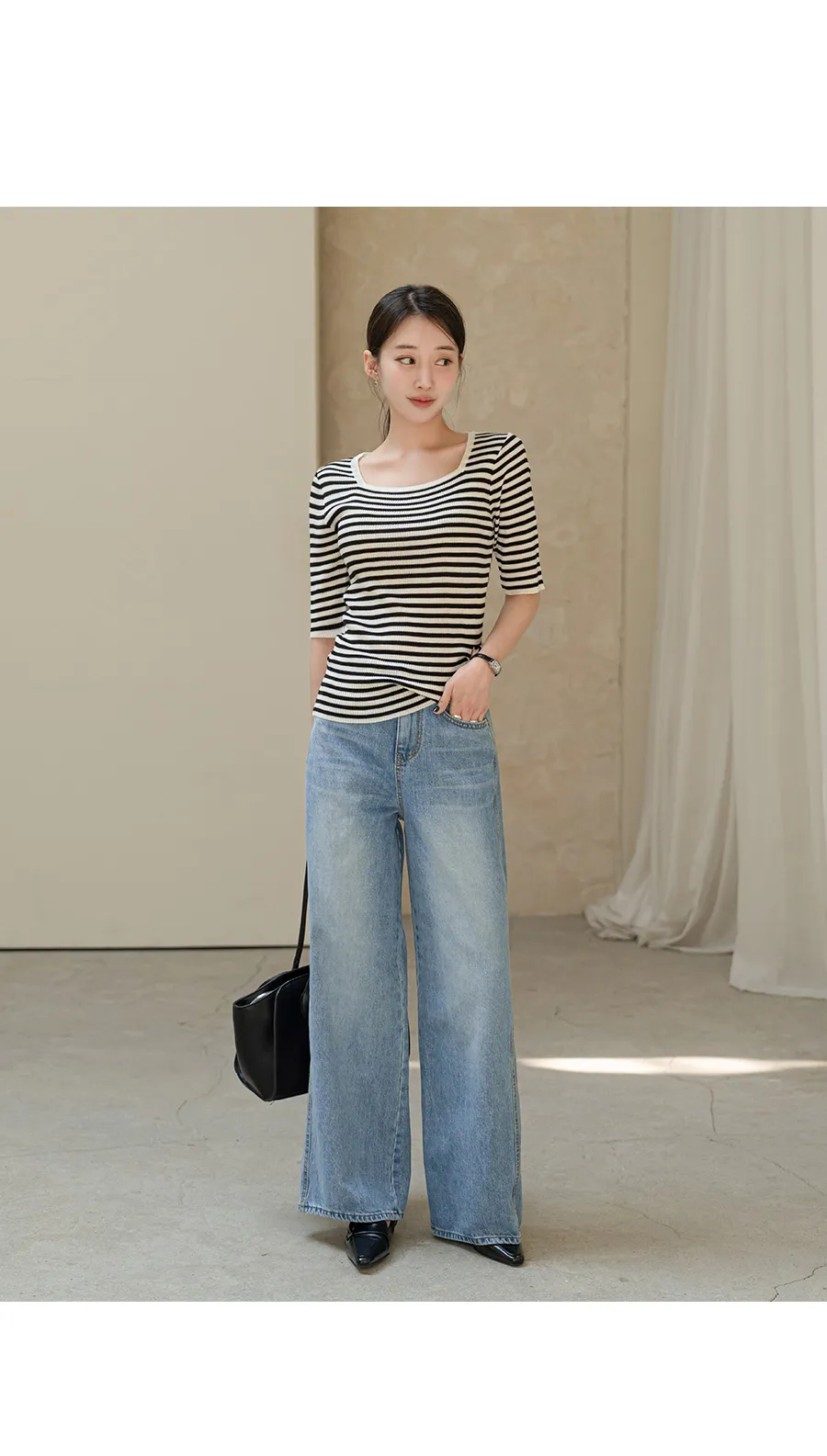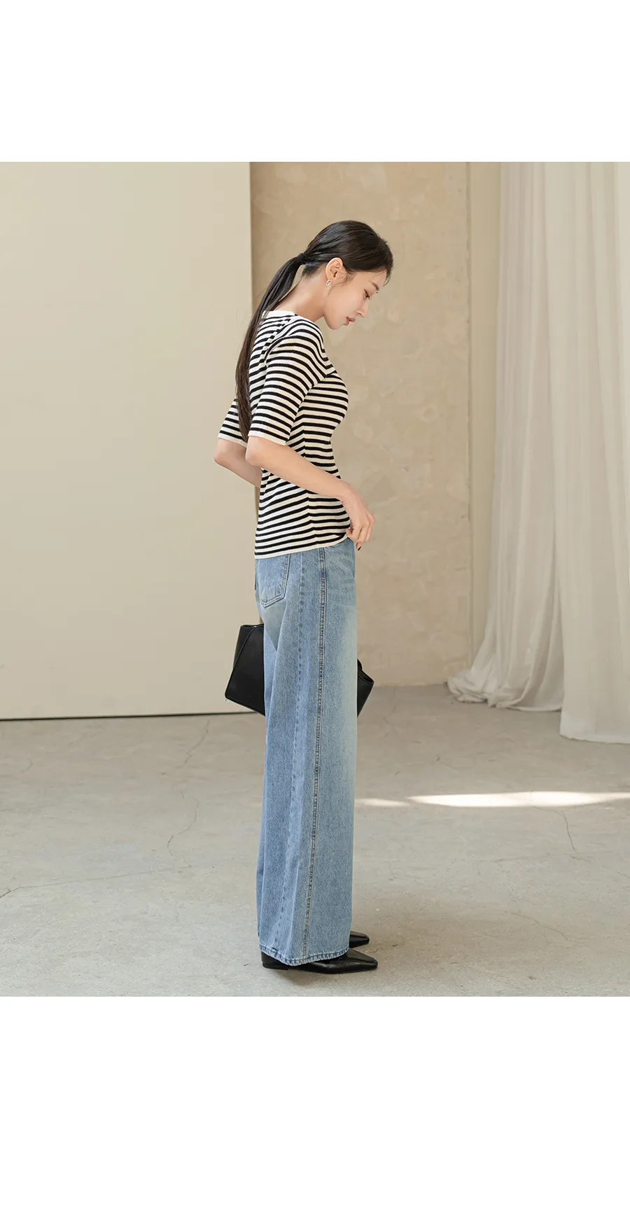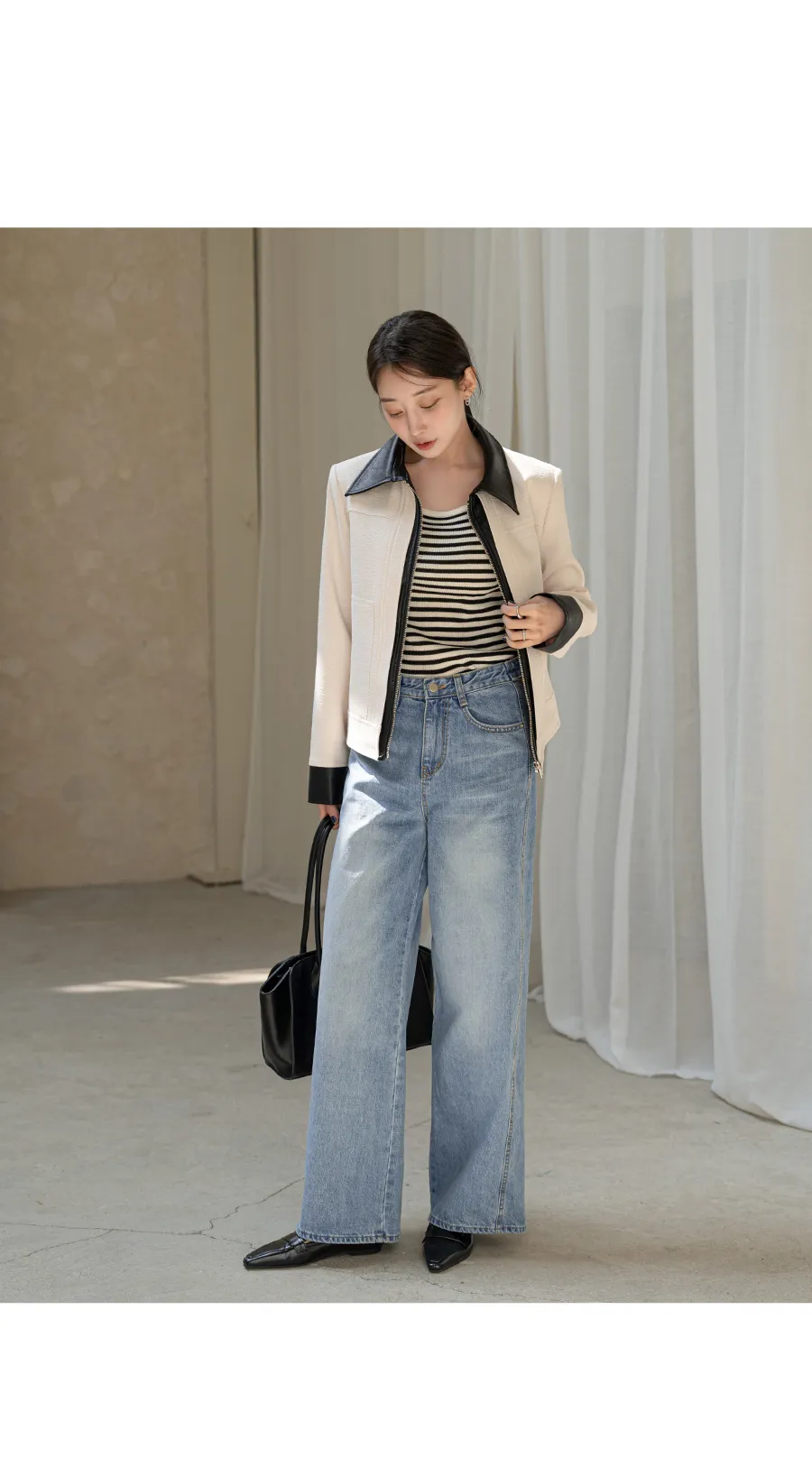 デニムコットンウォッシングポケットリベットバックポケットストレートワイドジップアップバックルループヒドゥンバンディングライトブルーディープブルーデニムパンツ[選べる丈]