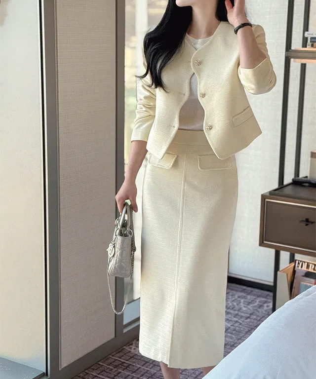 ツイードスクエアネック肩パッドペプラムラインスリムロング7分袖ツーポケットビジューボタンAラインヒドゥンジッパー無地ツーピース(トップス、ボトムス)スカートジャケット
