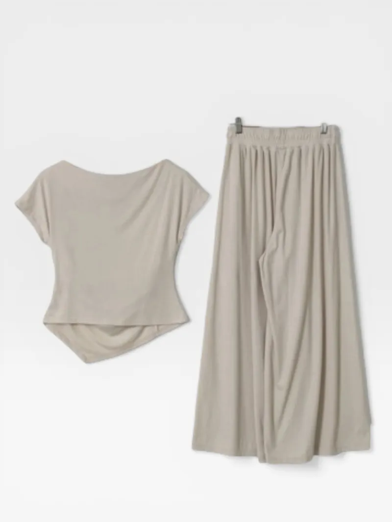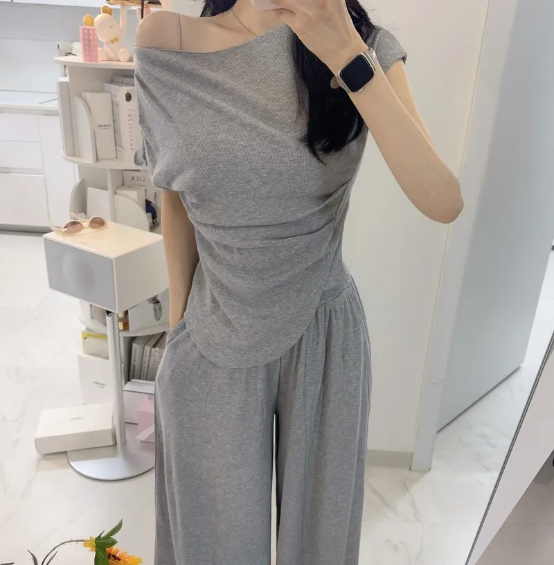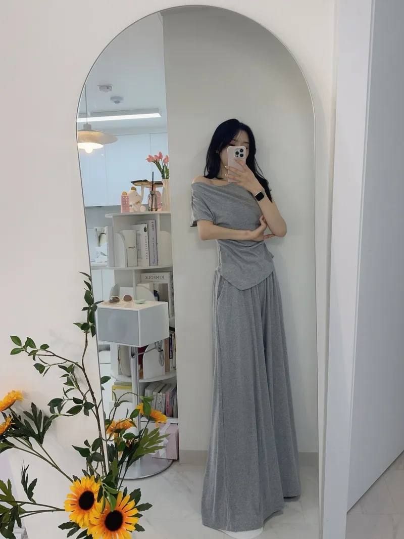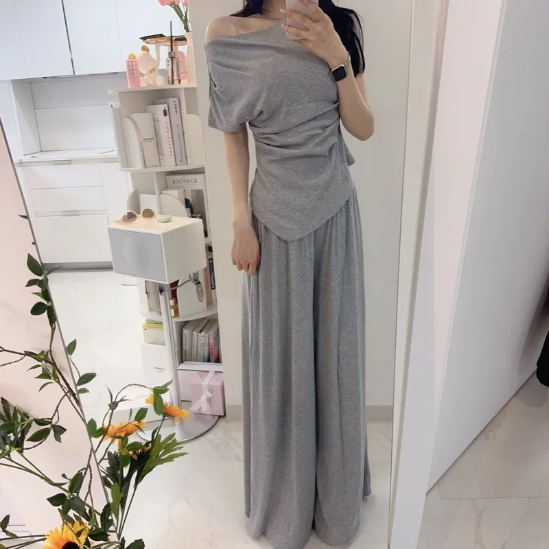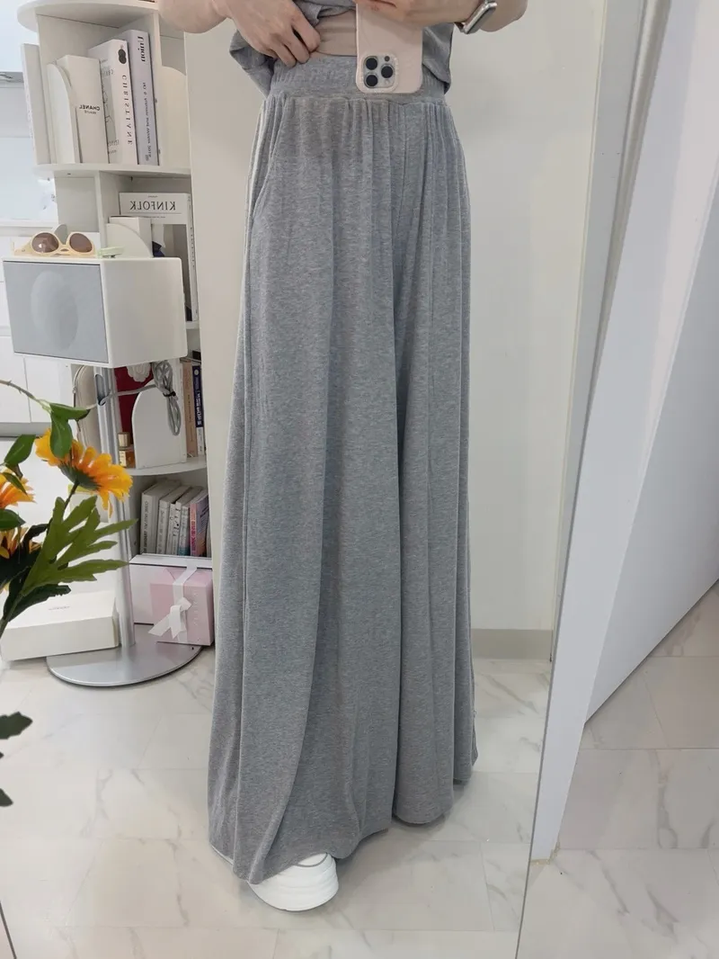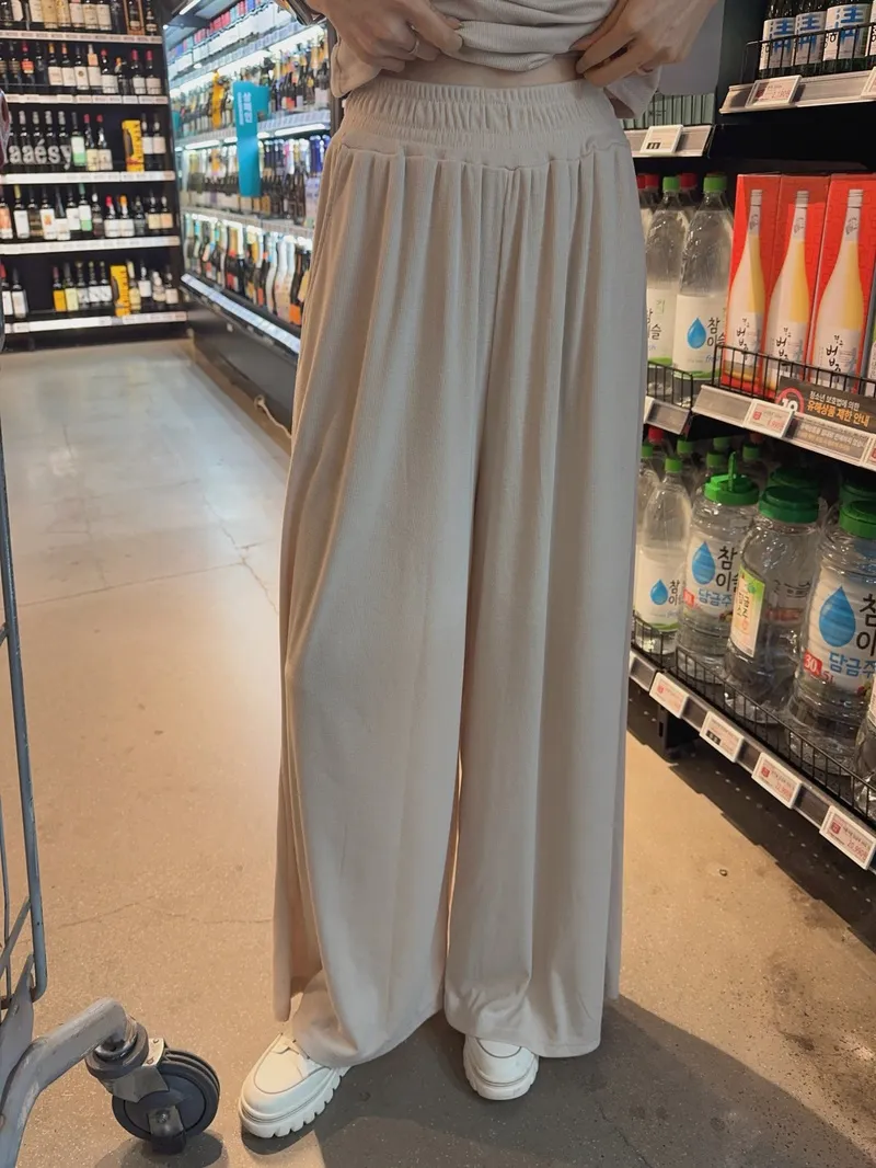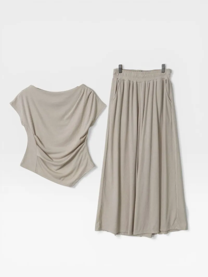 シアサッカーVネック半袖ラグランAラインオーバーサイズルーズウエストゴムロングワイドリンクル無地カーディガンパンツツーピース(トップス、ボトムス)