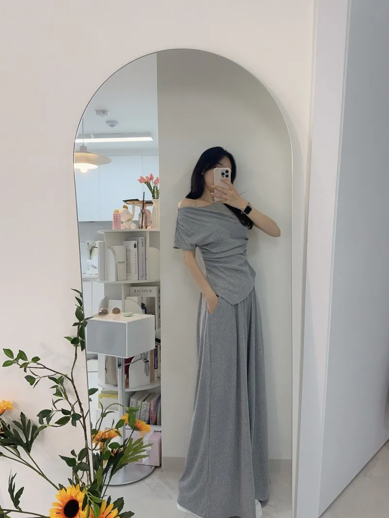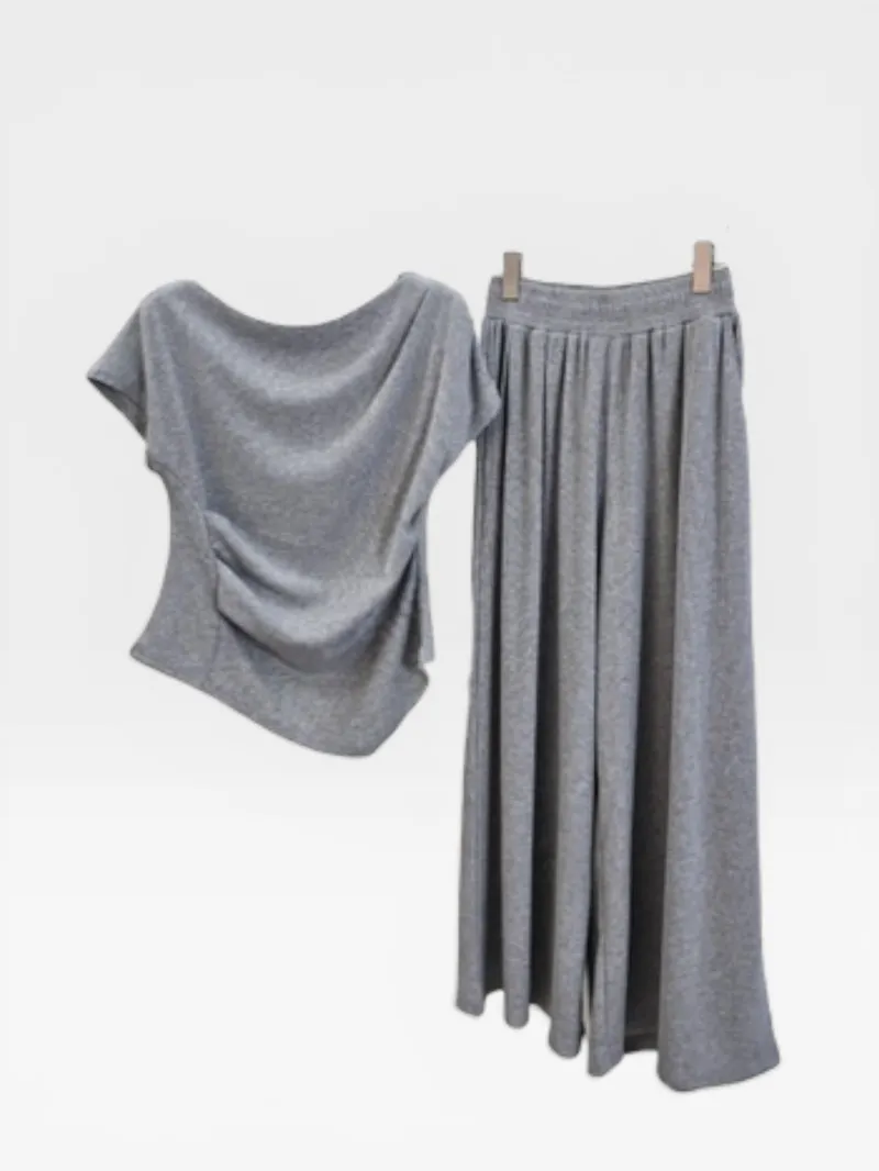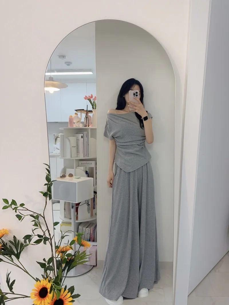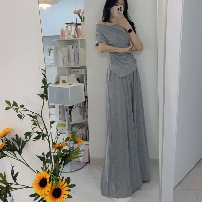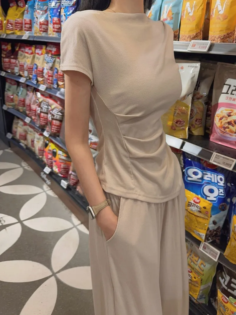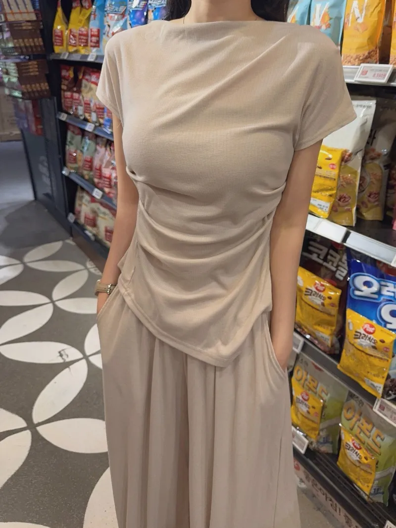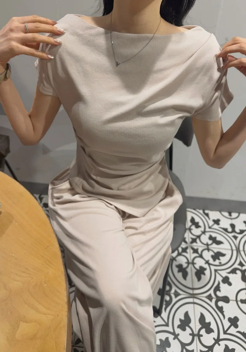 シアサッカーVネック半袖ラグランAラインオーバーサイズルーズウエストゴムロングワイドリンクル無地カーディガンパンツツーピース(トップス、ボトムス)