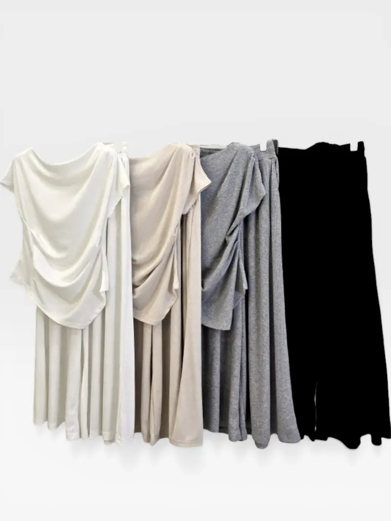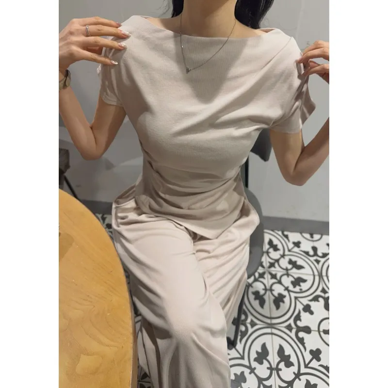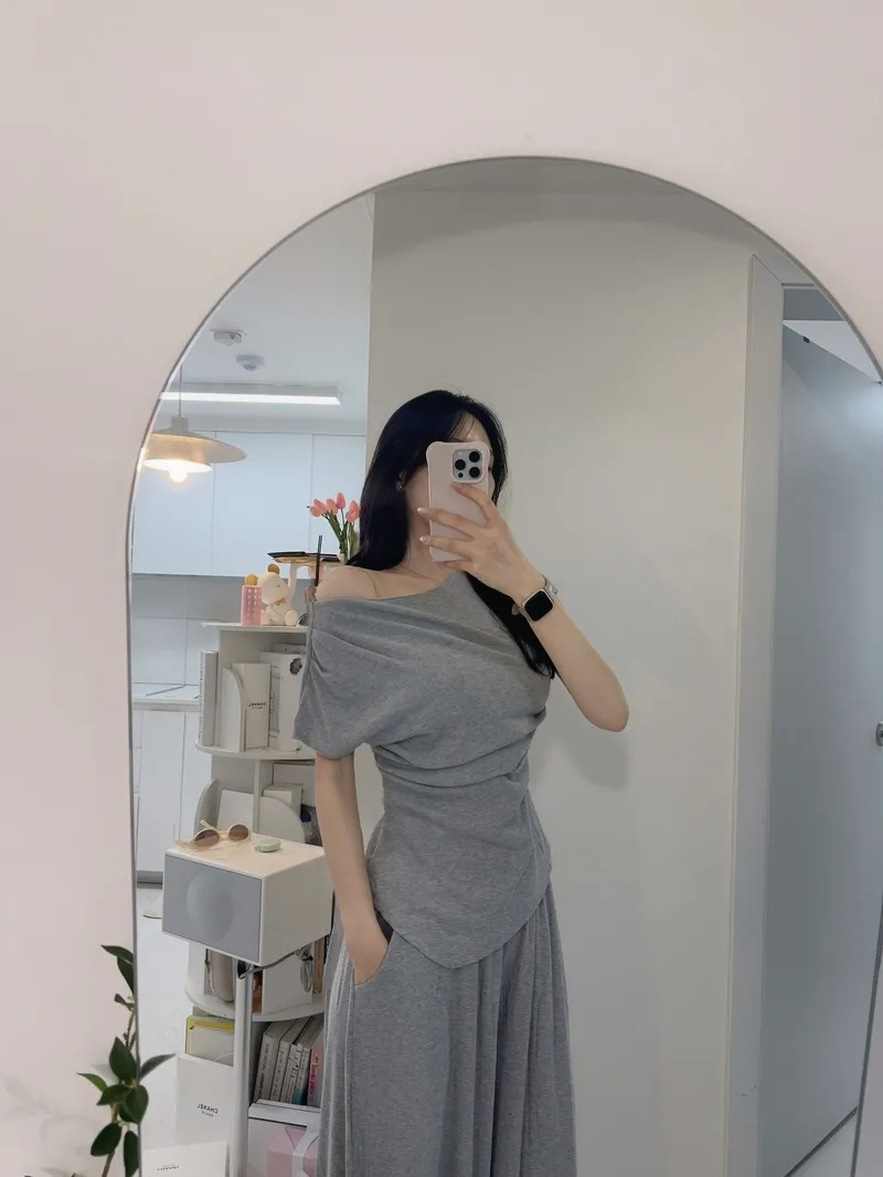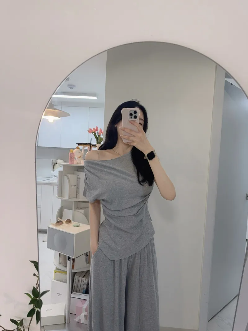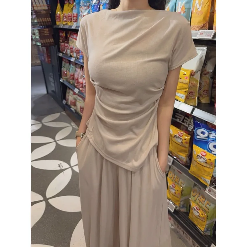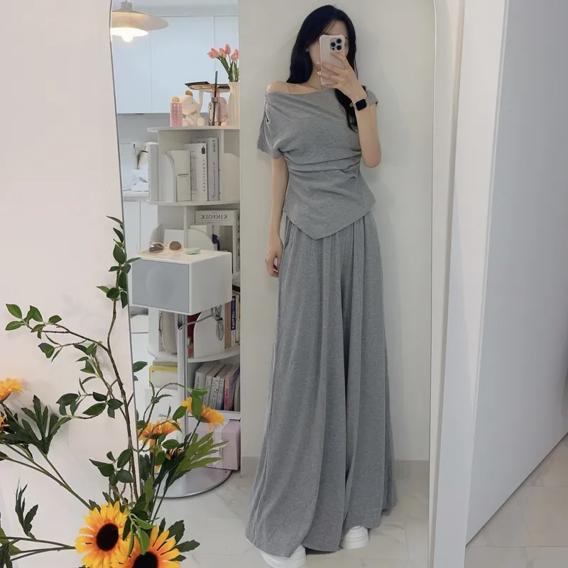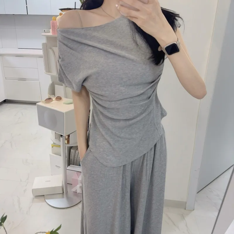 シアサッカーVネック半袖ラグランAラインオーバーサイズルーズウエストゴムロングワイドリンクル無地カーディガンパンツツーピース(トップス、ボトムス)