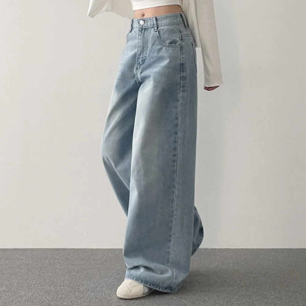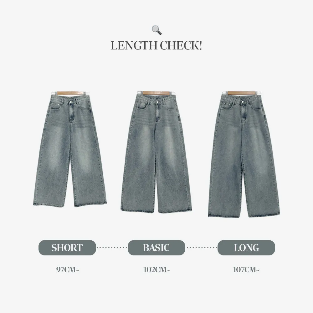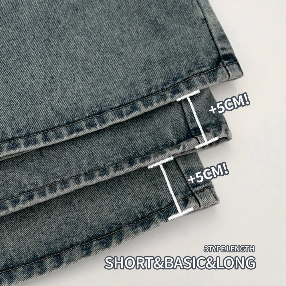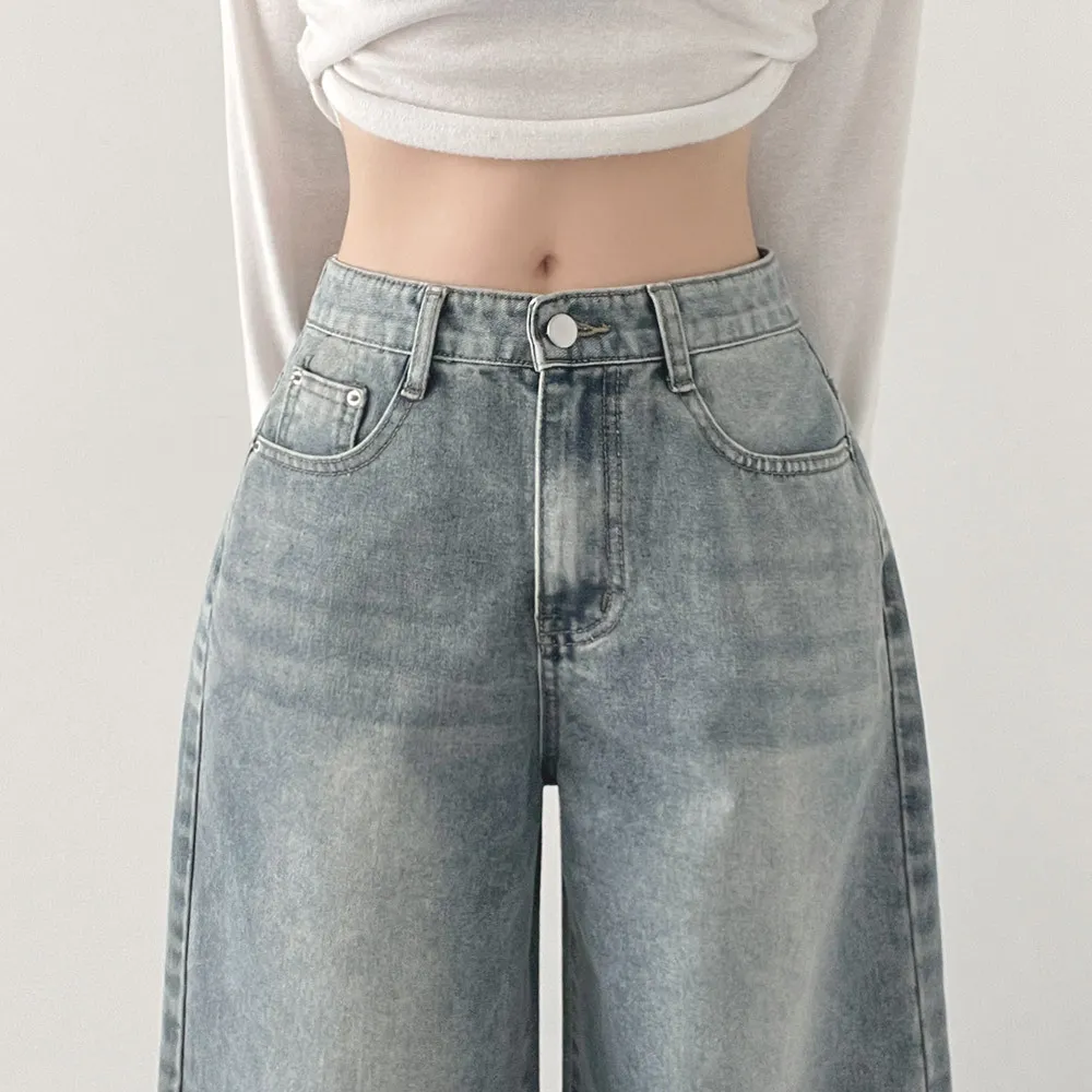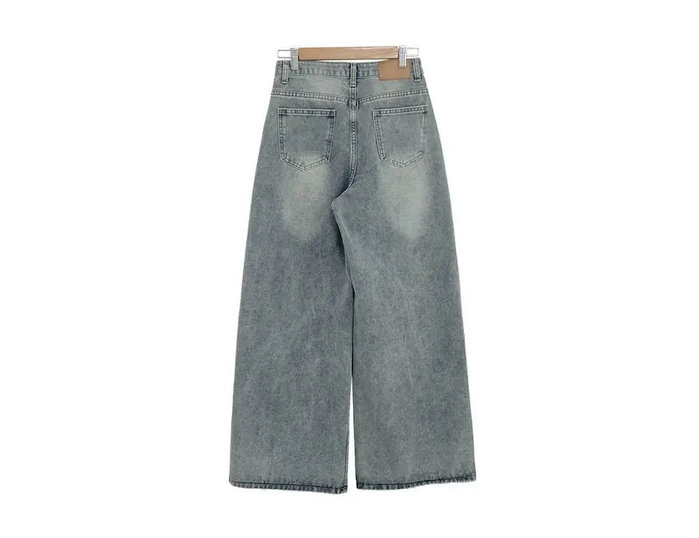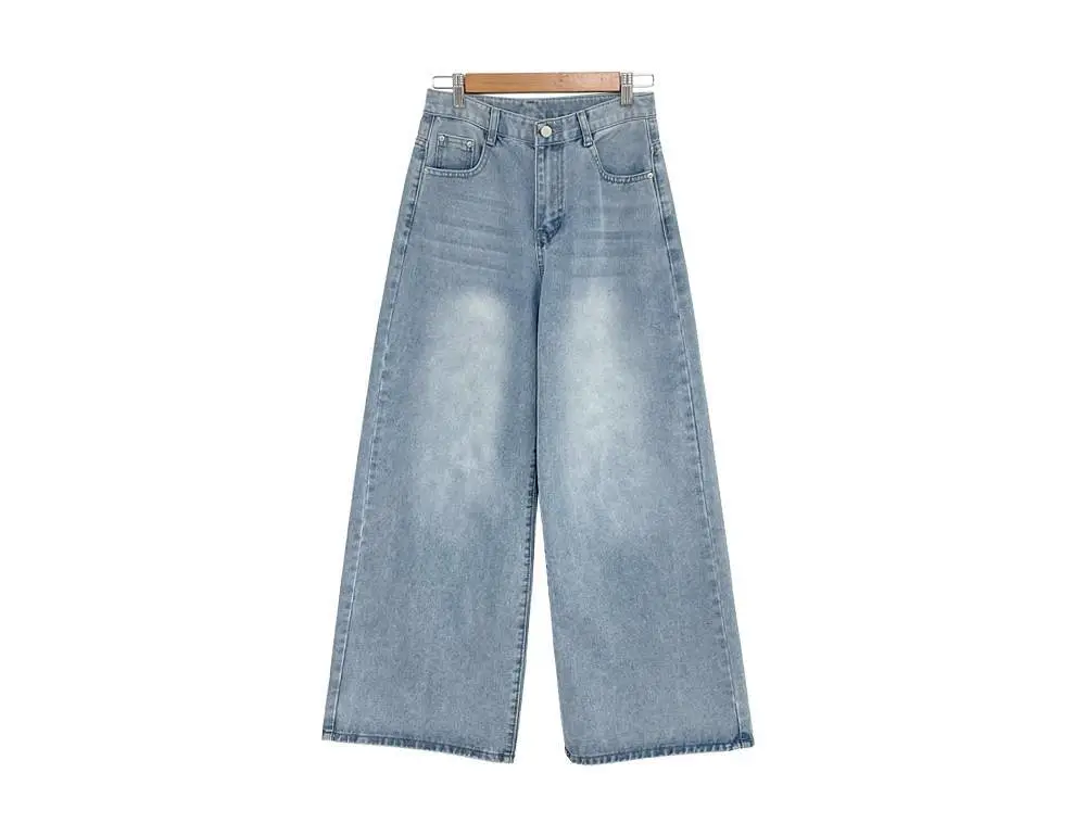 デニムコットンウォッシングポケットリベットバックポケットストレートワイドジップアップバックルループヒドゥンバンディングライトブルーディープブルーデニムパンツ[選べる丈]