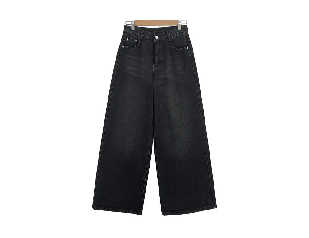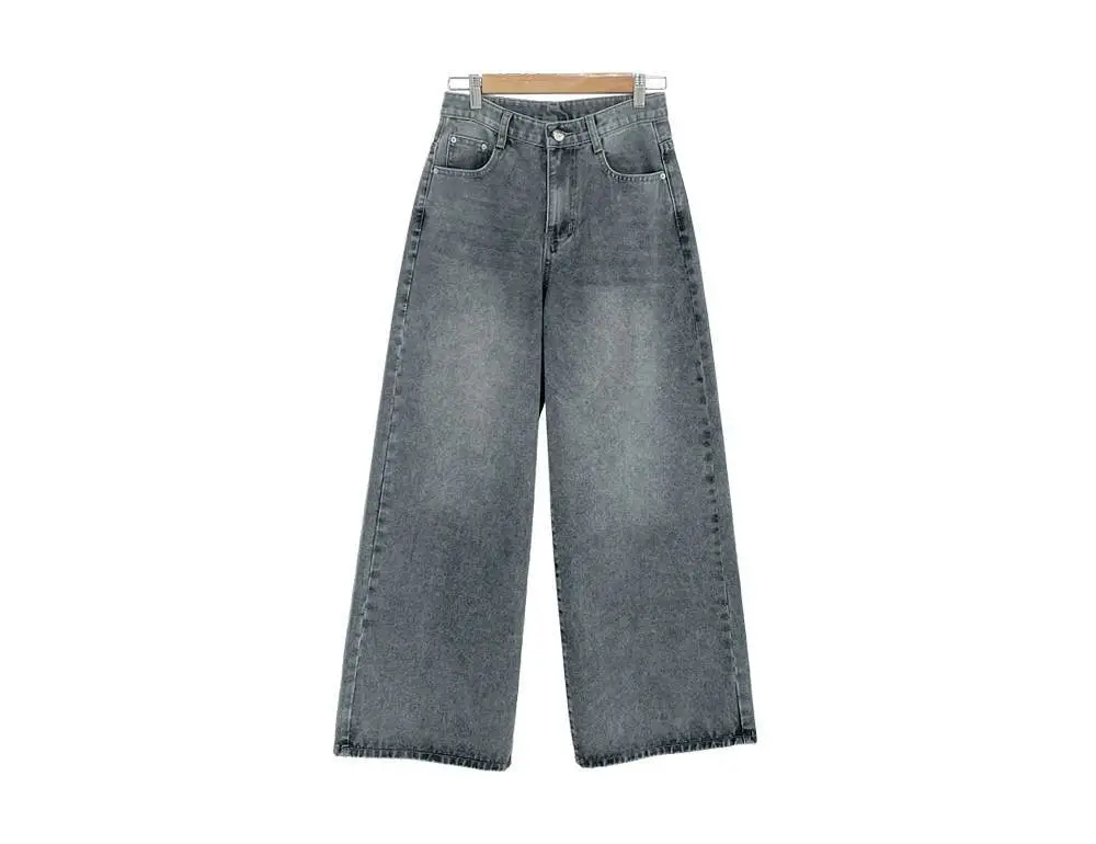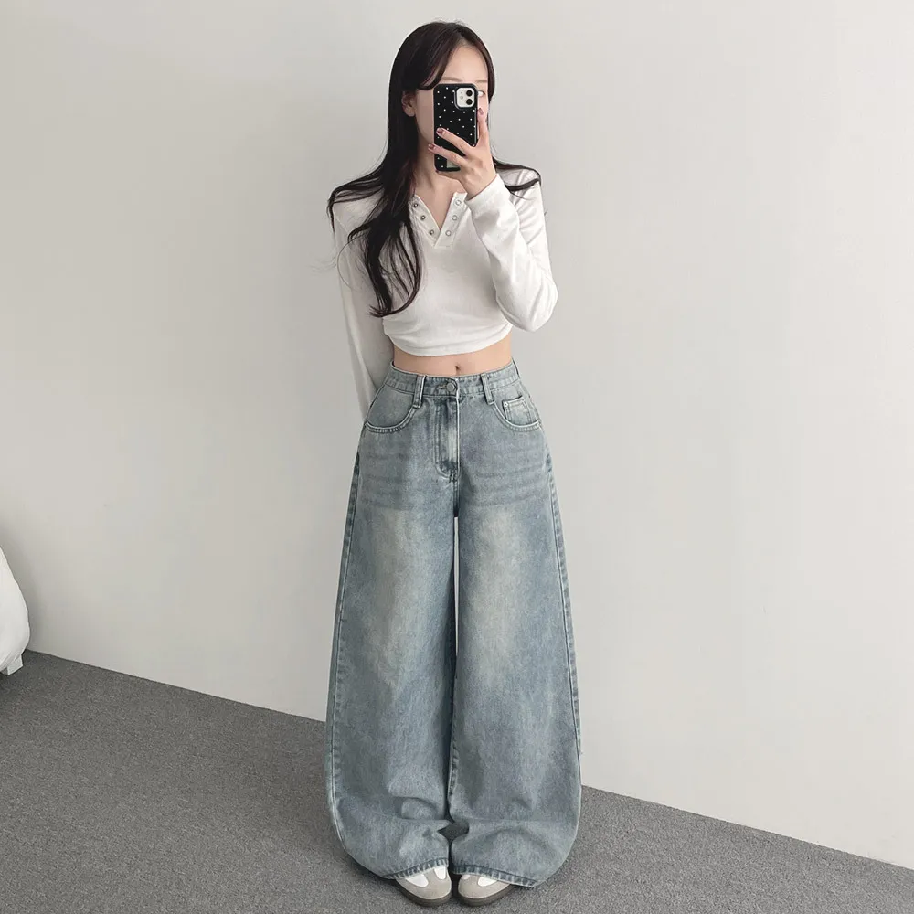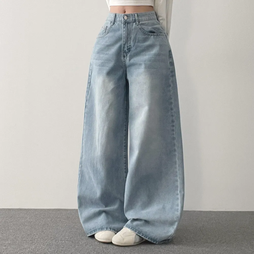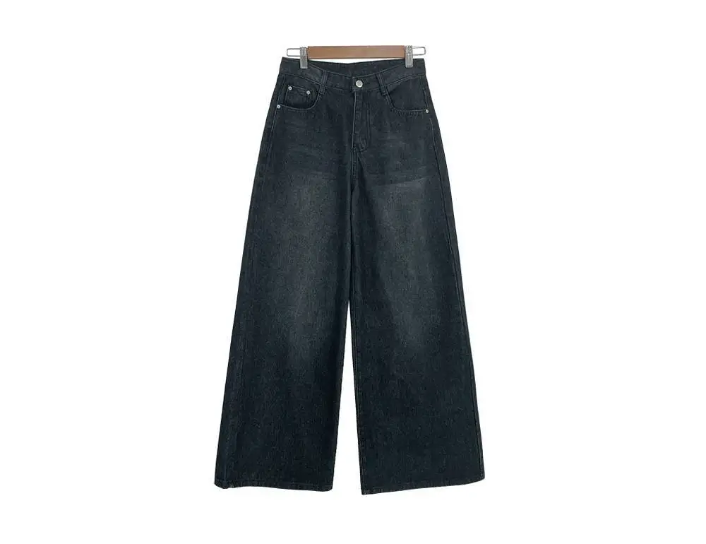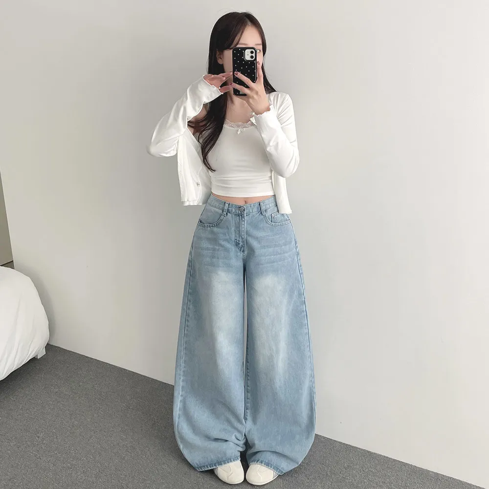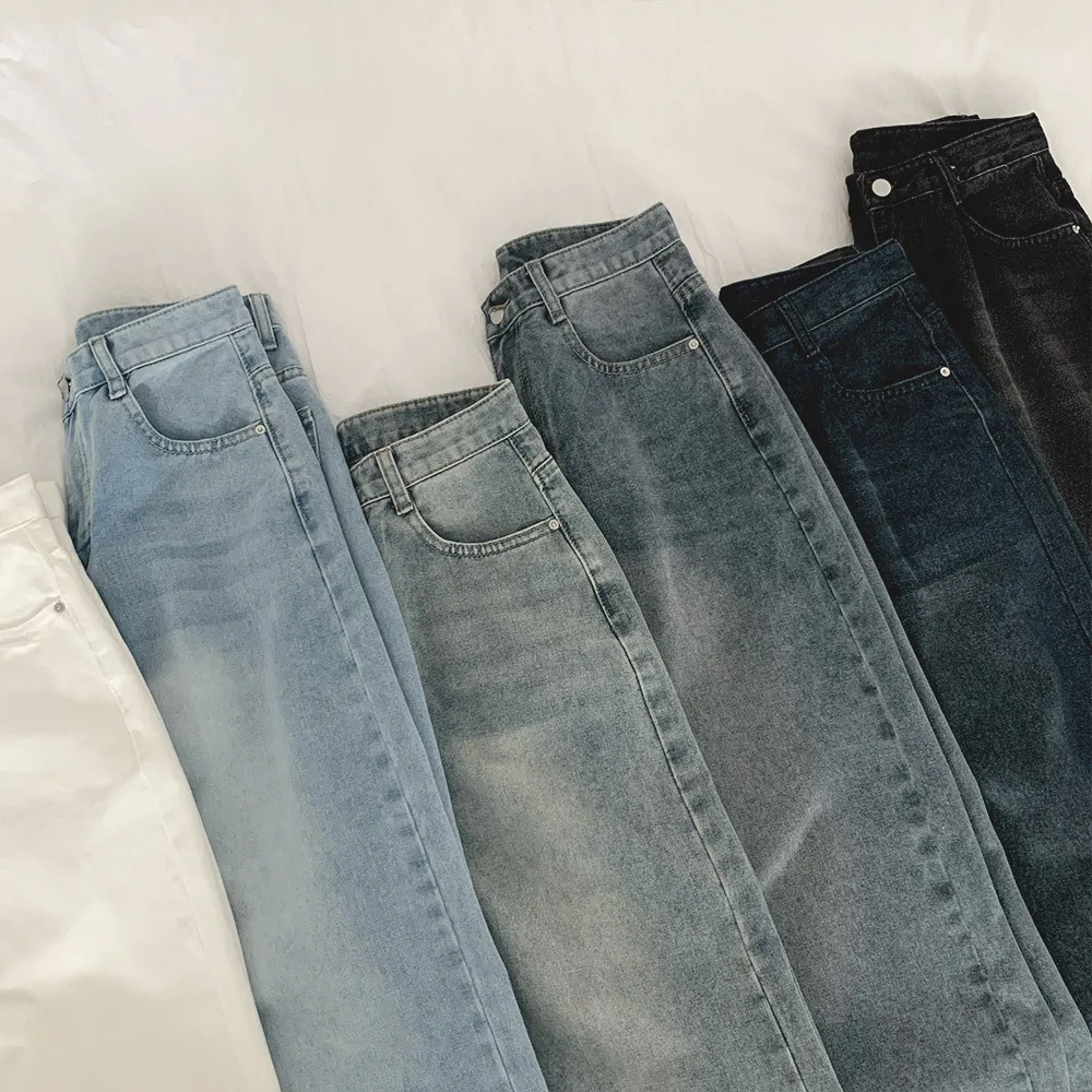 デニムコットンウォッシングポケットリベットバックポケットストレートワイドジップアップバックルループヒドゥンバンディングライトブルーディープブルーデニムパンツ[選べる丈]