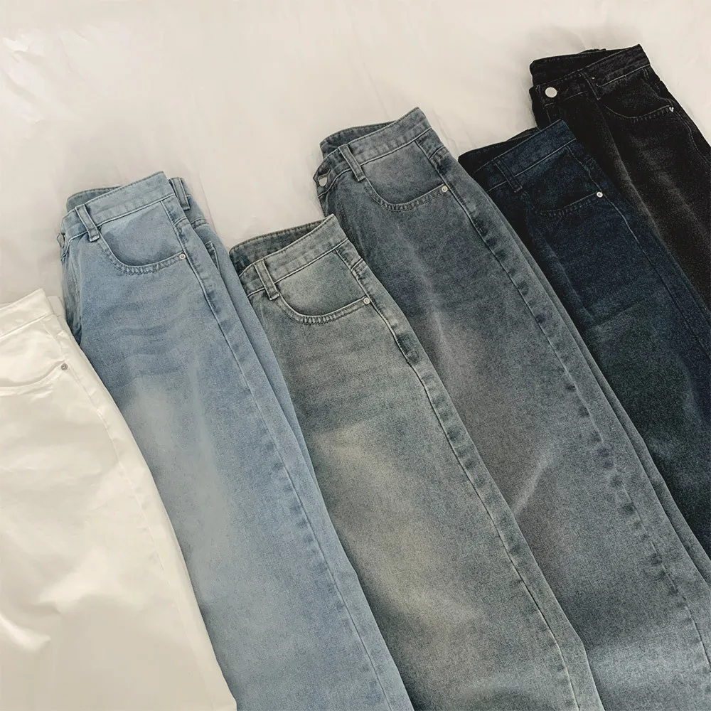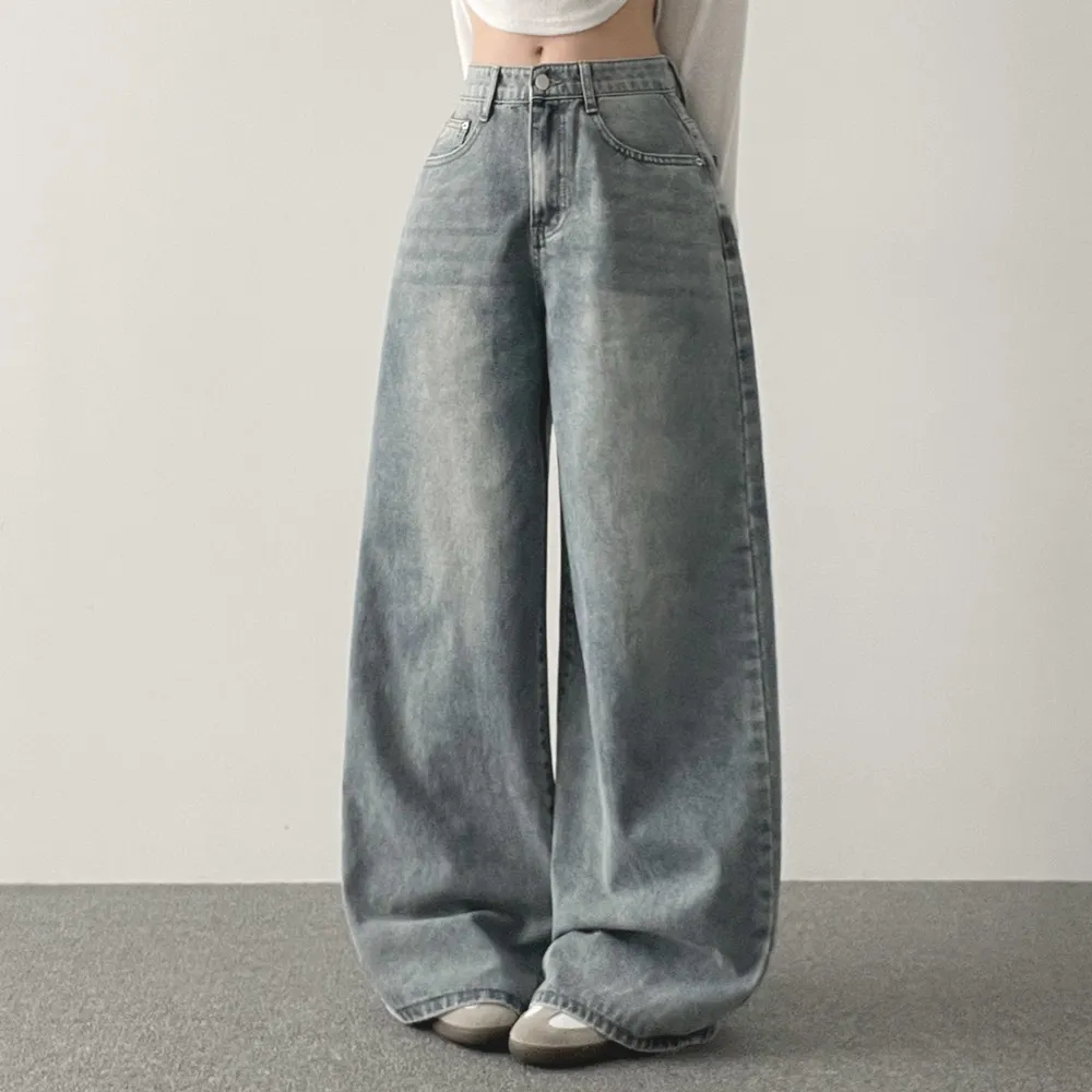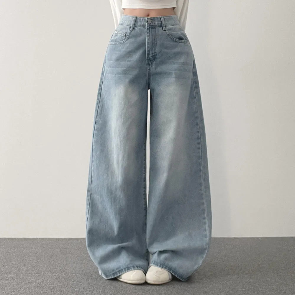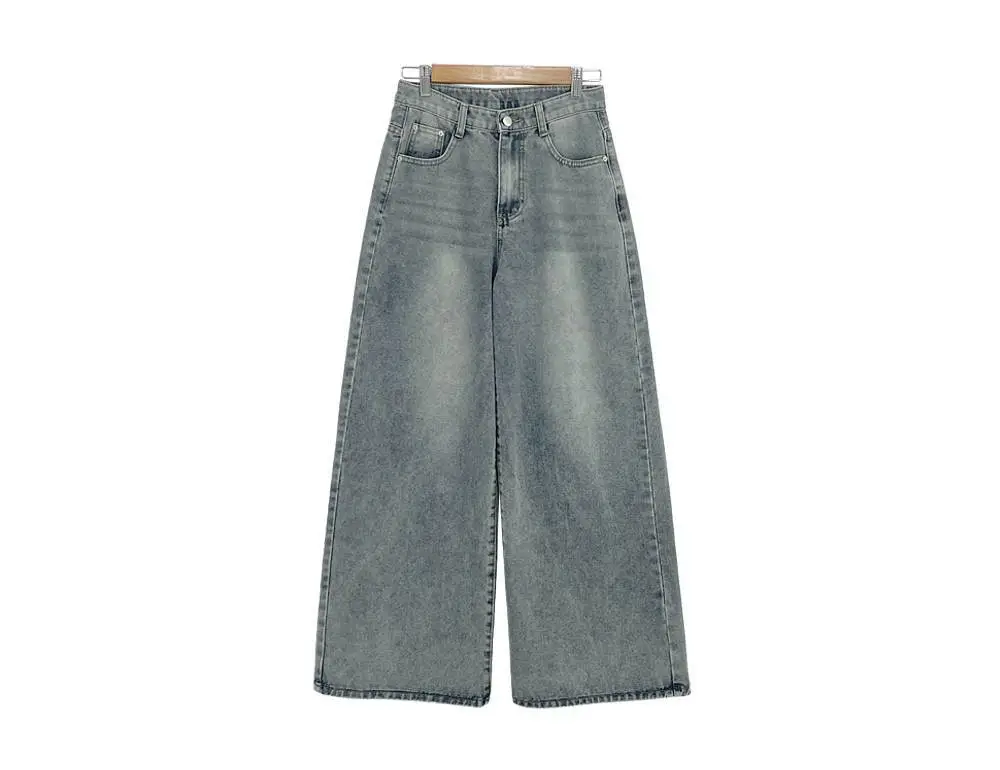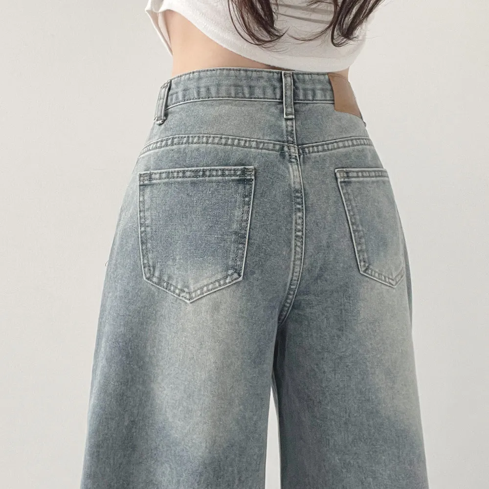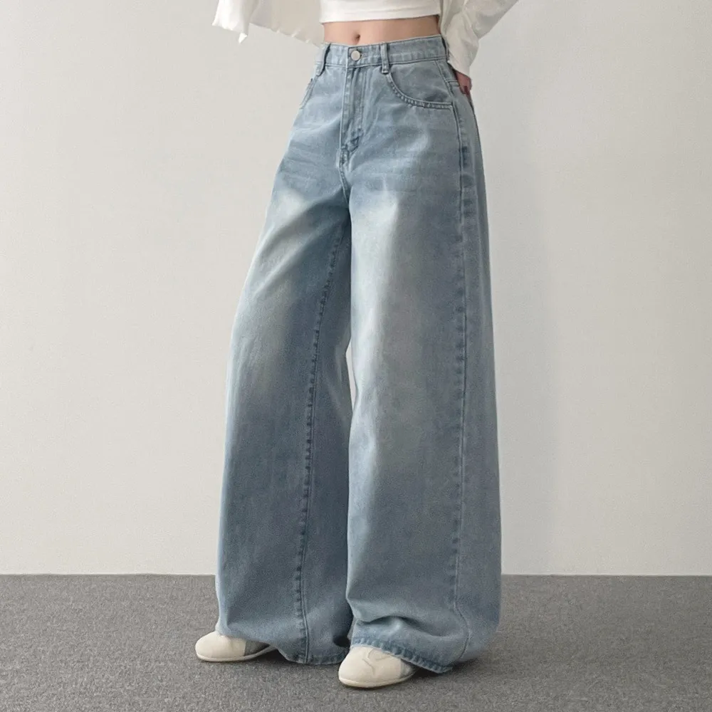 デニムコットンウォッシングポケットリベットバックポケットストレートワイドジップアップバックルループヒドゥンバンディングライトブルーディープブルーデニムパンツ[選べる丈]